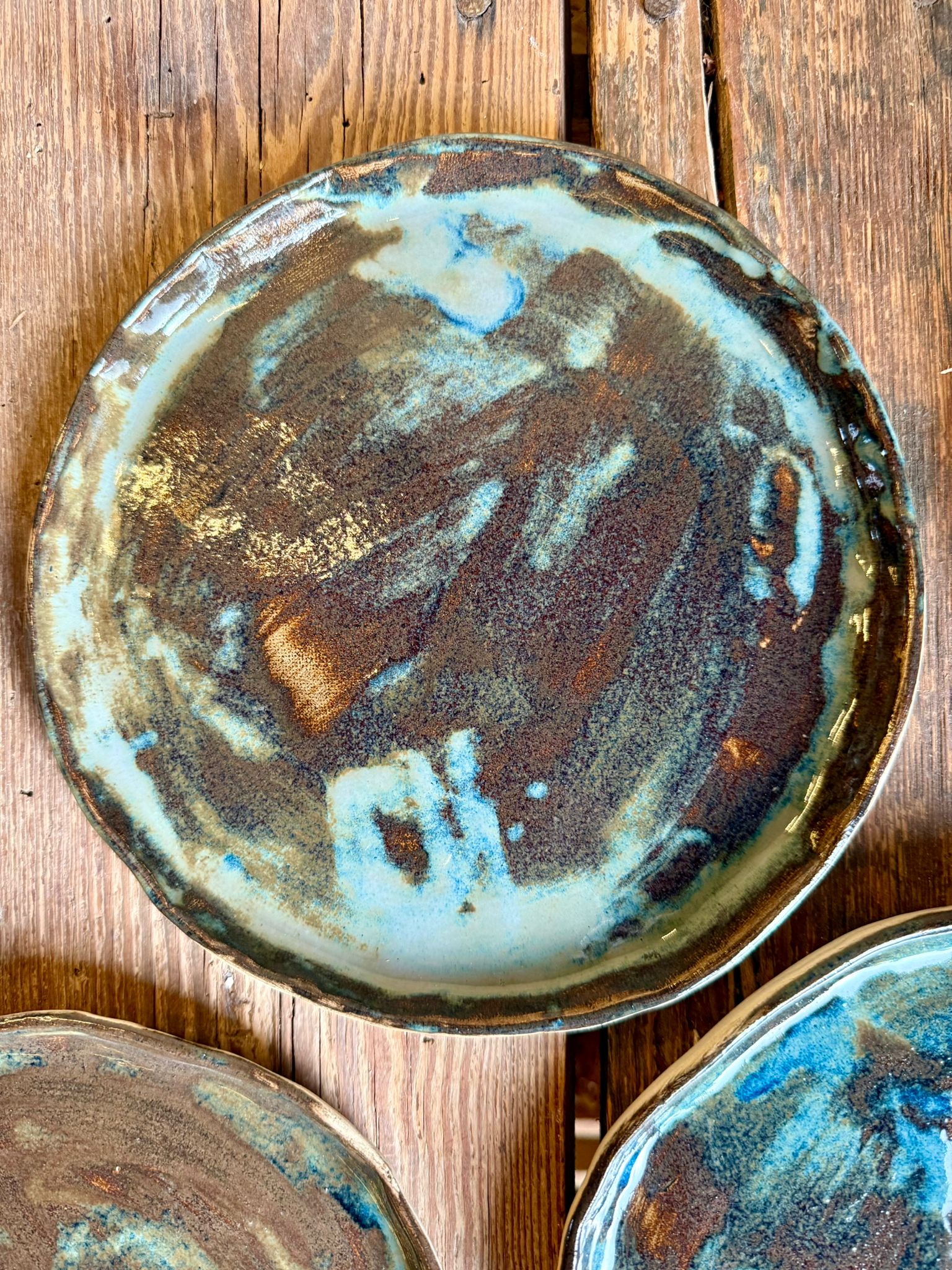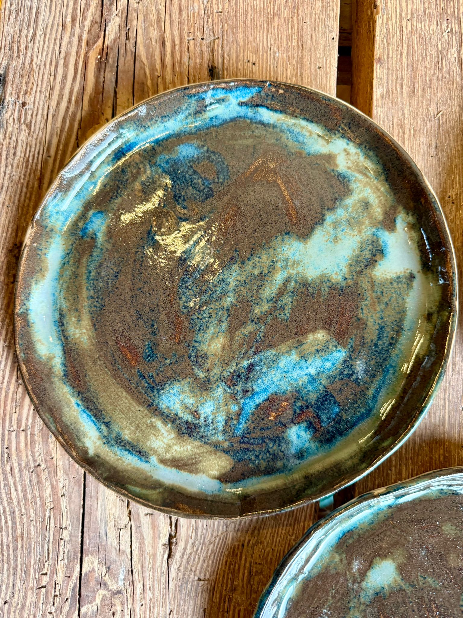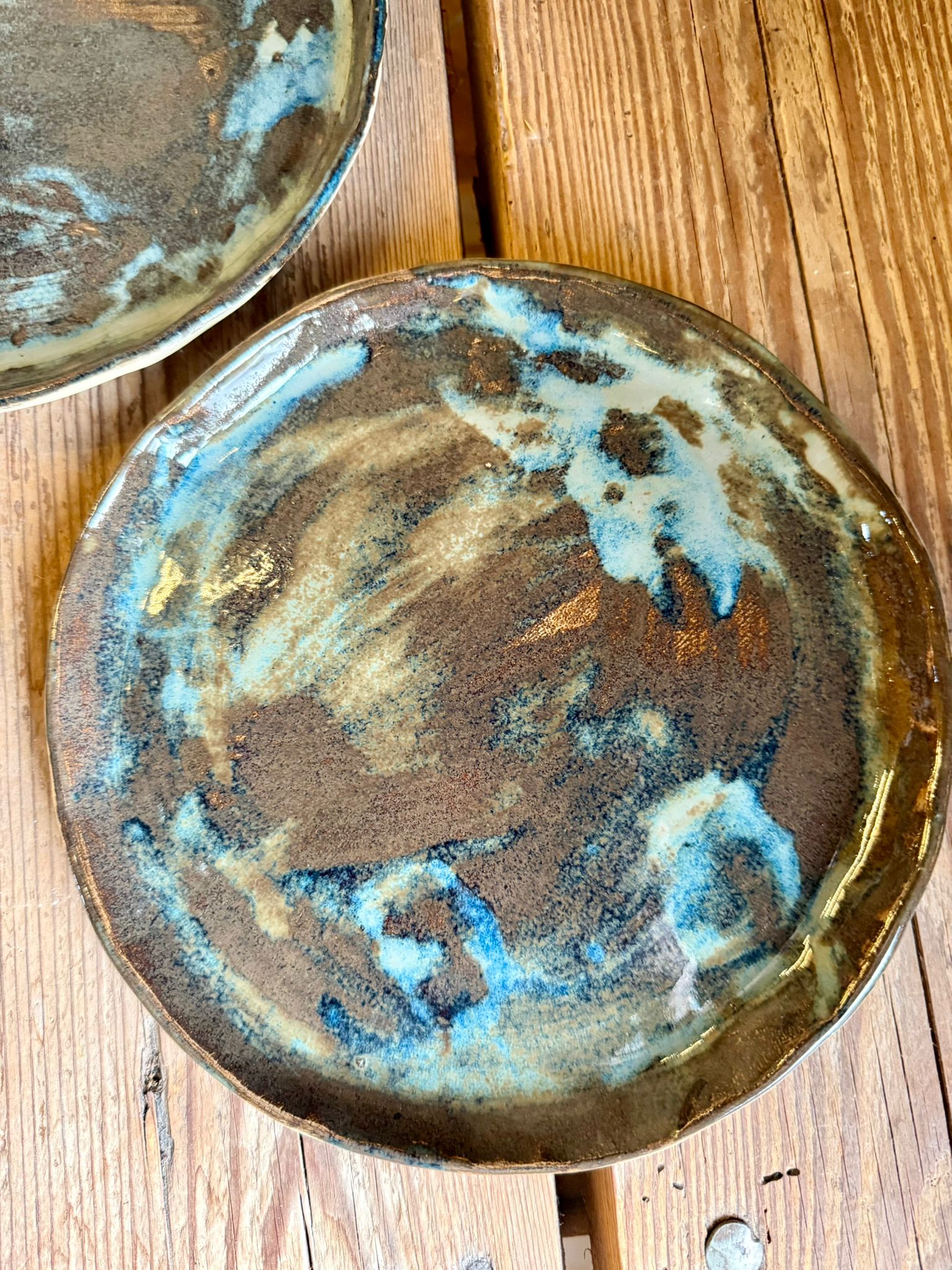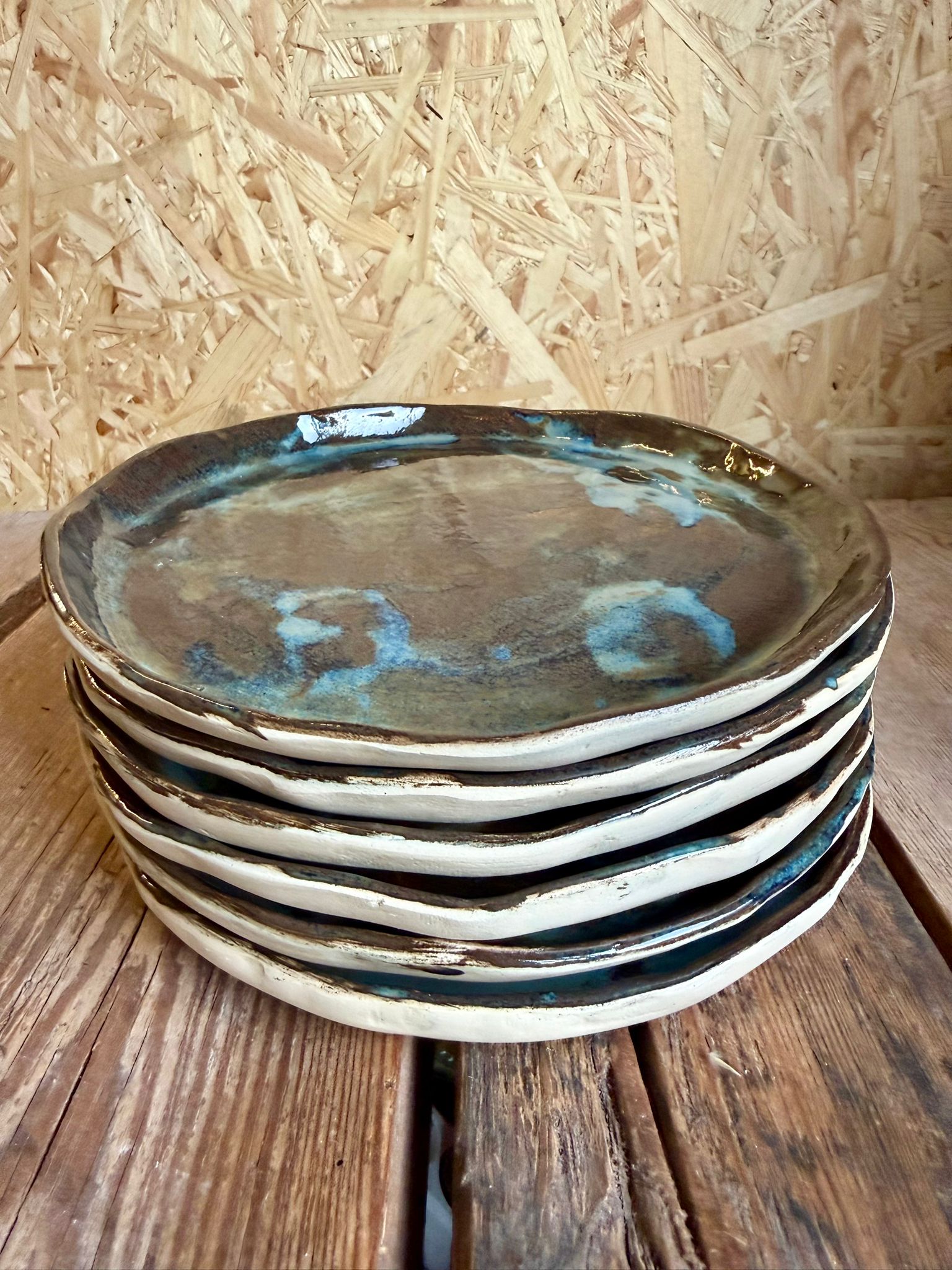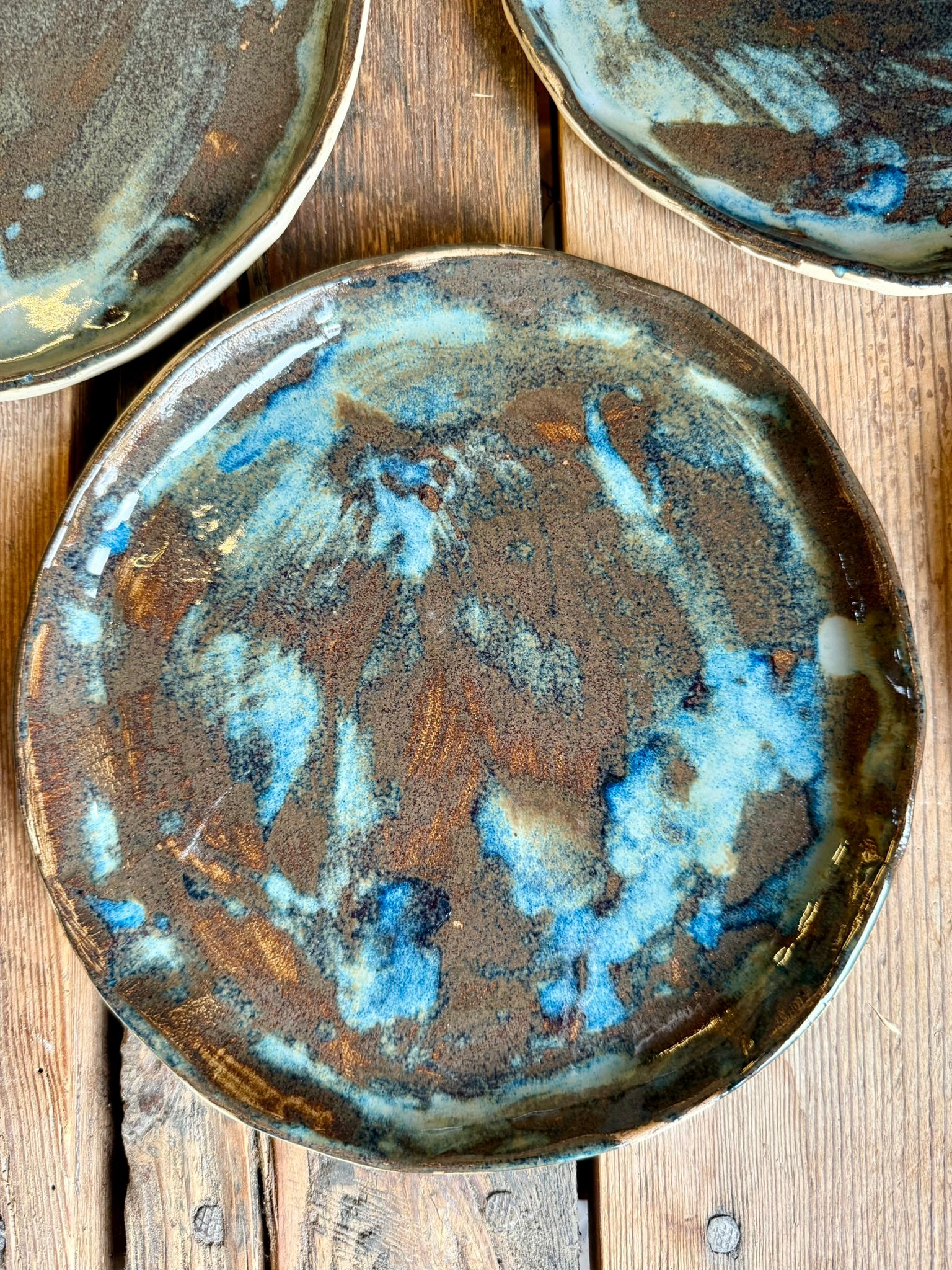 Unikatowe talerze ceramiczne handmade wykonane z jasnej gliny, szkliwione efektowym, błyszczącym szkliwem w odcieniach granatu i brązów. Każdy egzemplarz powstaje ręcznie, dlatego nie ma dwóch identycznych talerzy – różnice w szkliwie i fakturze są naturalne i stanowią o wyjątkowym charakterze ceramiki. Razem tworzą spójną, harmonijną kolekcję, którą możesz dowolnie kompletować.