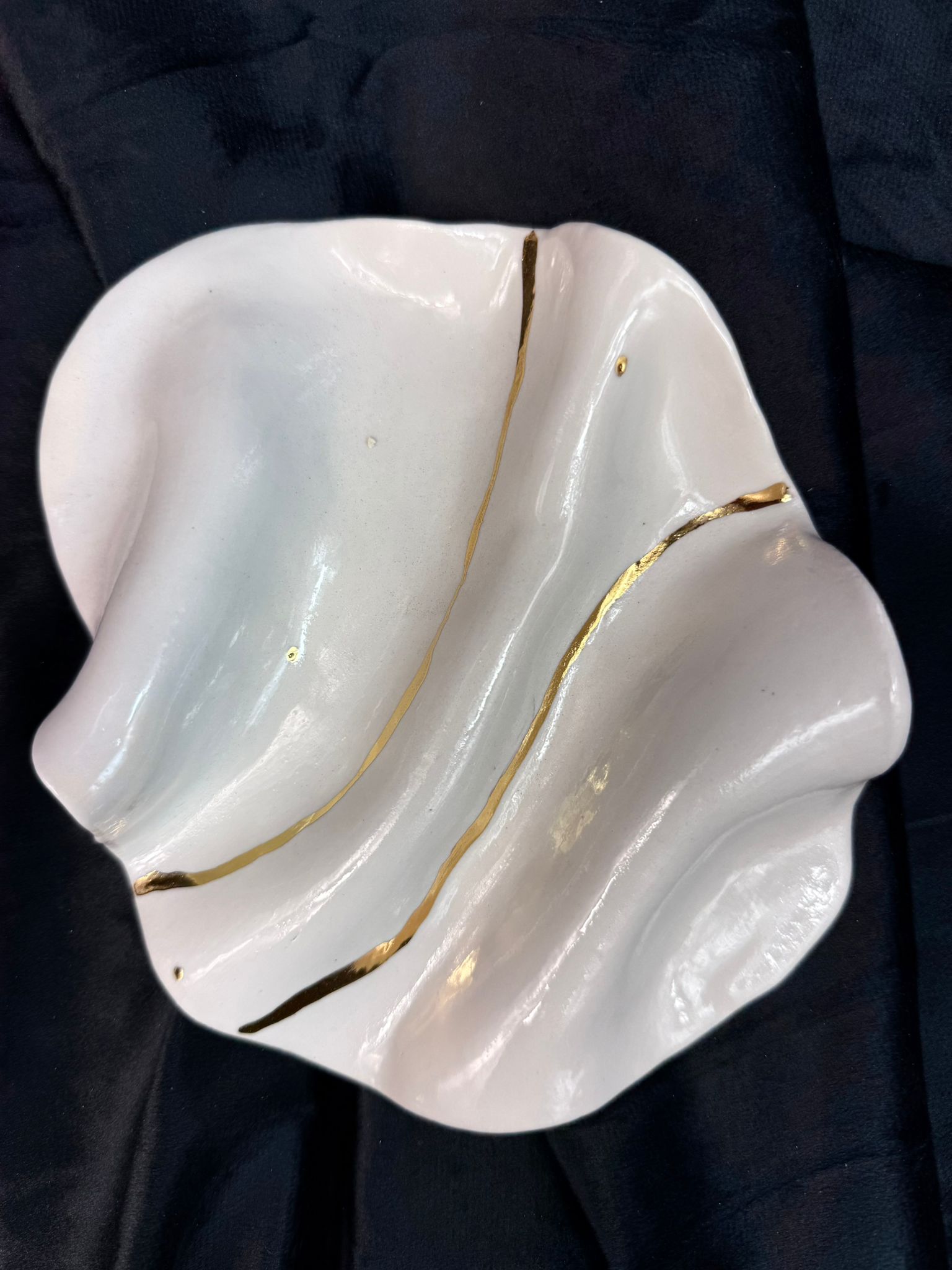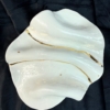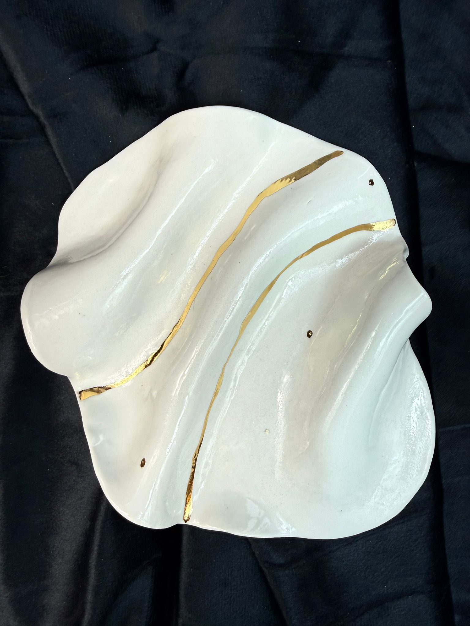 Ręcznie wykonany talerzyk z wysokiej klasy białej porcelany, inspirowany naturalnym ruchem i płynnością form. Miękkie linie oraz delikatne zagłębienia sprawiają, że każdy egzemplarz ma organiczny, rzeźbiarski charakter i jest absolutnie niepowtarzalny. Powierzchnia została pokryta transparentnym, błyszczącym szkliwem, które podkreśla czystość porcelany i subtelnie odbija światło. Talerzyk zdobią nieregularne linie wykonane z prawdziwego złota, przypominające naturalne żyły w kamieniu lub płynący strumień – symbol ruchu, harmonii i ciągłości. Proces tworzenia jest wydłużony i wieloetapowy. Przedmiot został trzykrotnie wypalany, aby odpowiednio utrwalić złote zdobienia i zapewnić im trwałość oraz głębię koloru. Talerzyk doskonale sprawdzi się jako porcelanowy talerzyk na biżuterię, drobne przedmioty lub jako dekoracyjny element wnętrza – na toaletce, stoliku nocnym lub komodzie. Można myć w zmywarce, jednak dla zachowania złota w idealnym stanie zalecane jest mycie ręczne.
