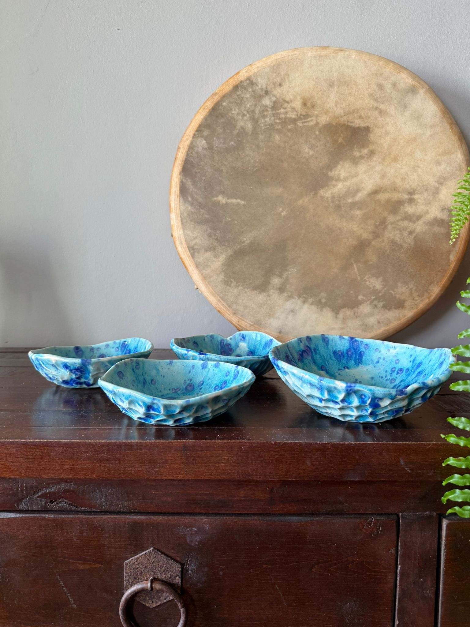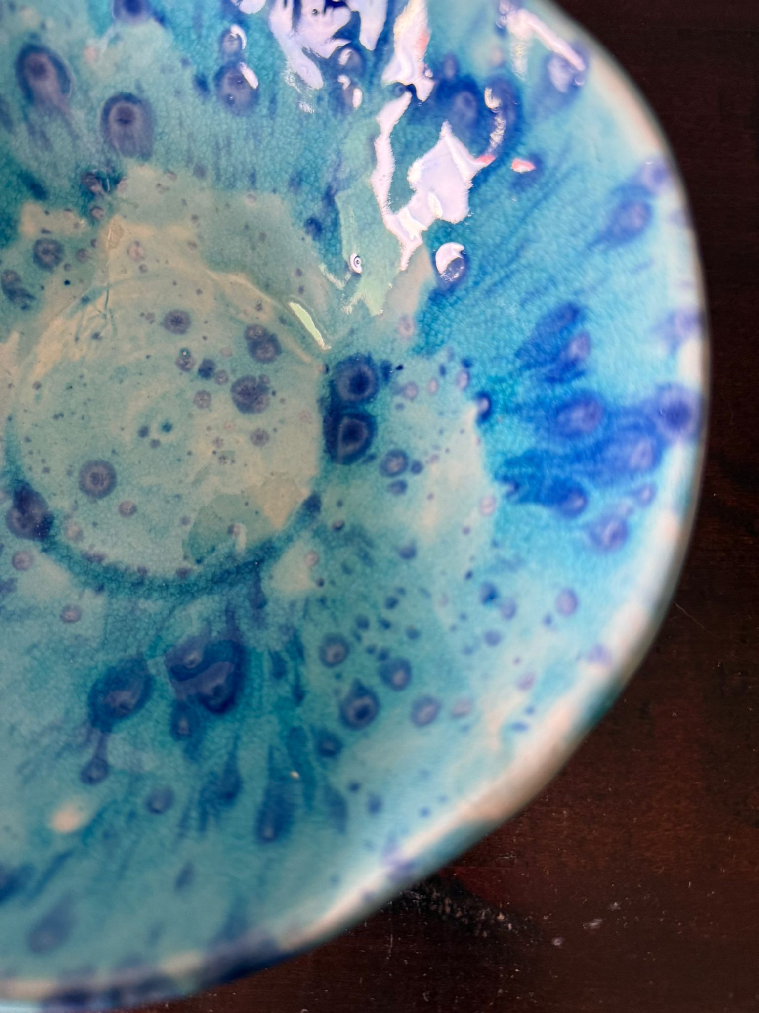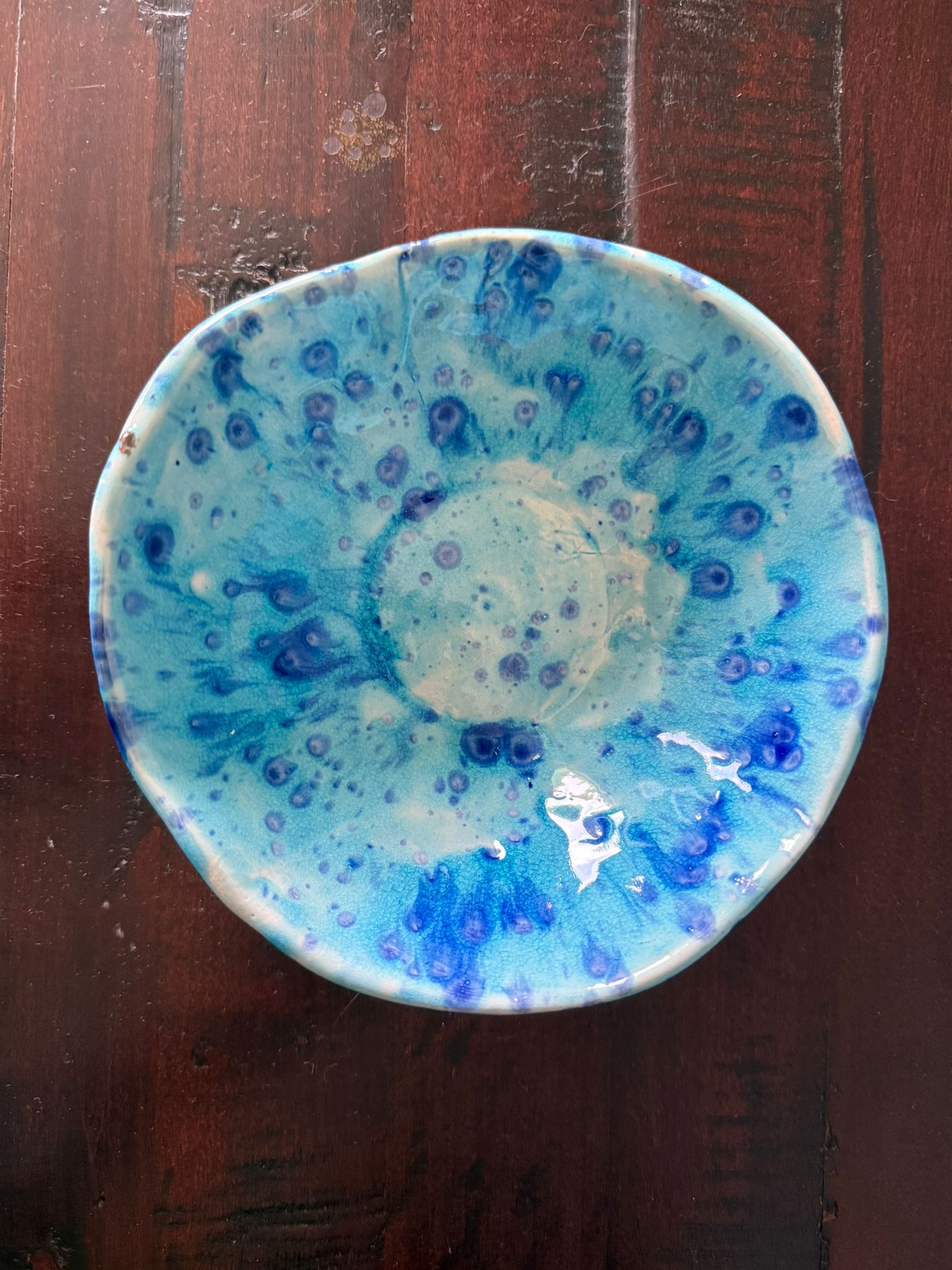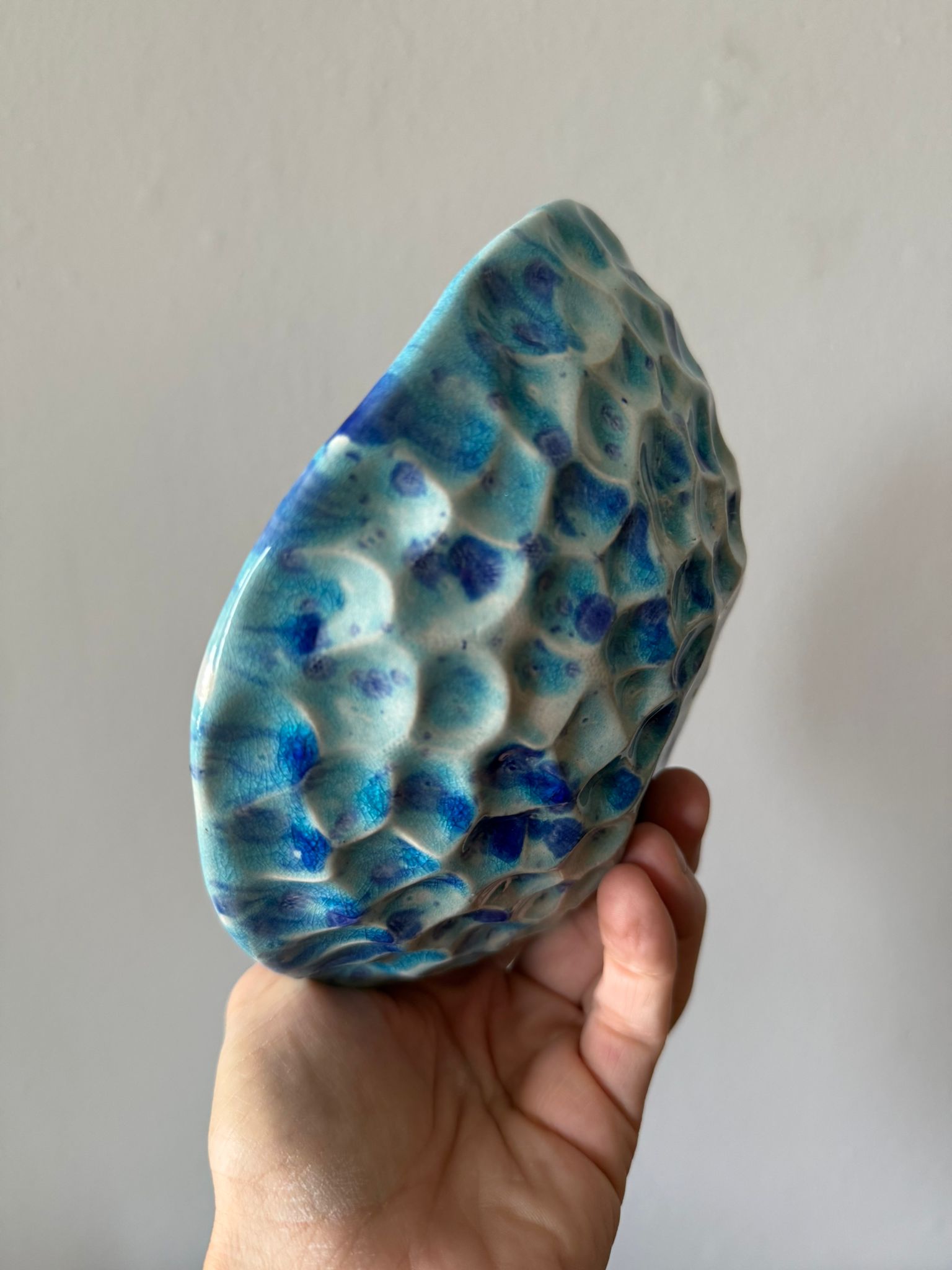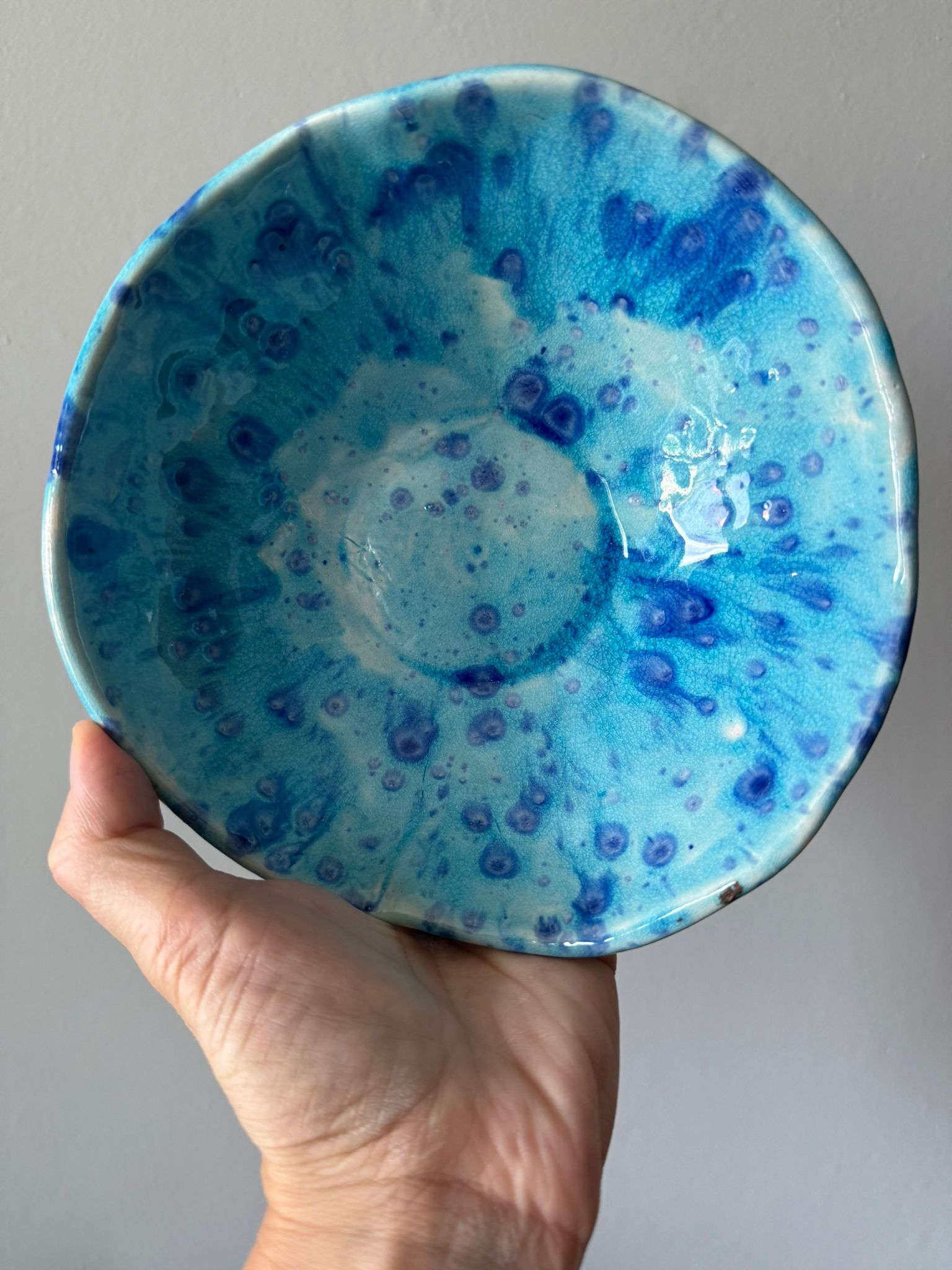 Ręcznie wykonana miska ceramiczna z kolekcji Galaktyczne Turquoise łączy funkcjonalność z artystycznym wyrazem. Wnętrze miski pokryte jest błyszczącym turkusowym szkliwem z efektem Craquele, a rozproszone granatowe plamki przypominają migoczące gwiazdy w miniaturowej galaktyce. Zewnętrzna struktura miski sprawia, że każda sztuka jest unikalna i wyjątkowa.