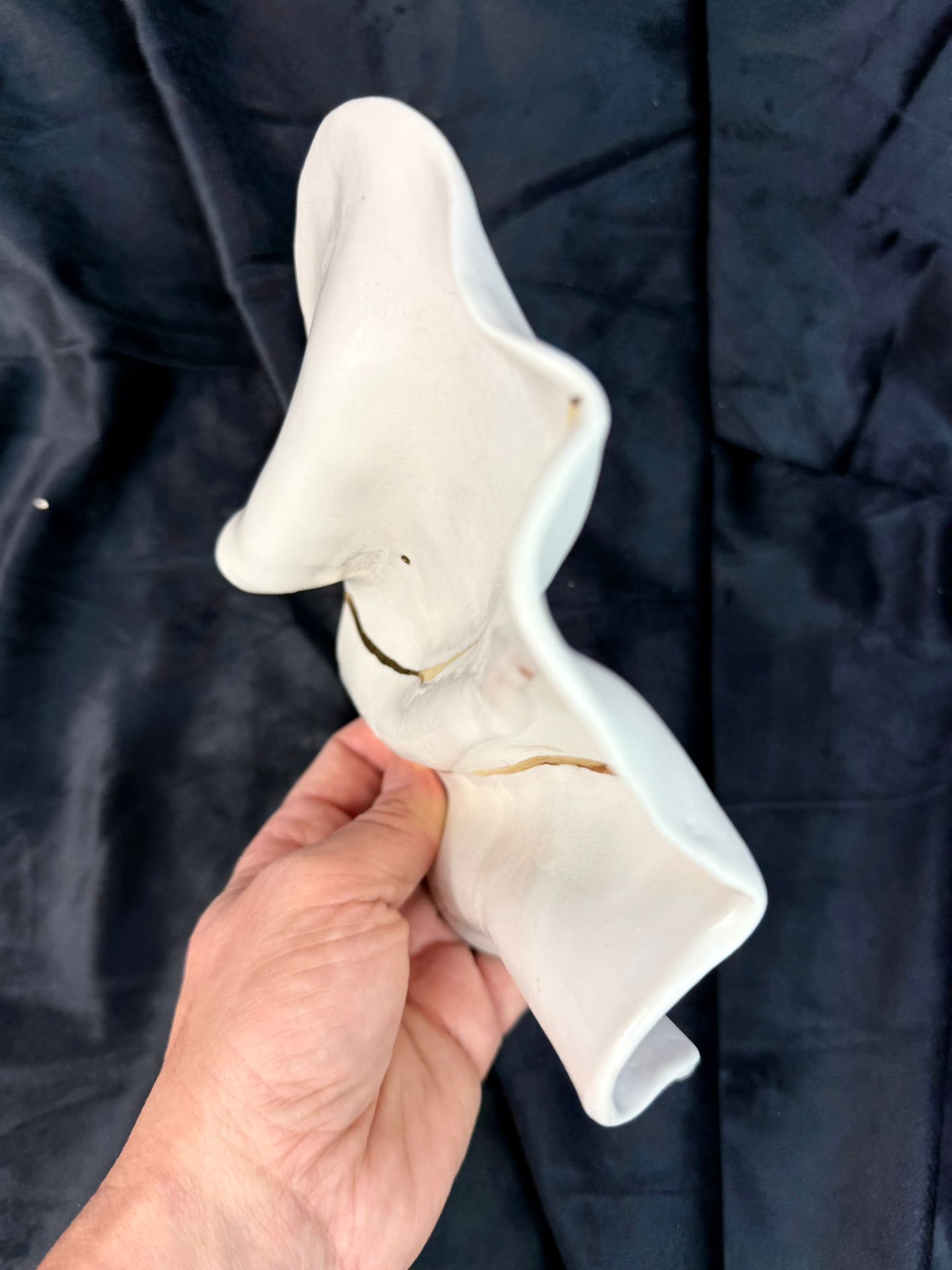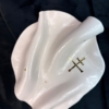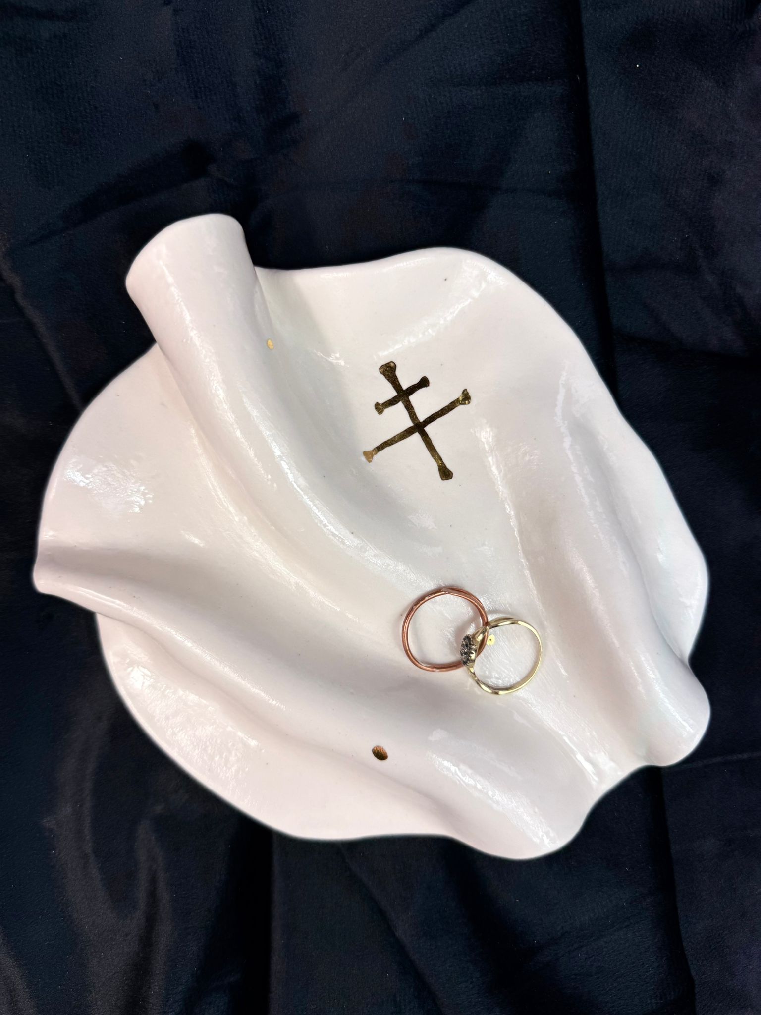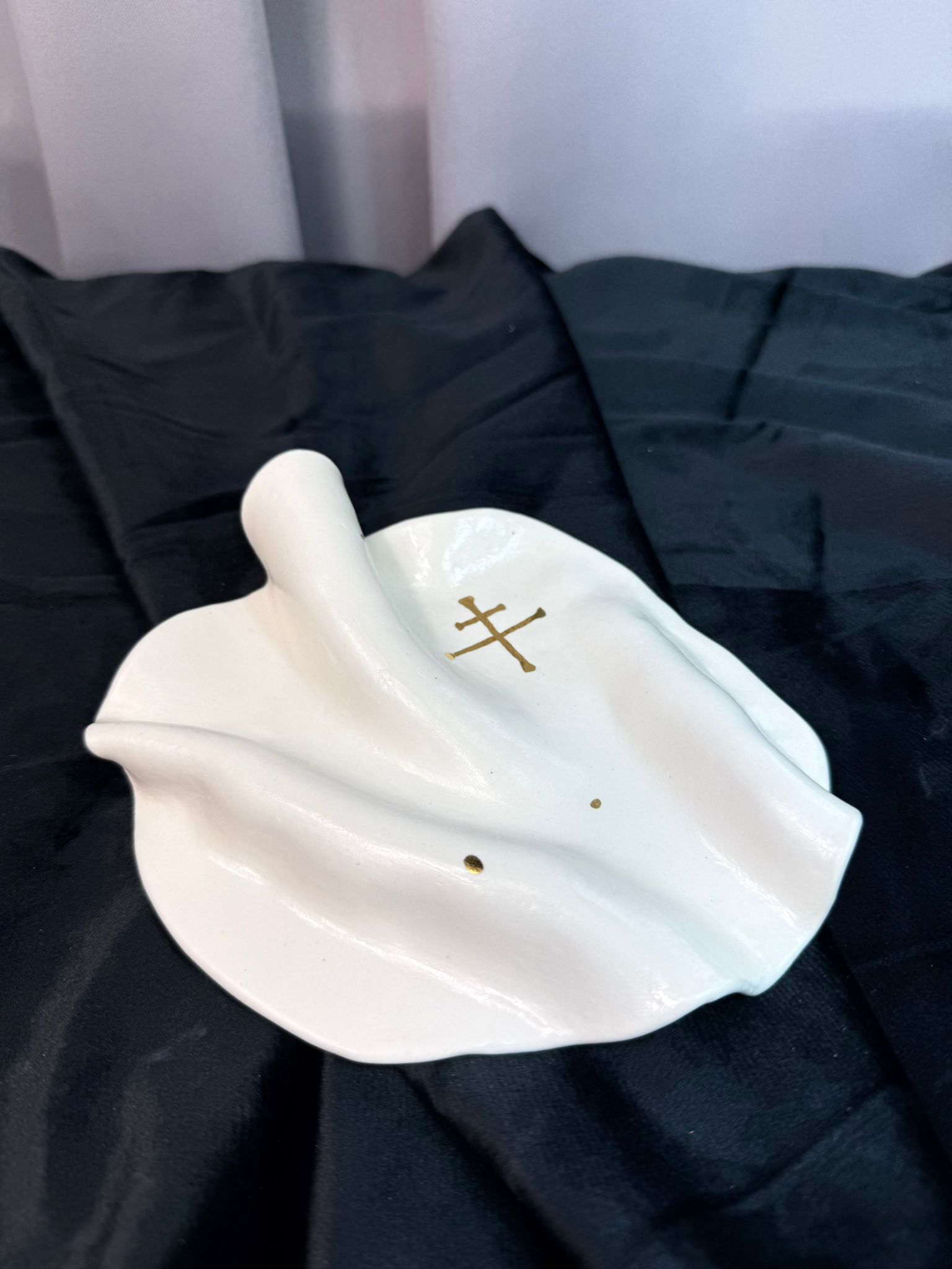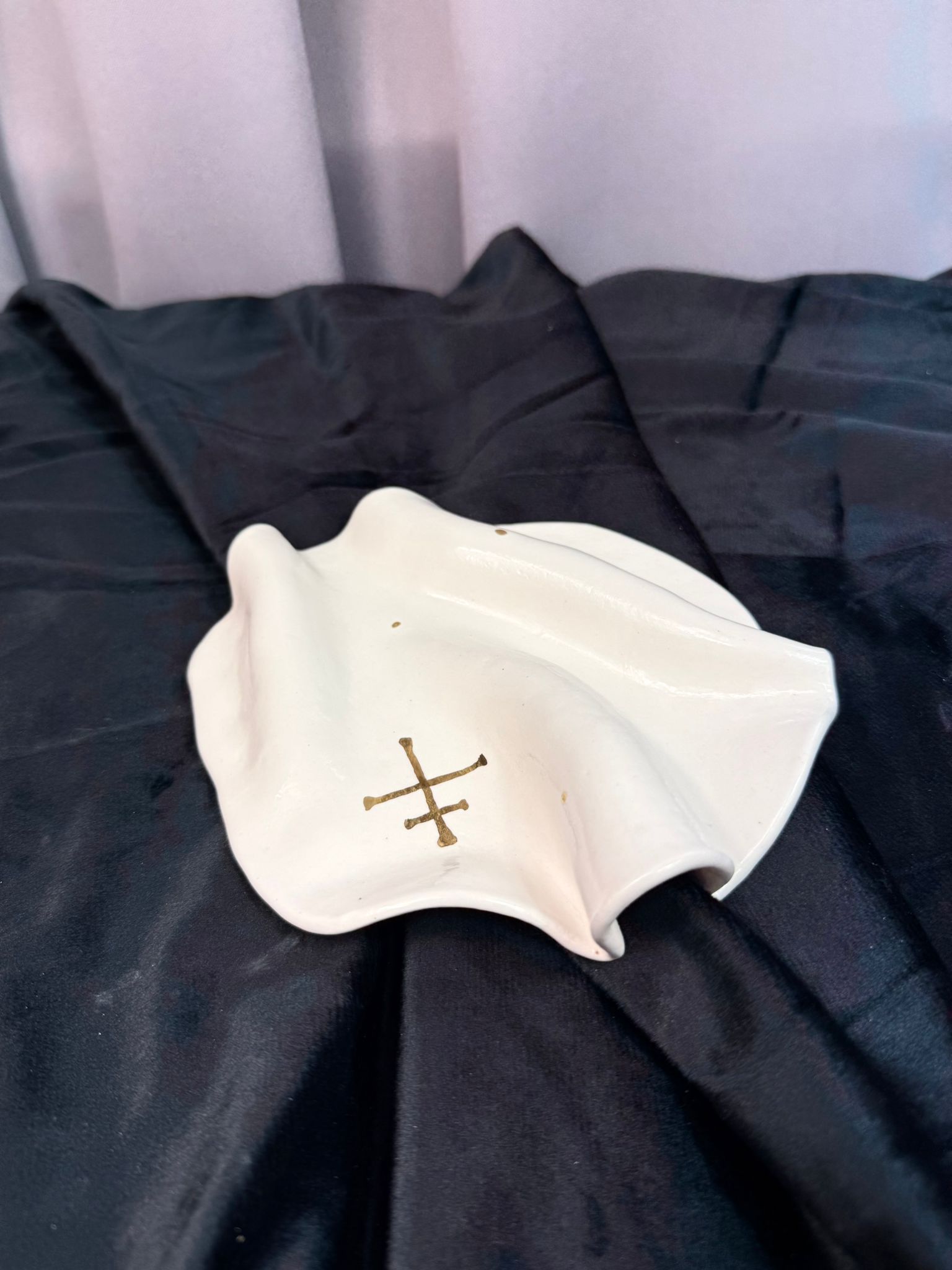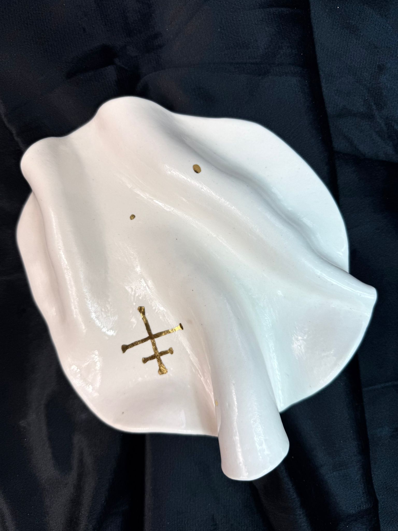 Ręcznie wykonany talerzyk z wysokiej klasy białej porcelany, uformowany w organiczną, miękko falującą formę inspirowaną naturą i naturalnym ruchem materii. Każdy egzemplarz jest unikatowy – tworzony bez użycia form, z pełnym poszanowaniem rzemiosła i indywidualnego charakteru materiału. Powierzchnia została pokryta transparentnym szkliwem o wysokim połysku, które subtelnie odbija światło i podkreśla czystość porcelany. Centralnym elementem dekoracyjnym jest symbol słowiański wykonany z prawdziwego złota, utrwalony w procesie trzykrotnego wypalania, co zapewnia trwałość oraz szlachetną głębię koloru.