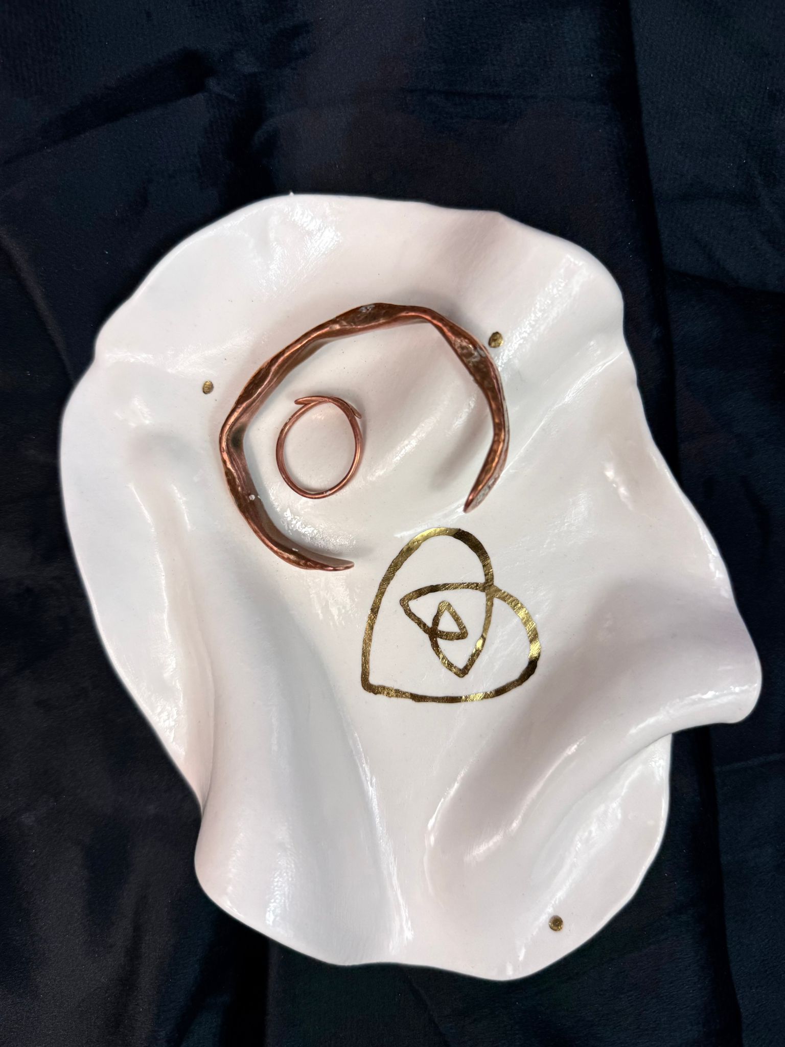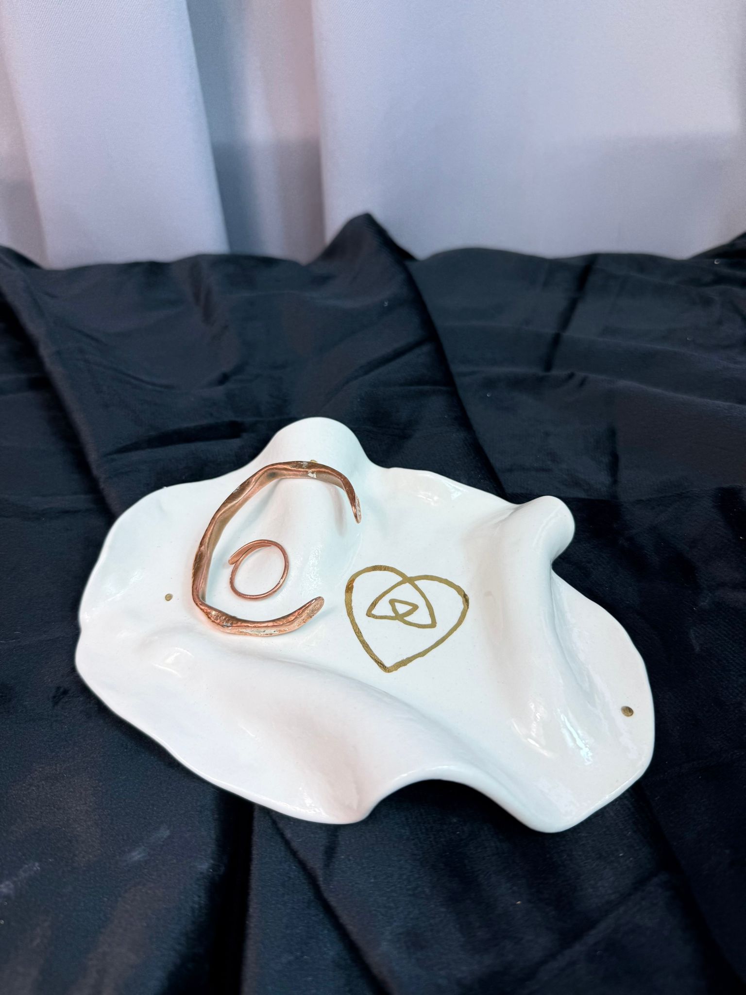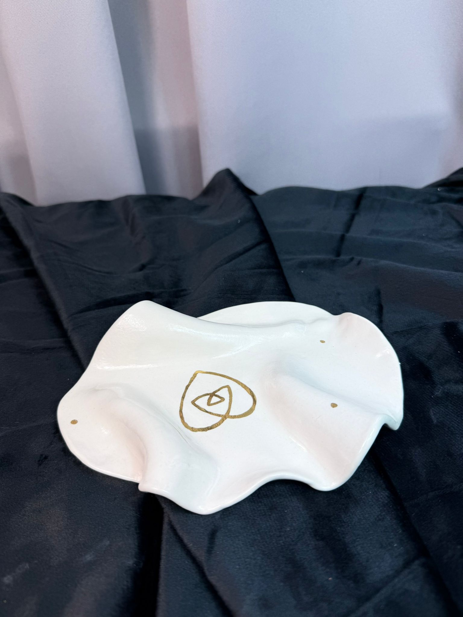 Ręcznie wykonany talerzyk z wysokiej klasy białej porcelany, uformowany w miękką, organiczną formę inspirowaną naturalnym ruchem i delikatnością materii. Każdy egzemplarz jest niepowtarzalny, tworzony ręcznie z uważnością na detal i proporcję. Powierzchnia została pokryta transparentnym, błyszczącym szkliwem, które podkreśla czystość porcelany i subtelnie odbija światło. Centralnym motywem dekoracyjnym jest złoty symbol wykonany z prawdziwego złota, utrwalony w procesie trzykrotnego wypalania, co nadaje mu trwałość i szlachetną głębię.Talerzyk doskonale sprawdzi się jako talerzyk na biżuterię, drobne osobiste przedmioty lub jako symboliczna dekoracja wnętrza – na toaletce, komodzie lub w miejscu intencji. Można myć w zmywarce, jednak dla zachowania złotych zdobień w idealnym stanie zalecane jest mycie ręczne. Złoty znak umieszczony na talerzyku to autorski symbol serca połączonego z trójkątem.