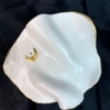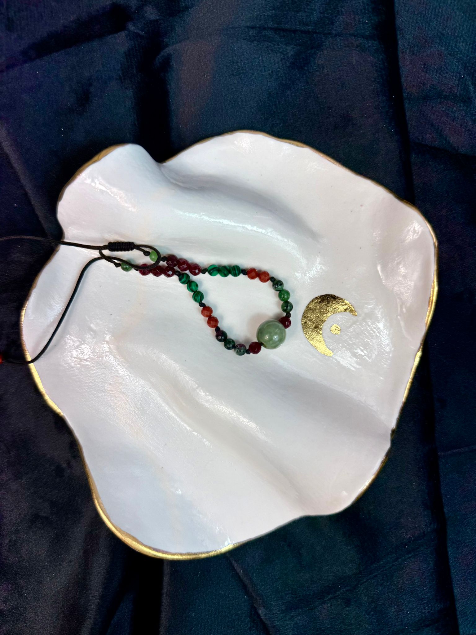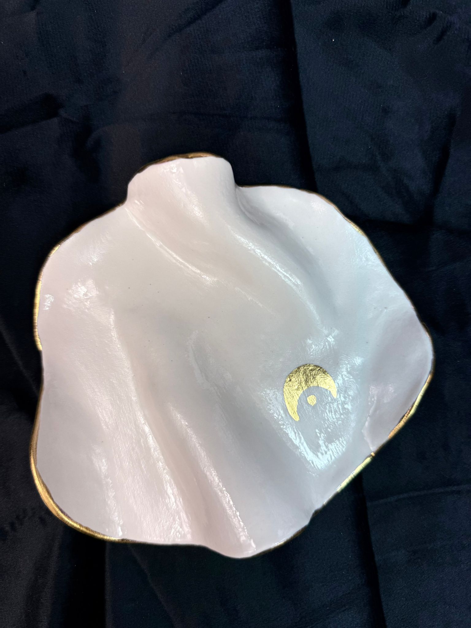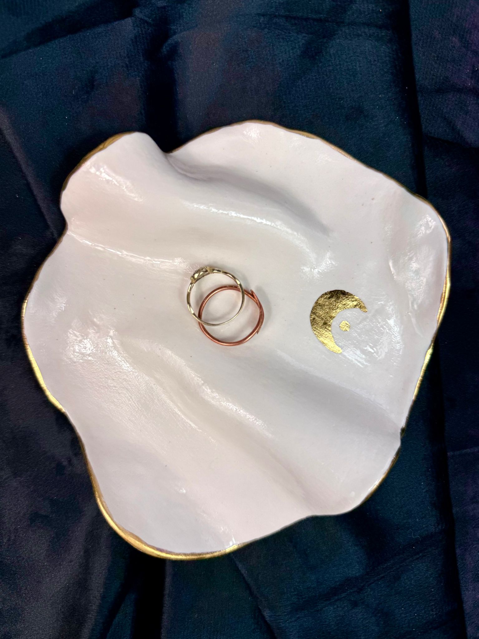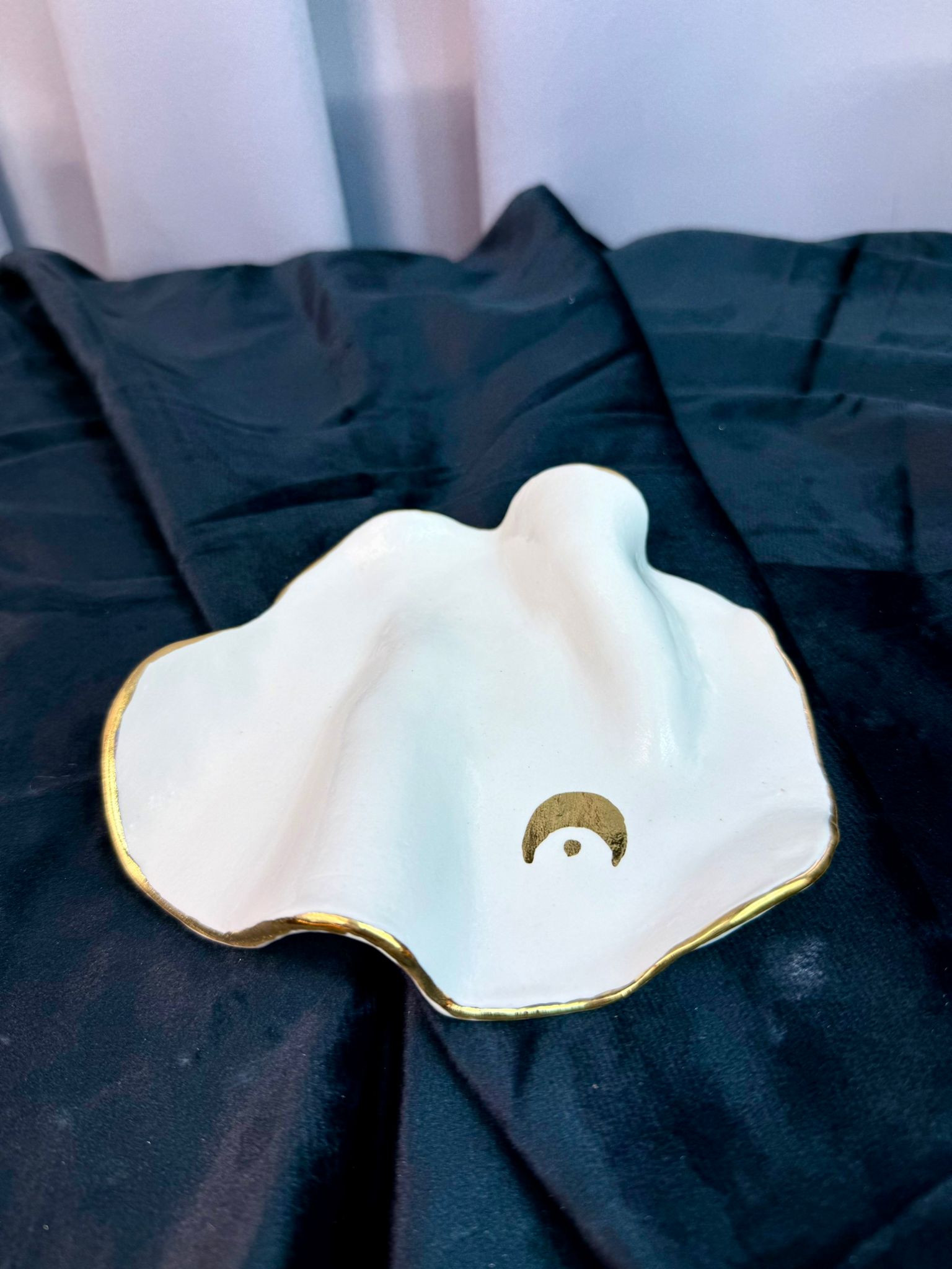 Ręcznie wykonany talerzyk z wysokiej klasy białej porcelany, o organicznej, miękko falującej formie inspirowanej naturą i cyklicznością przyrody. Każdy egzemplarz jest unikatem, formowany ręcznie i wykańczany z uważnością na detal. Powierzchnia została pokryta transparentnym, błyszczącym szkliwem, które subtelnie odbija światło i podkreśla szlachetność porcelany. Krawędzie delikatnie zaakcentowane prawdziwym złotem nadają formie lekkości i elegancji. Centralnym motywem jest złoty symbol księżyca, utrwalony w procesie trzykrotnego wypalania, co zapewnia trwałość zdobień i głębię koloru. Talerzyk idealnie sprawdzi się jako talerzyk na biżuterię, drobne osobiste przedmioty lub jako symboliczna dekoracja wnętrza – na toaletce, stoliku nocnym lub w przestrzeni rytualnej. Można myć w zmywarce, jednak dla zachowania złota w idealnym stanie zalecane jest mycie ręczne. Złoty półksiężyc to jeden z najstarszych i najbardziej uniwersalnych symboli świata.
