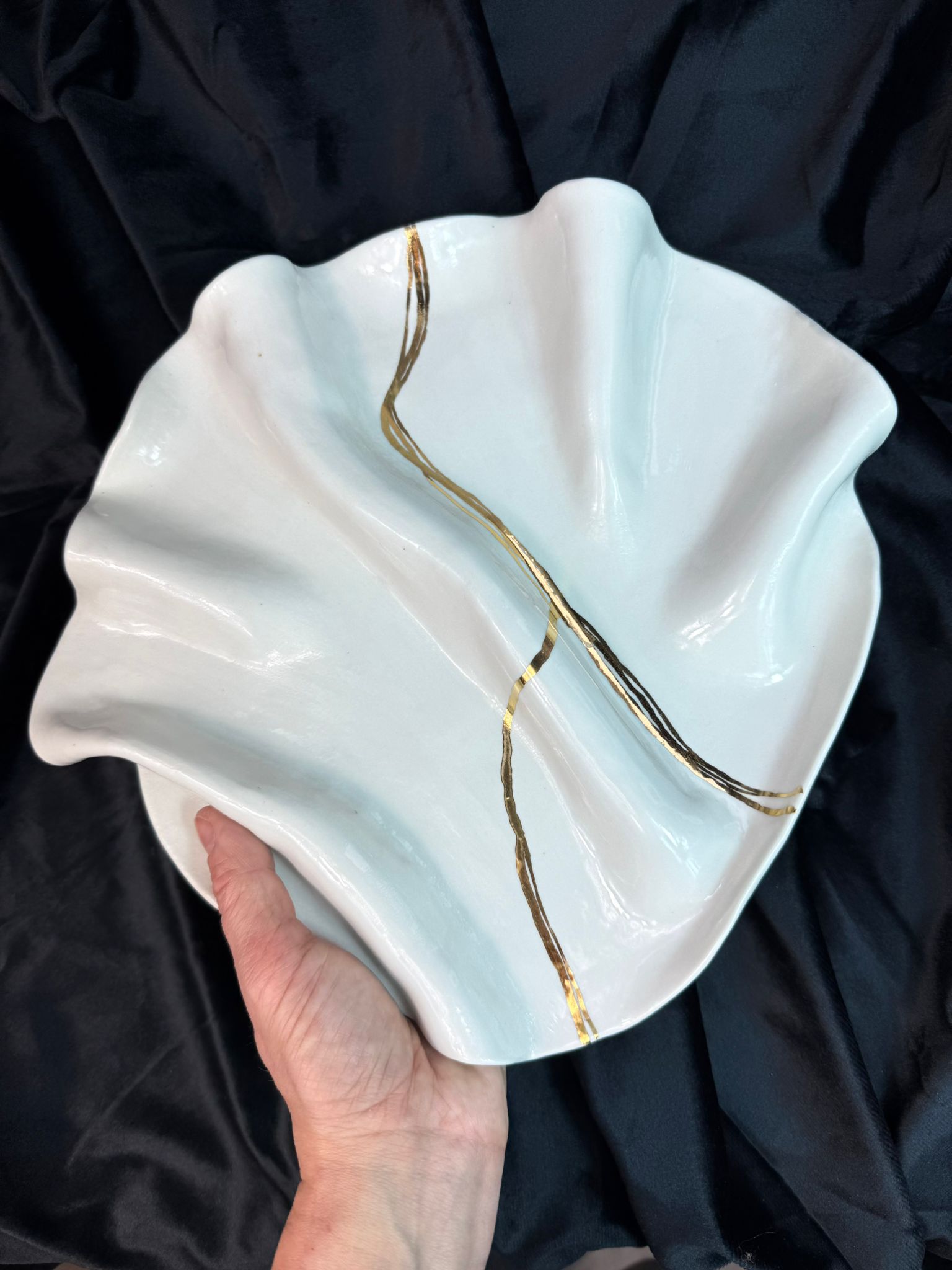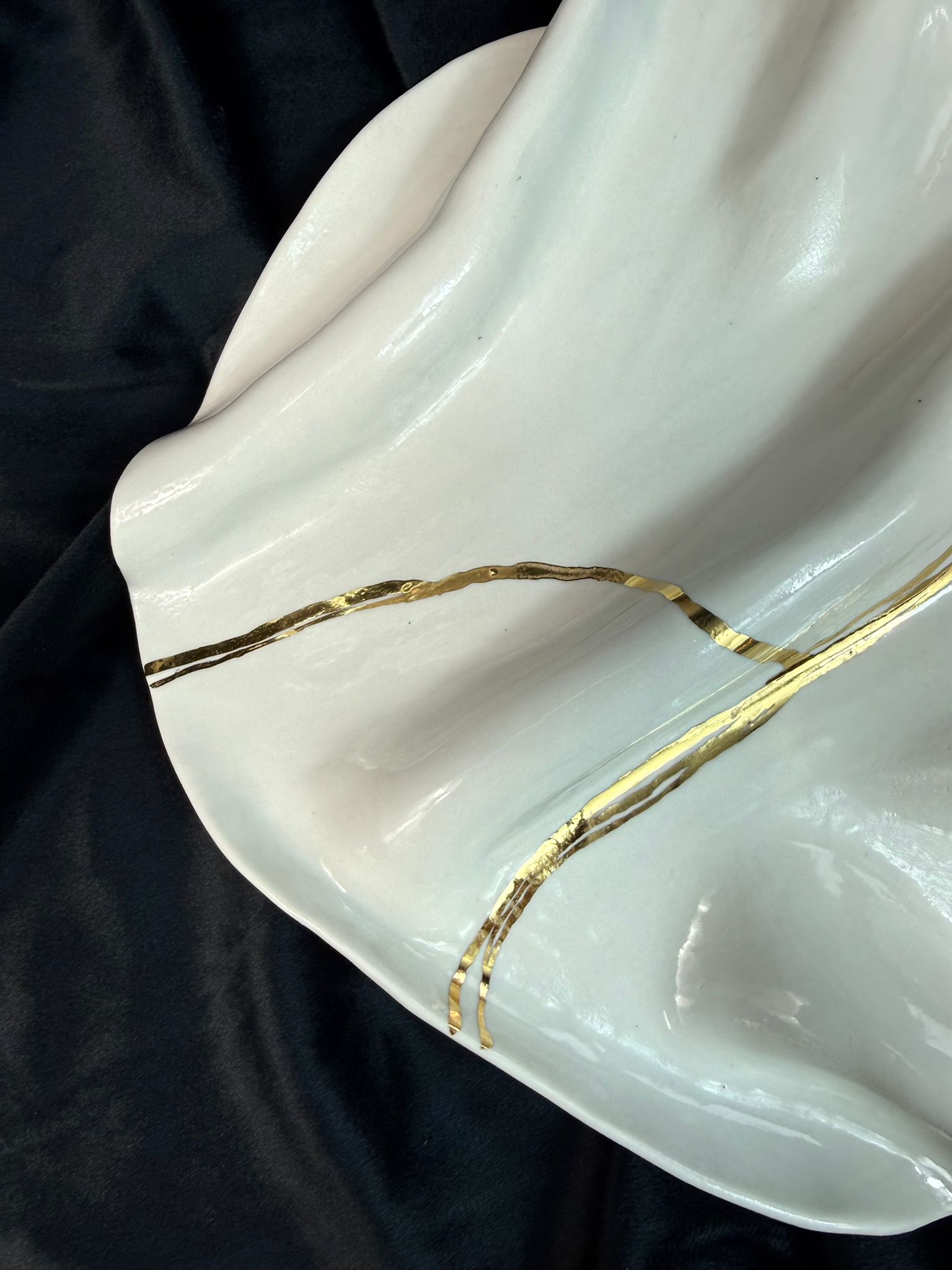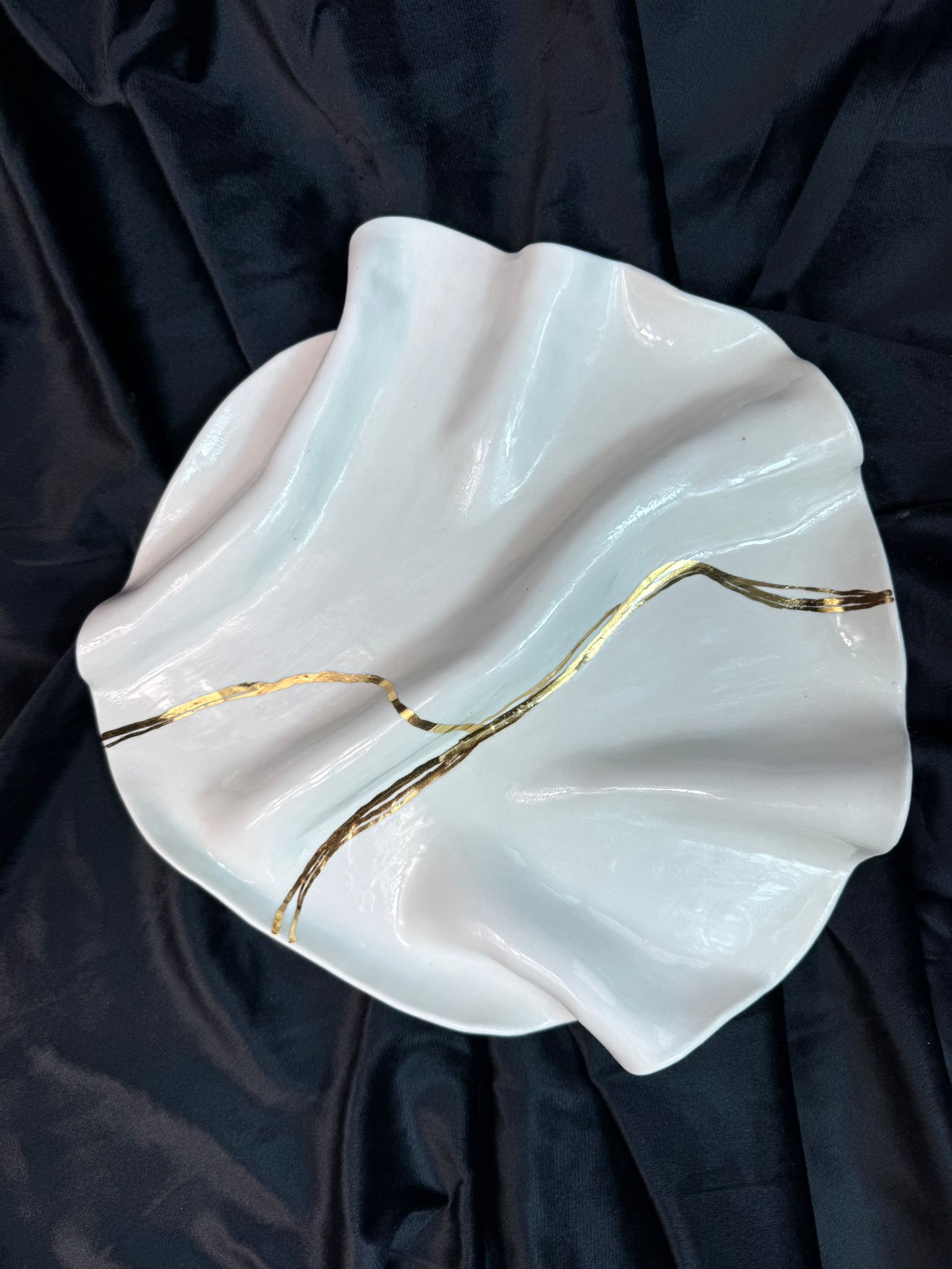 Ten wyjątkowy talerz został wykonany ręcznie z wysokiej jakości białej porcelany, której subtelny połysk pięknie podkreśla nieregularną, organiczną formę. Powierzchnia pokryta jest transparentnym szkliwem, a całość zdobią płynne, ręcznie malowane linie z prawdziwego złota, prowadzone swobodnie przez bryłę talerza niczym delikatny strumień. Proces powstawania tego obiektu jest czasochłonny i wieloetapowy – talerz wymaga trzykrotnego wypału w piecu ceramicznym, aby odpowiednio utrwalić złote zdobienia i zapewnić im trwałość. Każdy egzemplarz jest unikatem – nie ma dwóch identycznych form ani identycznie poprowadzonych linii.