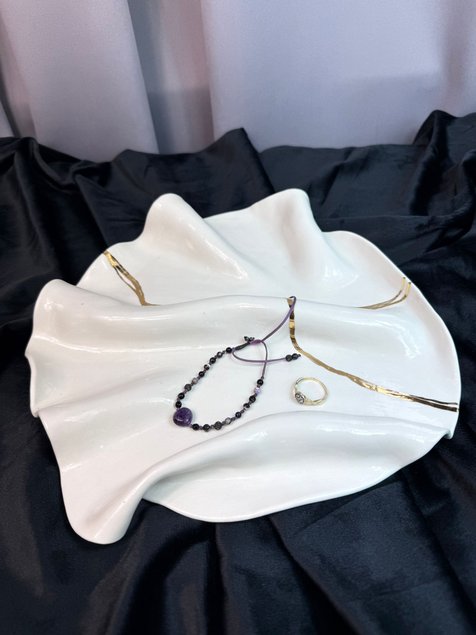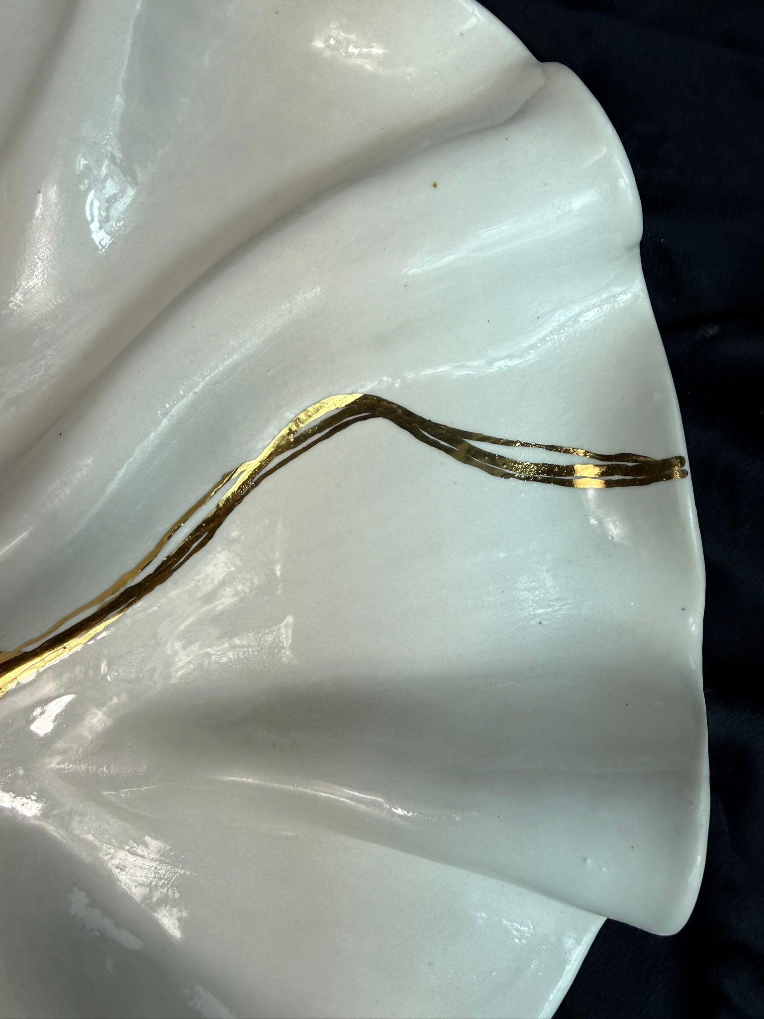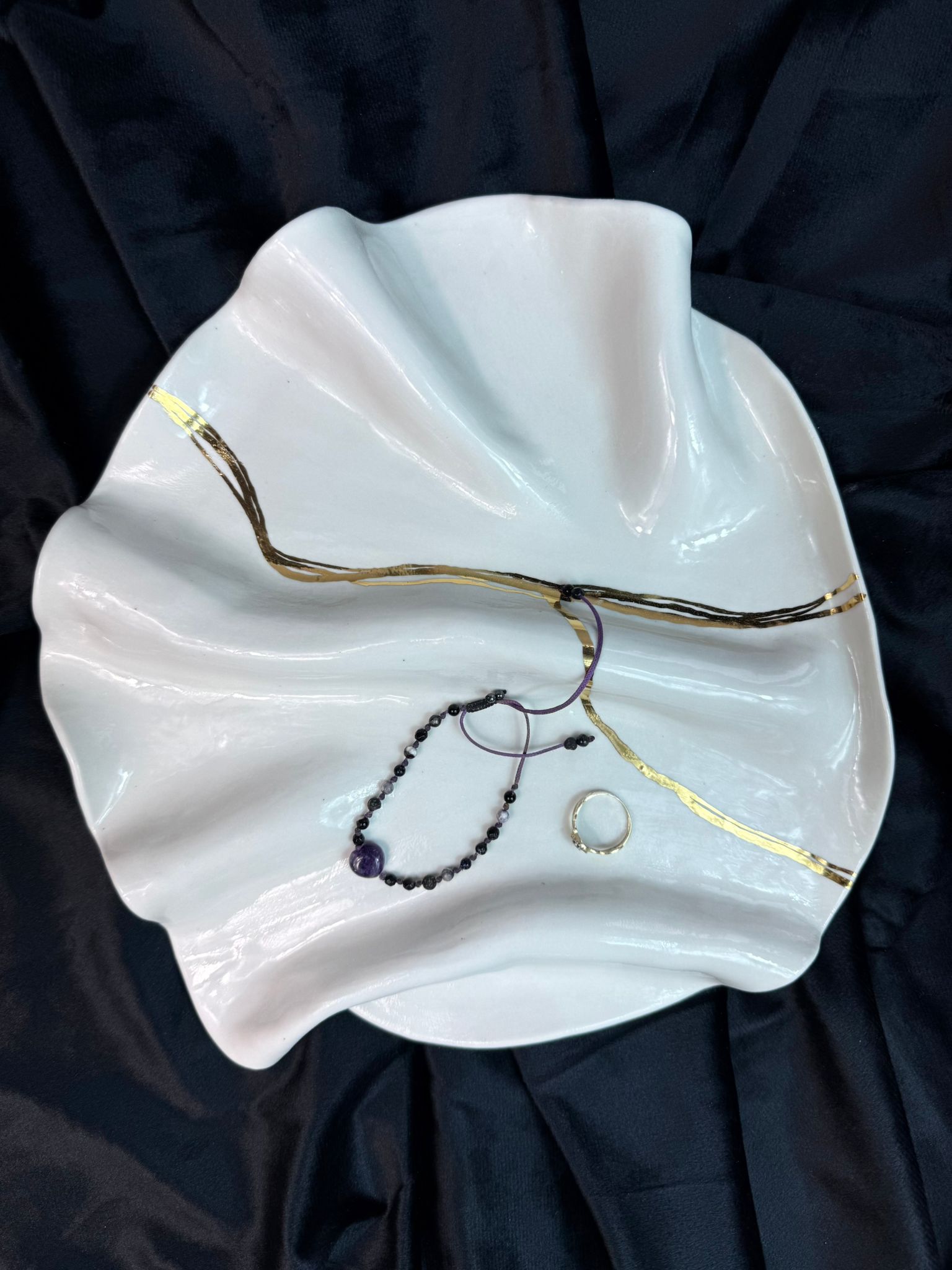 Ten wyjątkowy talerz został wykonany ręcznie z wysokiej jakości białej porcelany, której subtelny połysk pięknie podkreśla nieregularną, organiczną formę. Powierzchnia pokryta jest transparentnym szkliwem, a całość zdobią płynne, ręcznie malowane linie z prawdziwego złota, prowadzone swobodnie przez bryłę talerza niczym delikatny strumień. Proces powstawania tego obiektu jest czasochłonny i wieloetapowy – talerz wymaga trzykrotnego wypału w piecu ceramicznym, aby odpowiednio utrwalić złote zdobienia i zapewnić im trwałość. Każdy egzemplarz jest unikatem – nie ma dwóch identycznych form ani identycznie poprowadzonych linii.