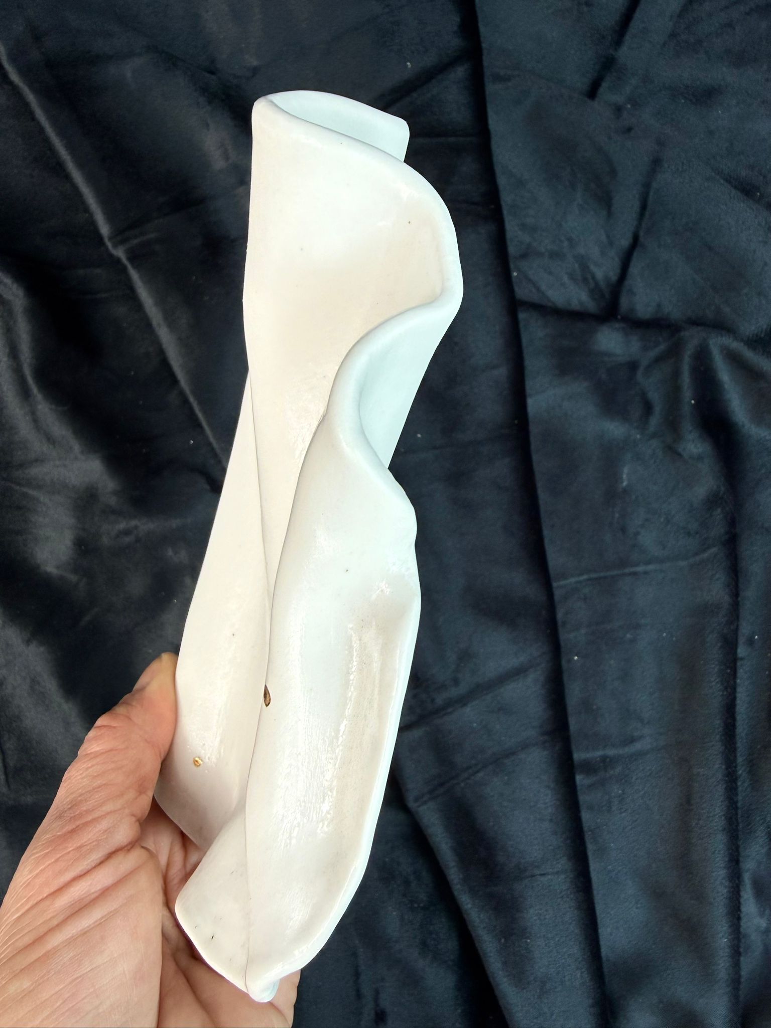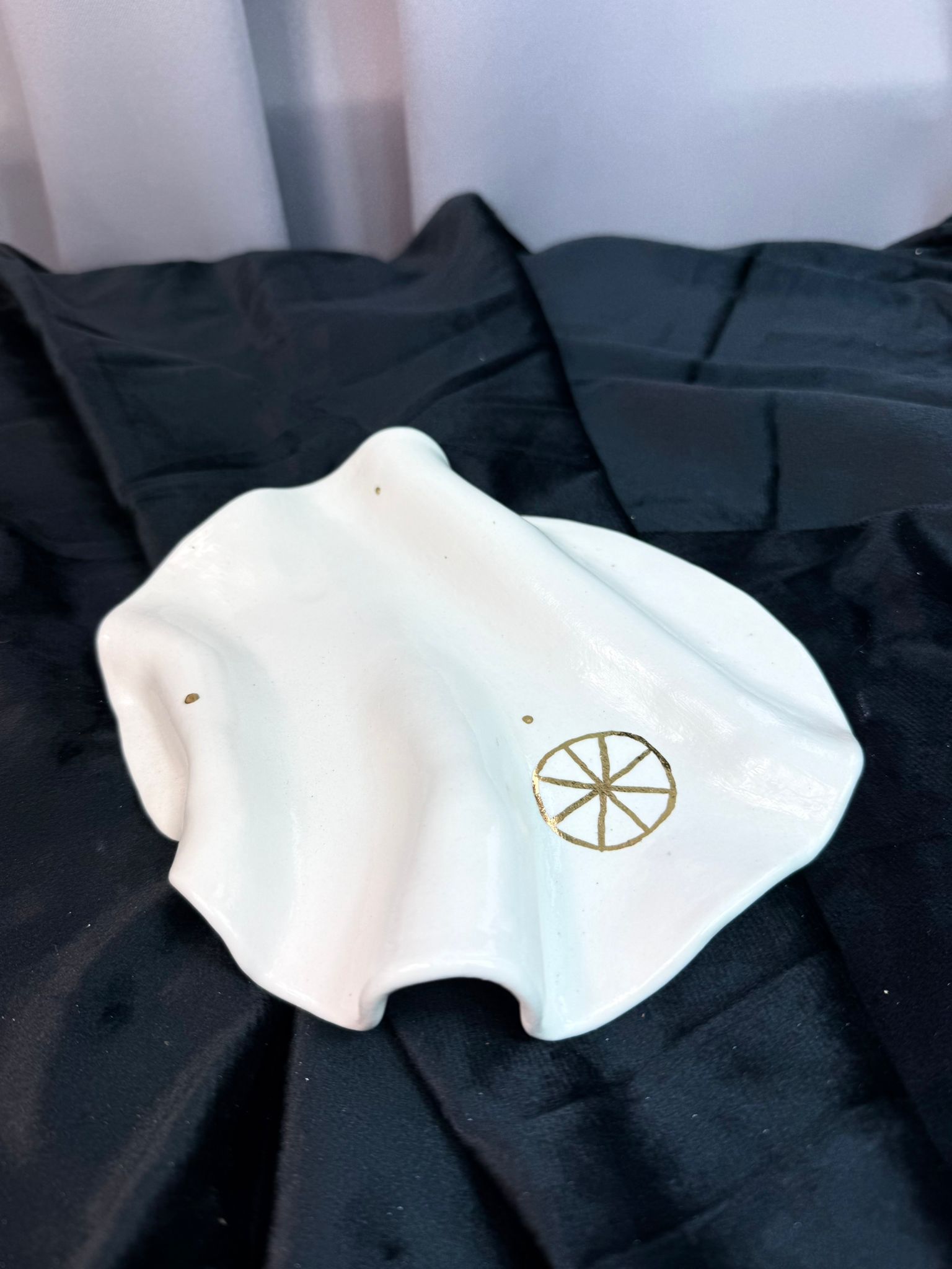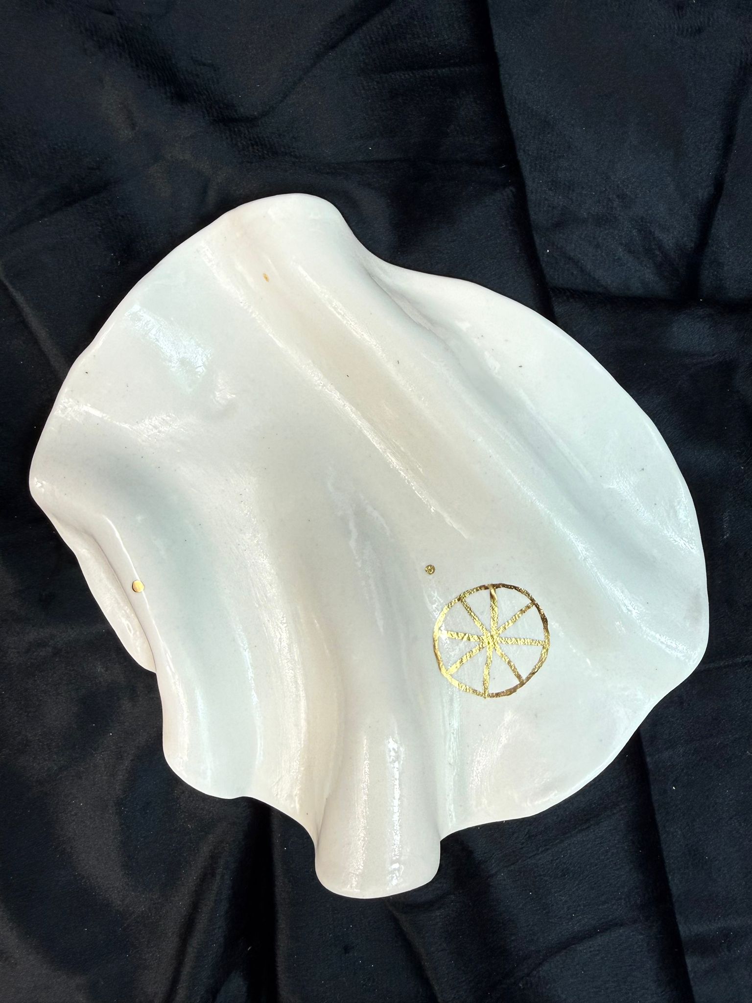 Ten talerzyk został wykonany ręcznie z wysokiej jakości białej porcelany, o miękkiej, organicznej formie inspirowanej naturalnym ruchem i płynnością materii. Powierzchnia pokryta jest transparentnym szkliwem, które podkreśla delikatny połysk porcelany oraz subtelne przejścia światła. Centralnym akcentem jest ręcznie malowany symbol wykonany z prawdziwego złota, uzupełniony drobnymi złotymi punktami.