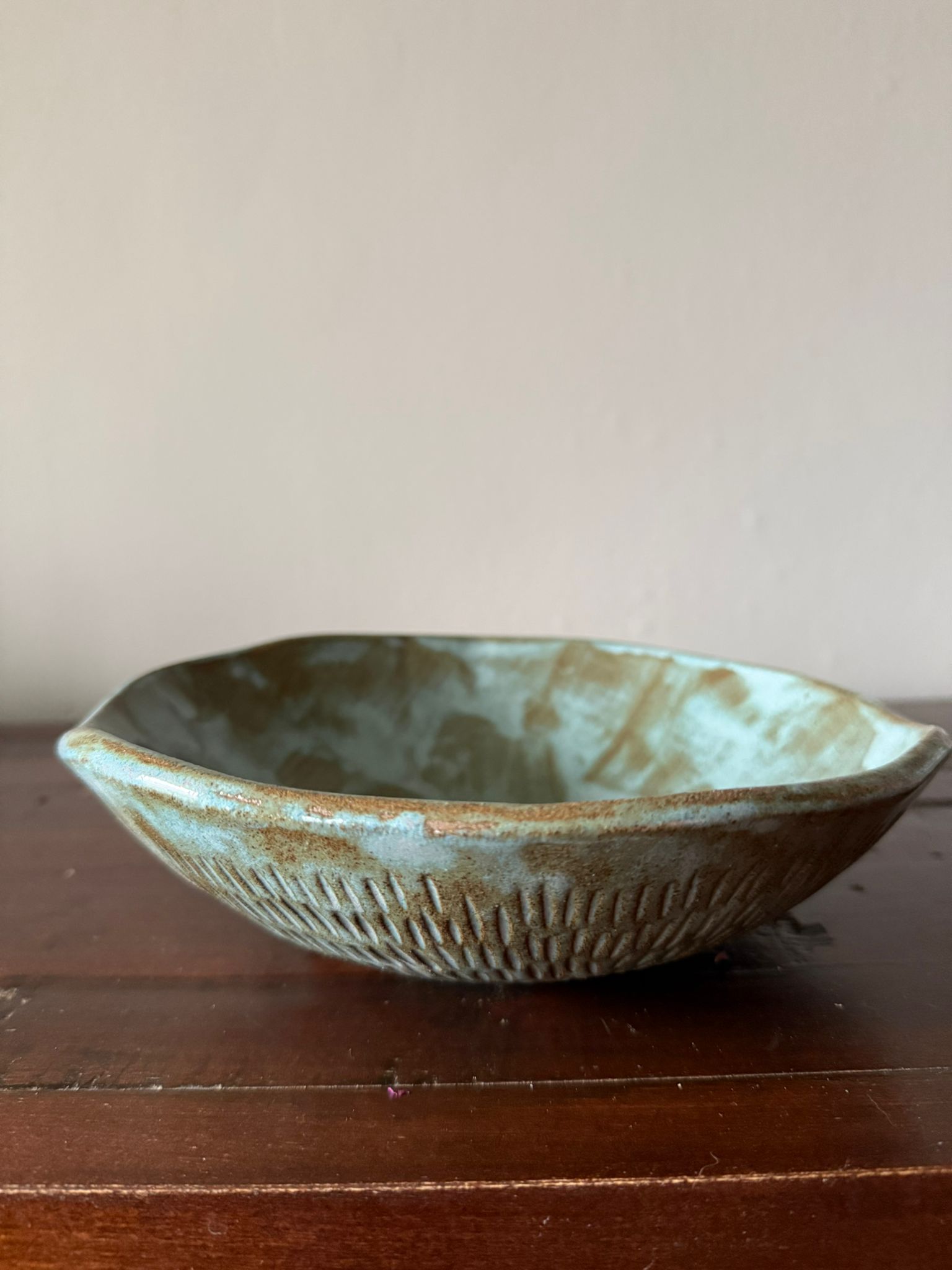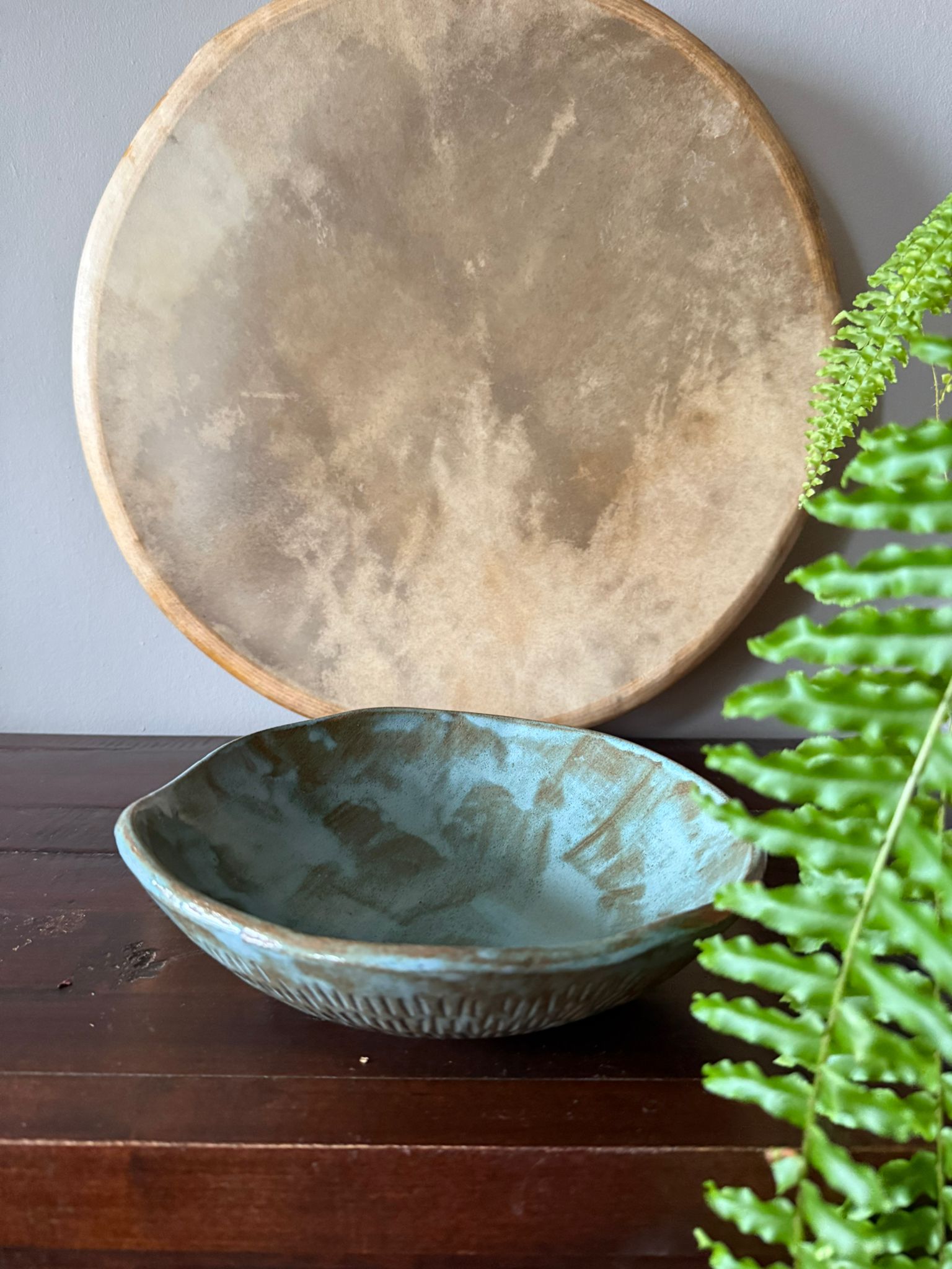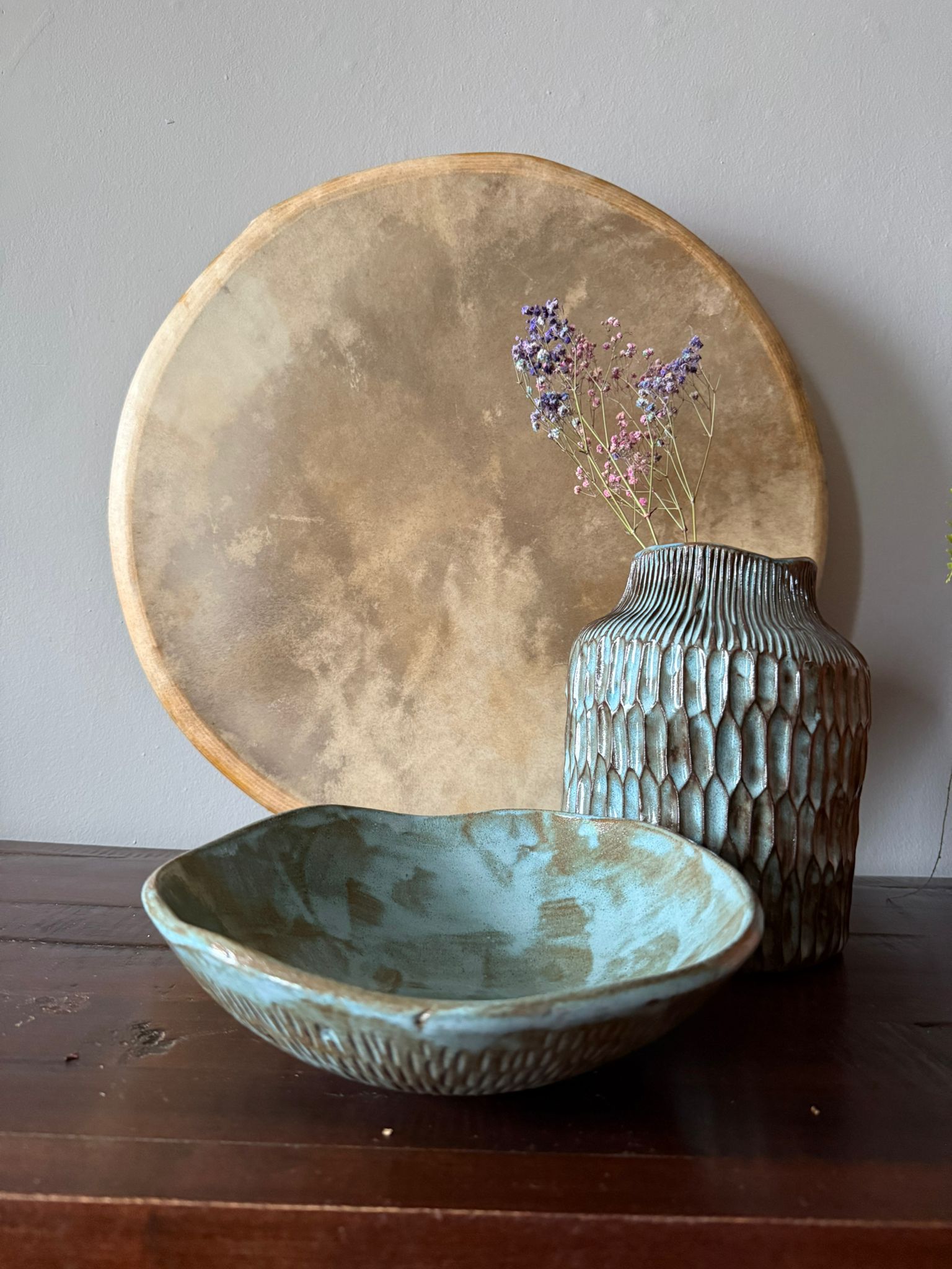 Ta ręcznie wykonana miska ceramiczna powstała z jasnej gliny i pokryta została błyszczącym szkliwem w odcieniach niebieskiego z delikatnymi brązowymi przebarwieniami. Subtelne rzeźbienia na zewnętrznej powierzchni nadają jej wyjątkowy charakter i artystyczny urok. Każda miska jest unikatem, dzięki czemu wnosi do wnętrza ciepło i autentyczność rękodzieła.