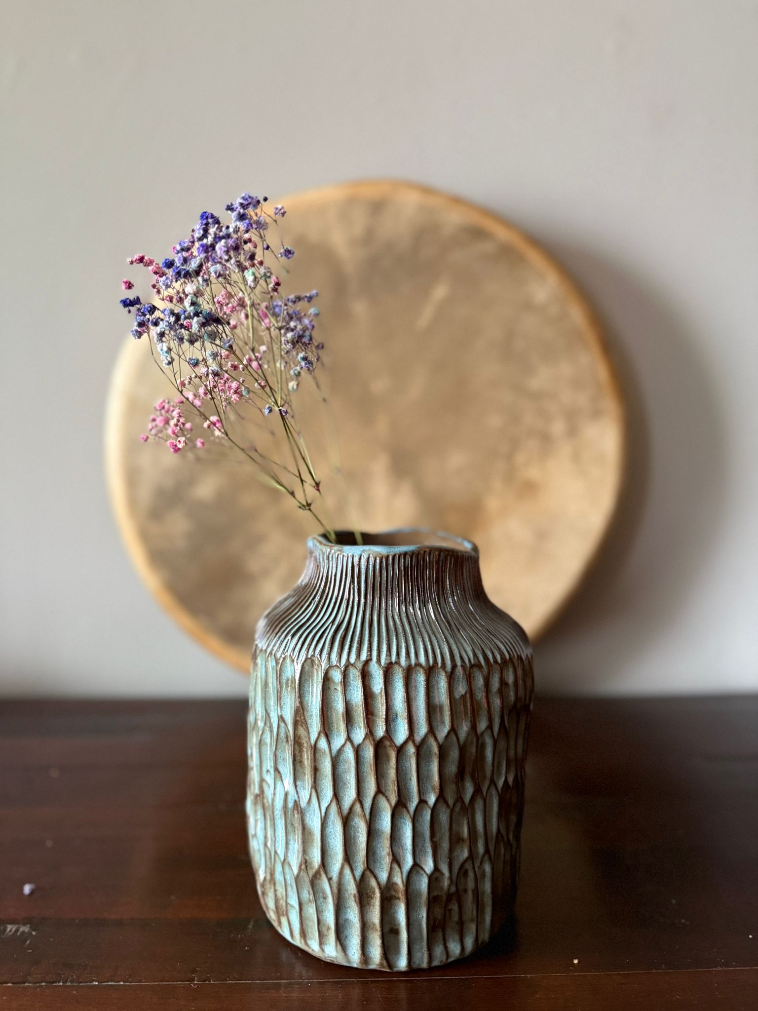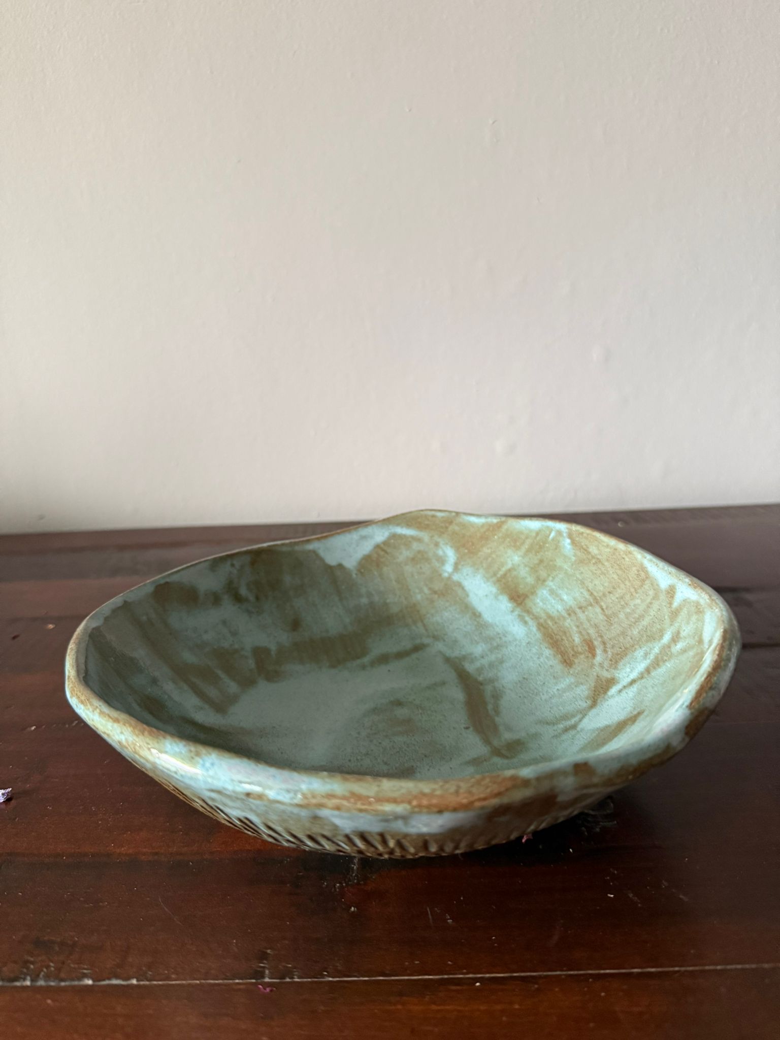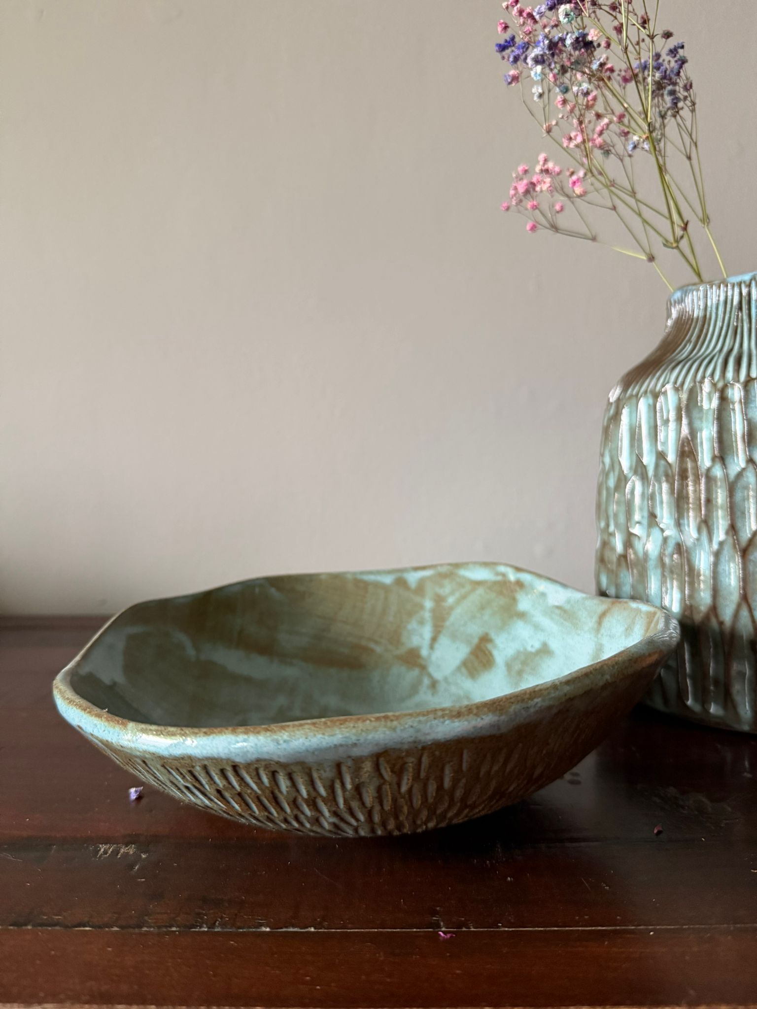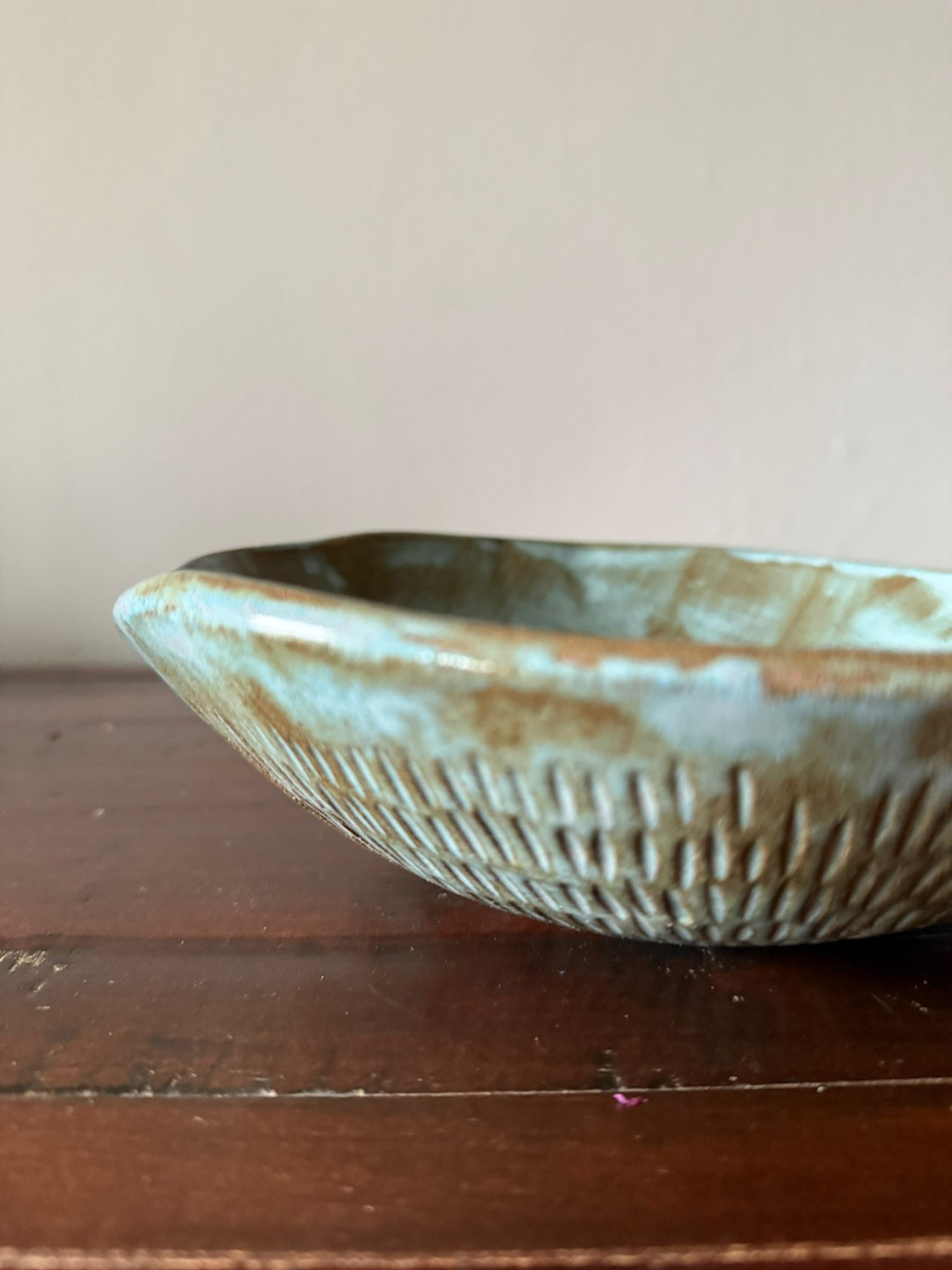 Ta ręcznie wykonana miska ceramiczna powstała z jasnej gliny i pokryta została błyszczącym szkliwem w odcieniach niebieskiego z delikatnymi brązowymi przebarwieniami. Subtelne rzeźbienia na zewnętrznej powierzchni nadają jej wyjątkowy charakter i artystyczny urok. Każda miska jest unikatem, dzięki czemu wnosi do wnętrza ciepło i autentyczność rękodzieła.