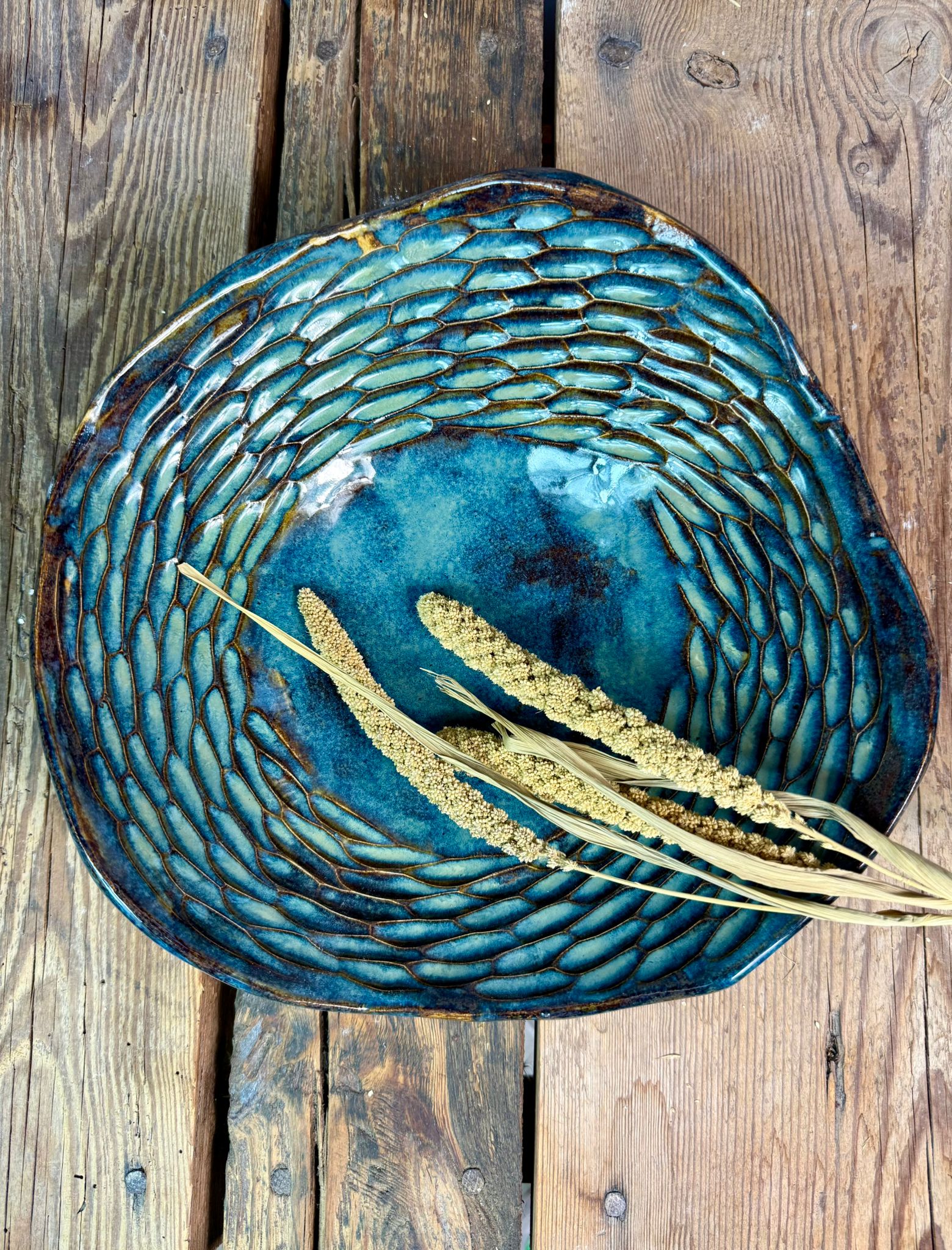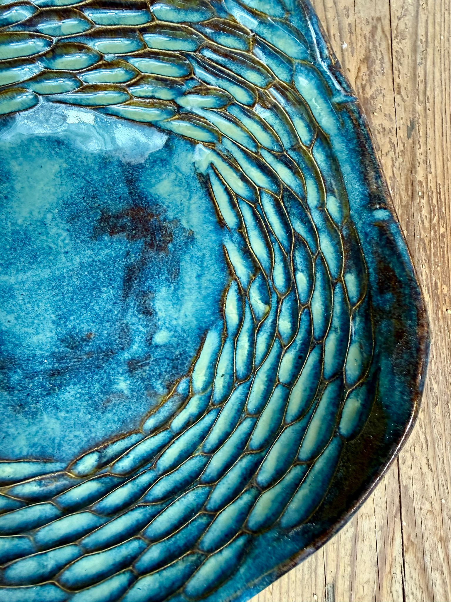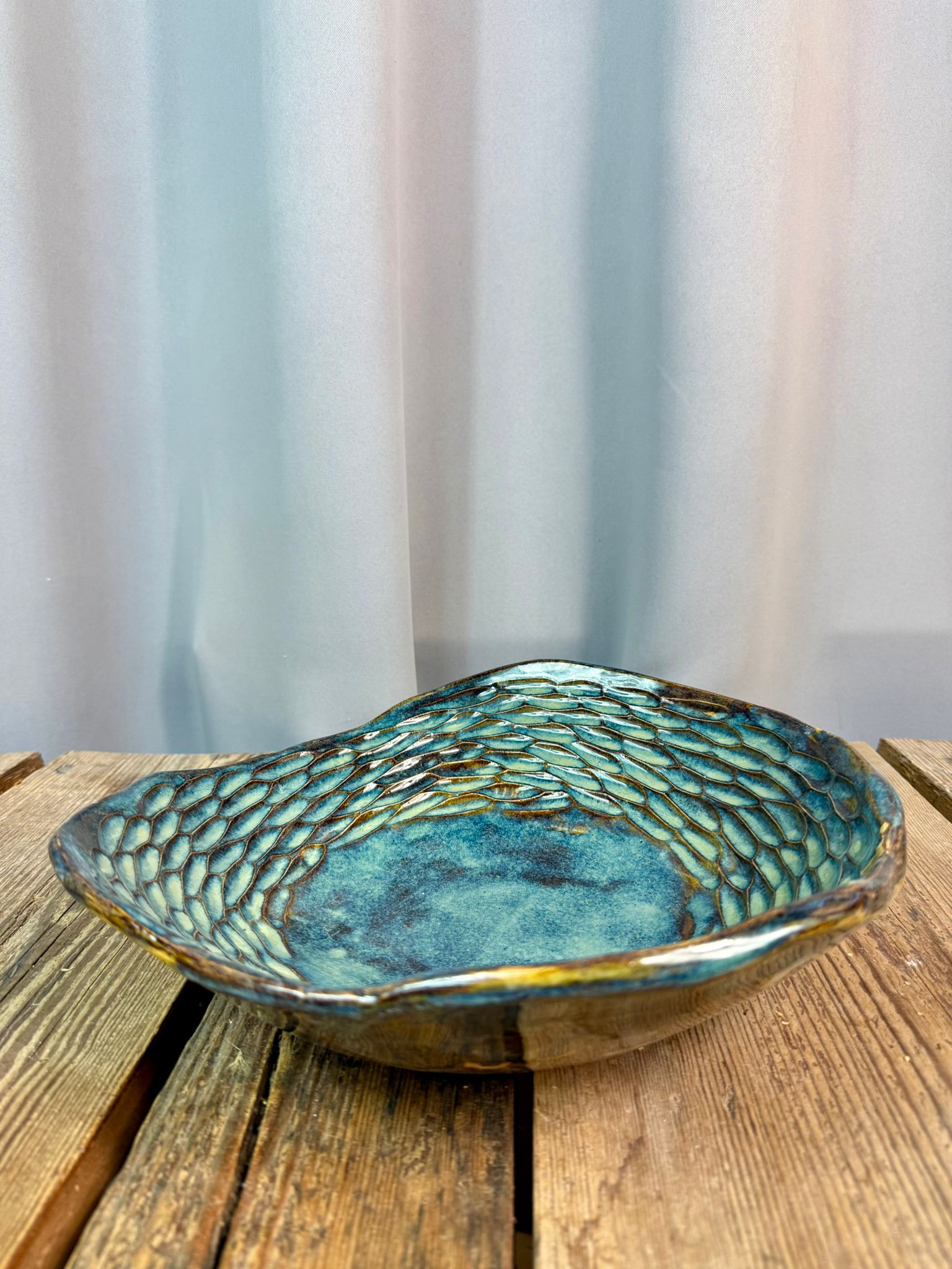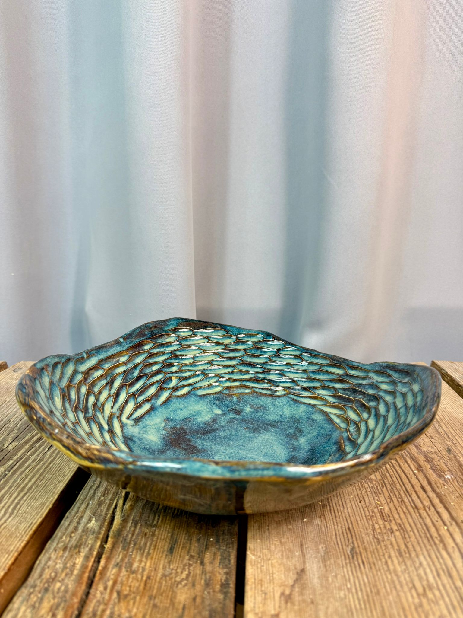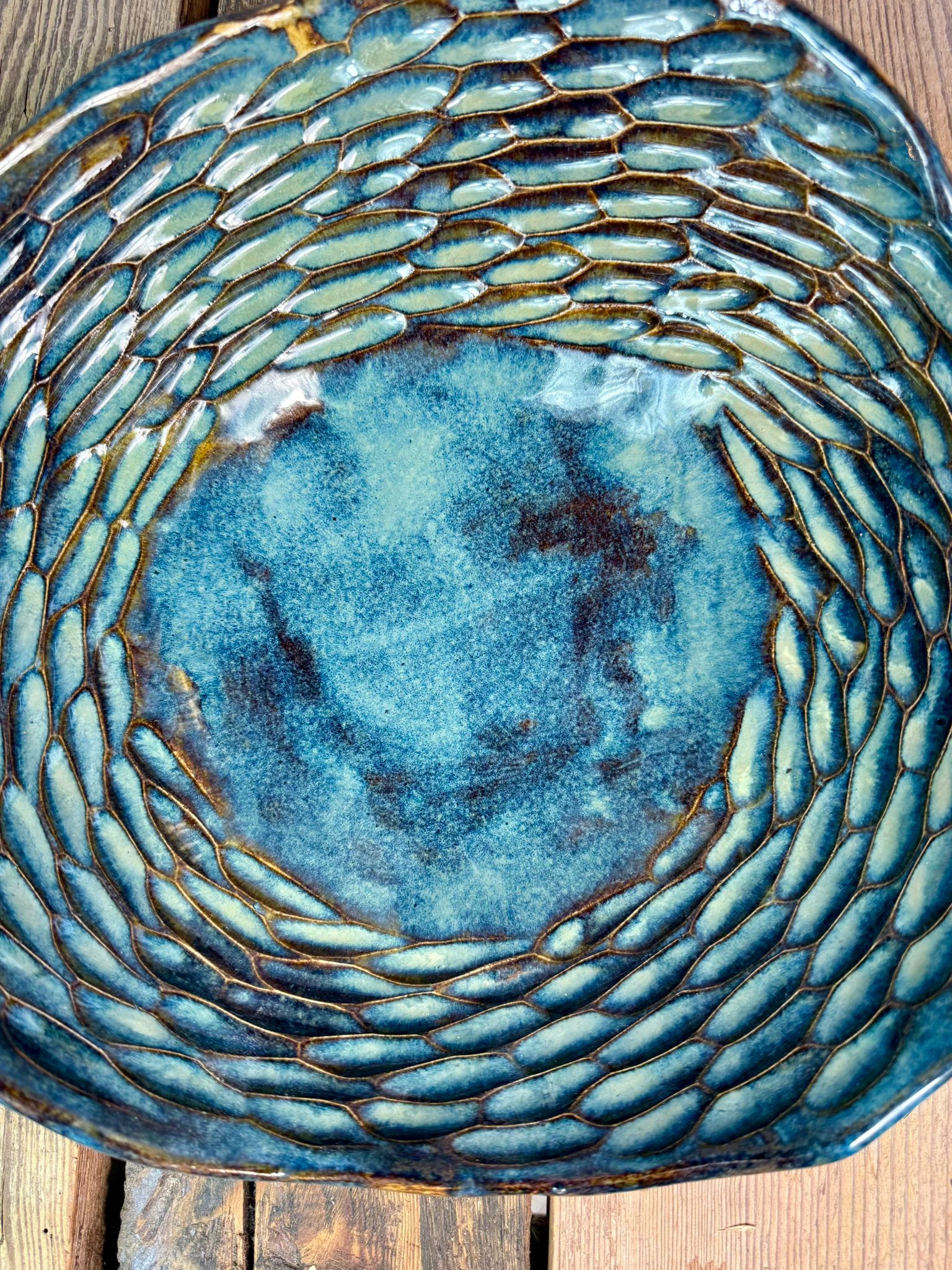 Cała misa została pokryta błyszczącym szkliwem dopuszczonym do kontaktu z żywnością, dzięki czemu może być bezpiecznie używana na co dzień. Szkliwo w odcieniach zieleni, brązu i niebieskiego tworzy efektowne, organiczne przejścia kolorystyczne, które pięknie podkreślają rzeźbioną fakturę i reagują na światło. Można myć w zmywarce.