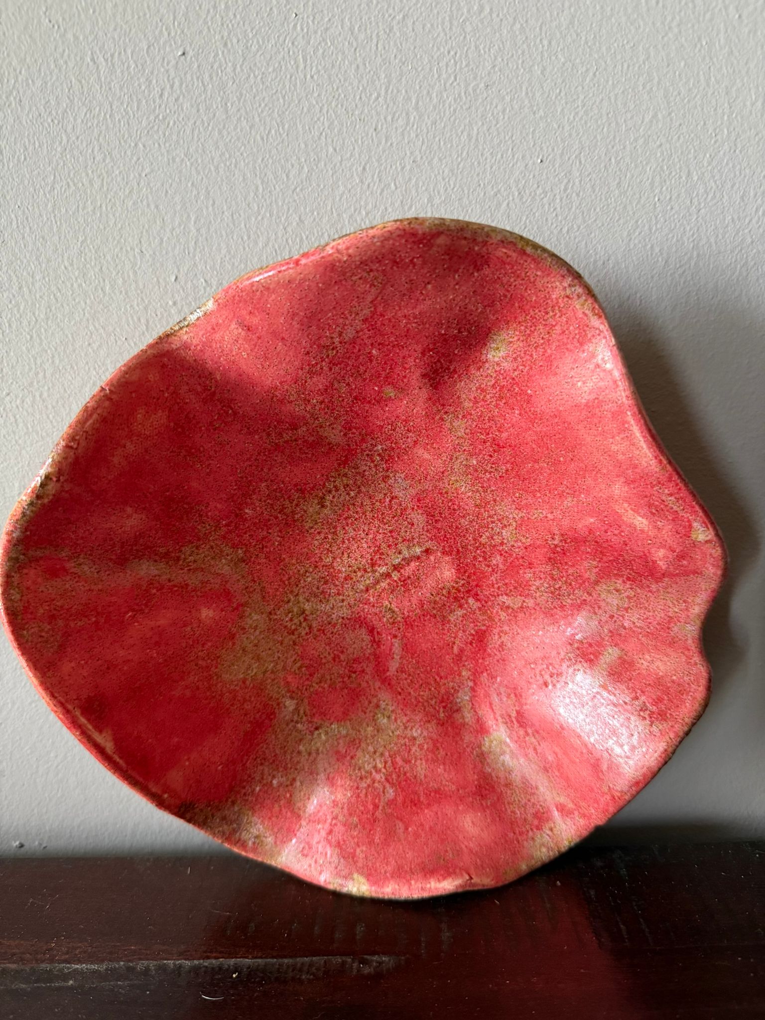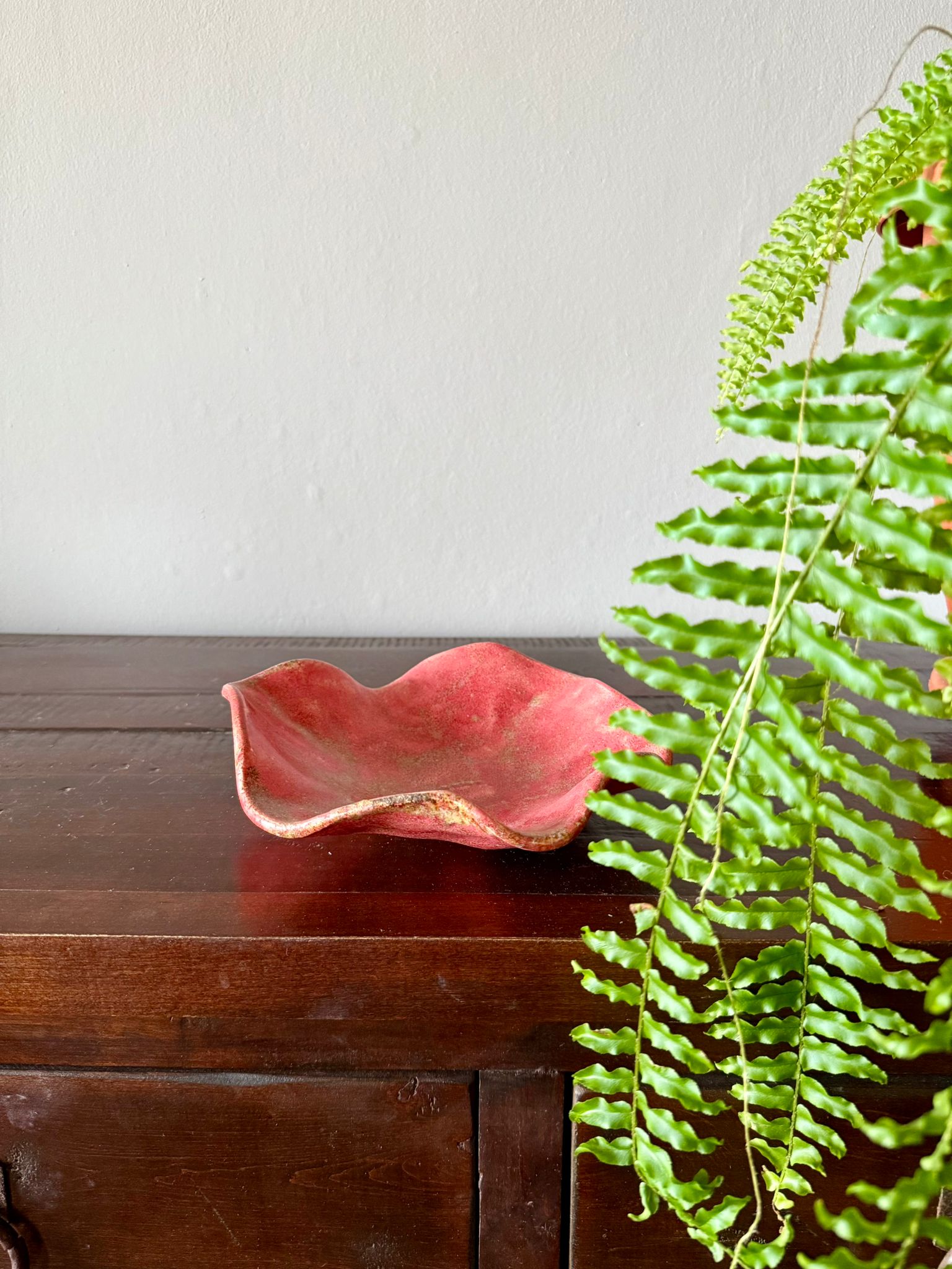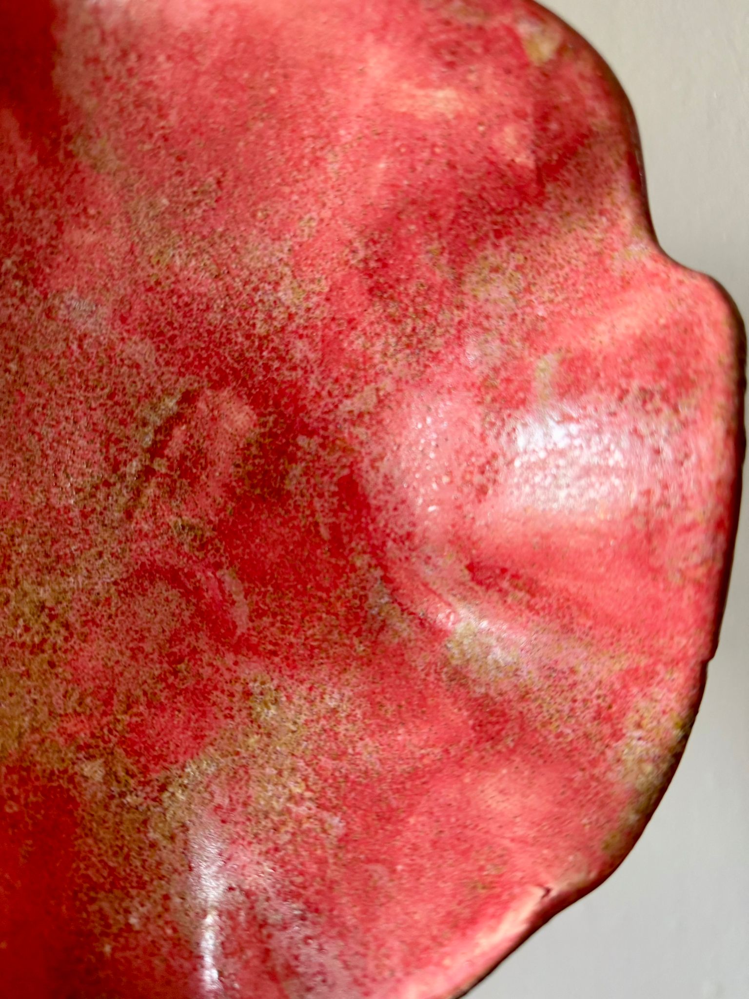 Ręcznie wykonana z gliny, posiada delikatnie pofalowany brzeg, który nadaje jej lekkości i subtelnego, rzeźbiarskiego charakteru. Pokryta została satynowym szkliwem w kolorze głębokiej czerwieni z beżowymi przebarwieniami, również od spodu – dzięki czemu prezentuje się pięknie z każdej strony.