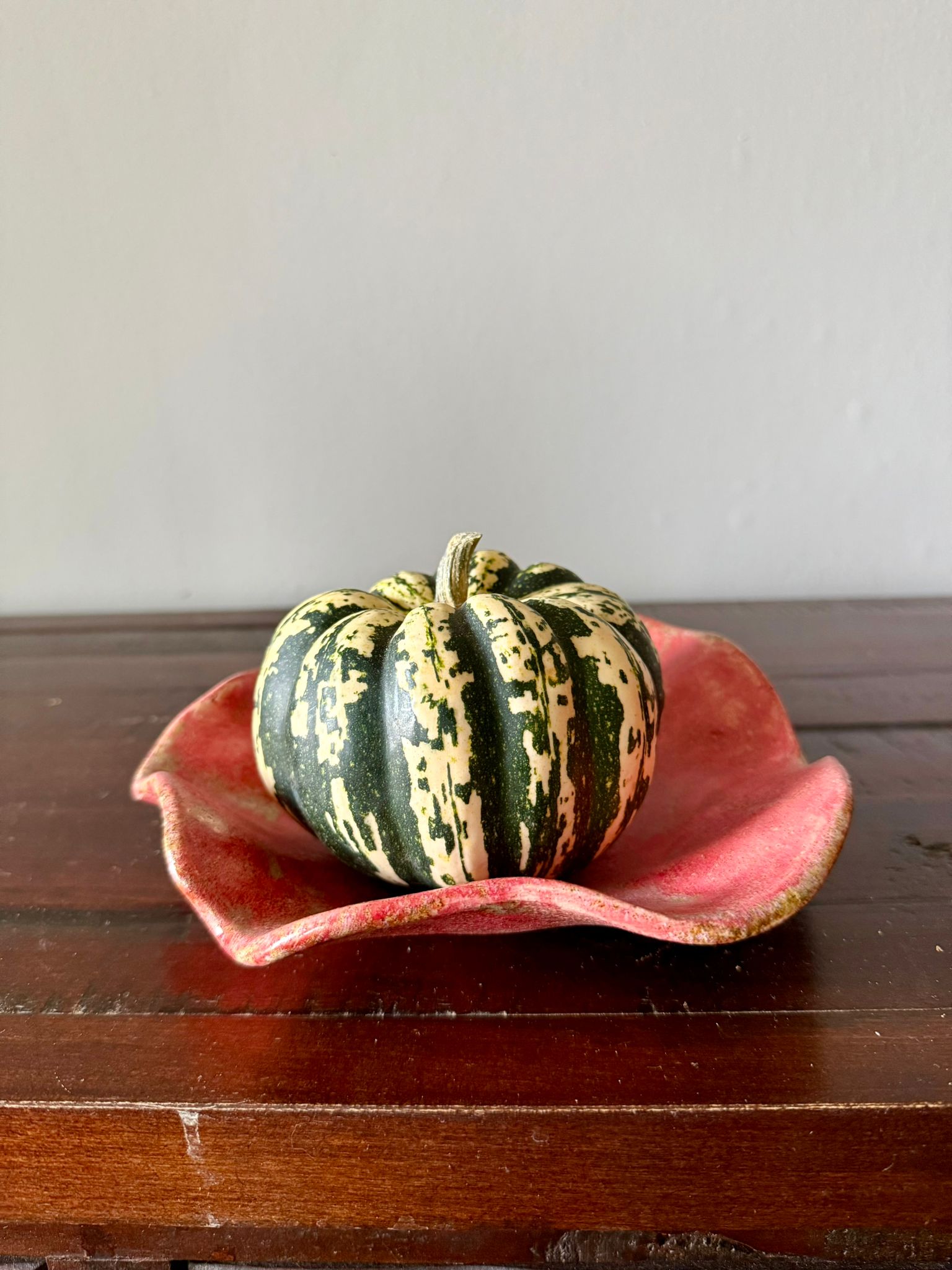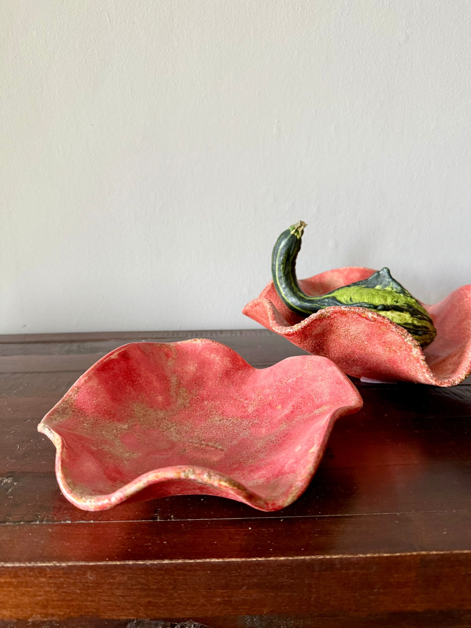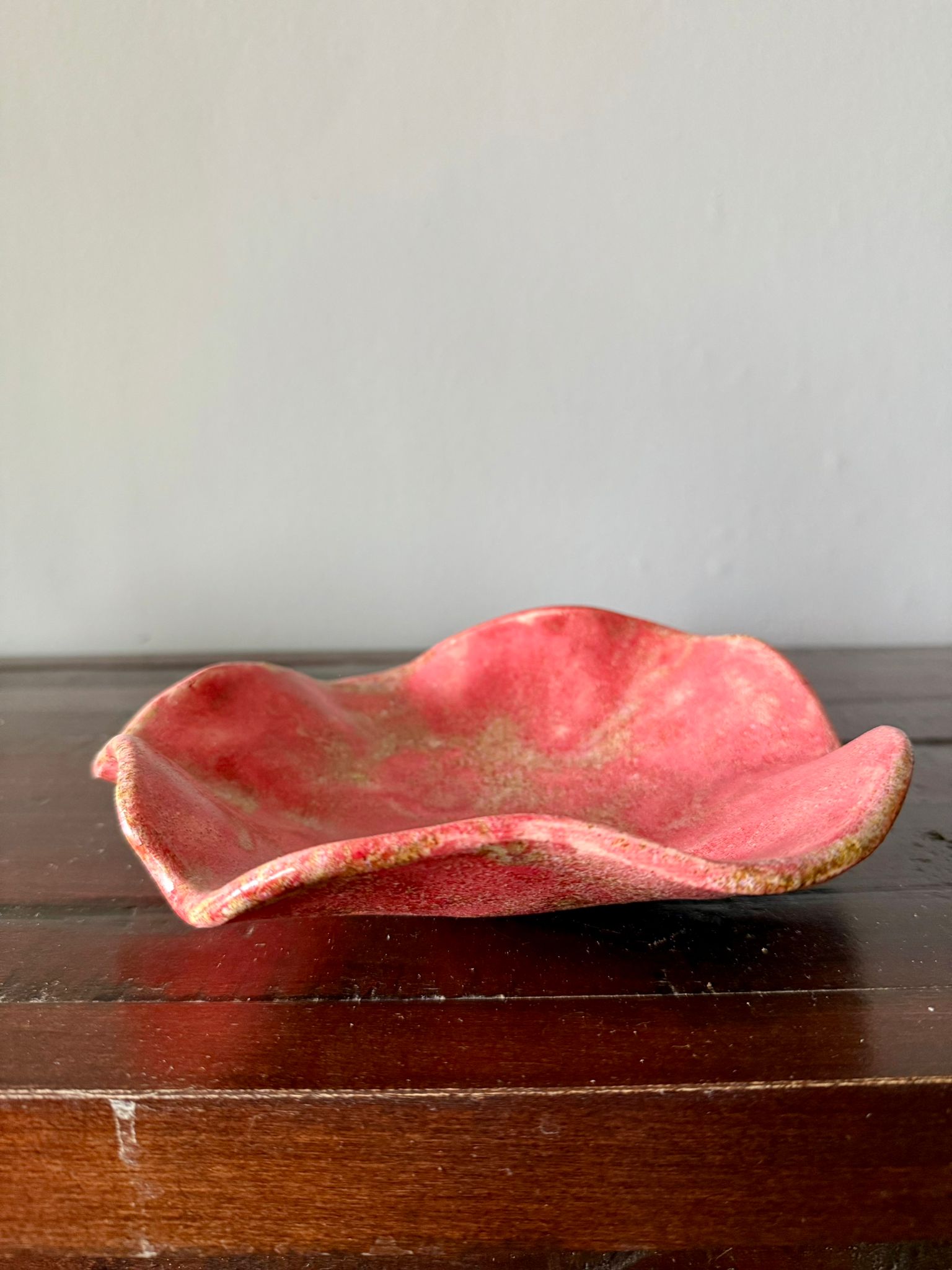 Ręcznie wykonana z gliny, posiada delikatnie pofalowany brzeg, który nadaje jej lekkości i subtelnego, rzeźbiarskiego charakteru. Pokryta została satynowym szkliwem w kolorze głębokiej czerwieni z beżowymi przebarwieniami, również od spodu – dzięki czemu prezentuje się pięknie z każdej strony.