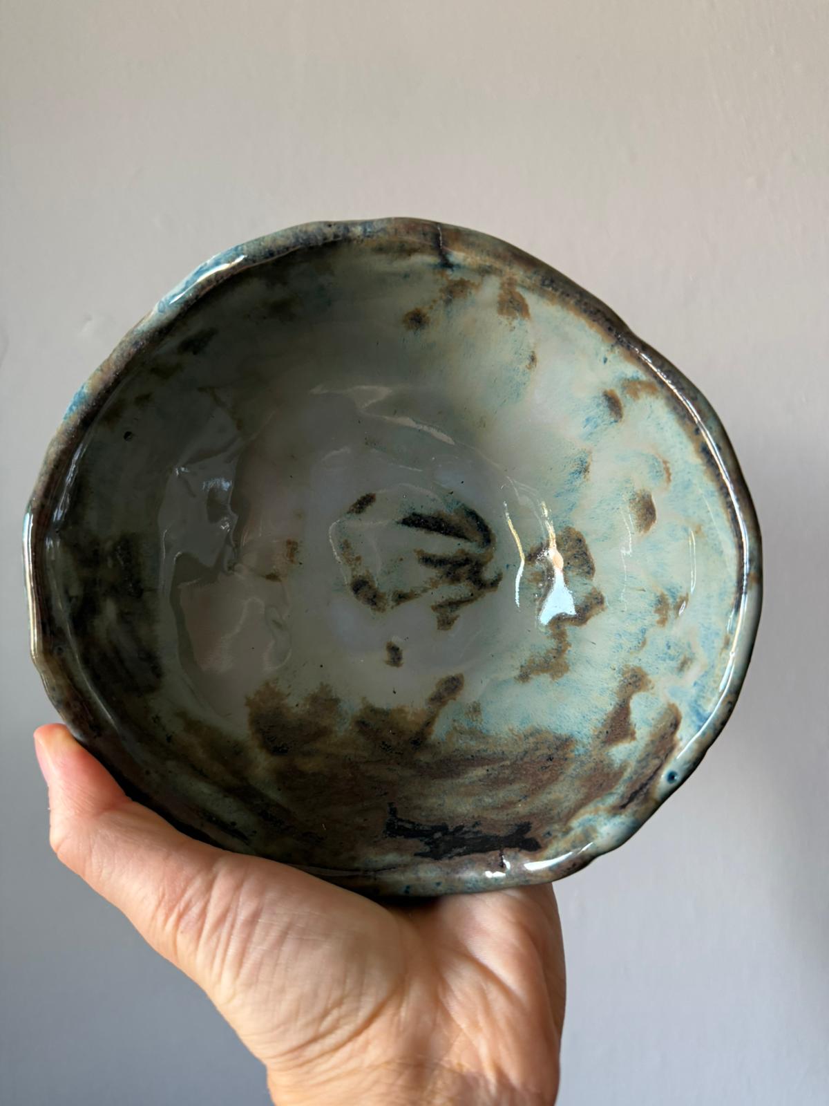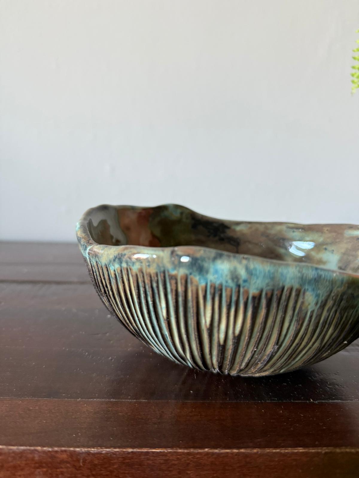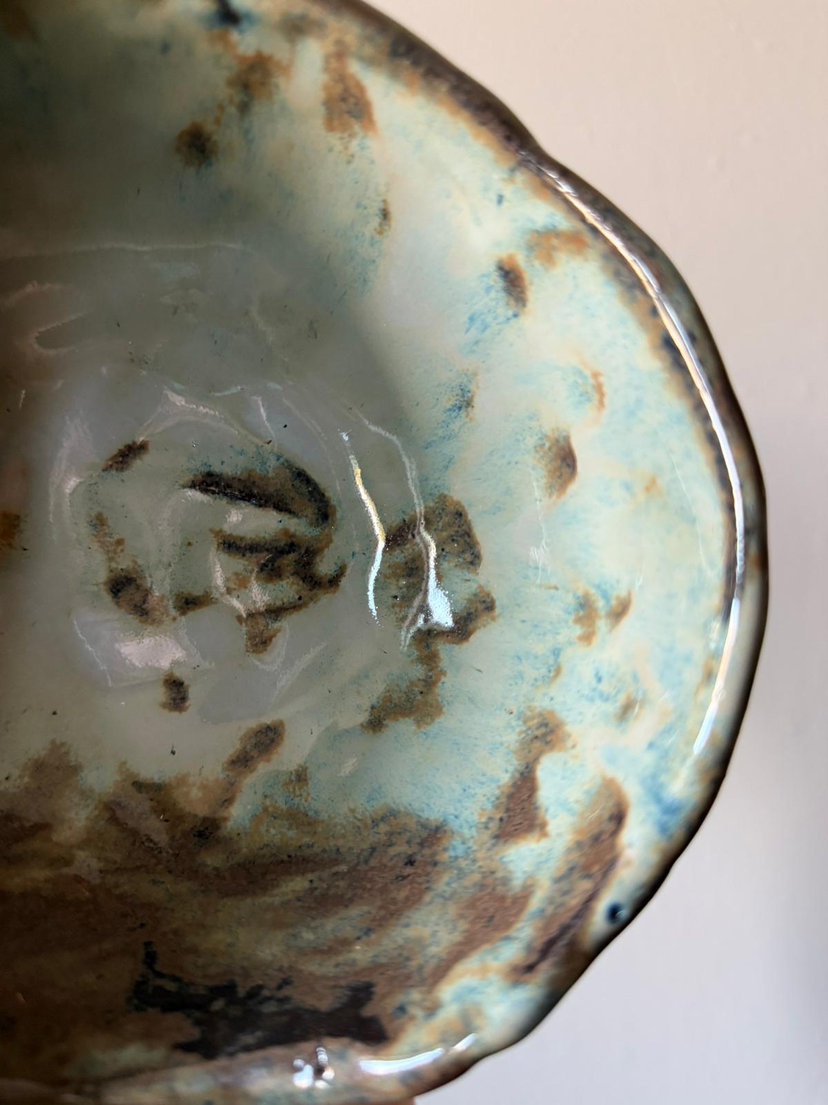 Ta ręcznie wykonana misa ceramiczna z kolekcji Deep Line to połączenie naturalnej formy i wyjątkowego szkliwa. Powstała z gliny, a jej powierzchnia została pokryta błyszczącym szkliwem w odcieniach zieleni i niebieskiego z brązowymi przebarwieniami, tworząc efekt głębi i ruchu. Użyte szkliwo jest dopuszczone do kontaktu z żywnością, dzięki czemu misa może pełnić zarówno funkcję dekoracyjną, jak i użytkową.