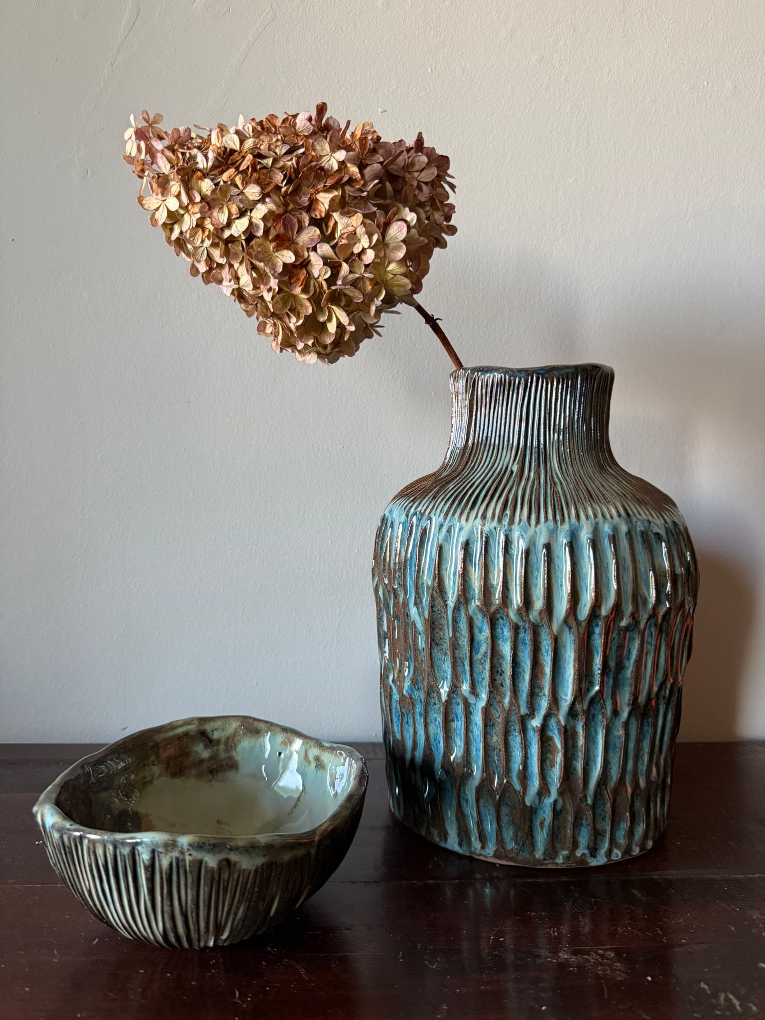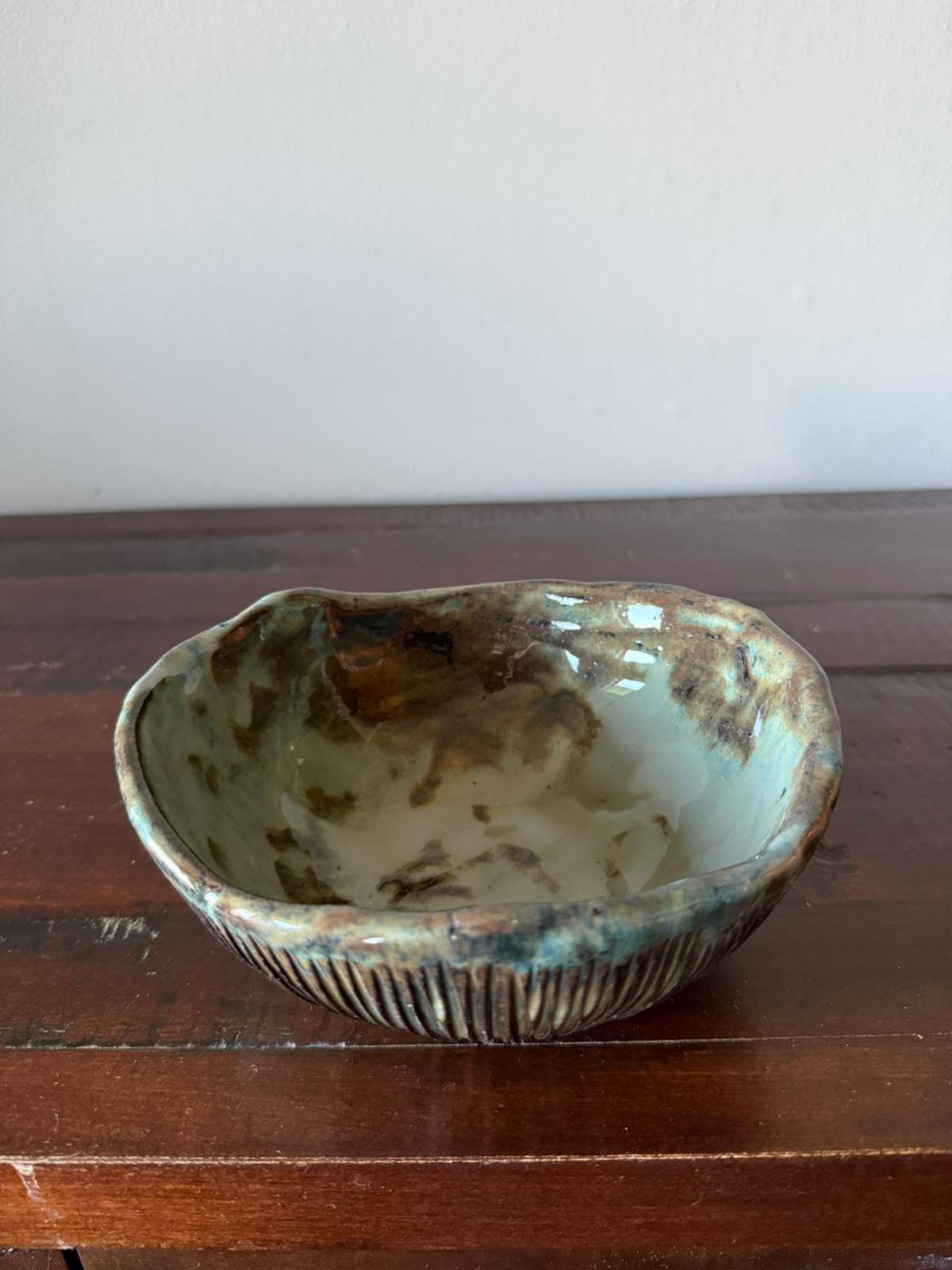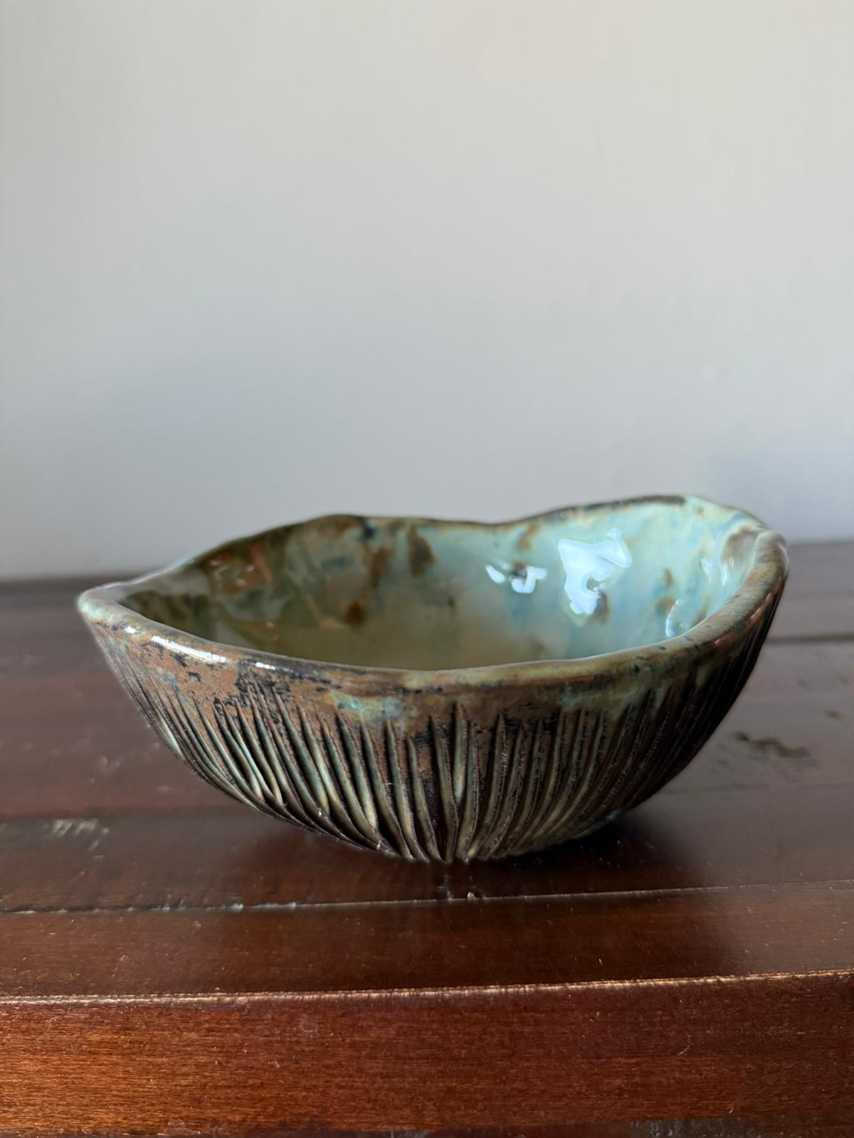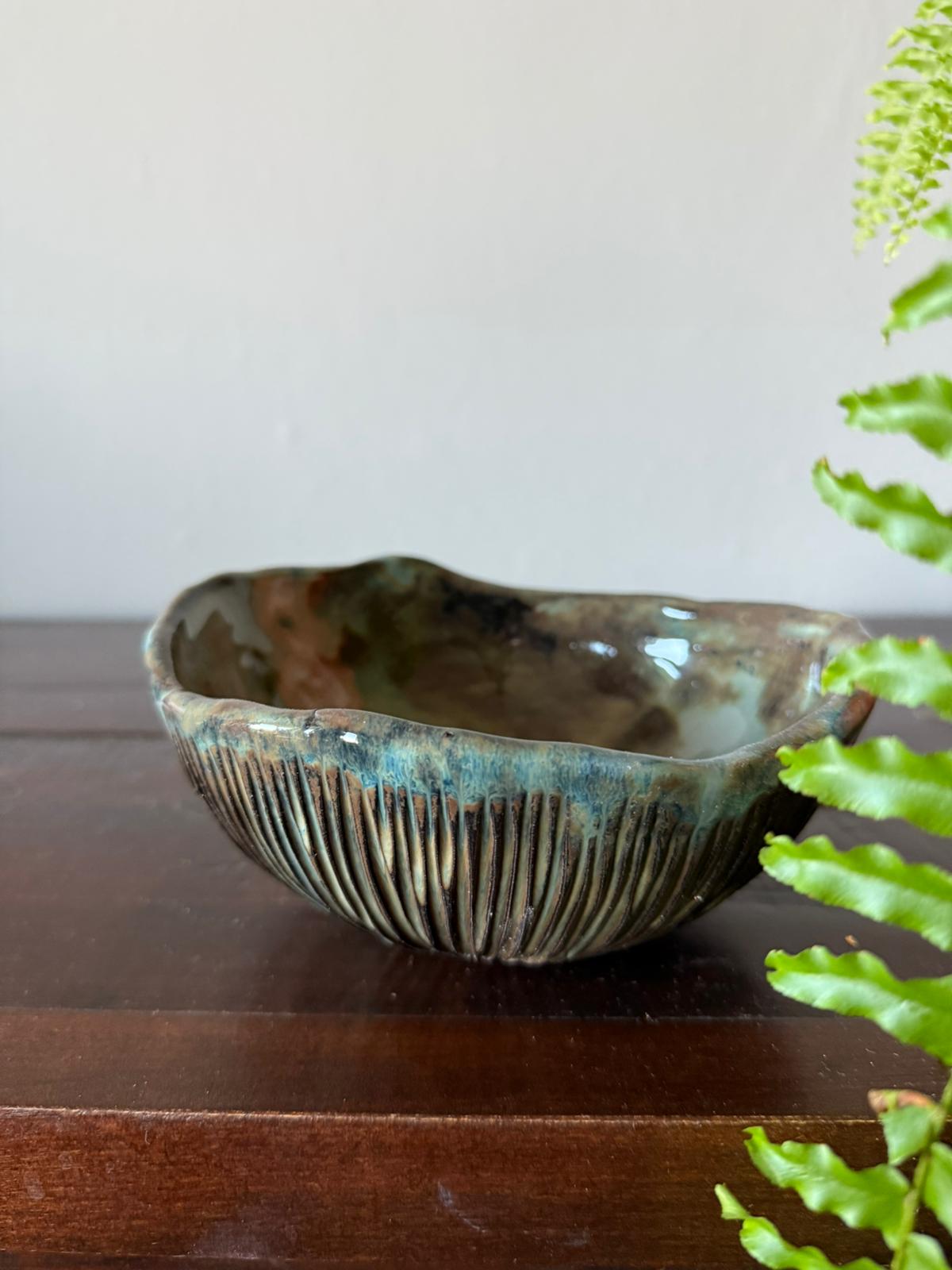 Ta ręcznie wykonana misa ceramiczna z kolekcji Deep Line to połączenie naturalnej formy i wyjątkowego szkliwa. Powstała z gliny, a jej powierzchnia została pokryta błyszczącym szkliwem w odcieniach zieleni i niebieskiego z brązowymi przebarwieniami, tworząc efekt głębi i ruchu. Użyte szkliwo jest dopuszczone do kontaktu z żywnością, dzięki czemu misa może pełnić zarówno funkcję dekoracyjną, jak i użytkową.