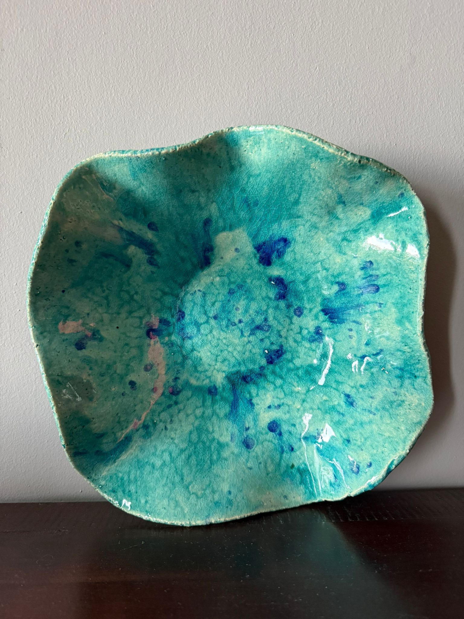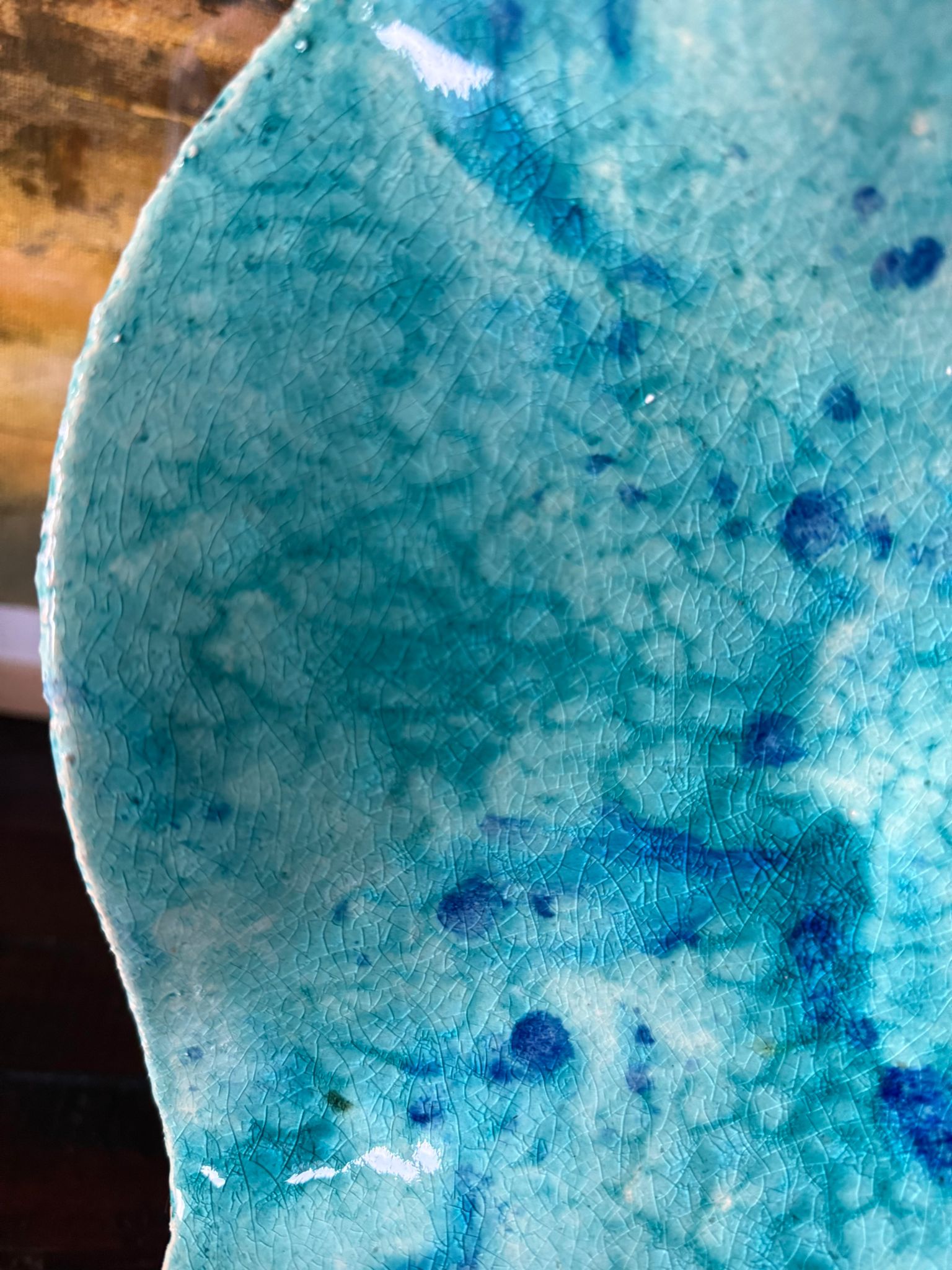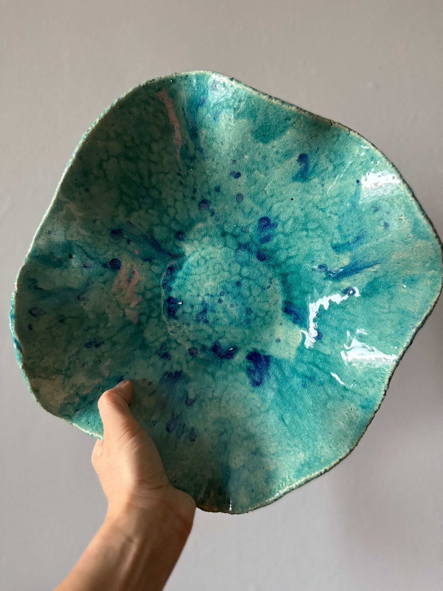 Ręcznie wykonana misa z kolekcji „Galaktyczne Turquoise” to wyjątkowy element dekoracyjny, który łączy funkcjonalność z artystycznym wyrazem. Wykonana z jasnej gliny, pokryta turkusowym szkliwem z efektem Craquele – delikatnymi spękaniami, które nadają jej niepowtarzalny charakter. Granatowe plamki na szkliwie przywodzą na myśl galaktyczne niebo, a nieregularny, falujący kształt misy podkreśla jej rzeźbiarską formę.