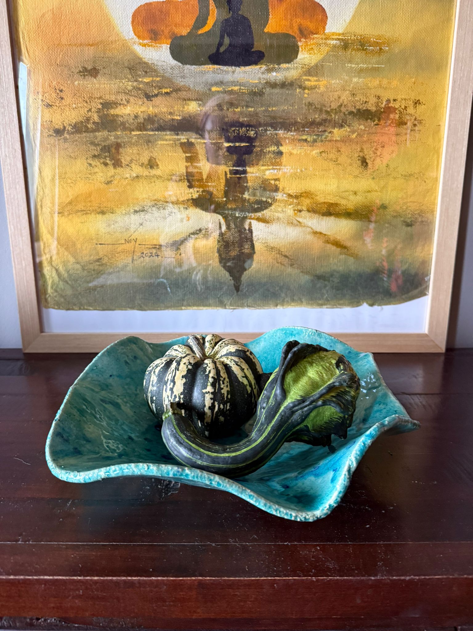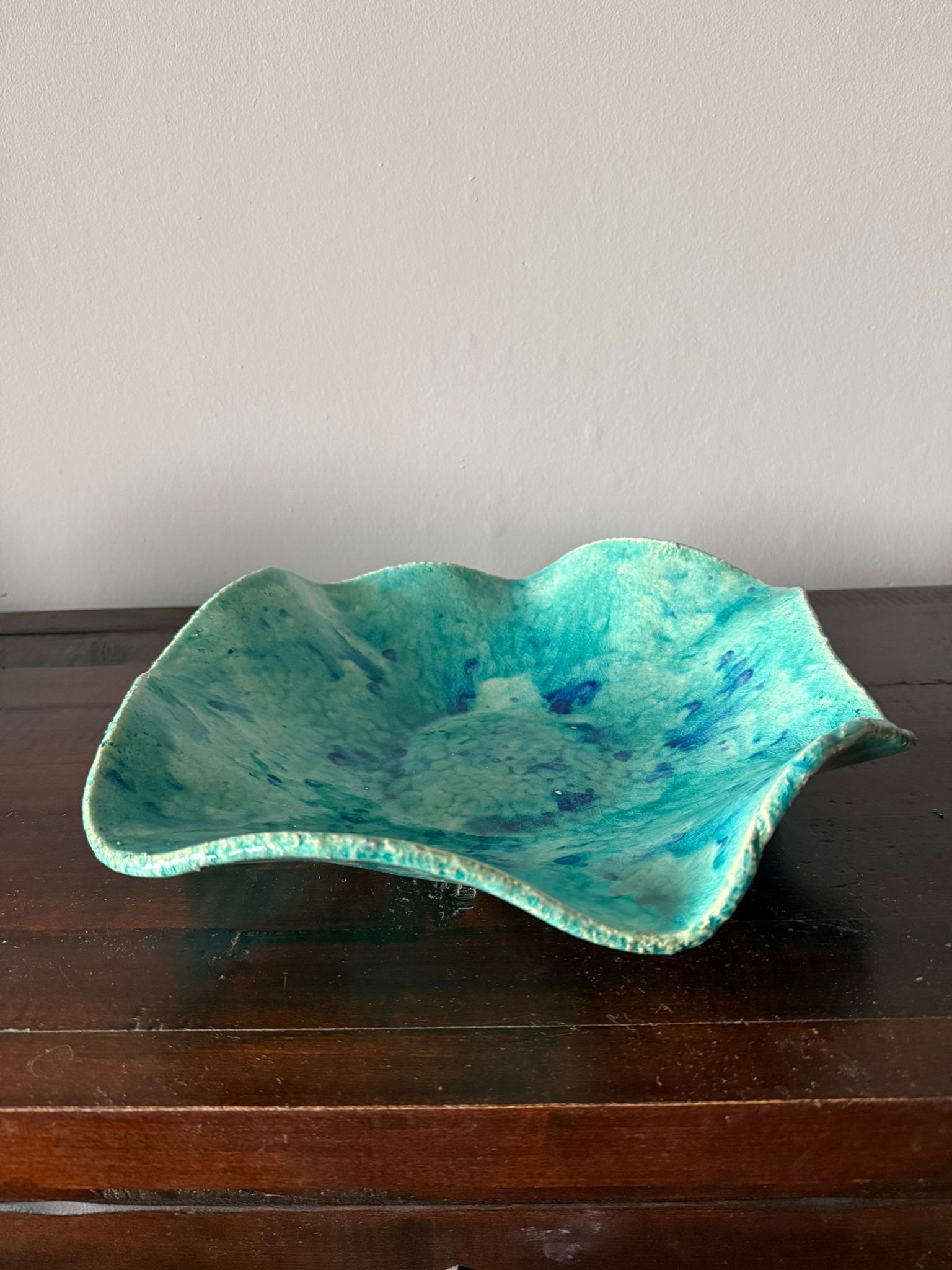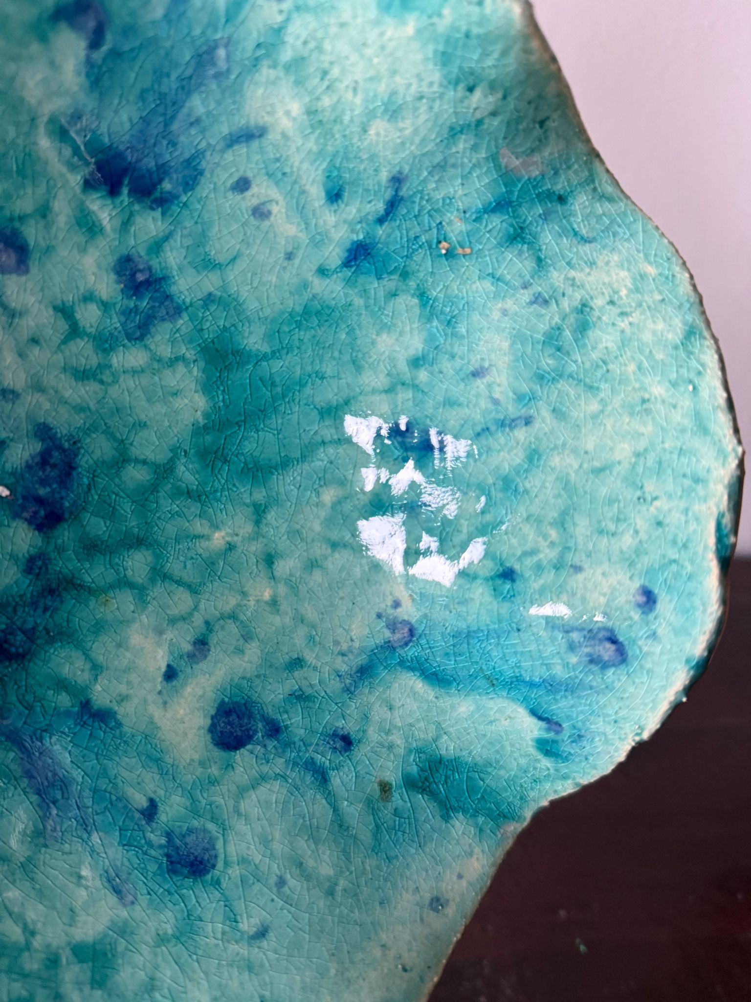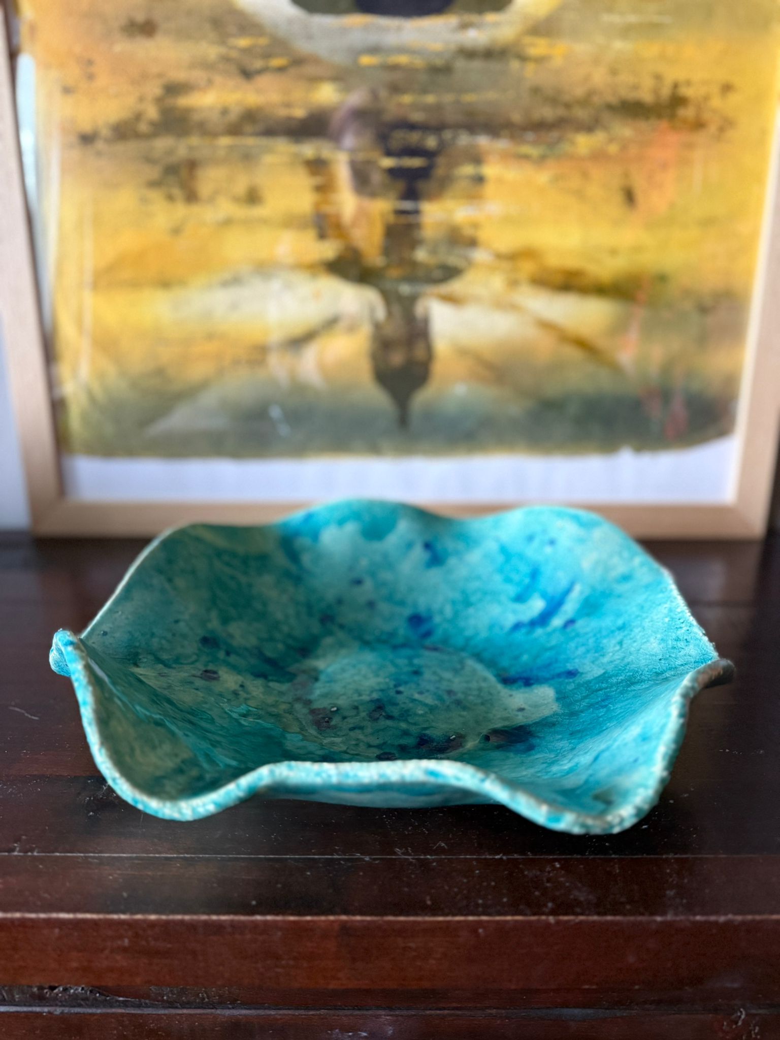 Ręcznie wykonana misa z kolekcji „Galaktyczne Turquoise” to wyjątkowy element dekoracyjny, który łączy funkcjonalność z artystycznym wyrazem. Wykonana z jasnej gliny, pokryta turkusowym szkliwem z efektem Craquele – delikatnymi spękaniami, które nadają jej niepowtarzalny charakter. Granatowe plamki na szkliwie przywodzą na myśl galaktyczne niebo, a nieregularny, falujący kształt misy podkreśla jej rzeźbiarską formę.
