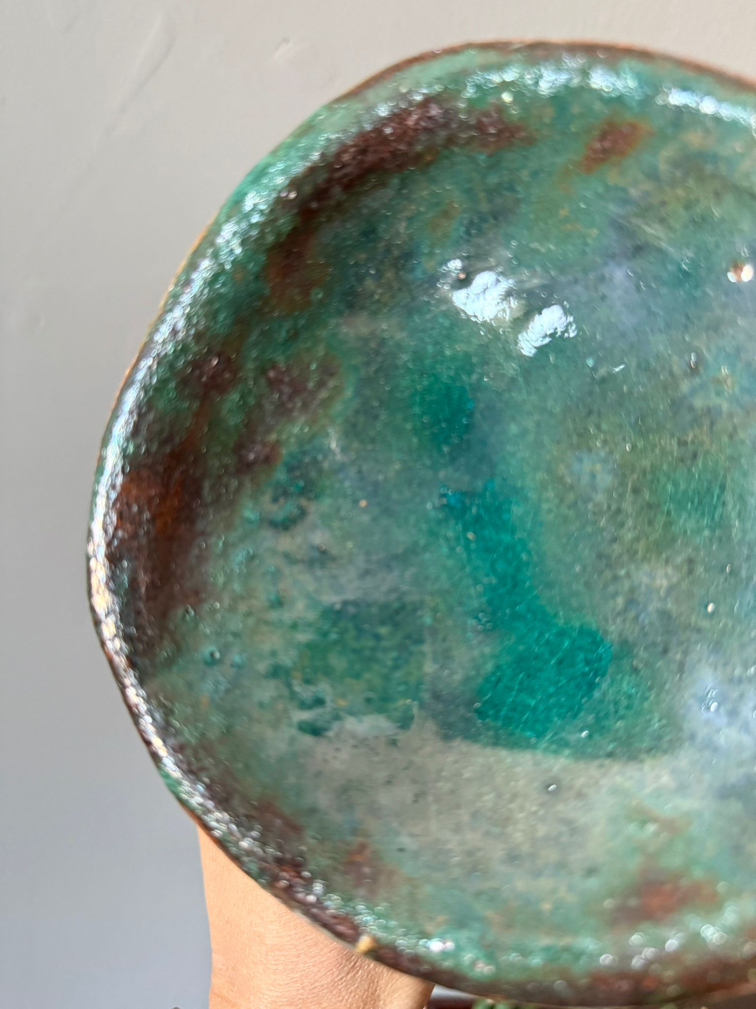 Jej zewnętrzna powierzchnia ma wyraźną strukturę gliny, delikatnie podkreśloną szkliwem w odcieniu starego złota i cienką, transparentną warstwą nadającą subtelny połysk. Wnętrze wypełnia błyszczące szkliwo w tonacjach zieleni i brązów, tworząc efekt przypominający grę światła w morskiej głębinie.