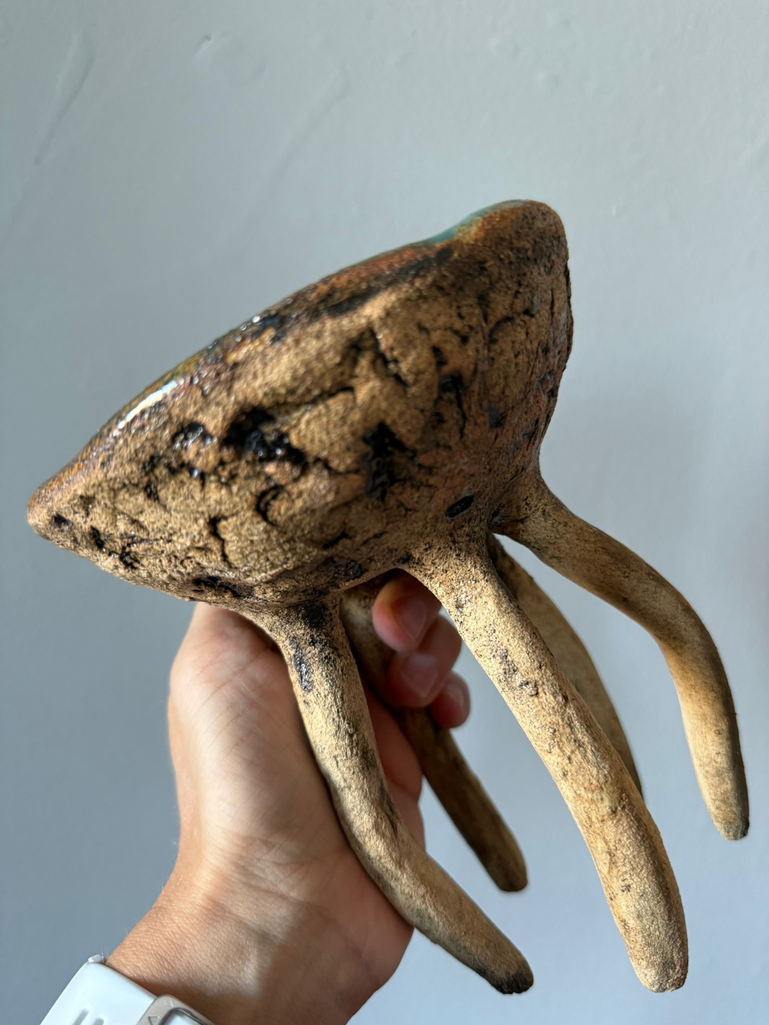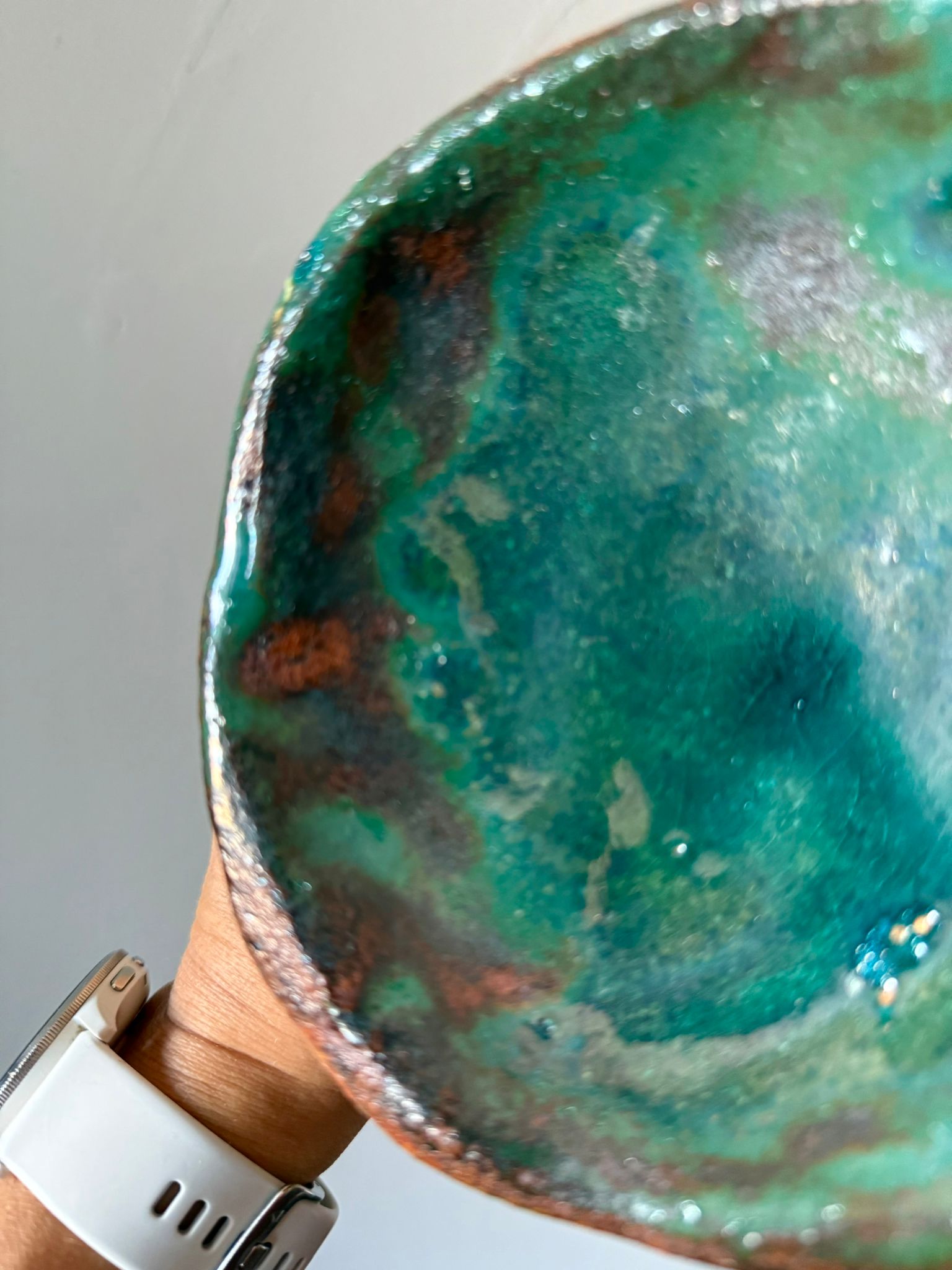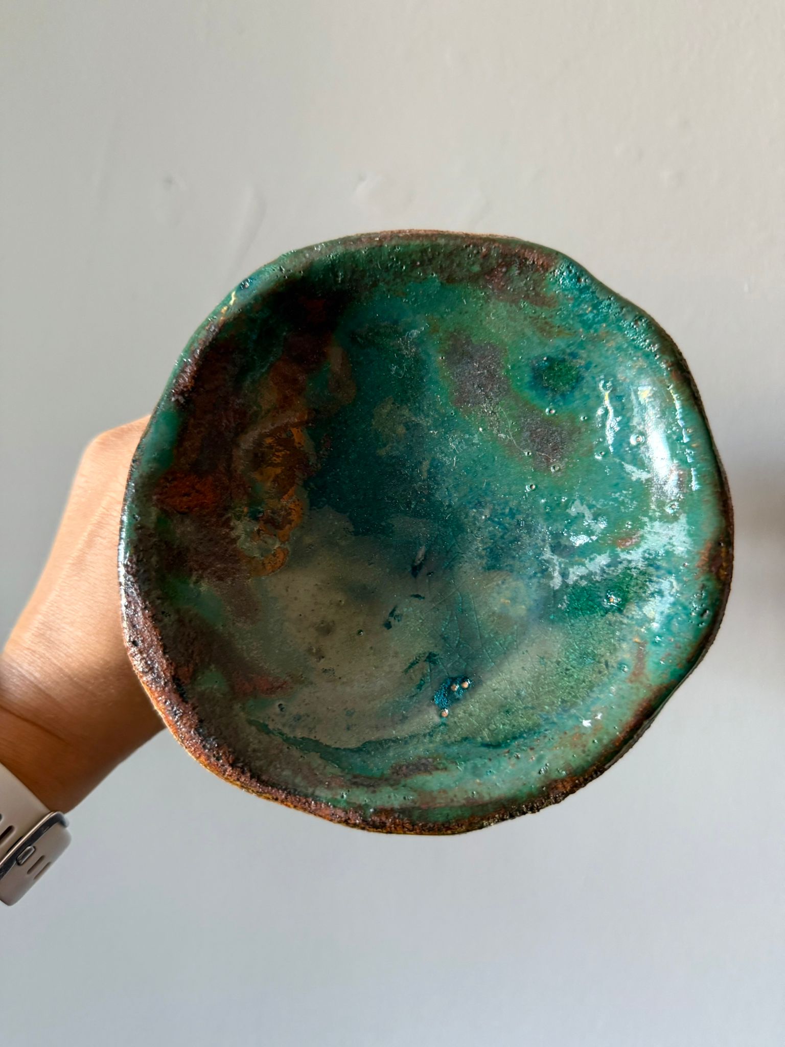 Jej zewnętrzna powierzchnia ma wyraźną strukturę gliny, delikatnie podkreśloną szkliwem w odcieniu starego złota i cienką, transparentną warstwą nadającą subtelny połysk. Wnętrze wypełnia błyszczące szkliwo w tonacjach zieleni i brązów, tworząc efekt przypominający grę światła w morskiej głębinie.