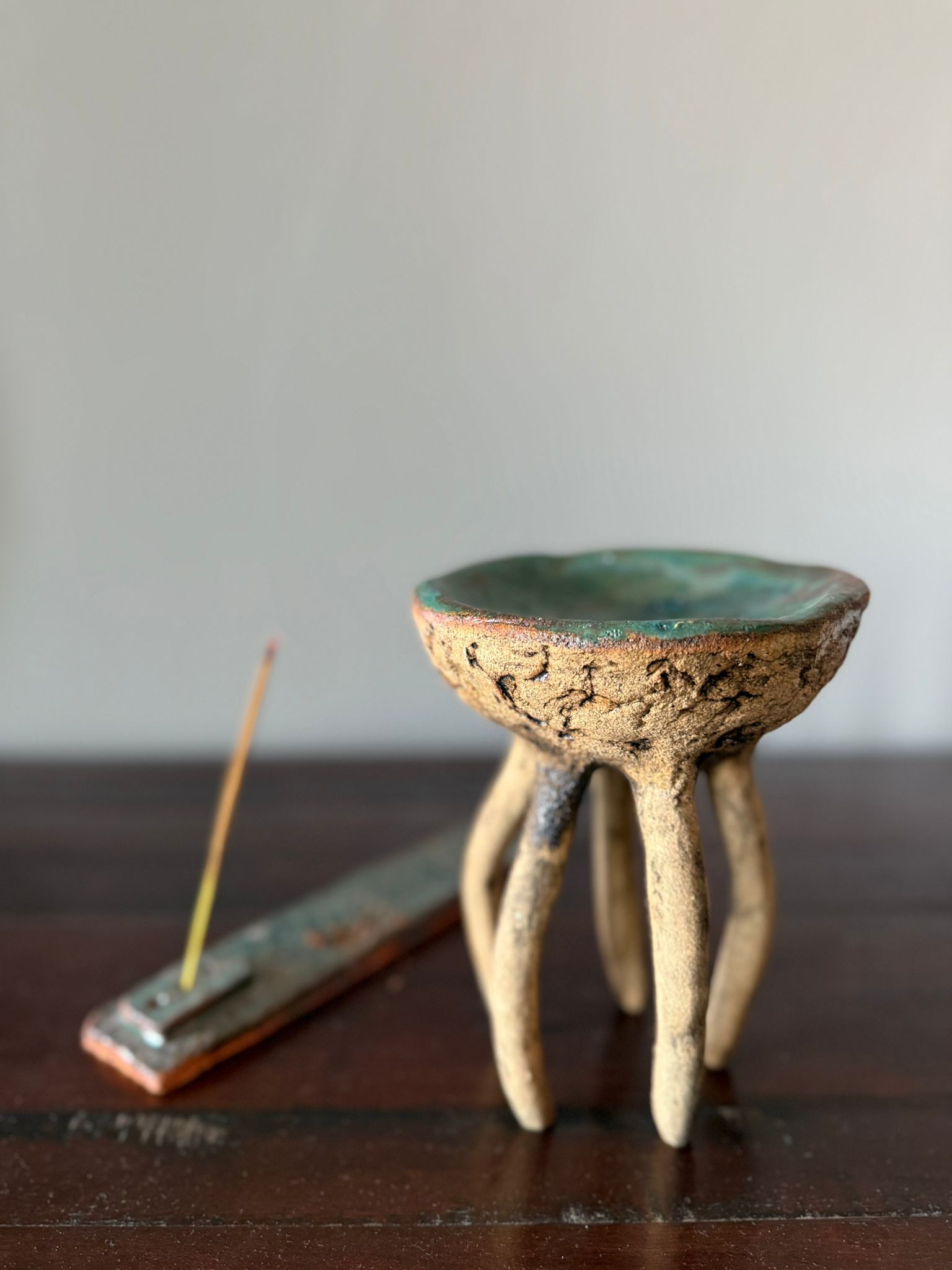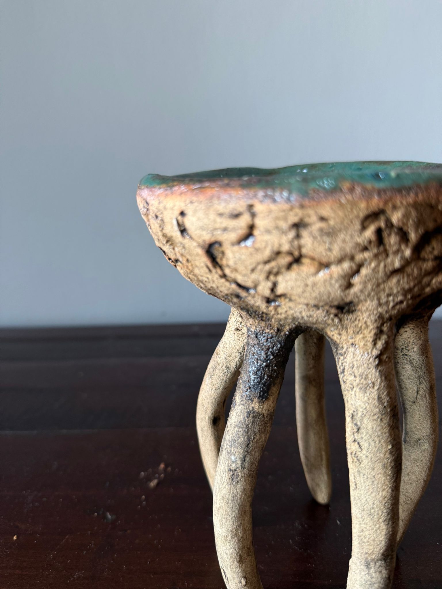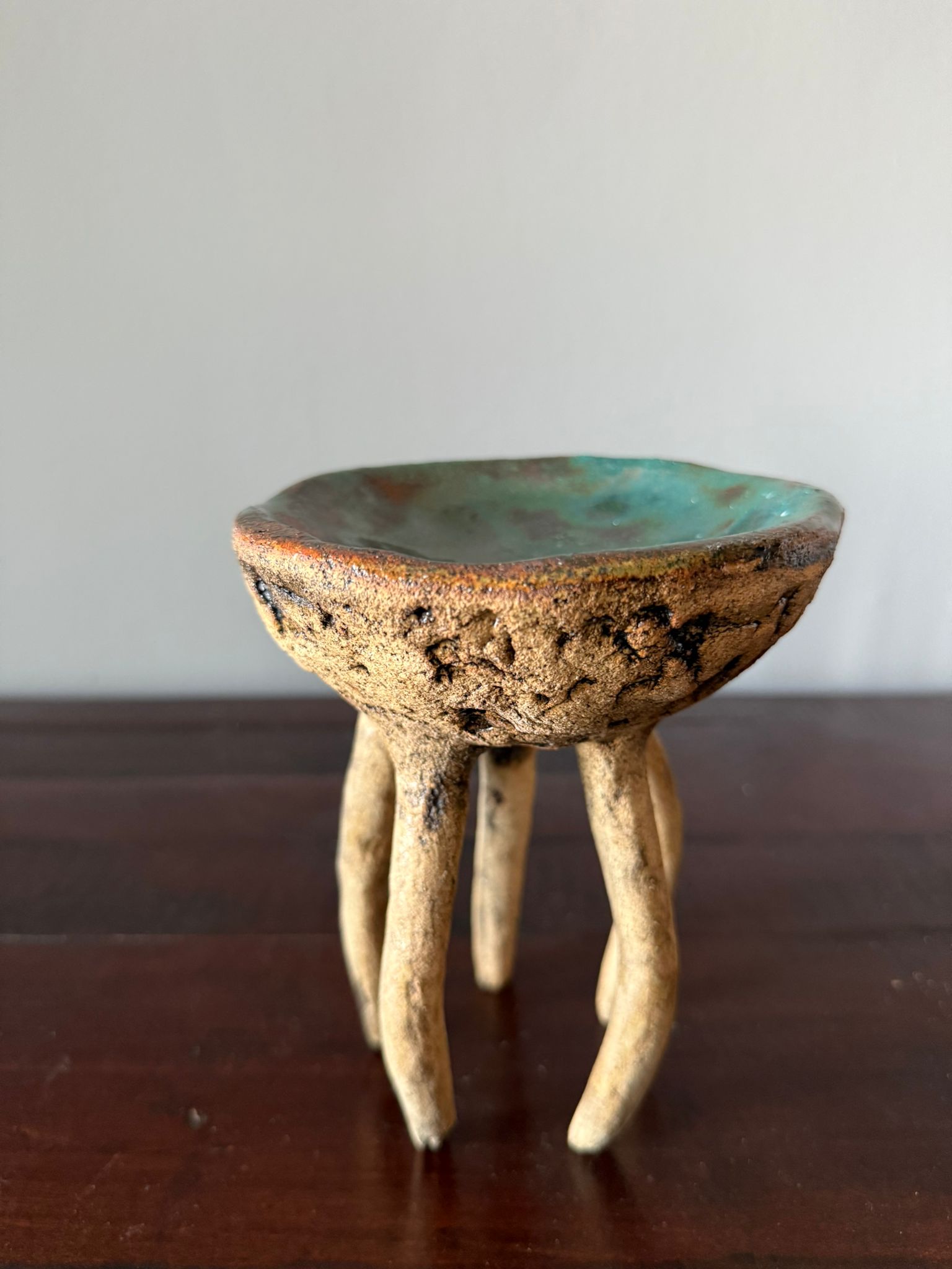 Jej zewnętrzna powierzchnia ma wyraźną strukturę gliny, delikatnie podkreśloną szkliwem w odcieniu starego złota i cienką, transparentną warstwą nadającą subtelny połysk. Wnętrze wypełnia błyszczące szkliwo w tonacjach zieleni i brązów, tworząc efekt przypominający grę światła w morskiej głębinie.