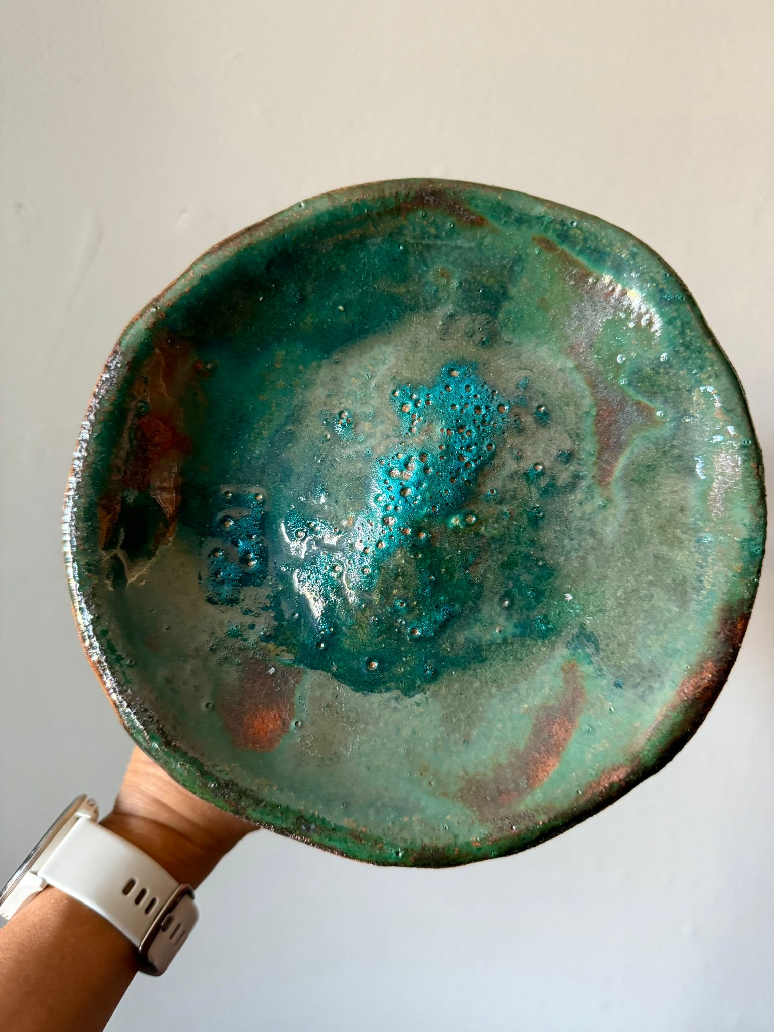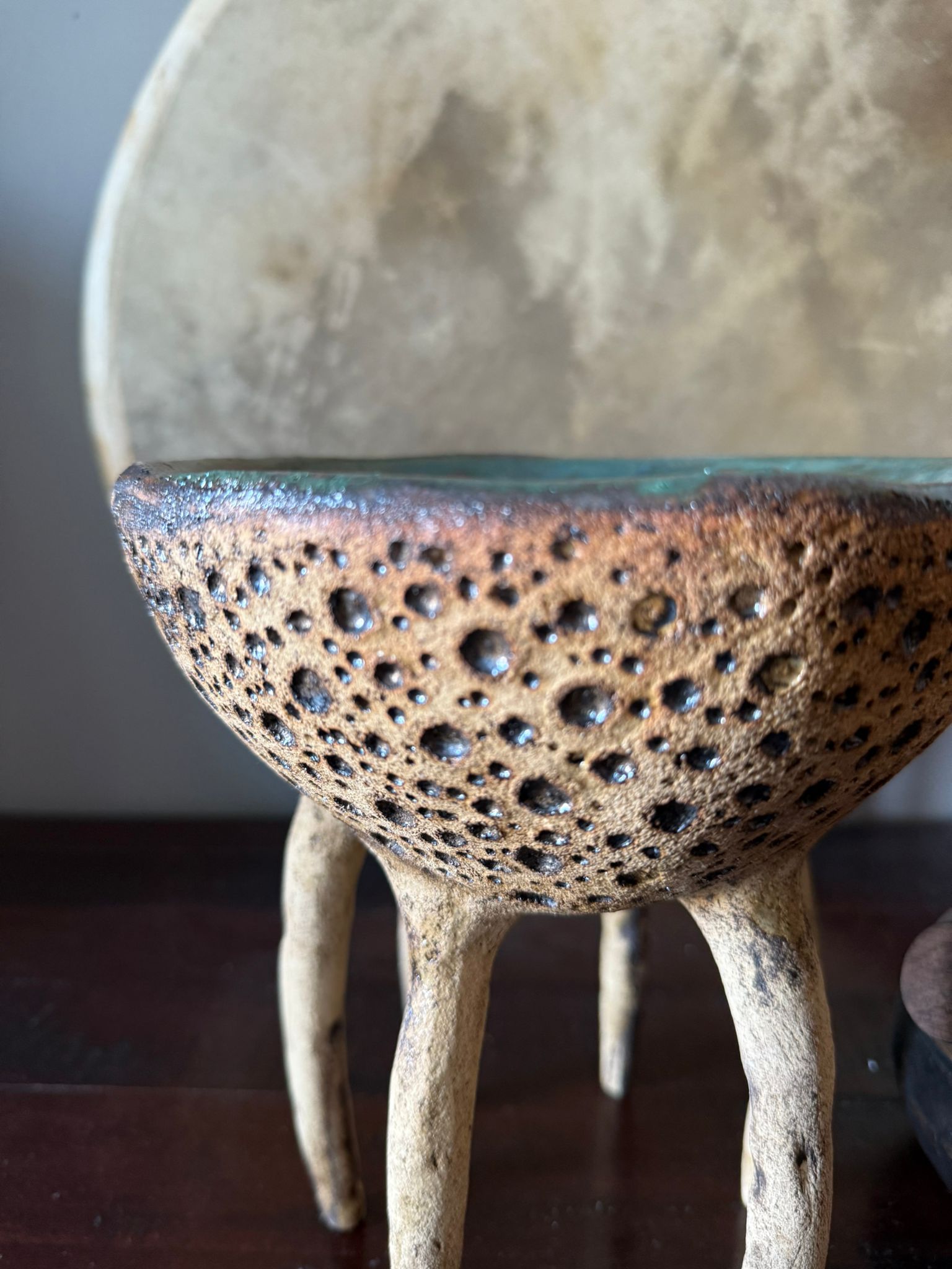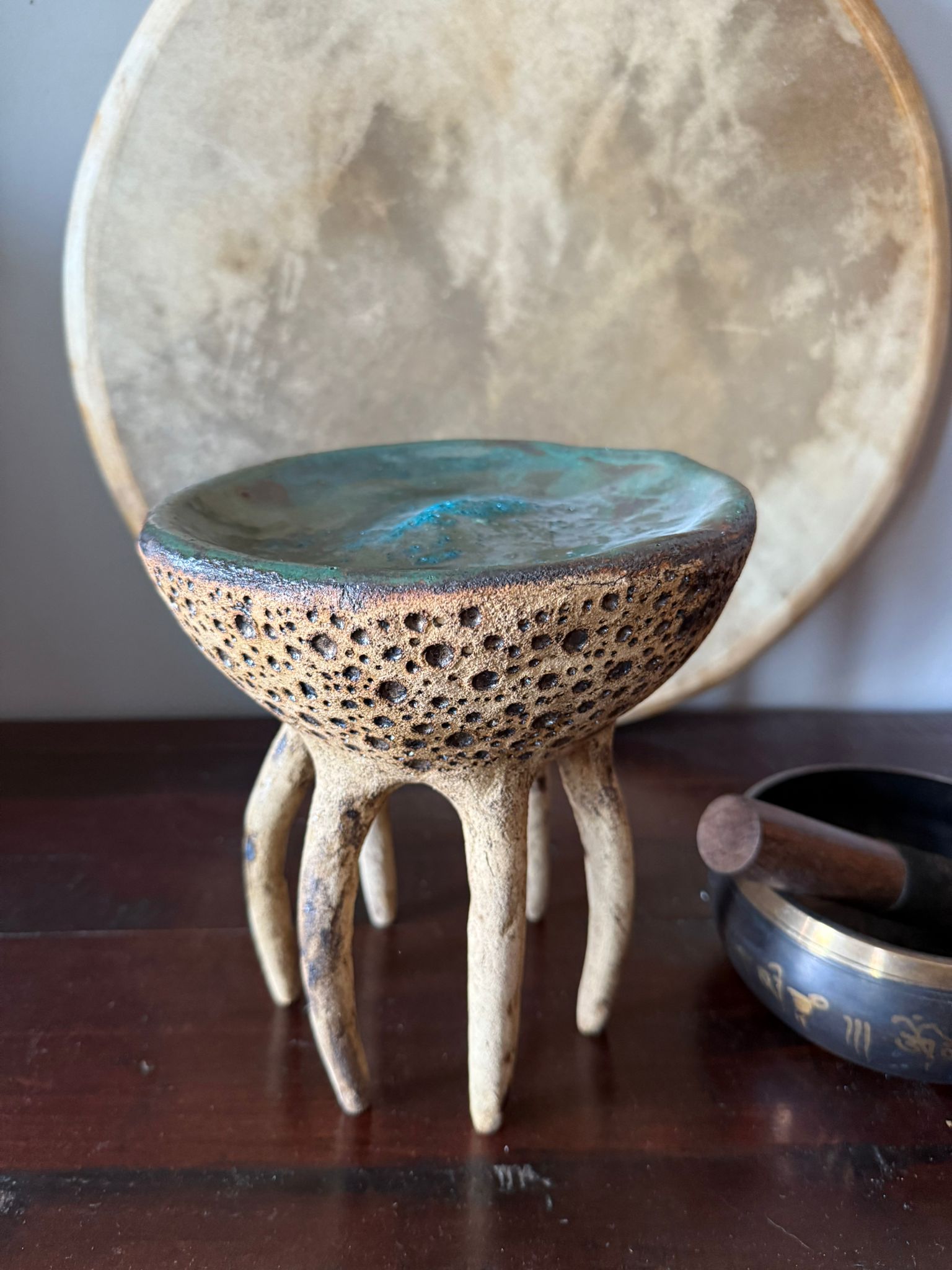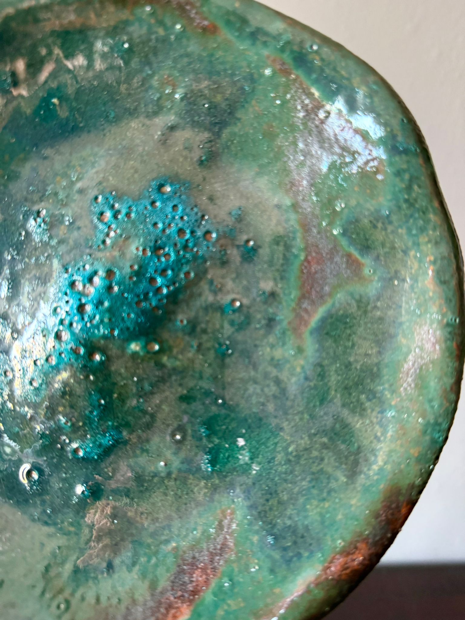 Może pełnić rolę ozdobnej podstawki na biżuterię, świece czy drobne przedmioty, a także stanowić samodzielną rzeźbiarską formę. Zewnętrzna powierzchnia zdobiona jest strukturą gliny podkreśloną delikatnym szkliwem w barwie starego złota, które dodaje elegancji i subtelnego blasku. Wnętrze pokryte jest błyszczącym szkliwem w odcieniach głębokiej zieleni i ciemnego brązu, tworząc efekt przypominający morską toń.
