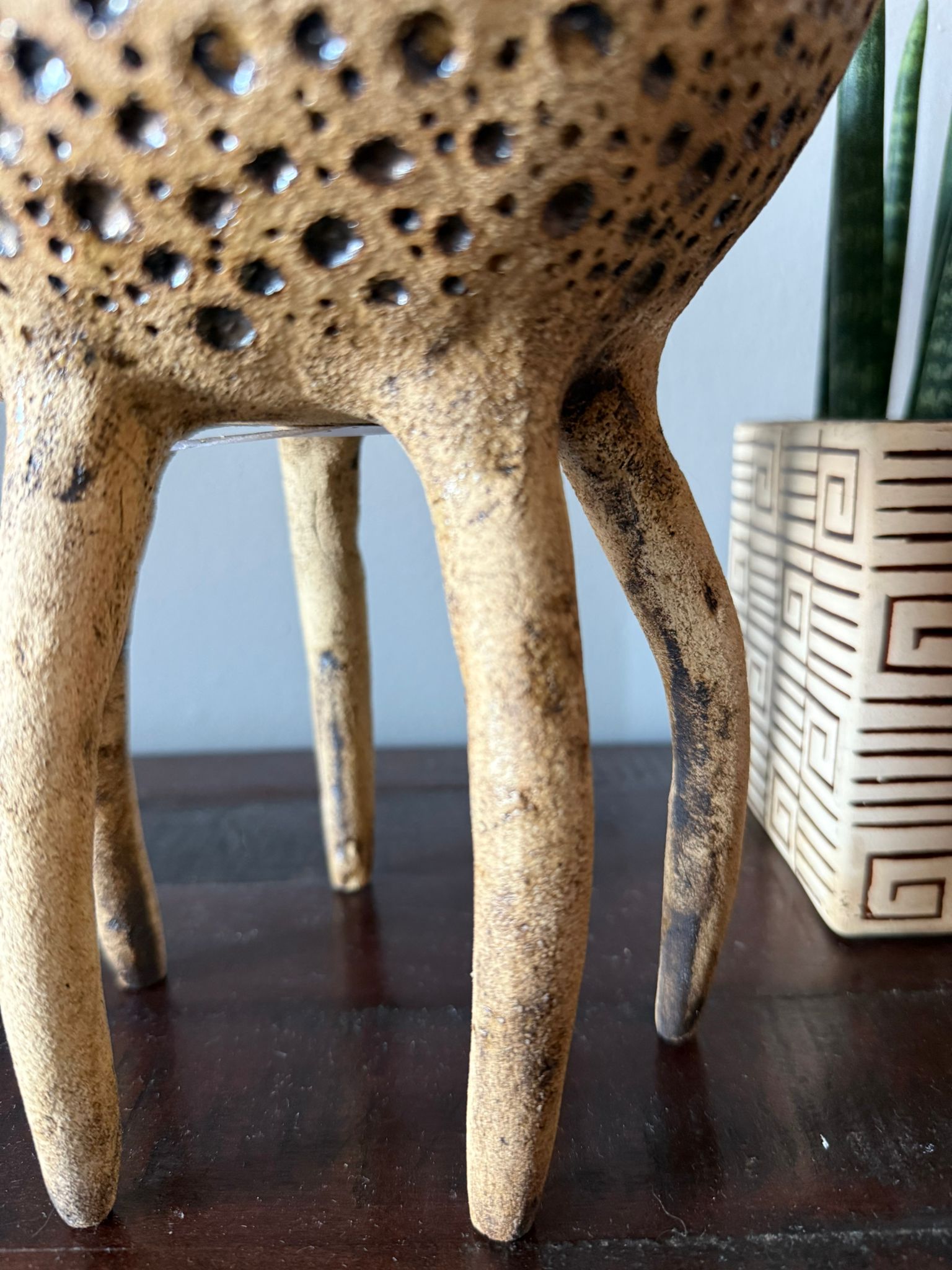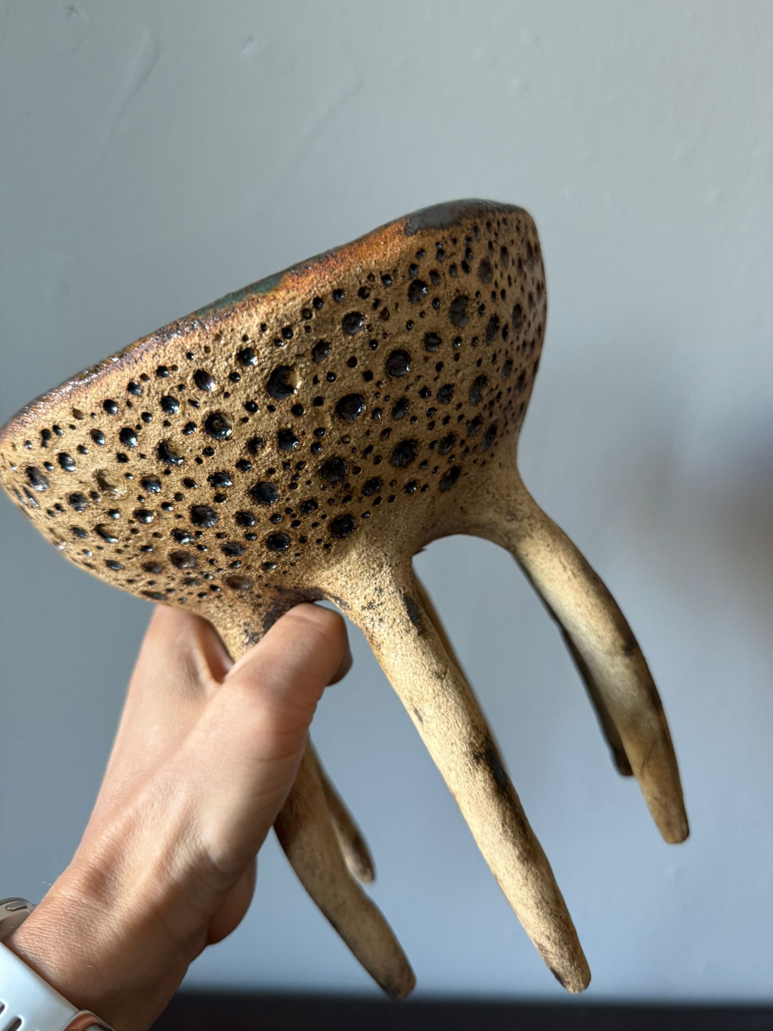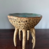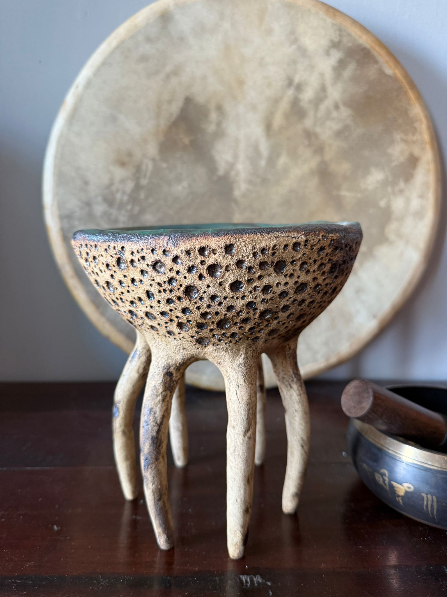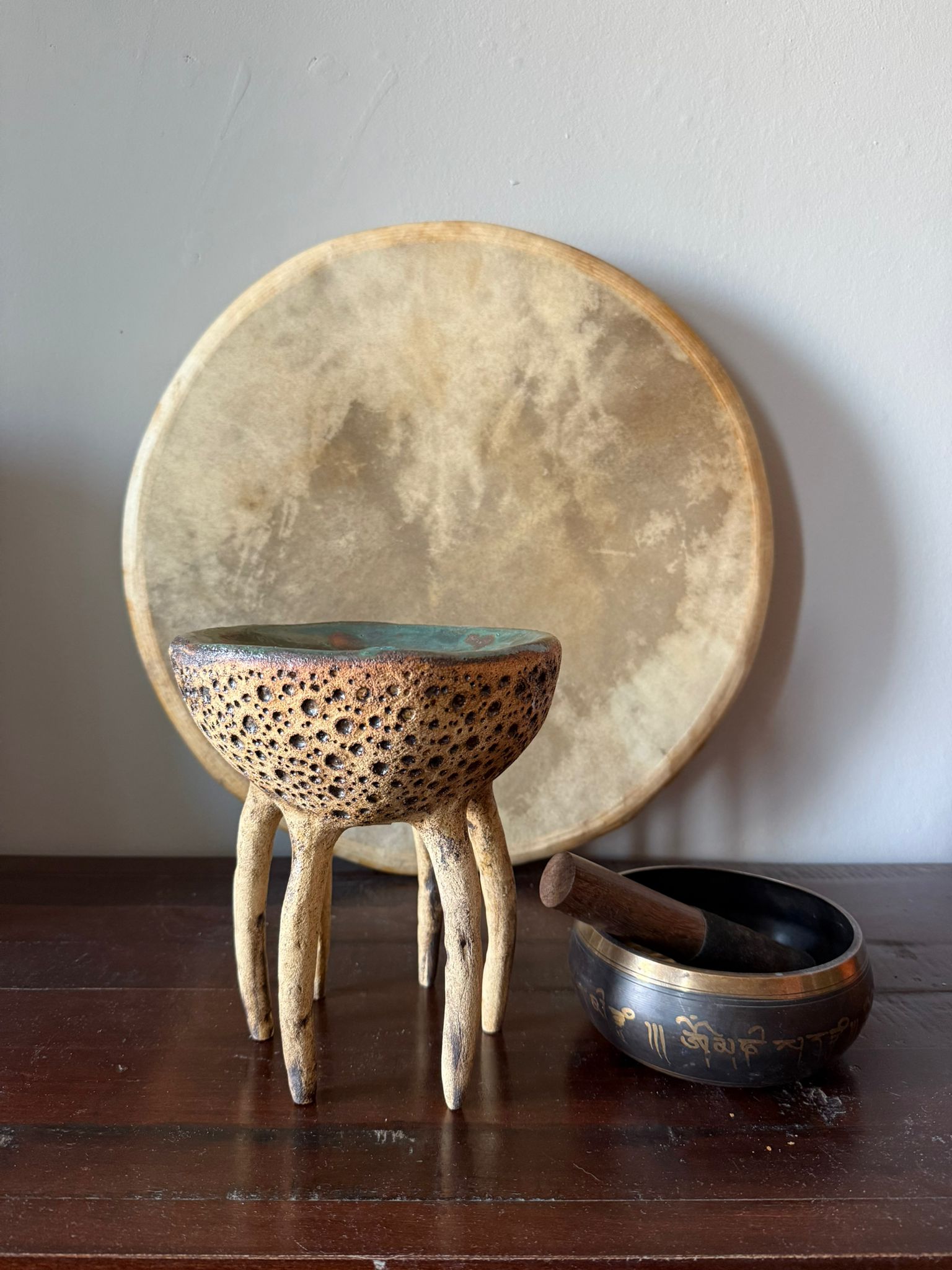 Może pełnić rolę ozdobnej podstawki na biżuterię, świece czy drobne przedmioty, a także stanowić samodzielną rzeźbiarską formę. Zewnętrzna powierzchnia zdobiona jest strukturą gliny podkreśloną delikatnym szkliwem w barwie starego złota, które dodaje elegancji i subtelnego blasku. Wnętrze pokryte jest błyszczącym szkliwem w odcieniach głębokiej zieleni i ciemnego brązu, tworząc efekt przypominający morską toń.