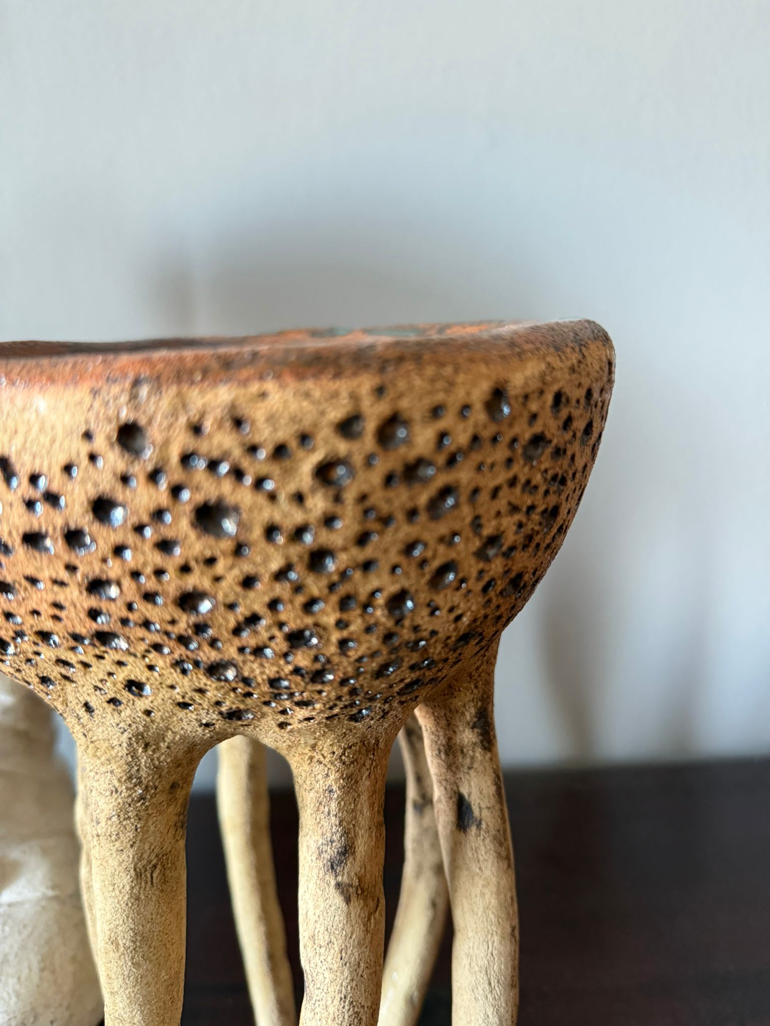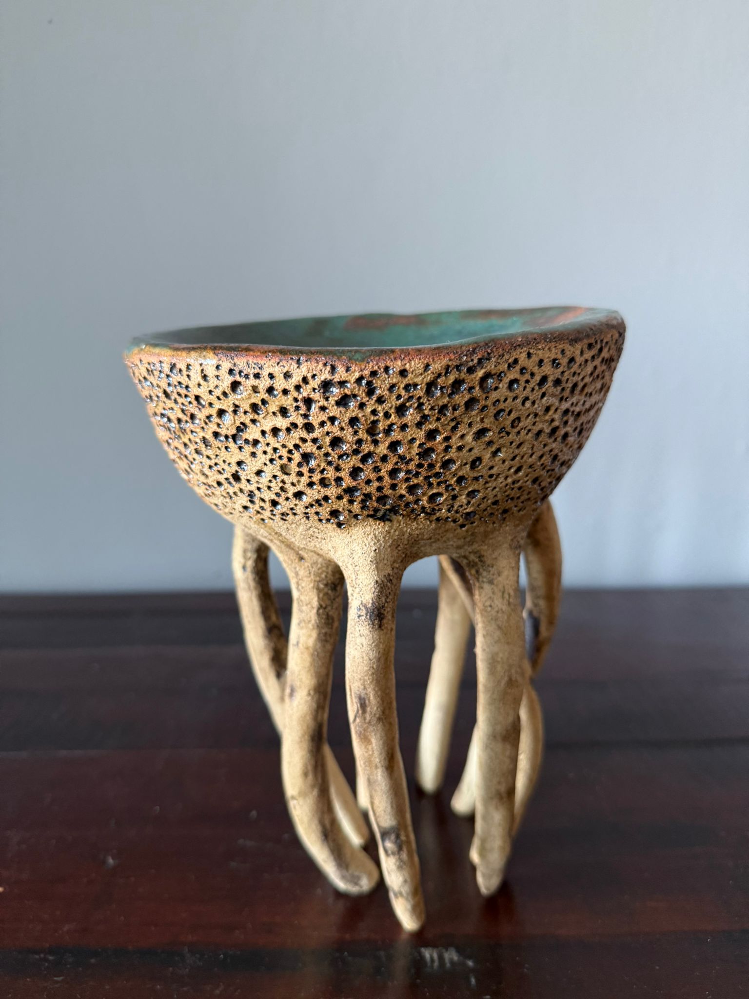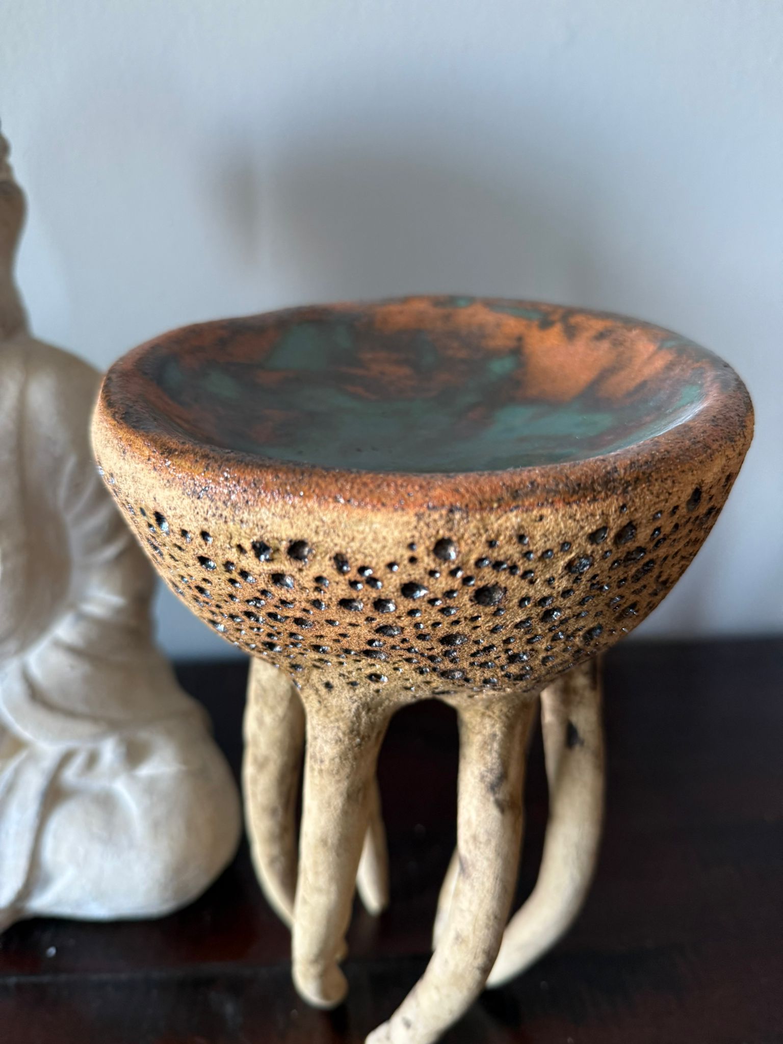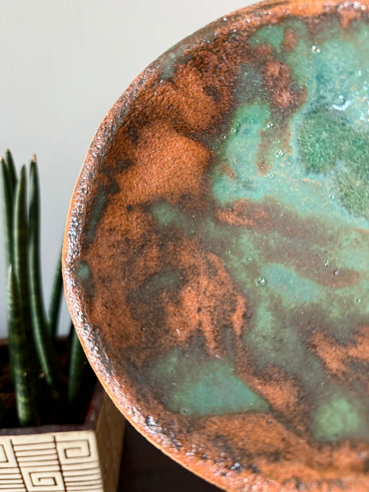 Może pełnić rolę dekoracji, a także subtelnej podstawki na biżuterię, świece czy drobne przedmioty. Zewnętrzna powierzchnia zachwyca strukturą gliny podkreśloną szkliwem w odcieniu starego złota i delikatną warstwą transparentnego szkliwa. Wnętrze miski zdobi błyszczące szkliwo w odcieniach zieleni i brązu, tworząc efekt głębi i naturalnego krajobrazu.