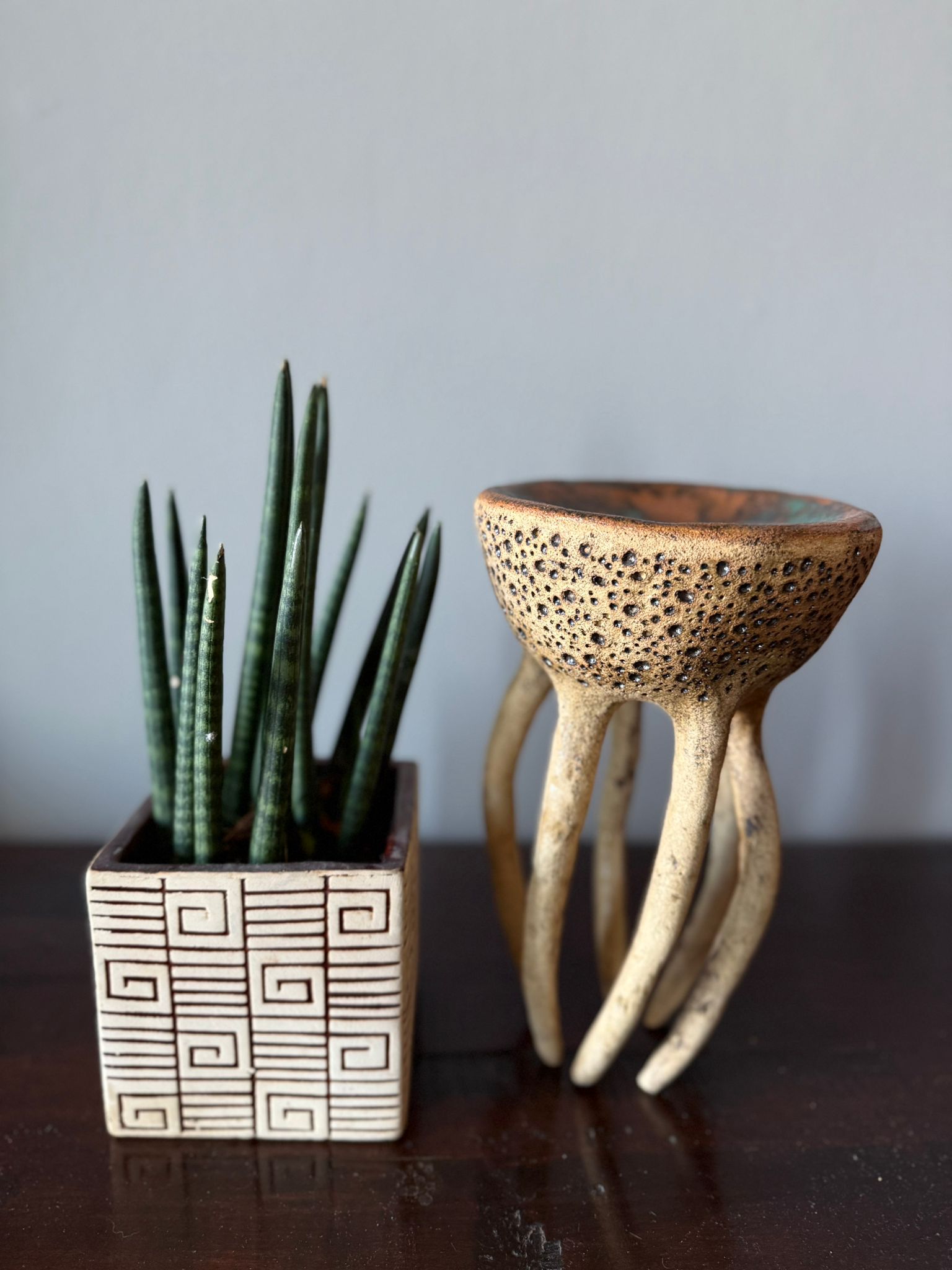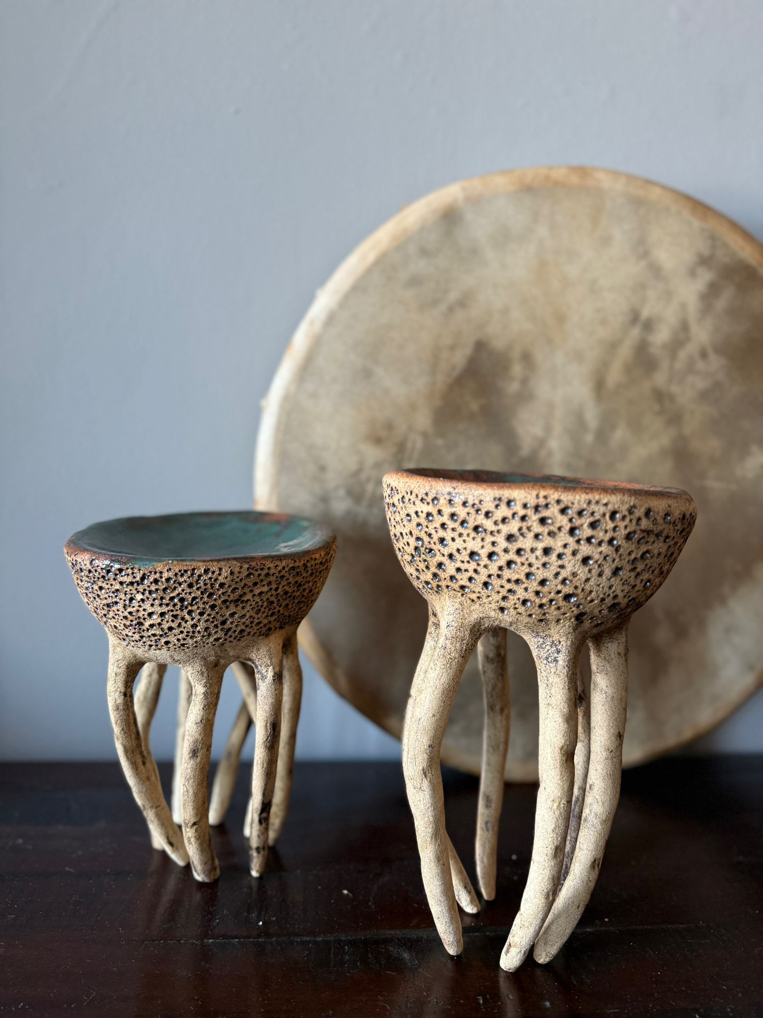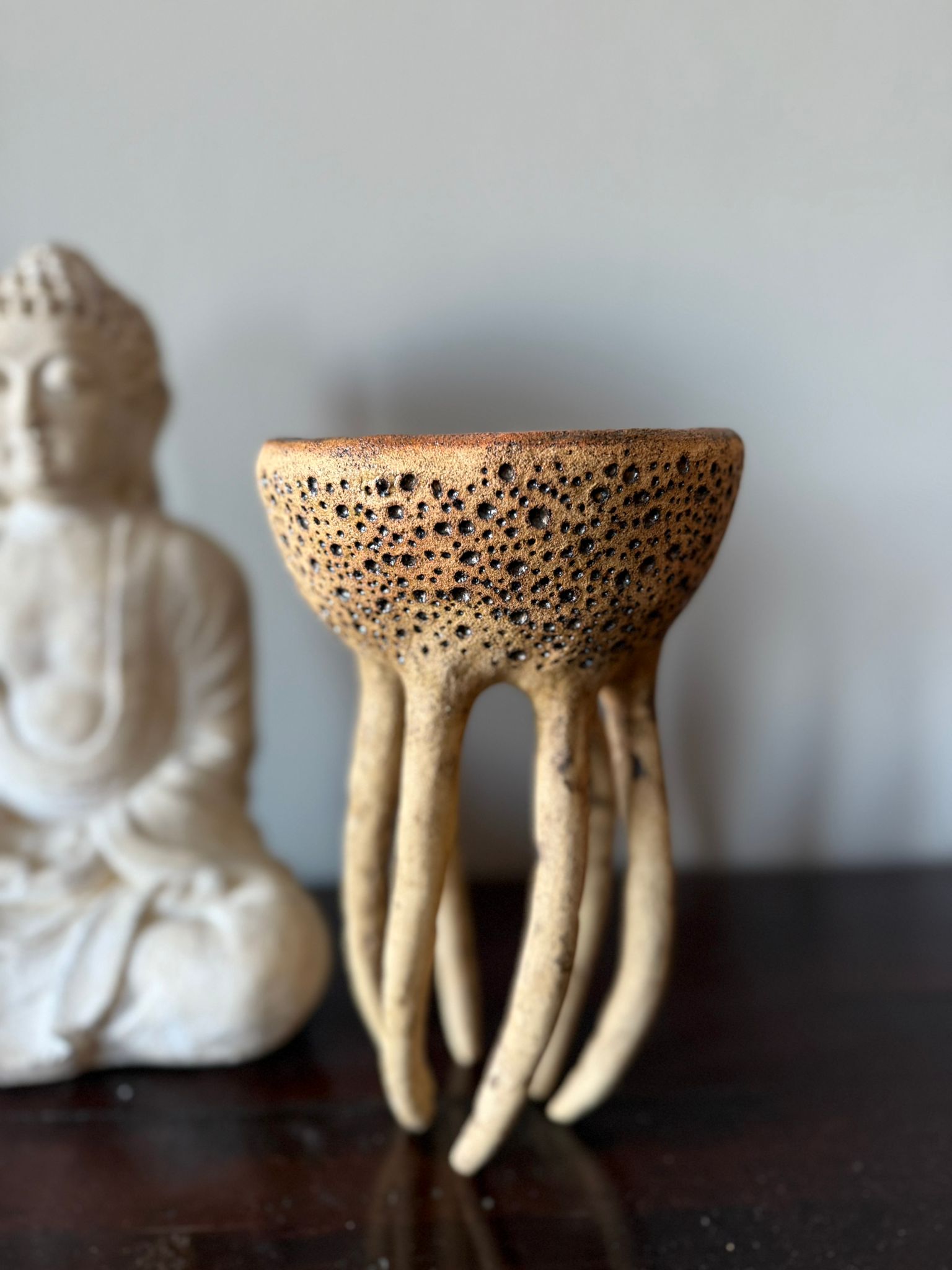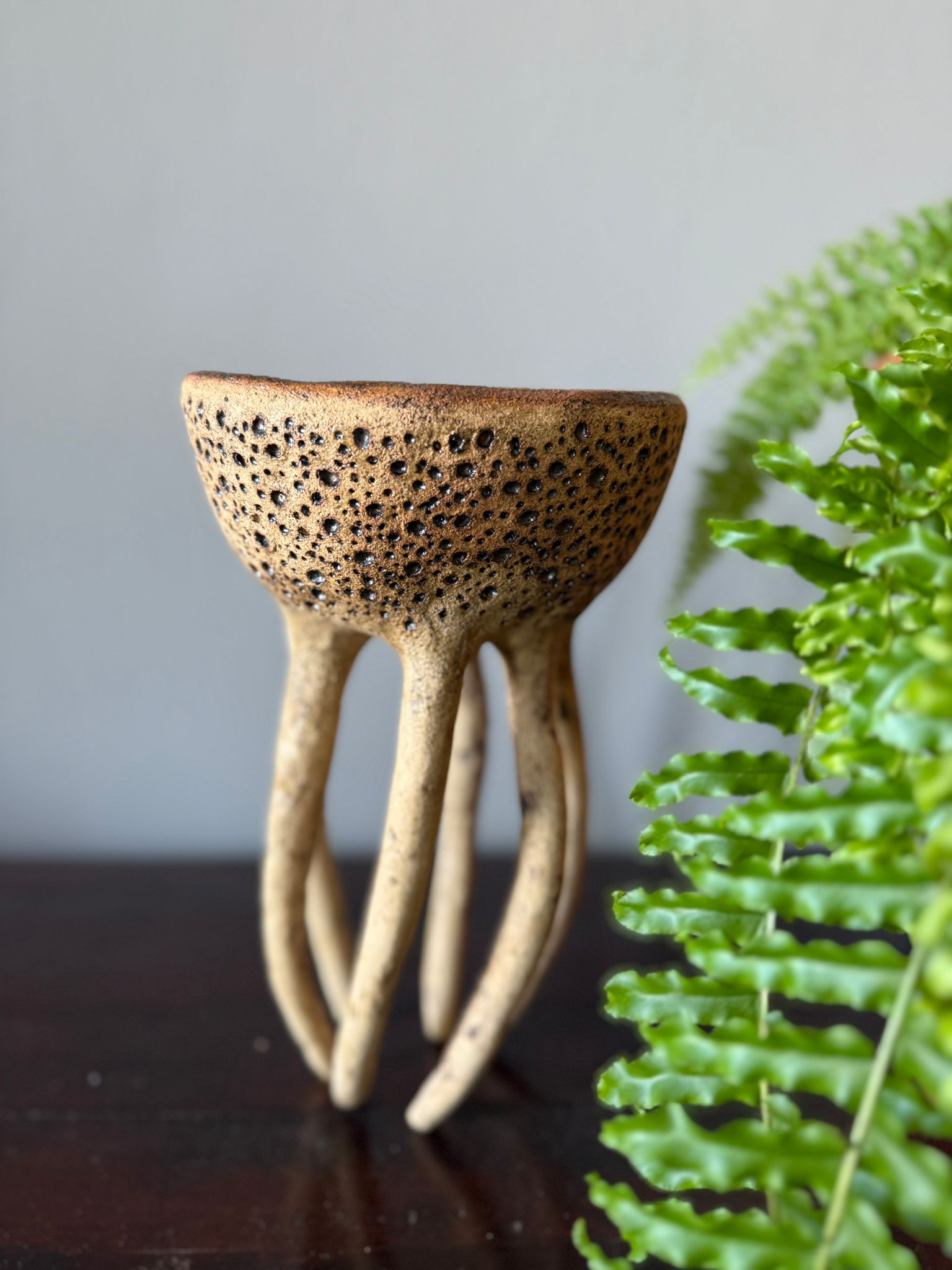 Może pełnić rolę dekoracji, a także subtelnej podstawki na biżuterię, świece czy drobne przedmioty. Zewnętrzna powierzchnia zachwyca strukturą gliny podkreśloną szkliwem w odcieniu starego złota i delikatną warstwą transparentnego szkliwa. Wnętrze miski zdobi błyszczące szkliwo w odcieniach zieleni i brązu, tworząc efekt głębi i naturalnego krajobrazu.