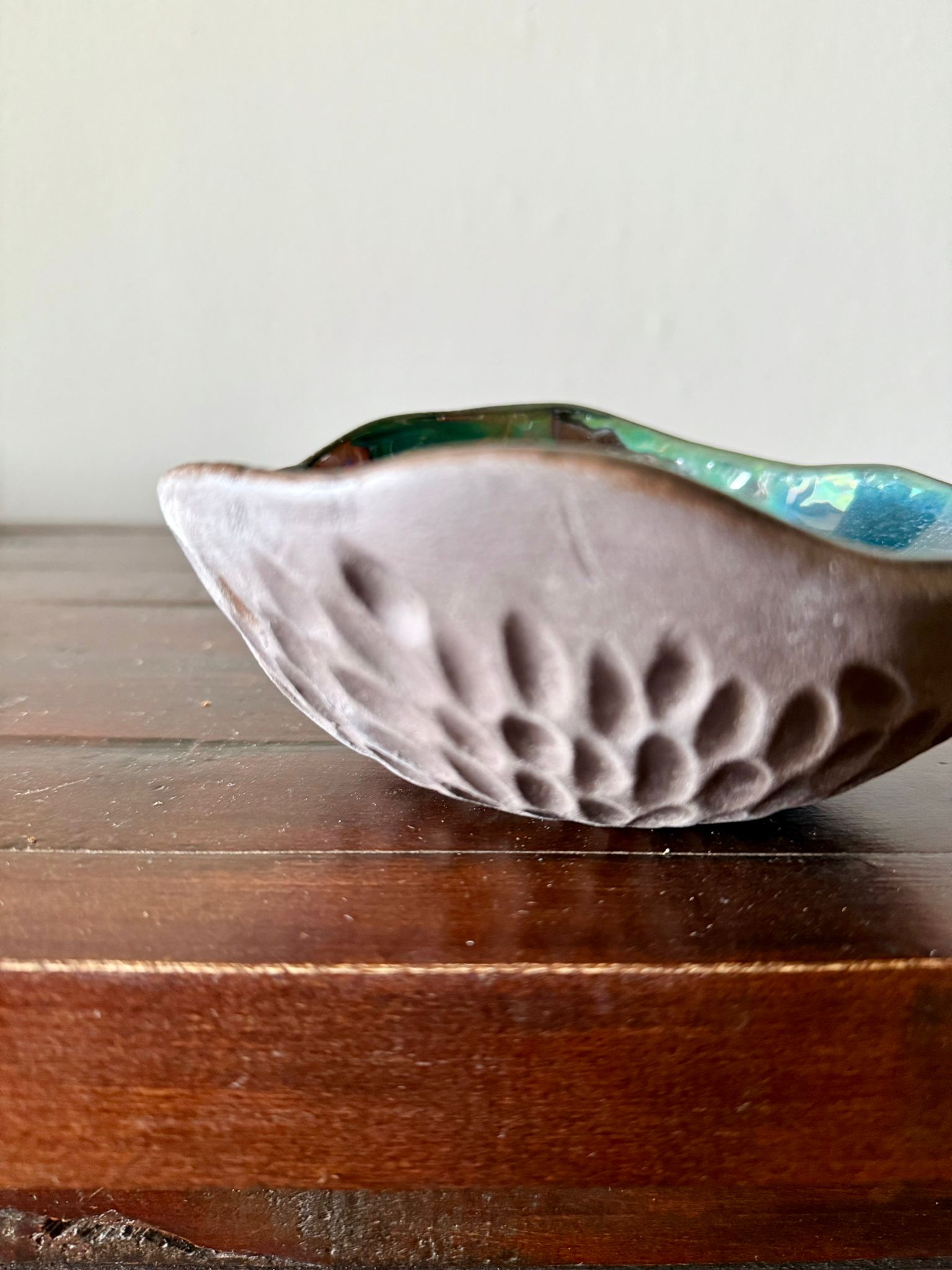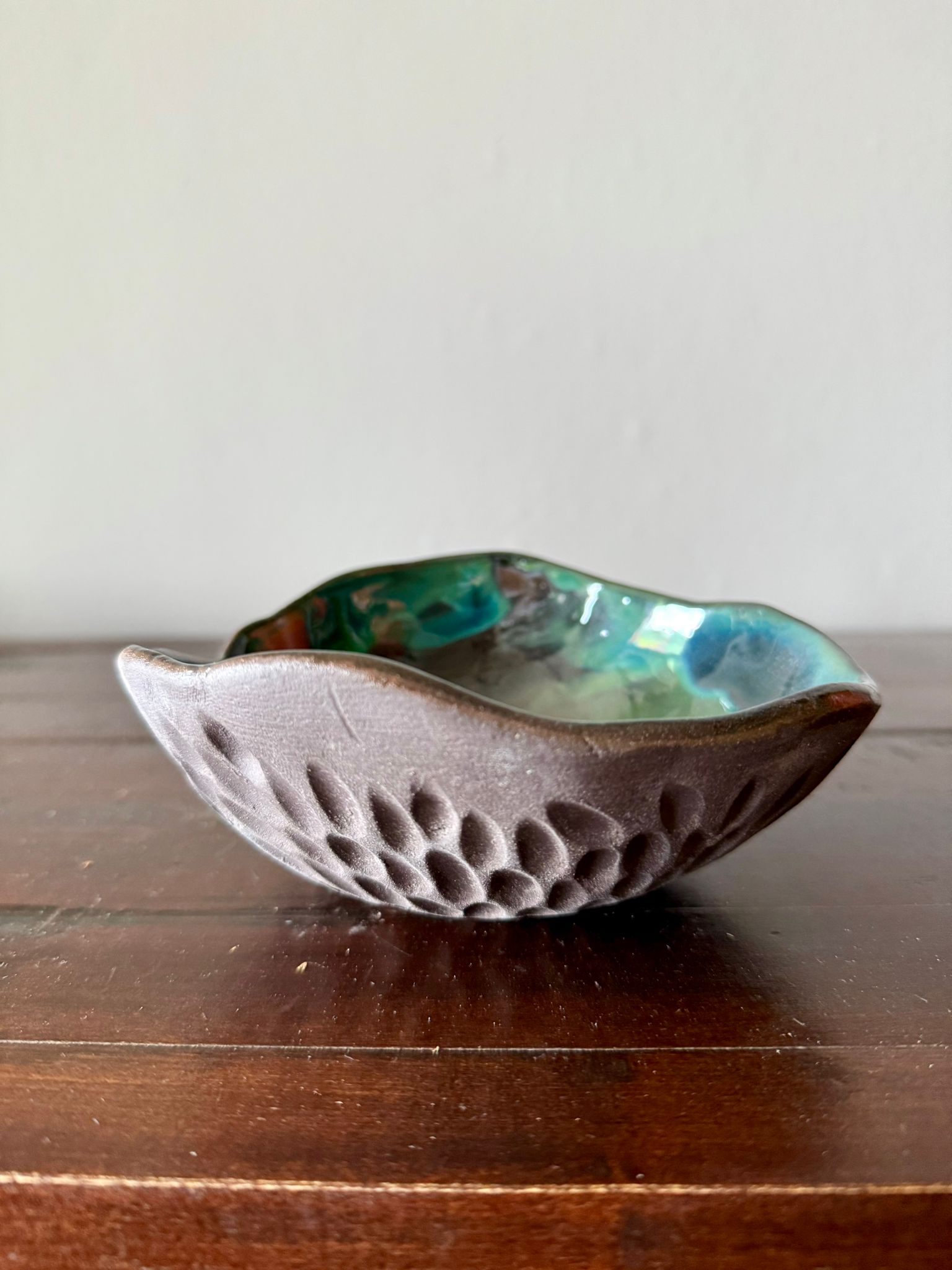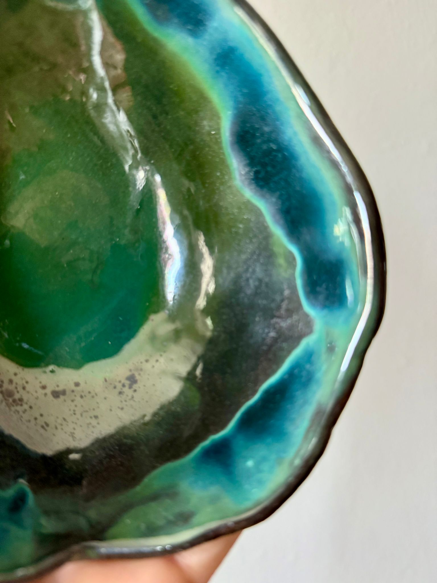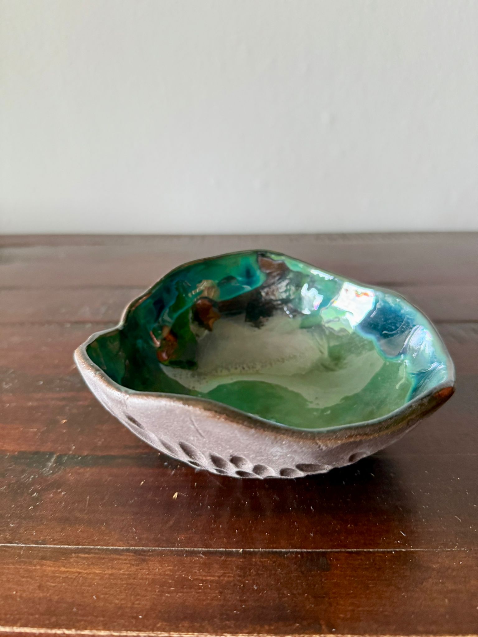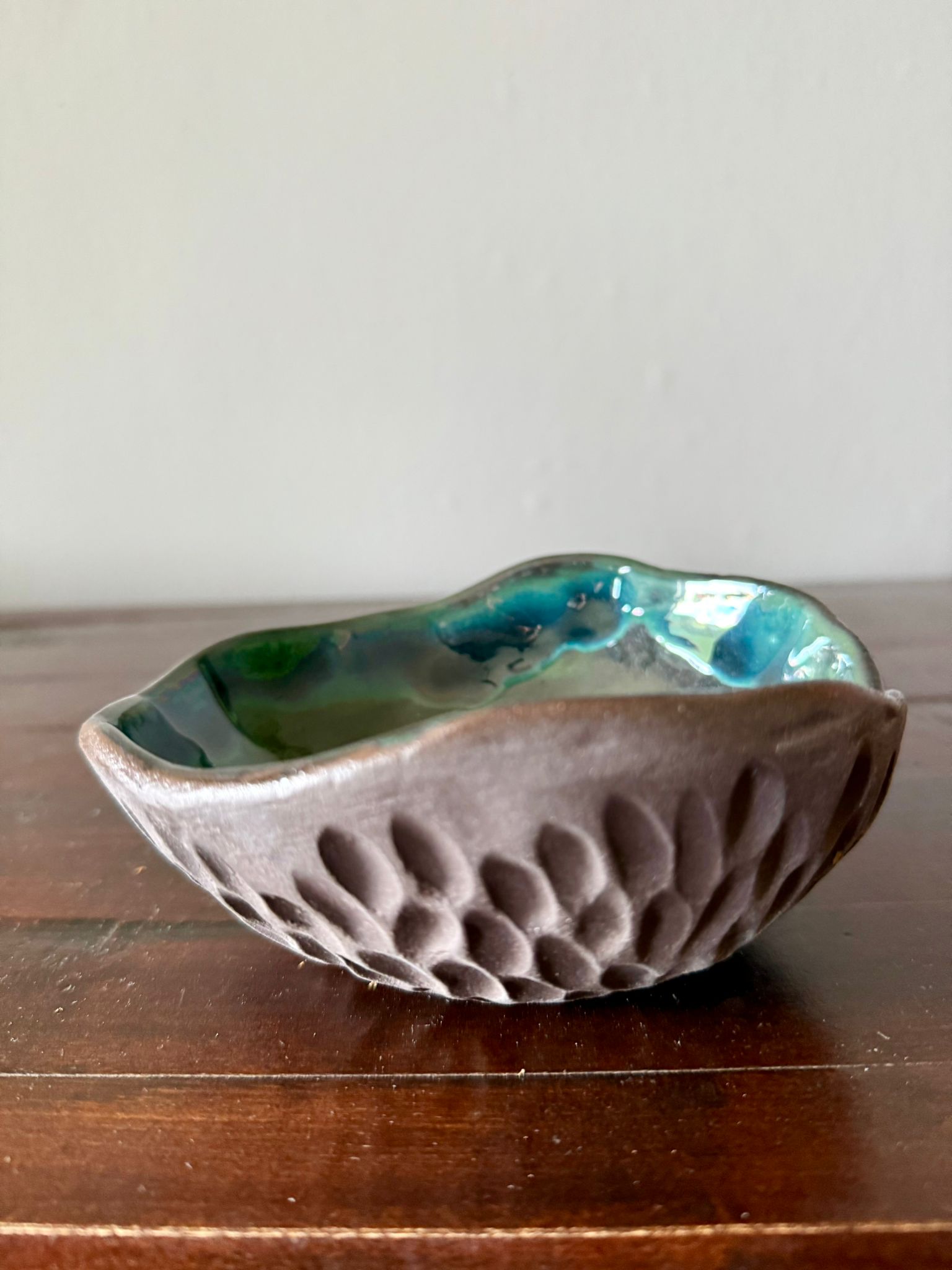 Ta miseczka ceramiczna „Leśne Echo Mini” to niewielkie, ale niezwykle efektowne dzieło rękodzieła. Wykonana z czarnej gliny, zachwyca kontrastem pomiędzy surową, matową powierzchnią zewnętrzną a błyszczącym szkliwem wewnątrz, utrzymanym w odcieniach zieleni i brązu z subtelnym efektem crackle (spękanego szkliwa). Delikatne rzeźbienia na zewnątrz dodają jej charakteru i podkreślają organiczną formę naczynia.