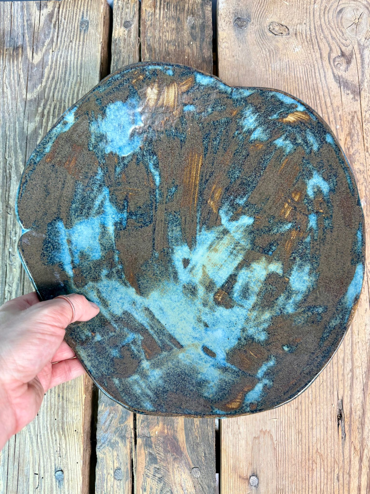 Cała patera została pokryta błyszczącym szkliwem dopuszczonym do kontaktu z żywnością, dzięki czemu może być bezpiecznie używana do serwowania potraw, ciast, owoców czy przekąsek. Szkliwo w odcieniach brązu, czerni i niebieskiego tworzy dynamiczne, organiczne przejścia kolorystyczne, które sprawiają, że każdy egzemplarz jest niepowtarzalny.