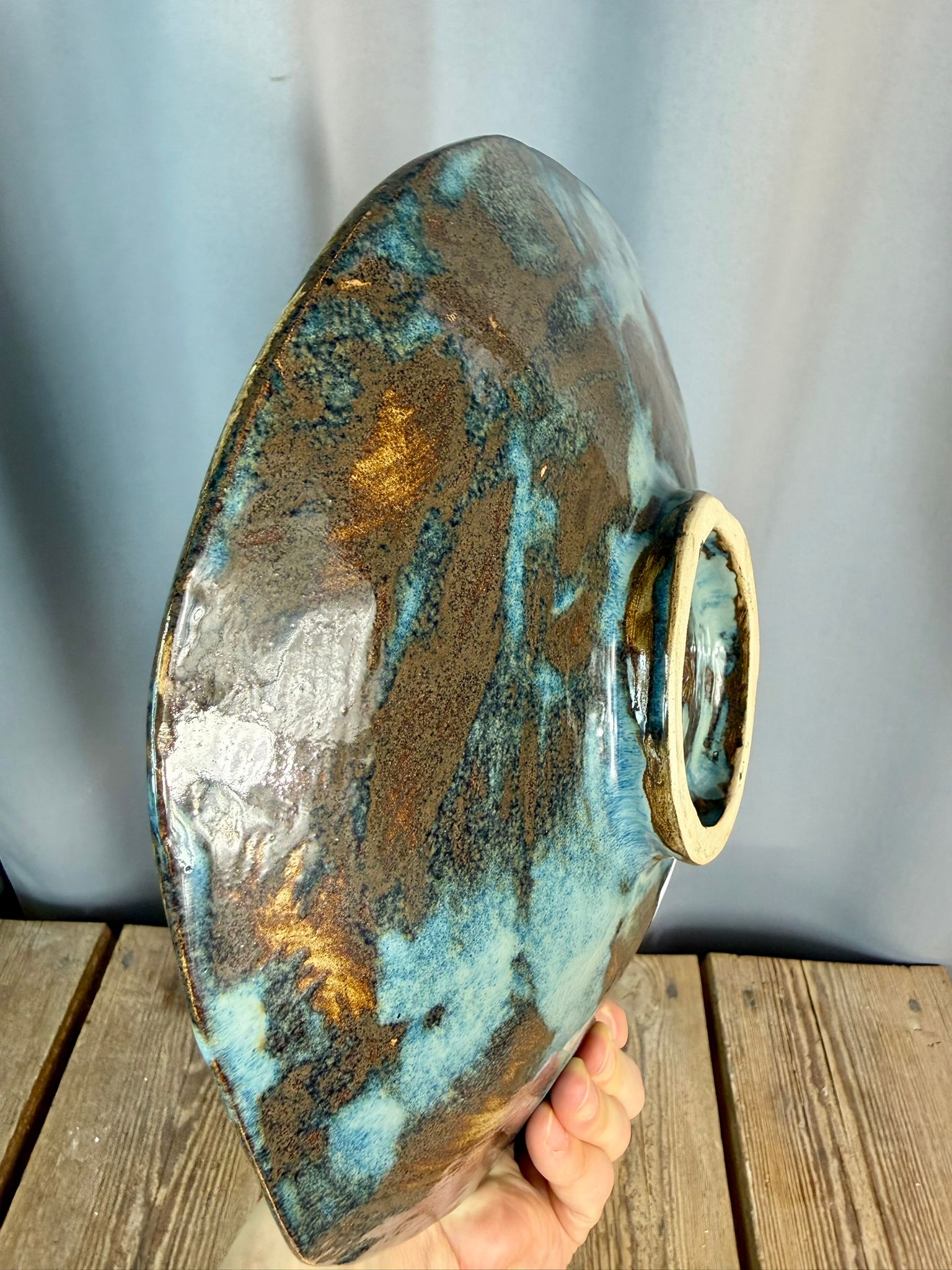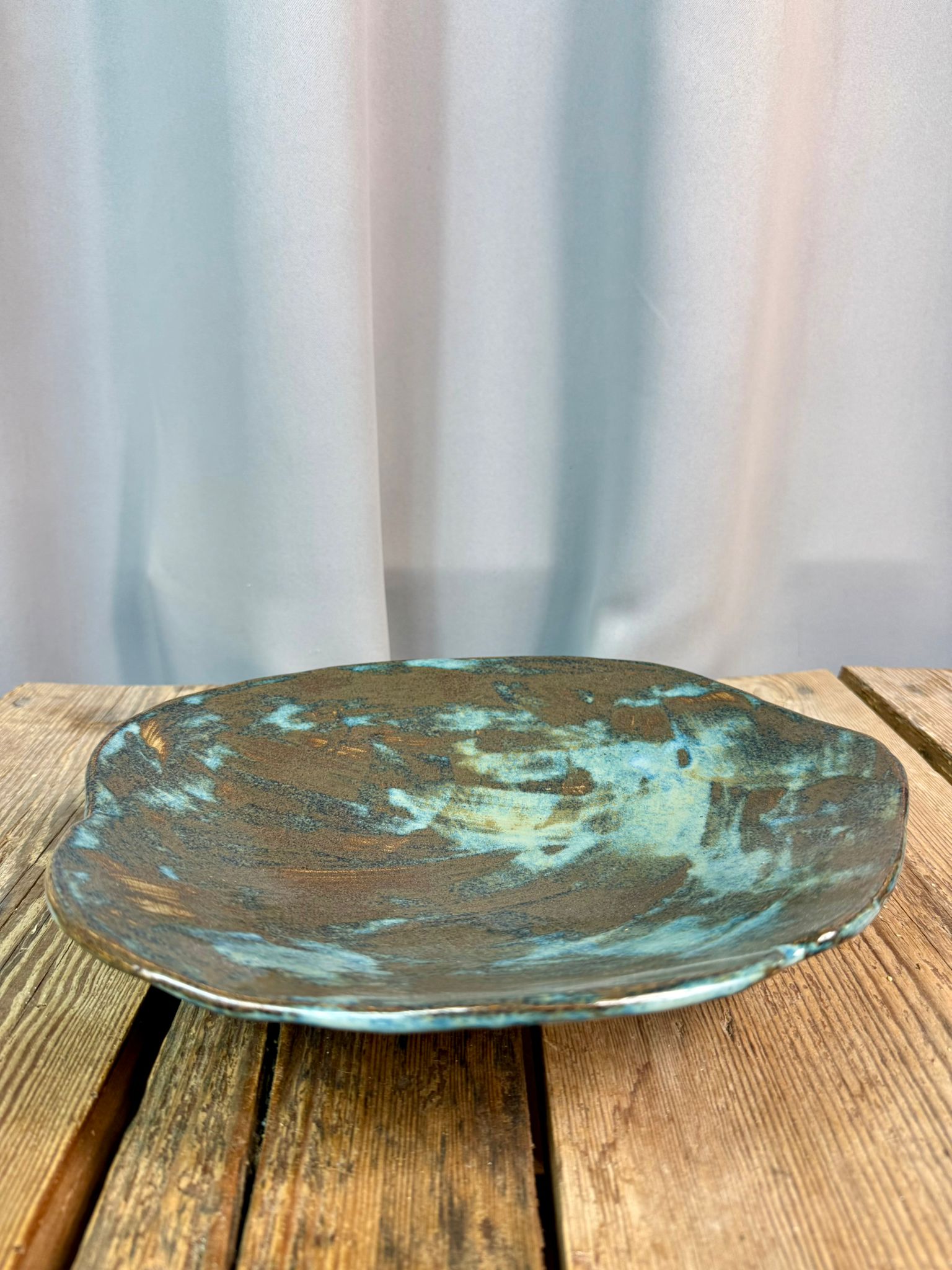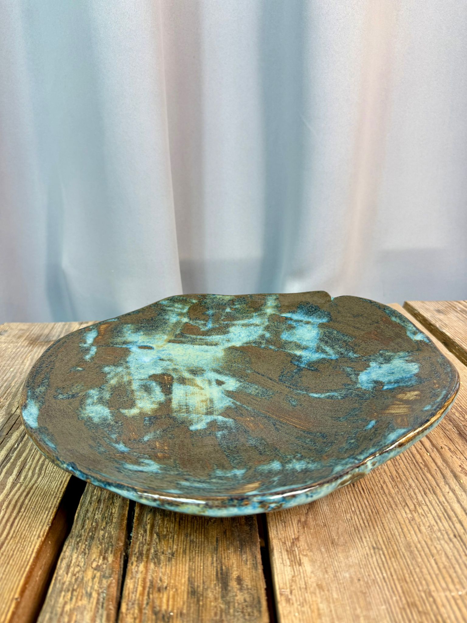 Ręcznie wykonana patera ceramiczna powstała z czerwonej gliny i łączy w sobie funkcję użytkową z dekoracyjną formą ceramiki artystycznej. Jej charakter podkreśla efektowe szkliwo, które nadaje powierzchni głębi i wyrazistego, szlachetnego wyglądu.