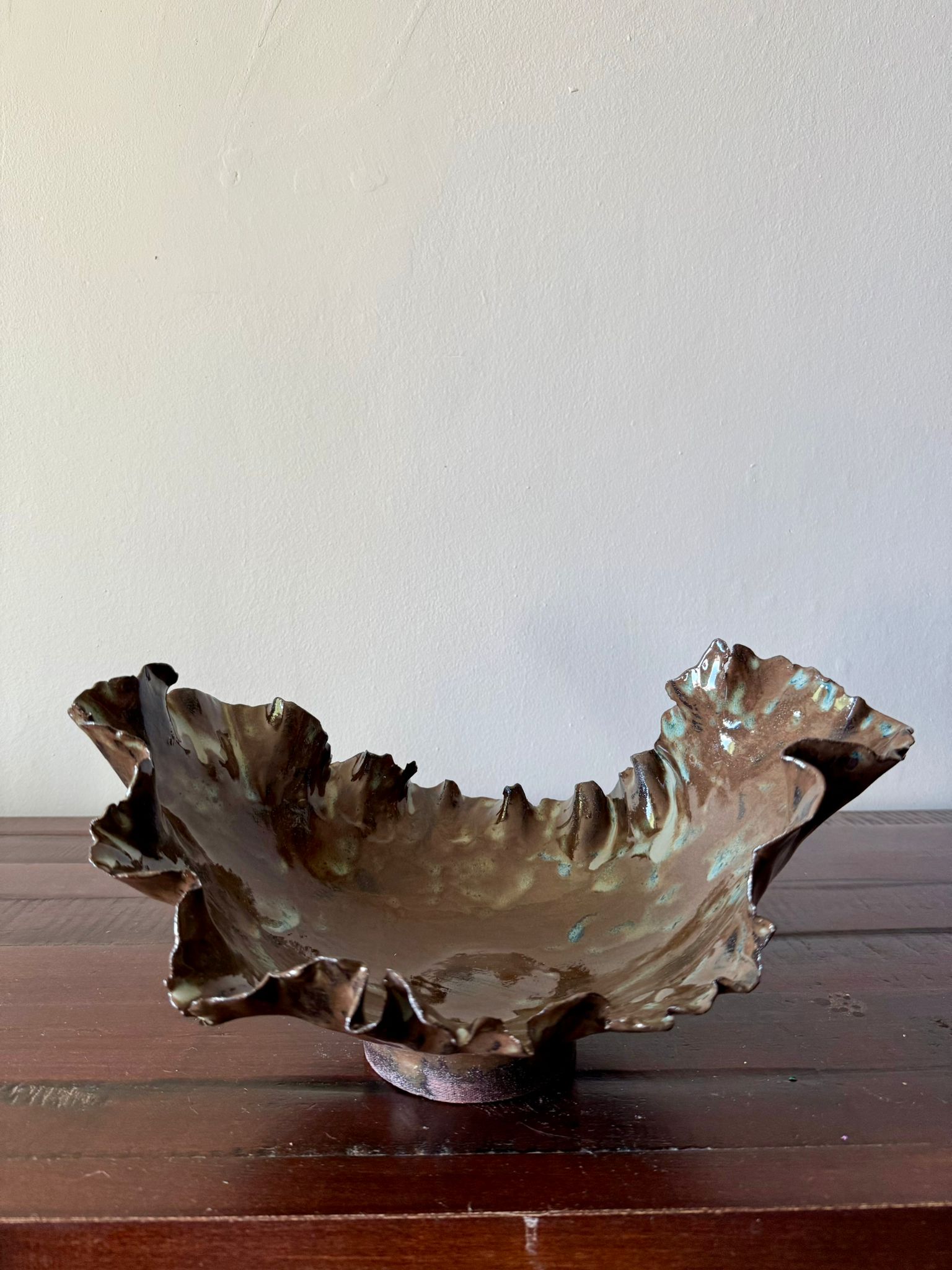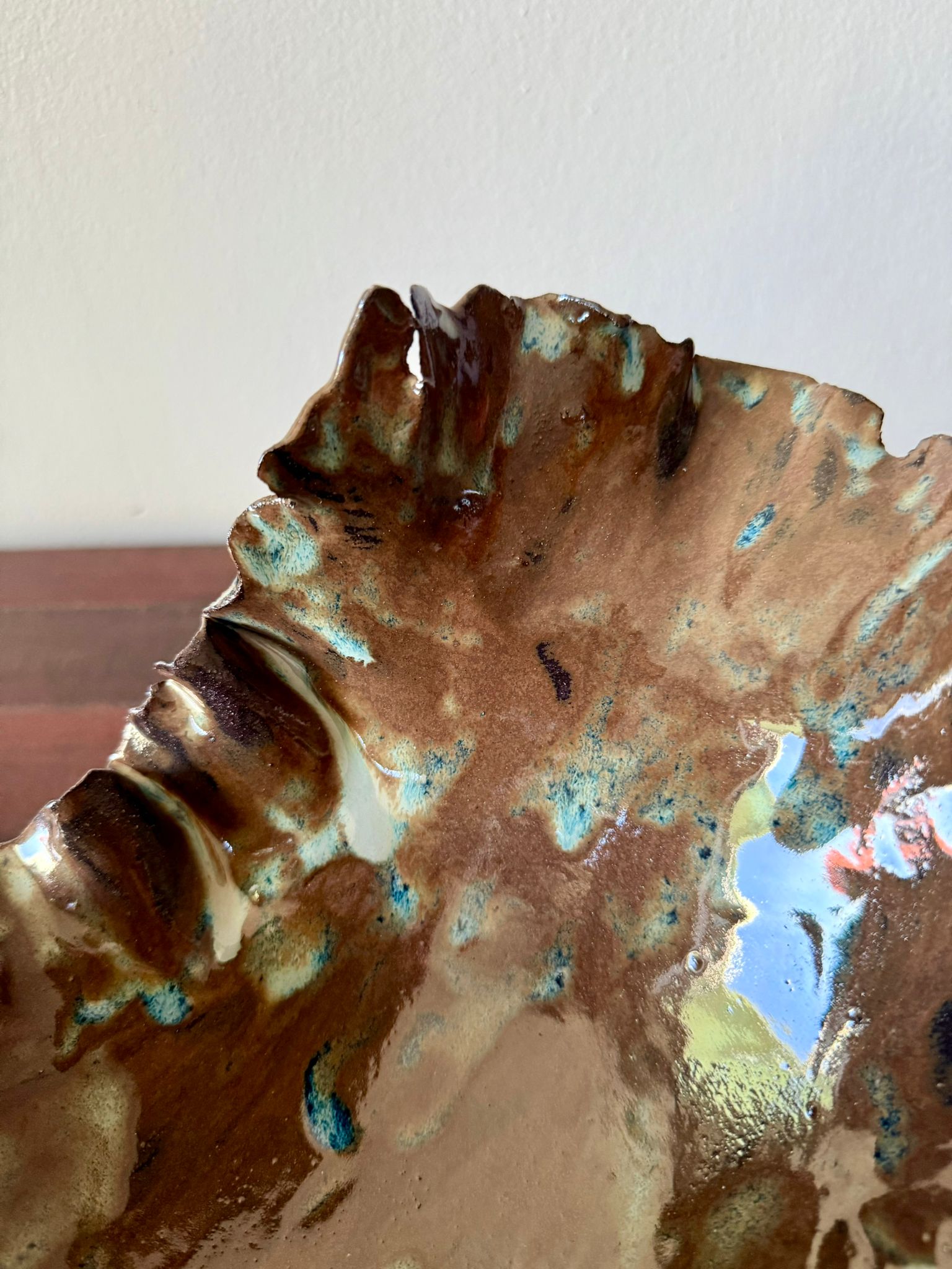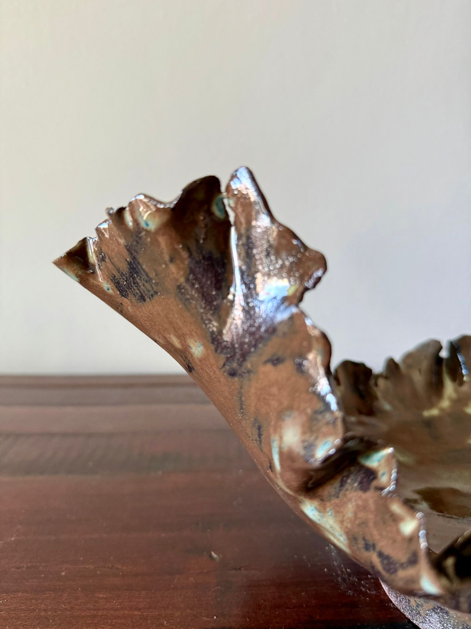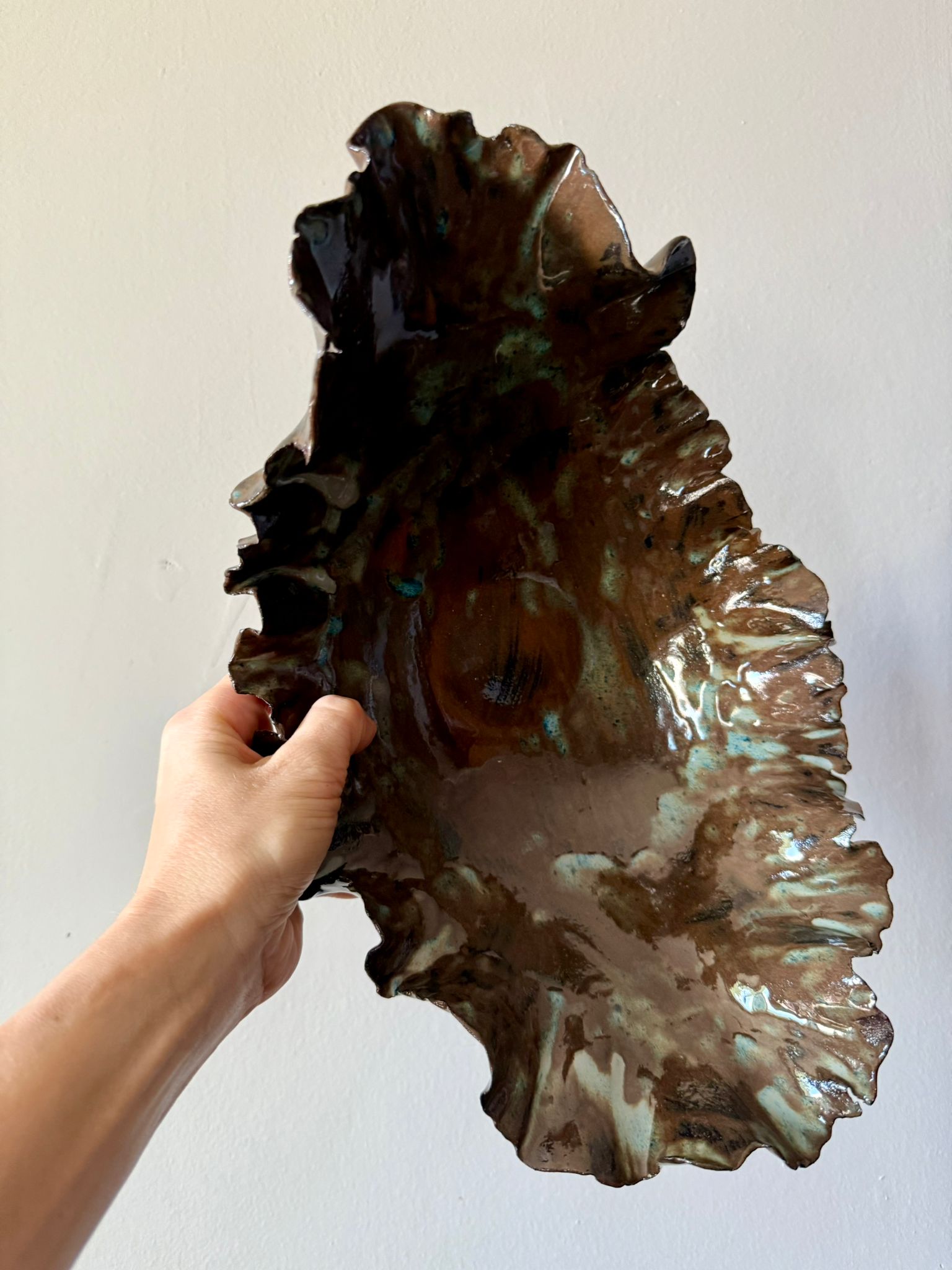 Patera „Earth Leaf” z kolekcji inspirowanej naturą to wyjątkowe połączenie organicznej formy i ziemistych barw. Została ręcznie uformowana z czerwonej gliny, a jej nieregularne, pofalowane brzegi sprawiają, że przypomina liść ukształtowany przez naturę. Pokryta błyszczącym szkliwem w odcieniach brązu z delikatnymi akcentami niebieskiego, zachwyca głębią koloru i naturalnym charakterem.