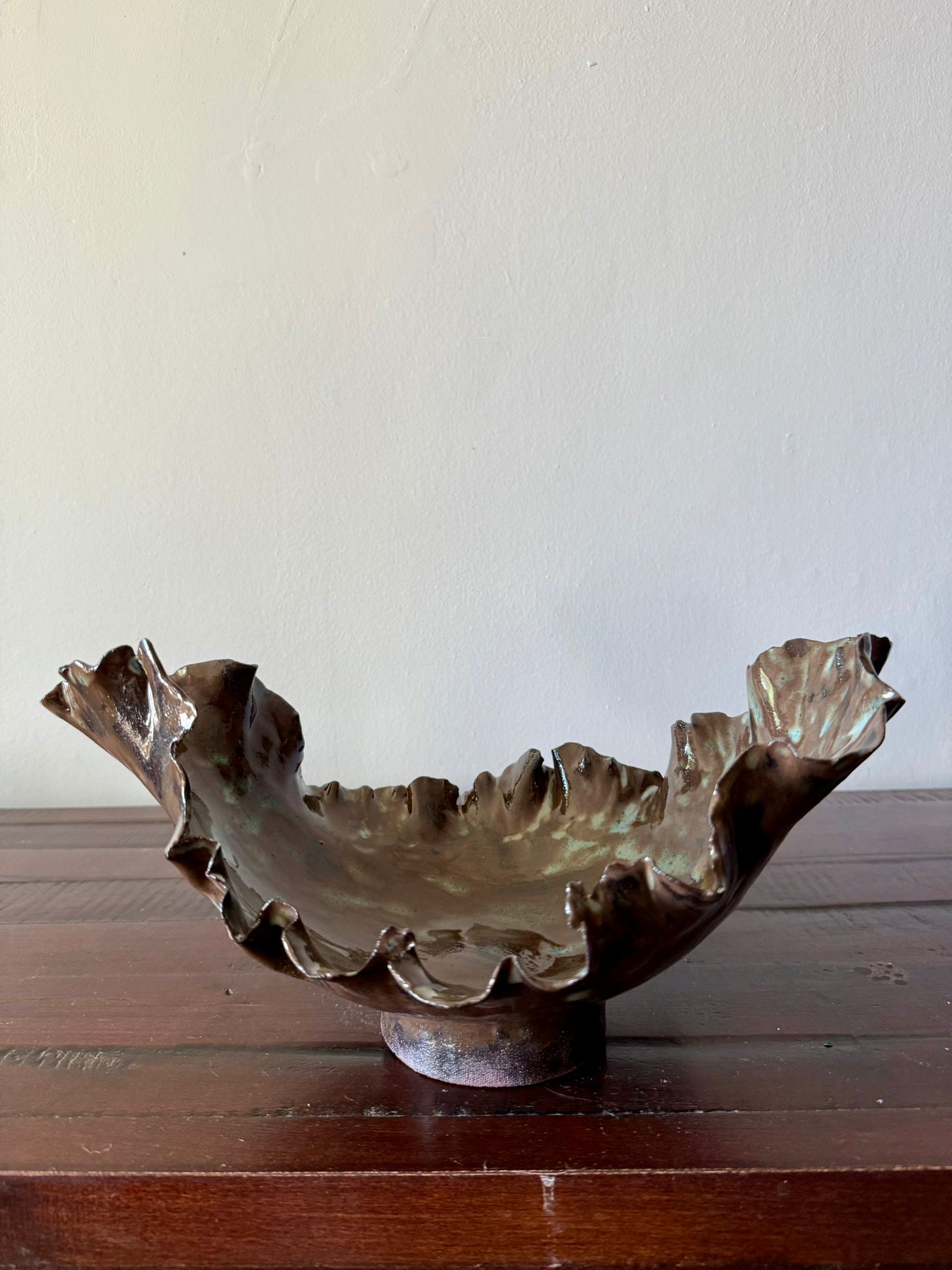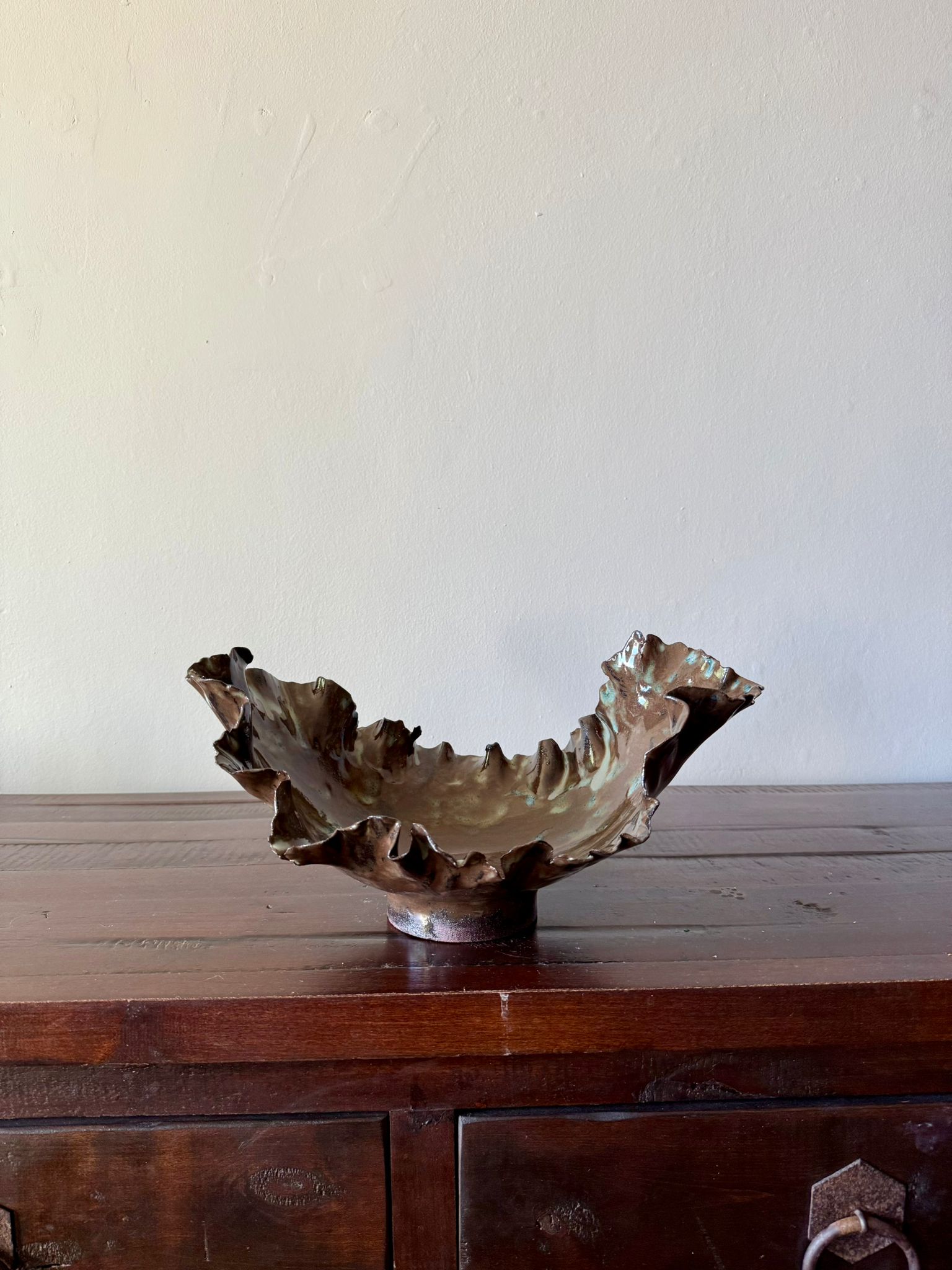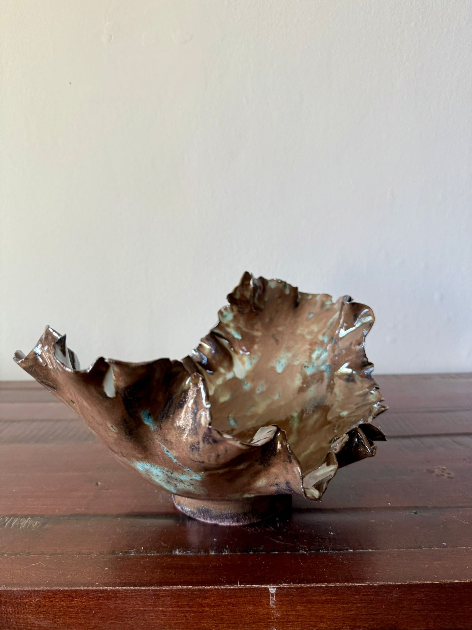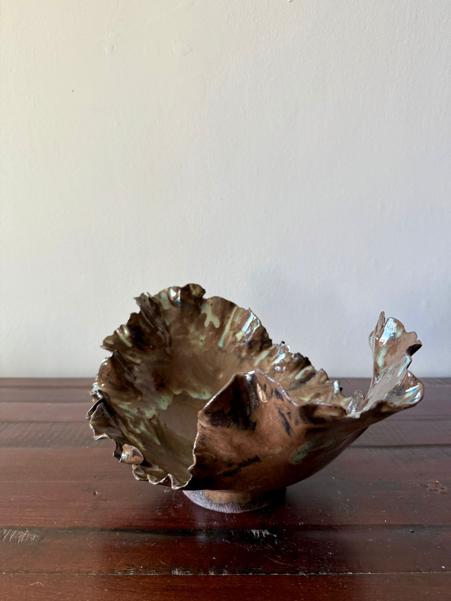 Patera „Earth Leaf” z kolekcji inspirowanej naturą to wyjątkowe połączenie organicznej formy i ziemistych barw. Została ręcznie uformowana z czerwonej gliny, a jej nieregularne, pofalowane brzegi sprawiają, że przypomina liść ukształtowany przez naturę. Pokryta błyszczącym szkliwem w odcieniach brązu z delikatnymi akcentami niebieskiego, zachwyca głębią koloru i naturalnym charakterem.