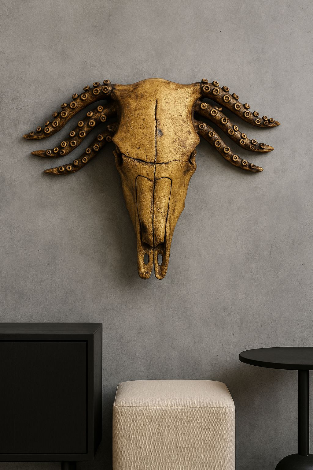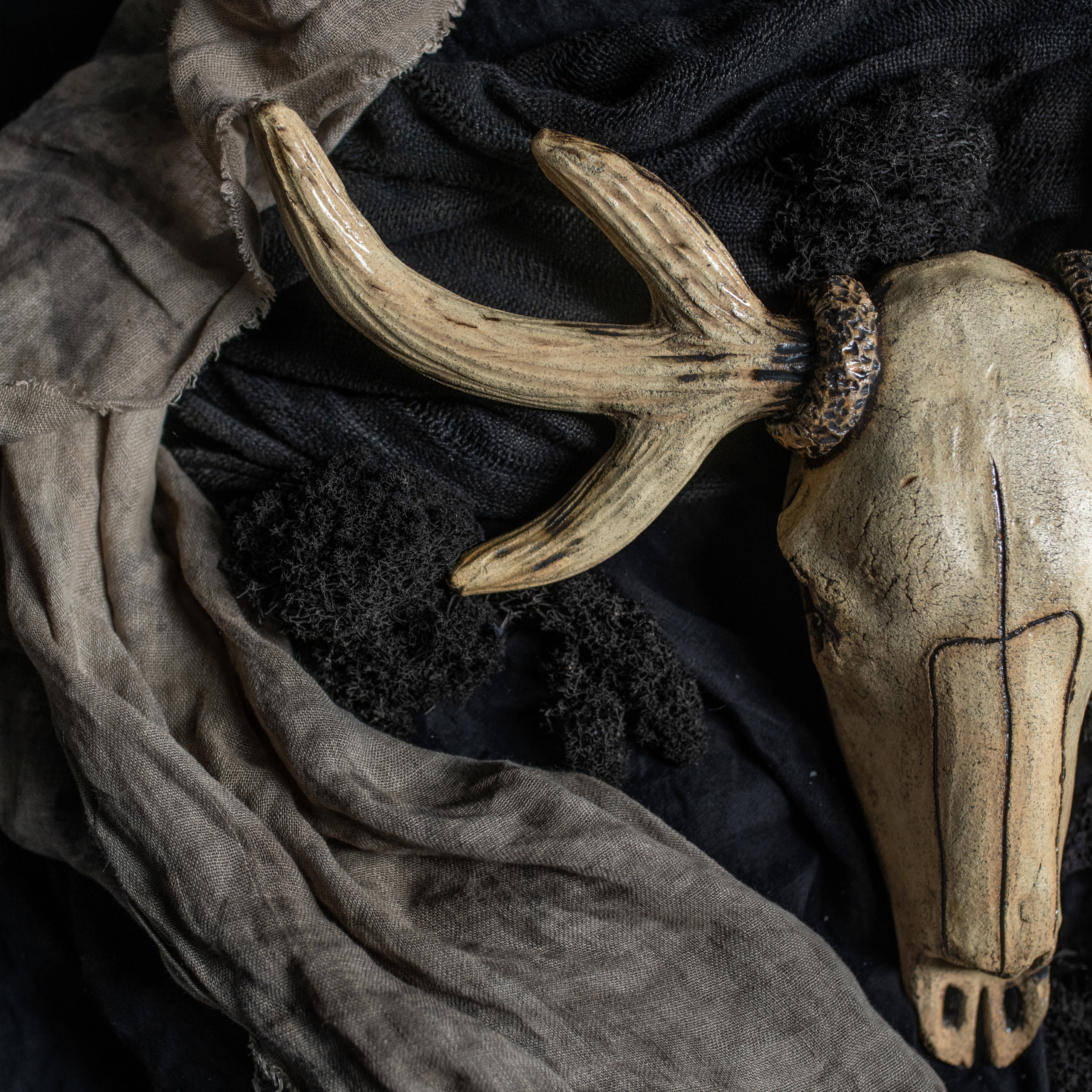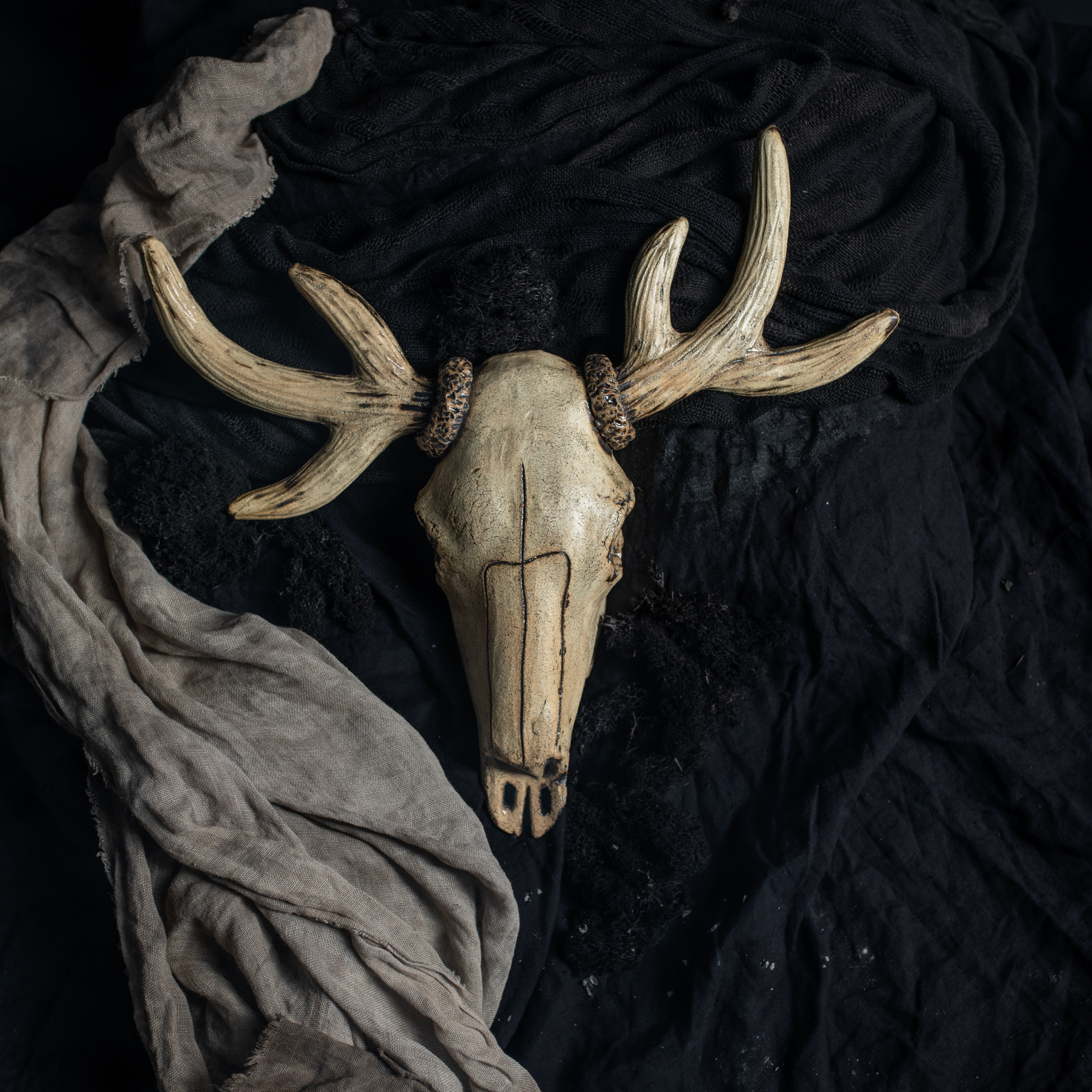 Ręcznie wykonana rzeźba ceramiczna przedstawiająca czaszkę byka, której tradycyjne rogi zastąpiono majestatycznymi rogami jelenia. Ta unikatowa kompozycja symbolizuje połączenie siły i elegancji natury, przypominając o przemijaniu oraz delikatnej równowadze życia. Praca powstała z intencją tworzenia „trofeów” bez przemocy — manifestu przeciwko zabijaniu zwierząt dla ozdoby.