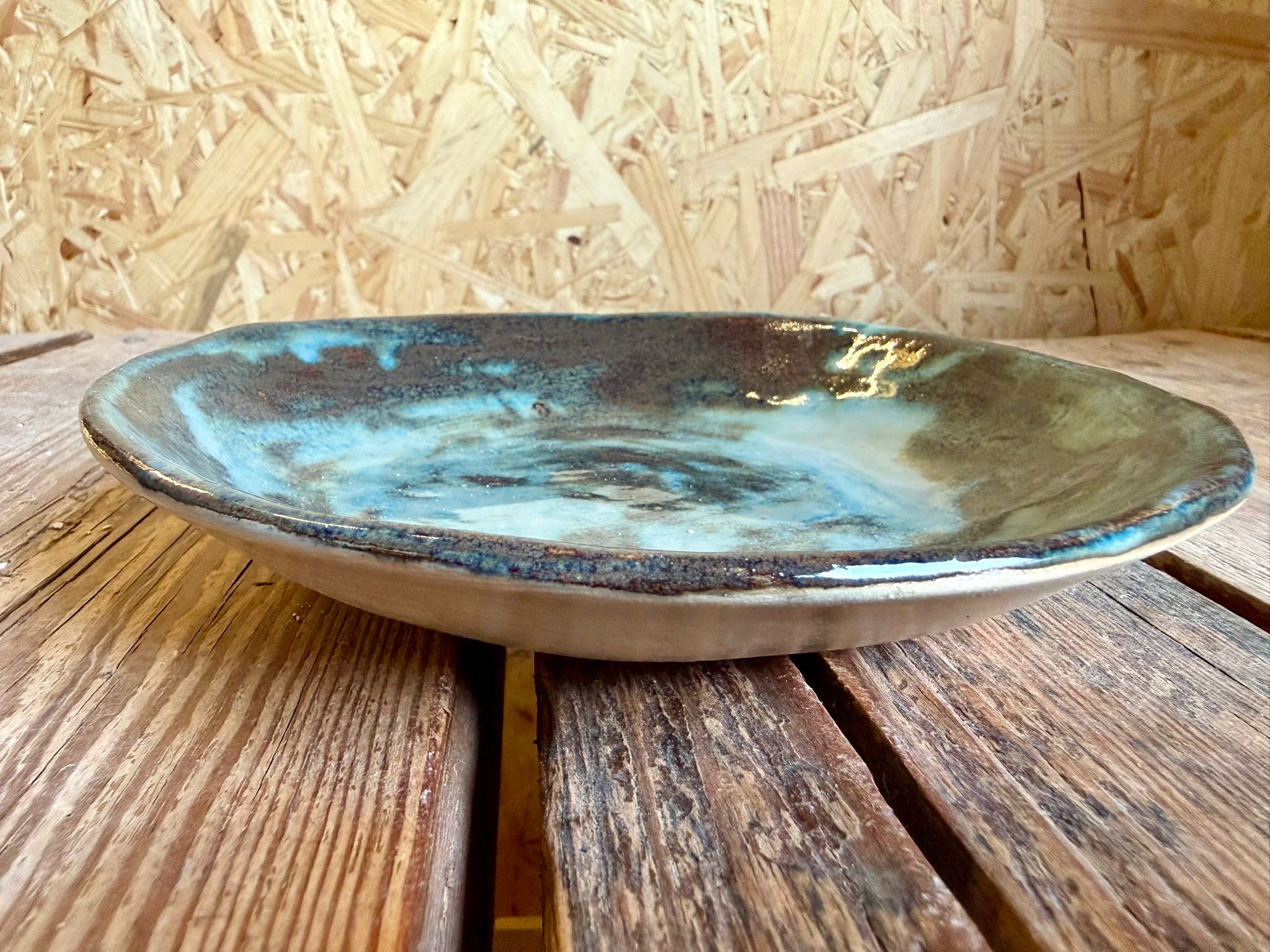 Ręcznie wykonany talerz głęboki ceramiczny z jasnej gliny, należący do tej samej spójnej kolekcji co talerze obiadowe i deserowe. Pokryty błyszczącym szkliwem efektowym w odcieniach granatu i brązów, które w naturalny sposób układa się na powierzchni ceramiki, nadając każdemu egzemplarzowi indywidualny charakter. Średnica 18 cm, wysokość: 3 cm.