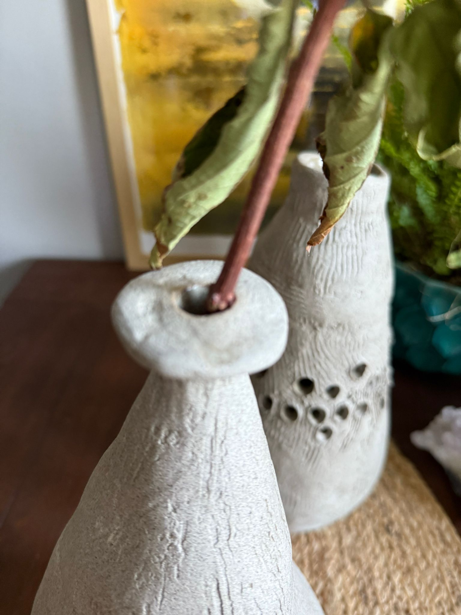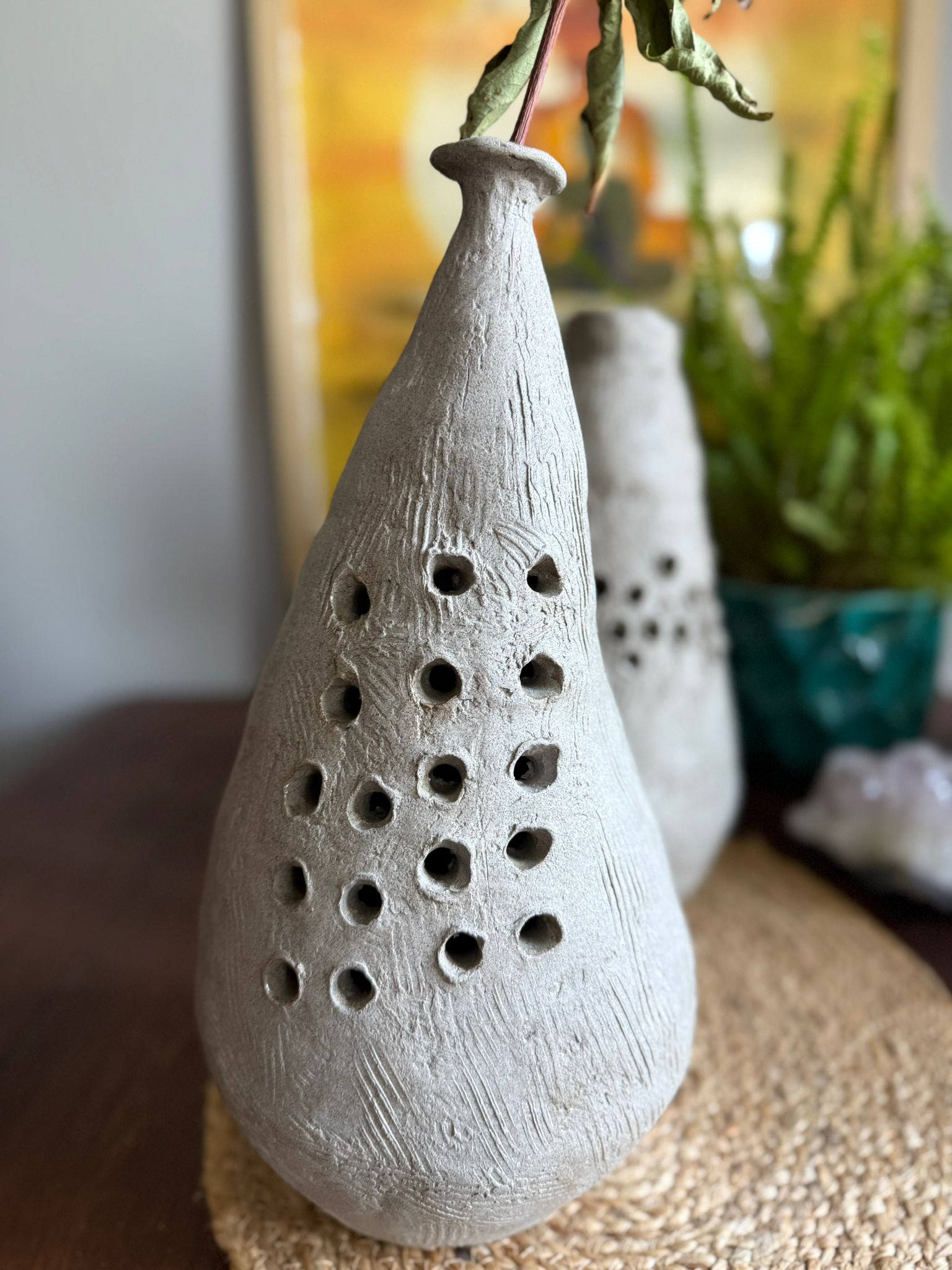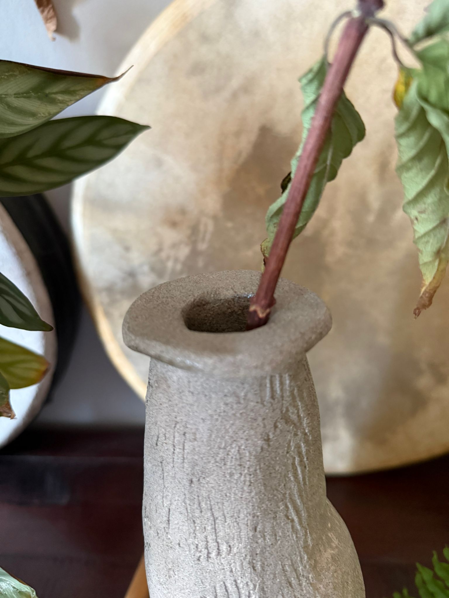 Minimalistyczny wazon wykonany z wysokiej jakości szarej, betonowej gliny. Jego powierzchnia zewnętrzna pozostaje surowa i strukturalna, co podkreśla naturalne piękno gliny. Wnętrze zostało pokryte transparentnym szkliwem, które nadaje subtelnego połysku i sprawia, że wazon jest w pełni użytkowy.
