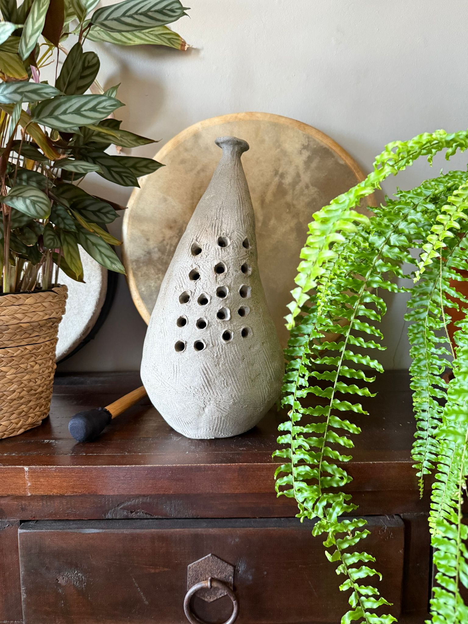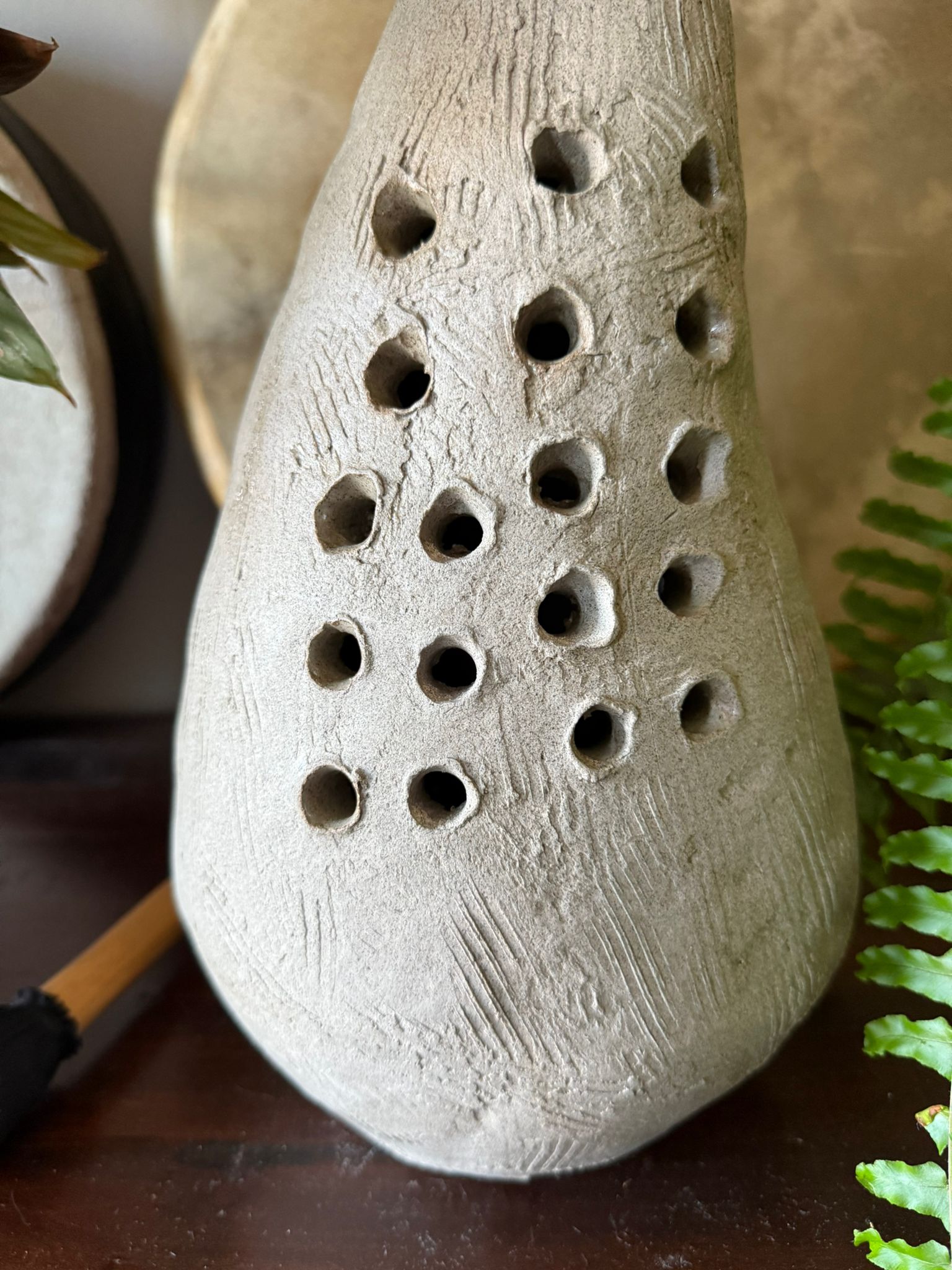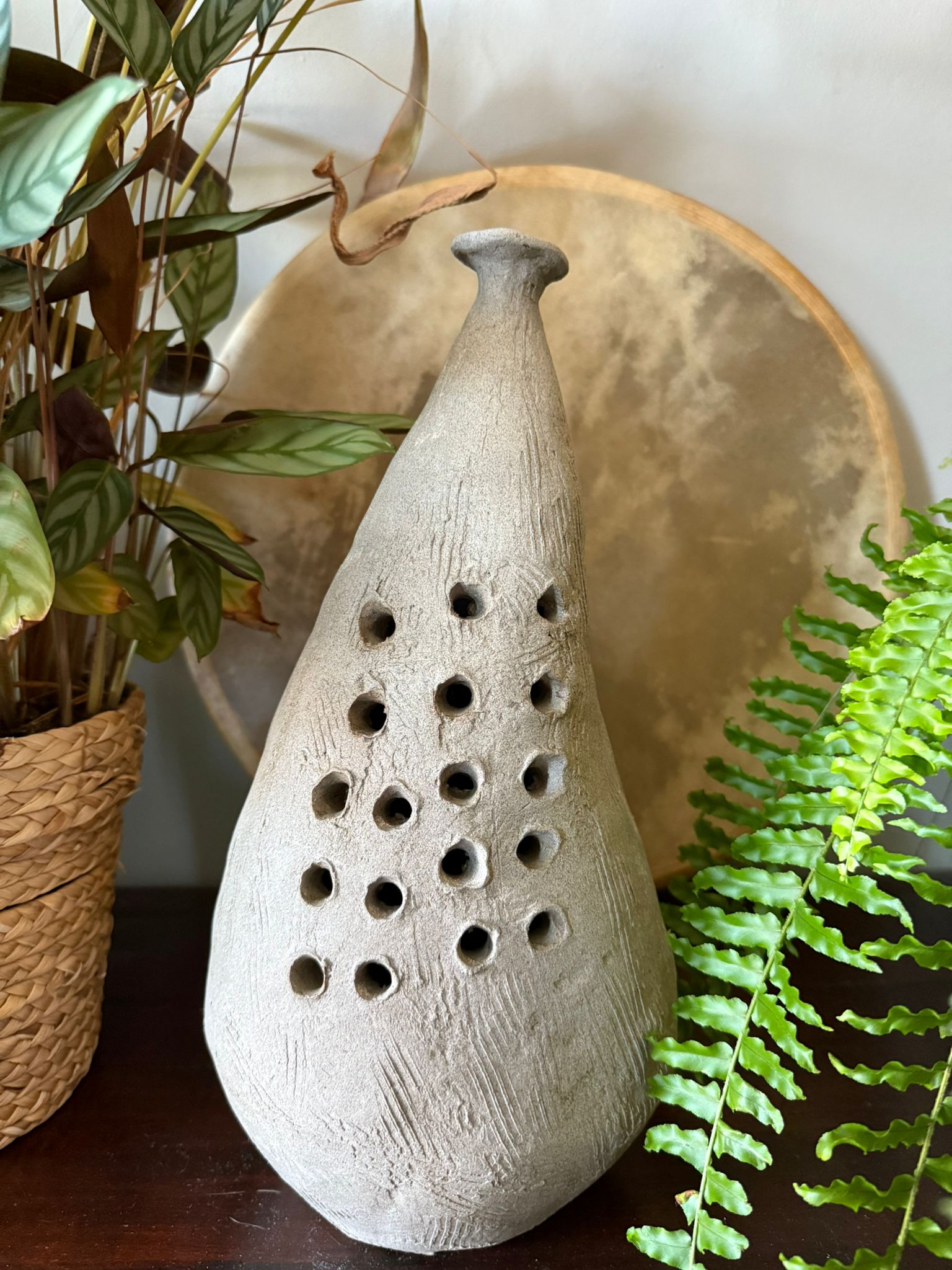 Minimalistyczny wazon wykonany z wysokiej jakości szarej, betonowej gliny. Jego powierzchnia zewnętrzna pozostaje surowa i strukturalna, co podkreśla naturalne piękno gliny. Wnętrze zostało pokryte transparentnym szkliwem, które nadaje subtelnego połysku i sprawia, że wazon jest w pełni użytkowy.