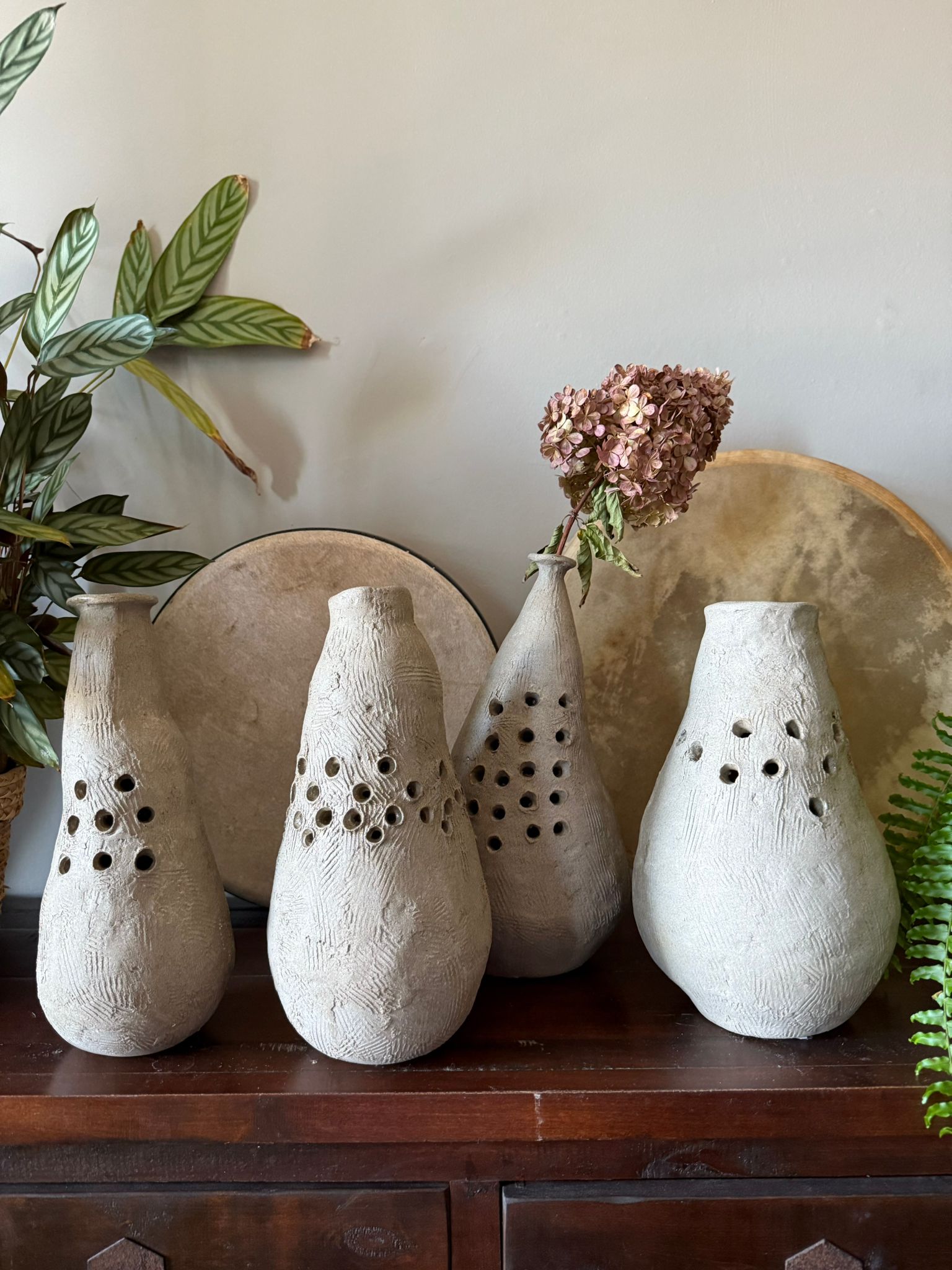 Dzięki prostej formie i unikatowej fakturze świetnie prezentuje się zarówno samodzielnie, jak i w zestawieniu z innymi wazonami stworzonymi w tej samej technice. To wyjątkowy element dekoracyjny, który wprowadzi do wnętrza harmonię i naturalny charakter.