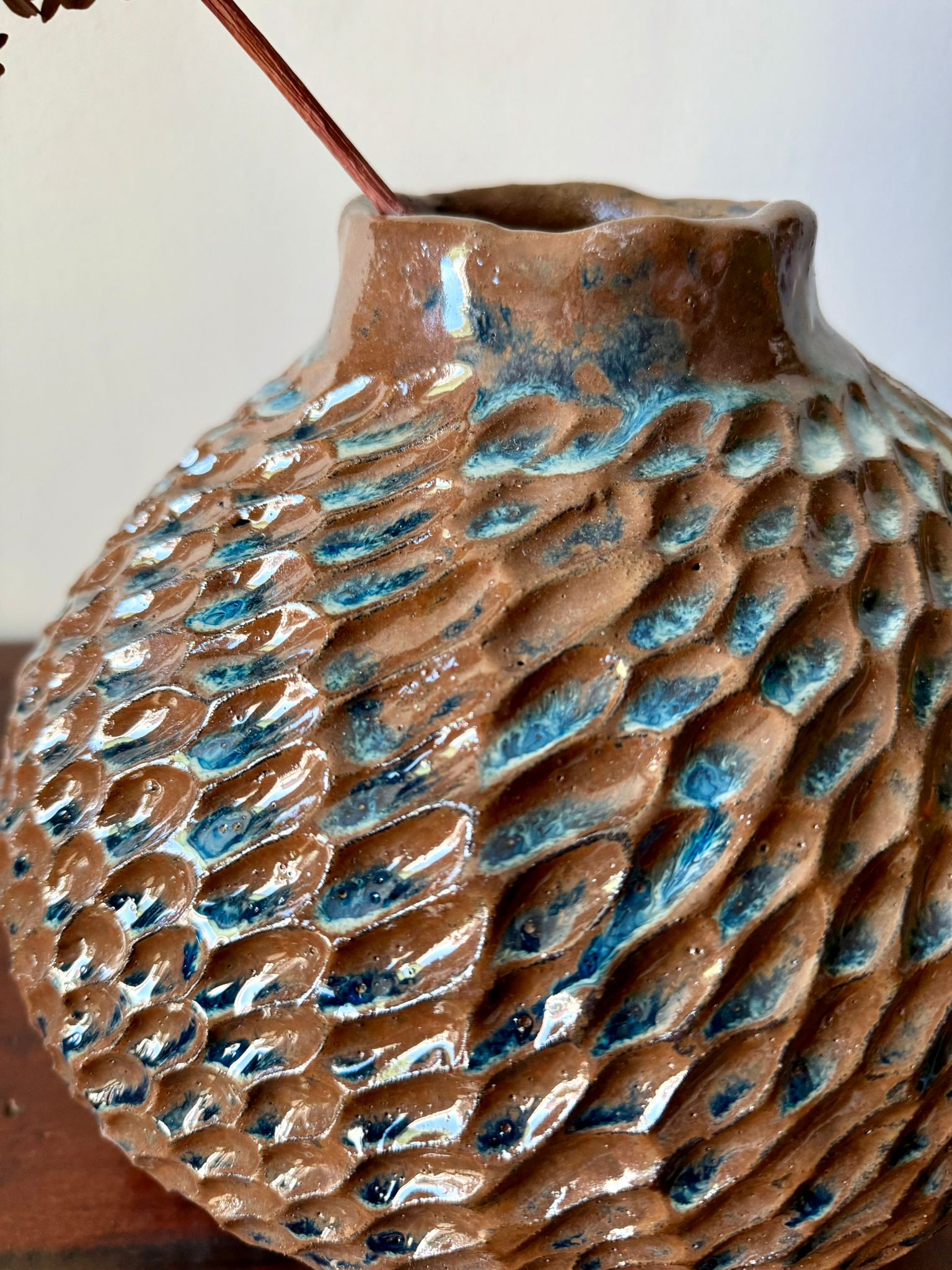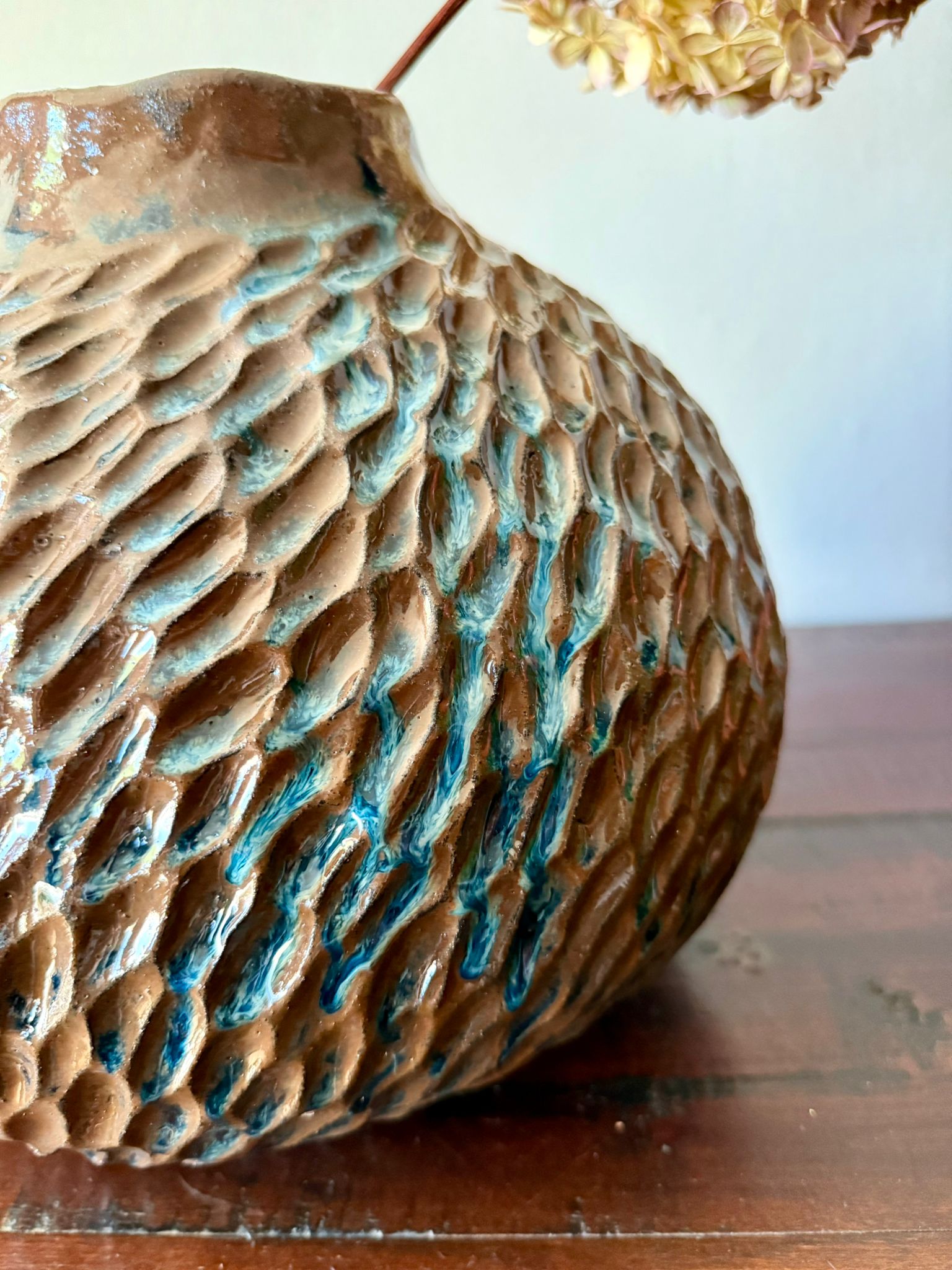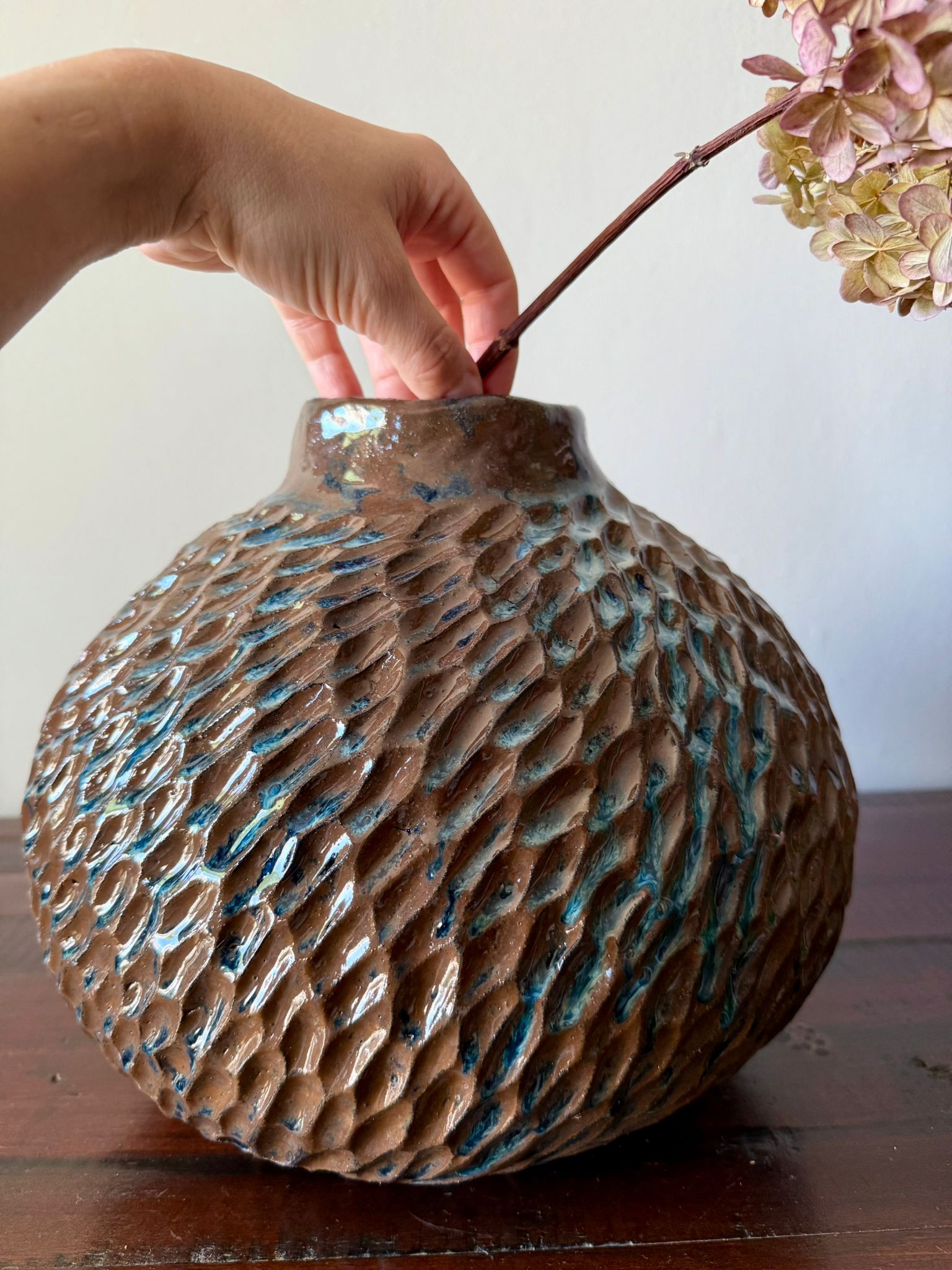 Ręcznie wykonany wazon ceramiczny z kolekcji Deep Lines to połączenie funkcjonalności i sztuki użytkowej. Jego duża, rzeźbiarska forma przyciąga wzrok i może pełnić rolę zarówno wazonu na kwiaty, jak i samodzielnej dekoracji wnętrza. Został wykonany z czerwonej gliny, a powierzchnię pokryto błyszczącym szkliwem w odcieniach niebieskiego, brązu i czerni, które tworzą unikatowy, głęboki wzór – charakterystyczny dla tej kolekcji.
