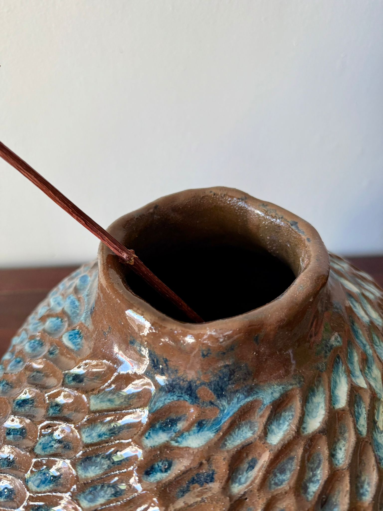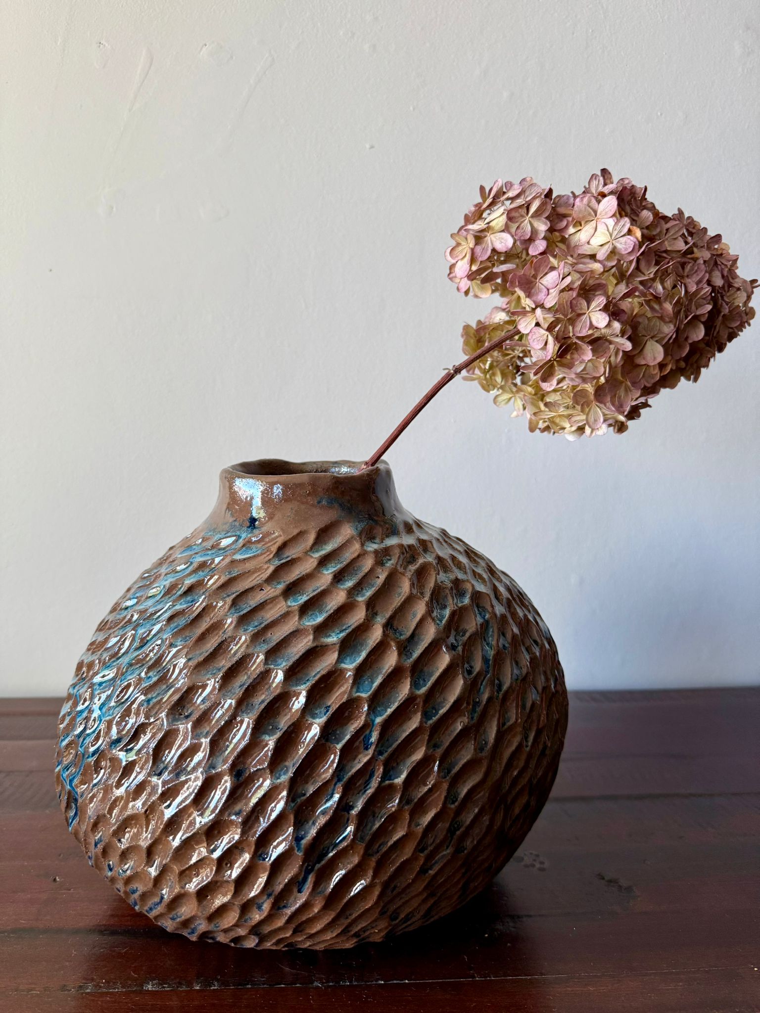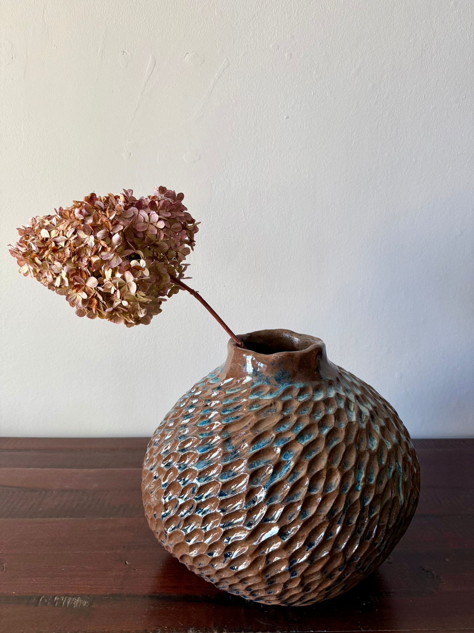 Ręcznie wykonany wazon ceramiczny z kolekcji Deep Lines to połączenie funkcjonalności i sztuki użytkowej. Jego duża, rzeźbiarska forma przyciąga wzrok i może pełnić rolę zarówno wazonu na kwiaty, jak i samodzielnej dekoracji wnętrza. Został wykonany z czerwonej gliny, a powierzchnię pokryto błyszczącym szkliwem w odcieniach niebieskiego, brązu i czerni, które tworzą unikatowy, głęboki wzór – charakterystyczny dla tej kolekcji.