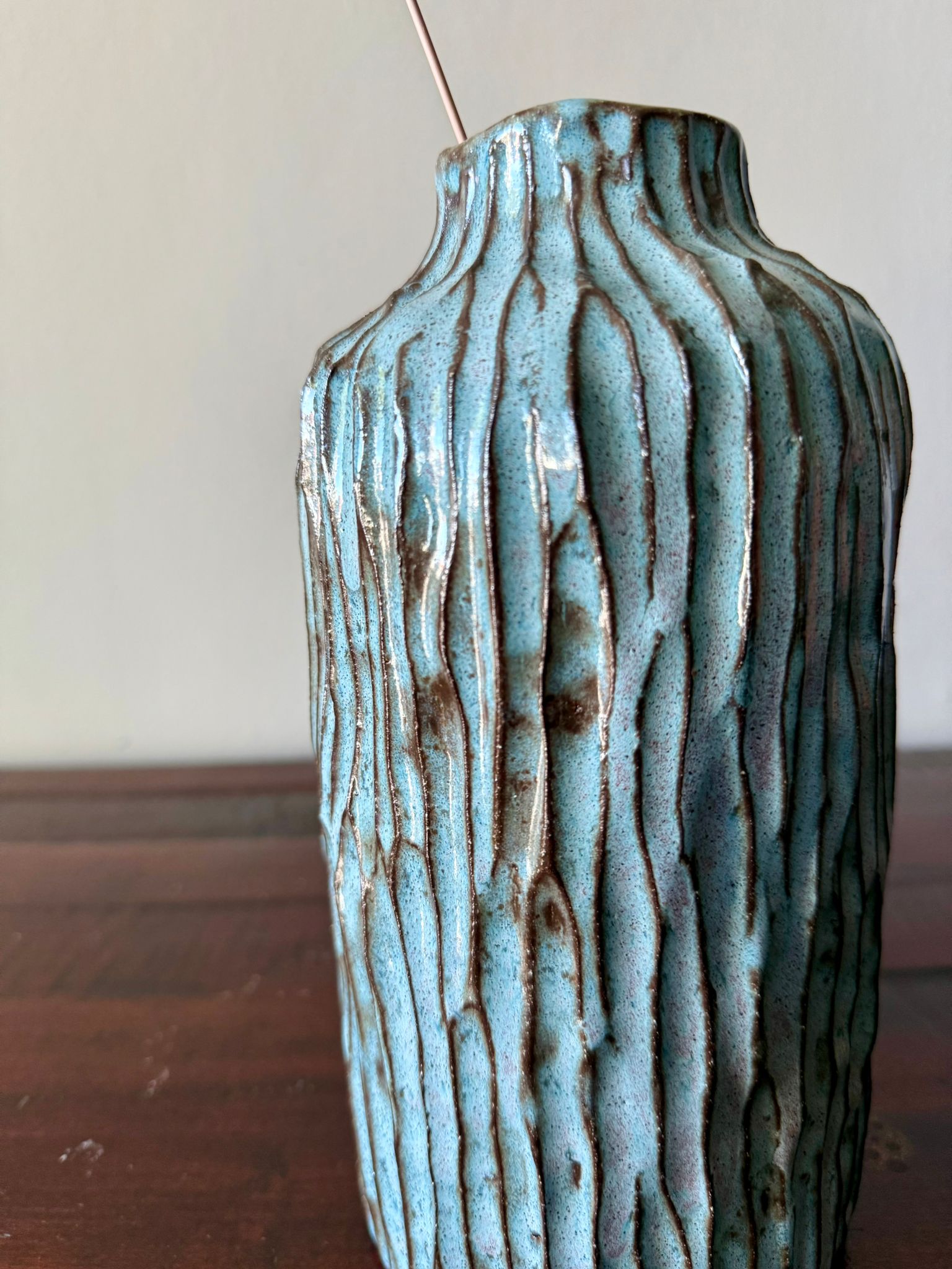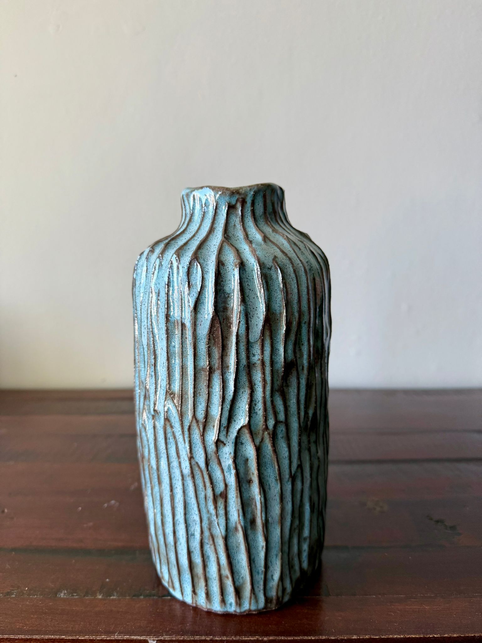 Ten wazon ceramiczny z kolekcji Deep Lines to wyjątkowe połączenie naturalnej formy i artystycznego detalu. Wykonany ręcznie z czerwonej gliny, posiada ozdobne rzeźbienia na zewnętrznej powierzchni, które podkreślają jego unikatowy charakter i surowe piękno materiału. Całość pokryta została błyszczącym szkliwem w odcieniach głębokiego niebieskiego z czarnymi przebarwieniami, nadającymi mu efekt głębi i niepowtarzalności.