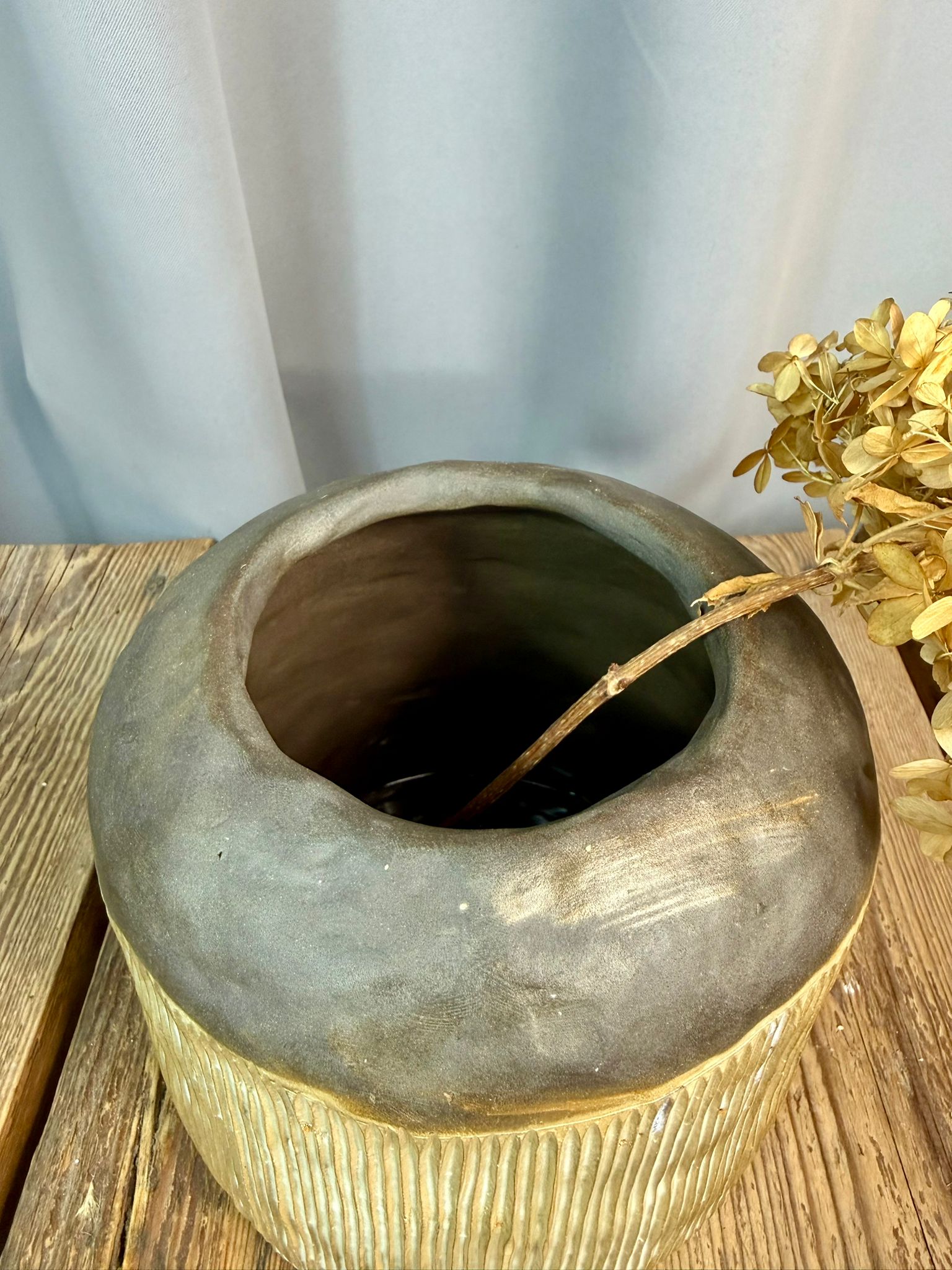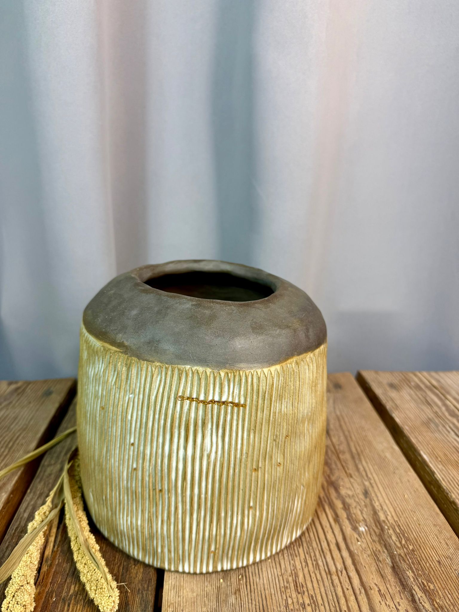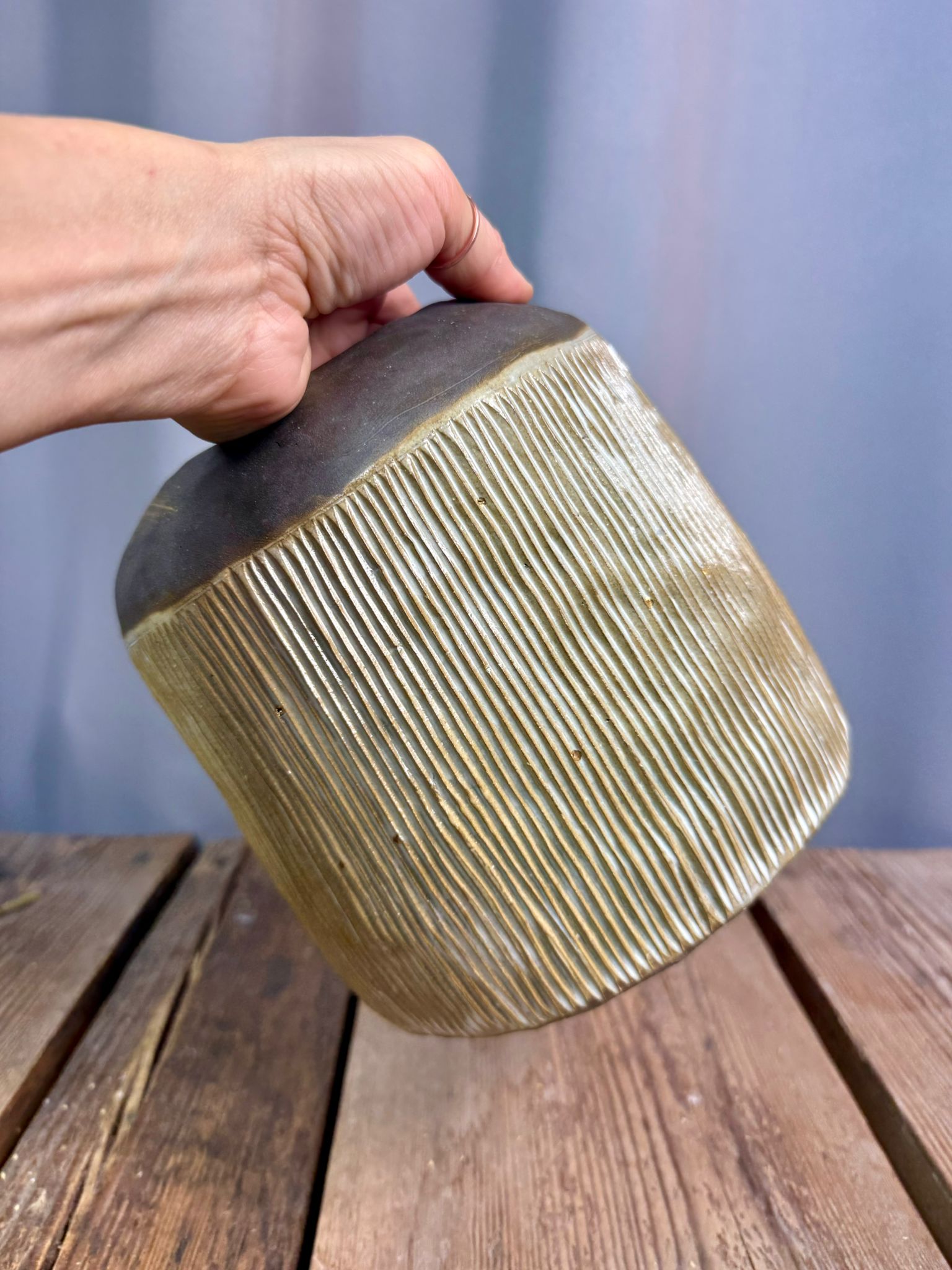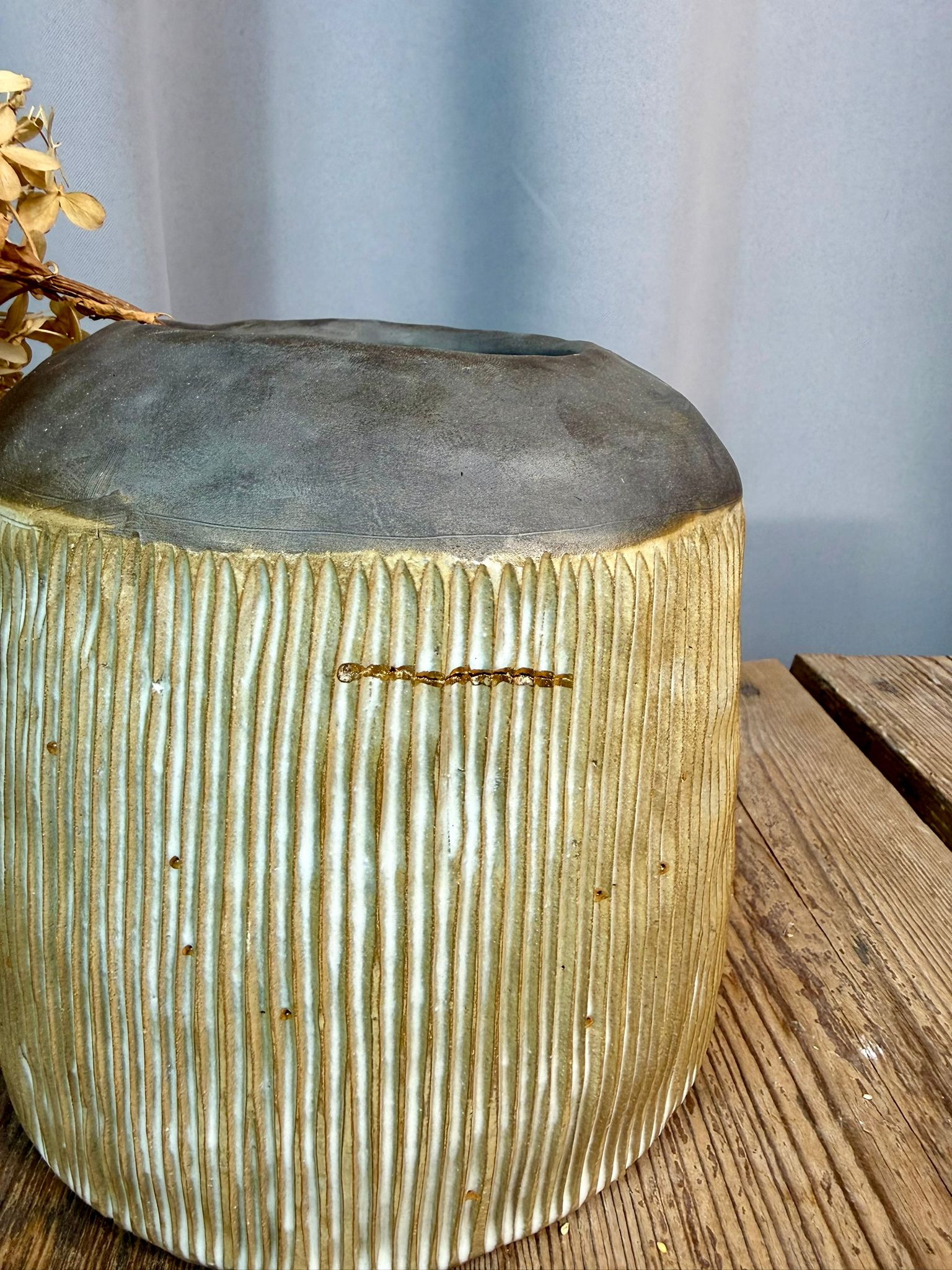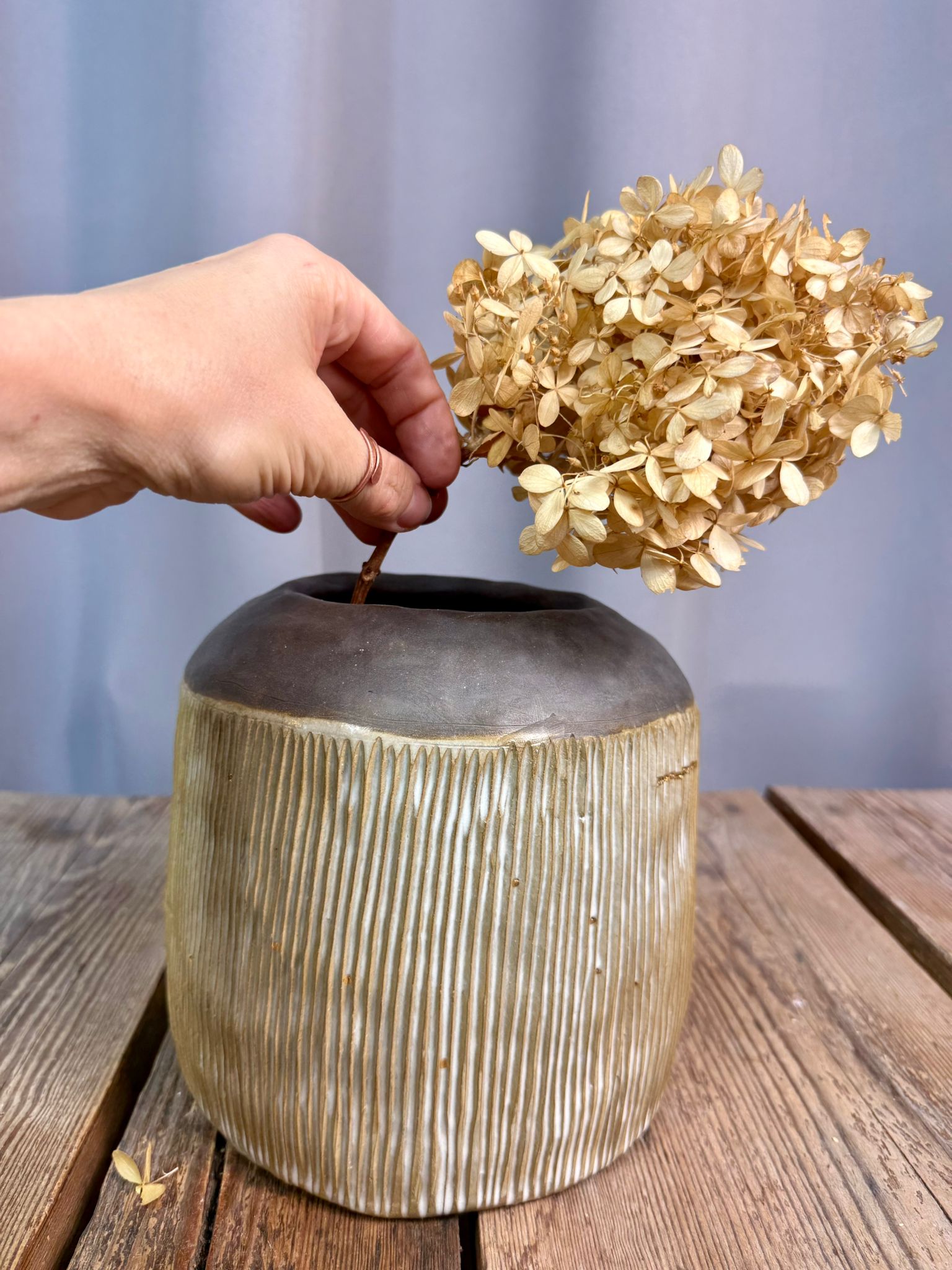 Ręcznie wykonany wazon ceramiczny z kolekcji Deep Lines powstał z szarej gliny i został w całości ręcznie rzeźbiony. Charakterystyczne, głębokie linie tworzą wyrazistą strukturę, nadając formie organiczny, a jednocześnie elegancki charakter.