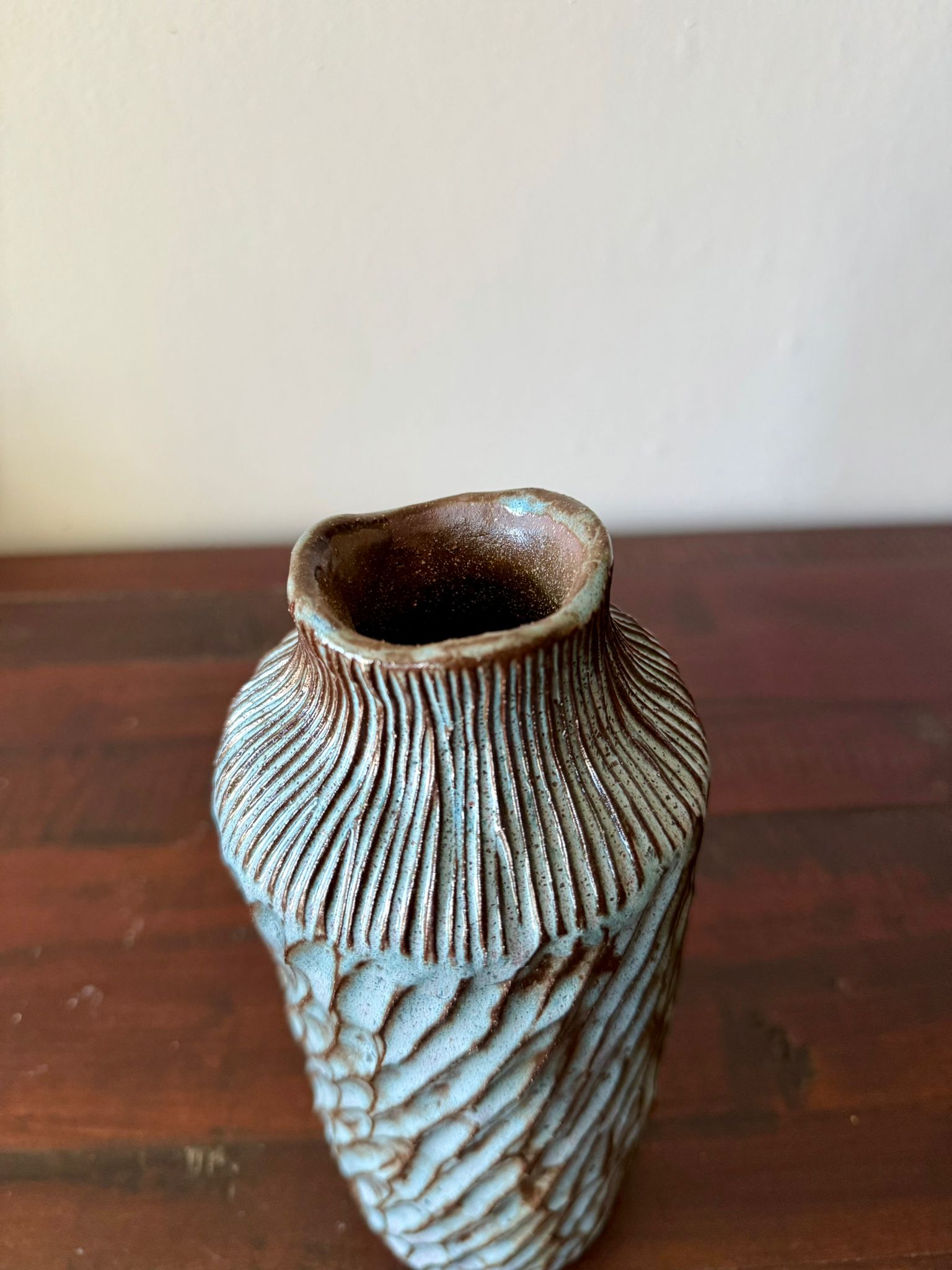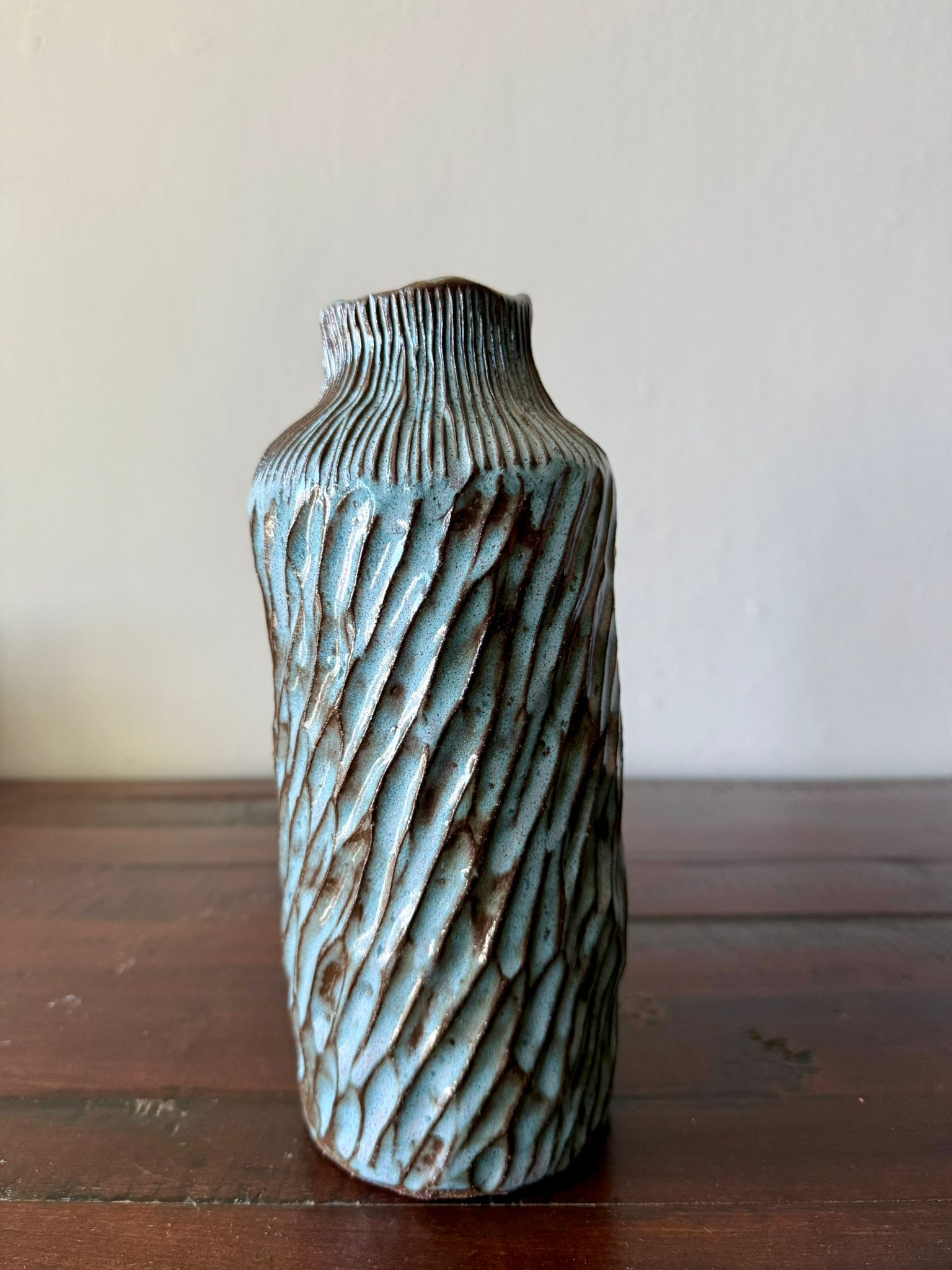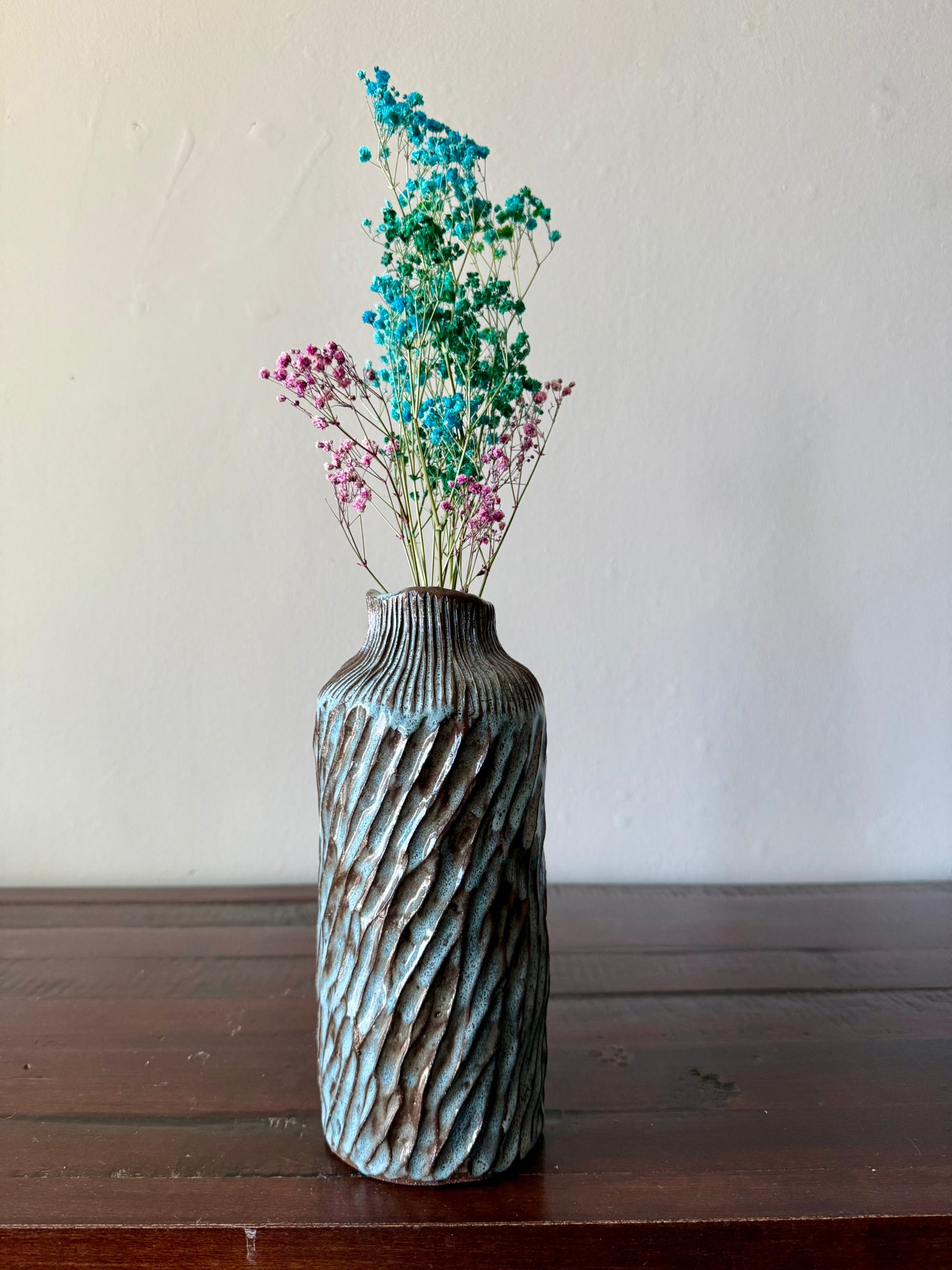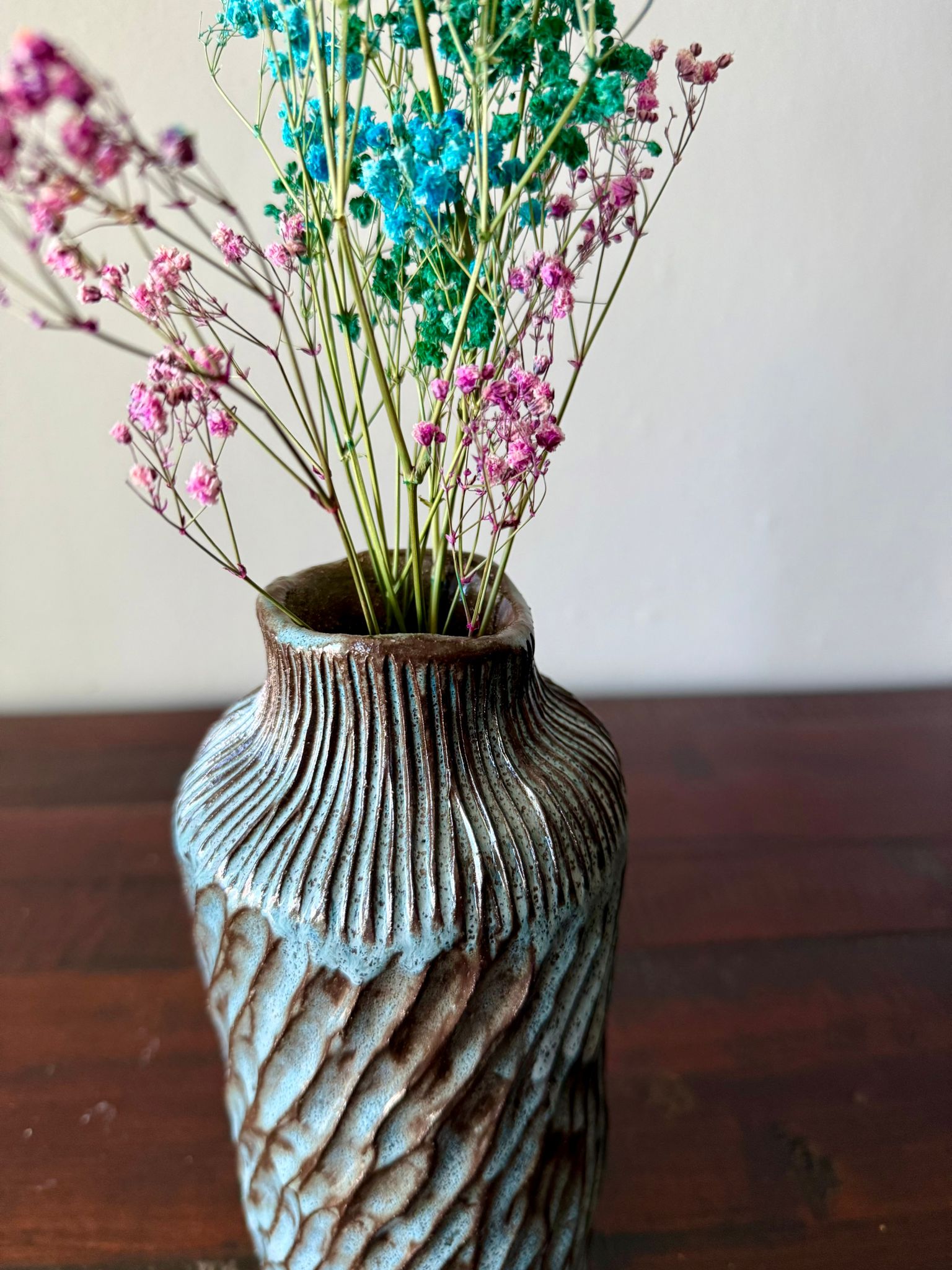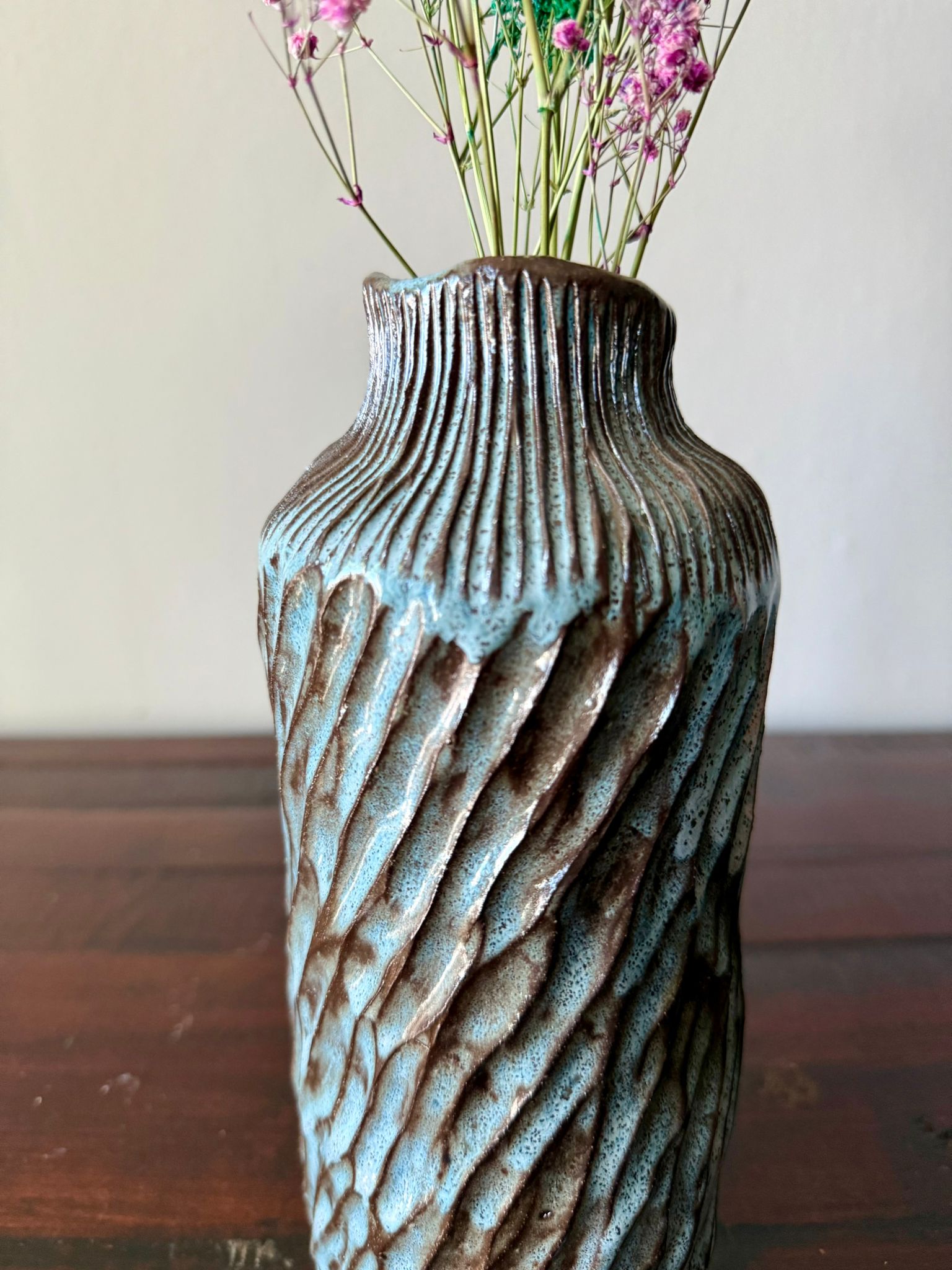 Wyjątkowy wazon z kolekcji Deep Lines to połączenie surowej formy i eleganckiego wykończenia. Został ręcznie wykonany z czerwonej gliny, a jego powierzchnię ozdobiono rzeźbieniami, które podkreślają naturalną strukturę materiału. Pokrycie błyszczącym szkliwem w odcieniach głębokiego niebieskiego z czarnymi przebarwieniami nadaje mu niepowtarzalny charakter i artystyczną głębię.