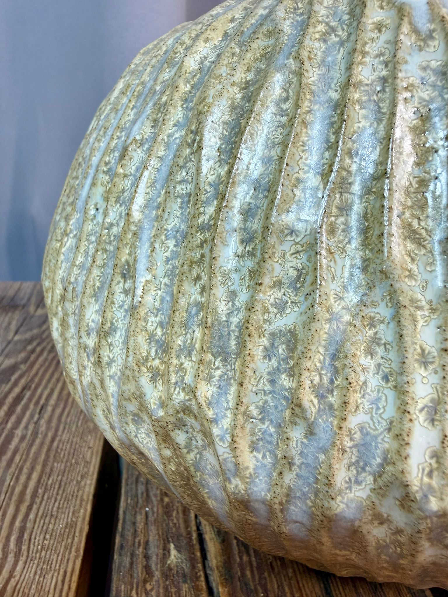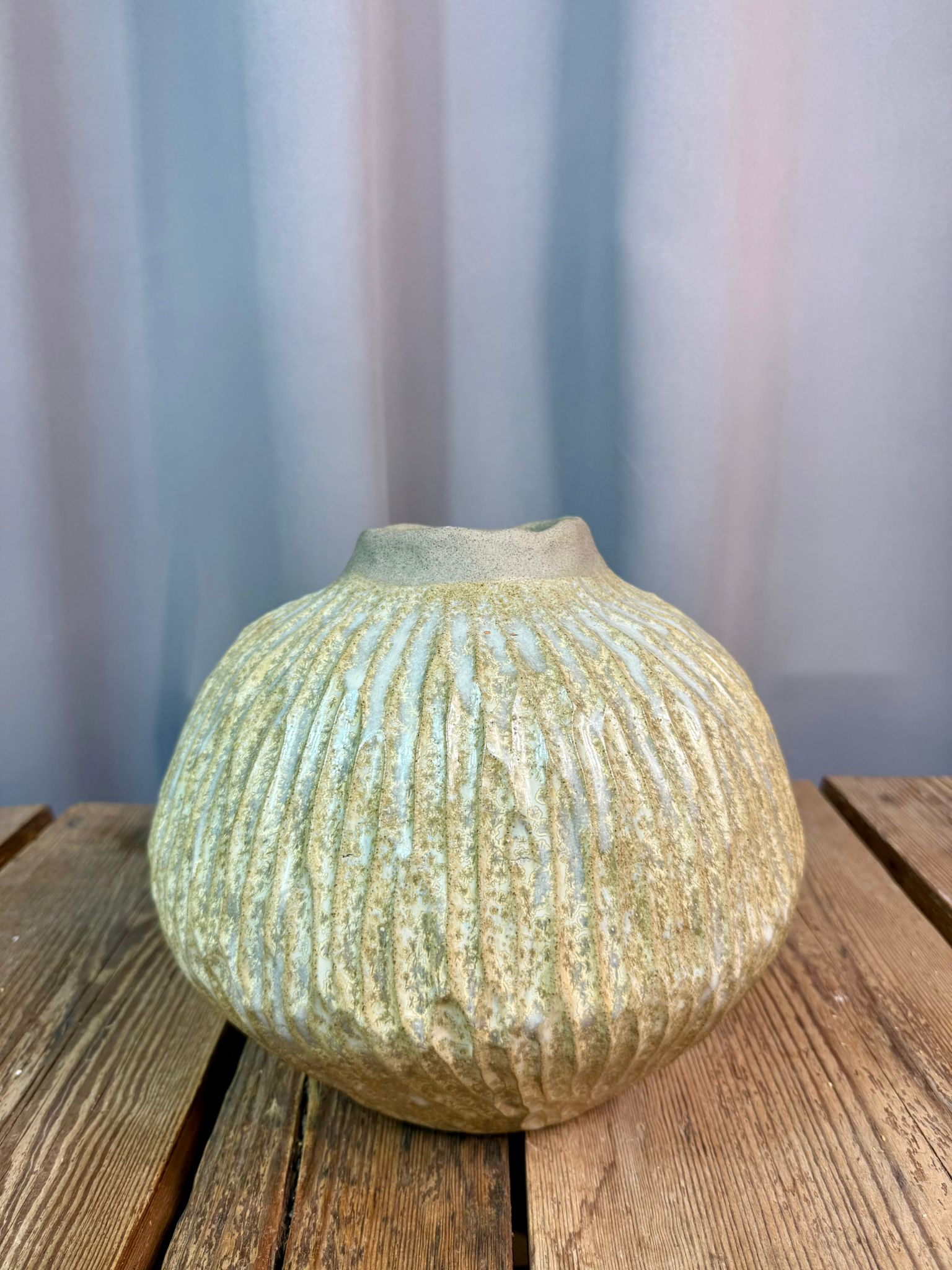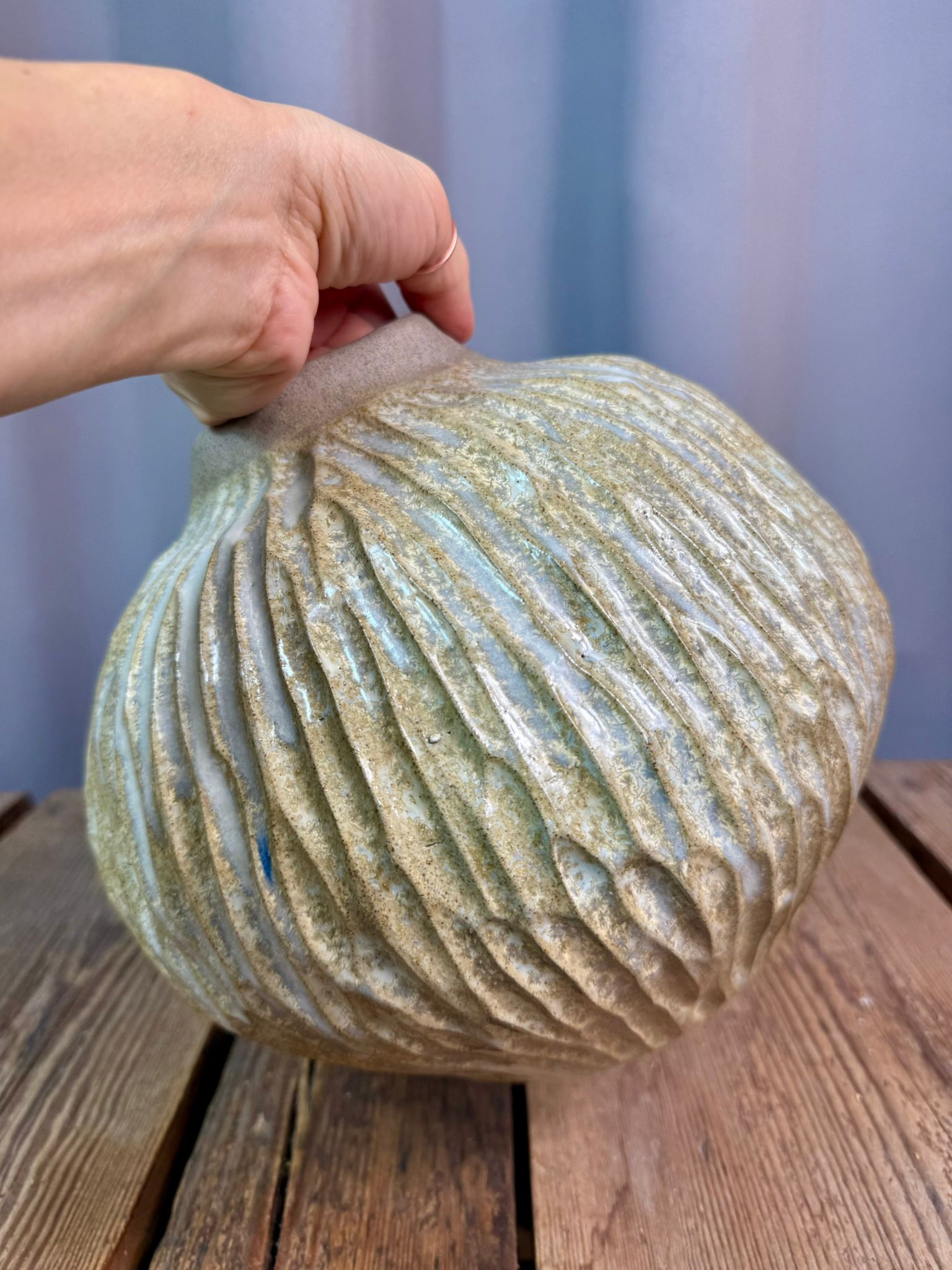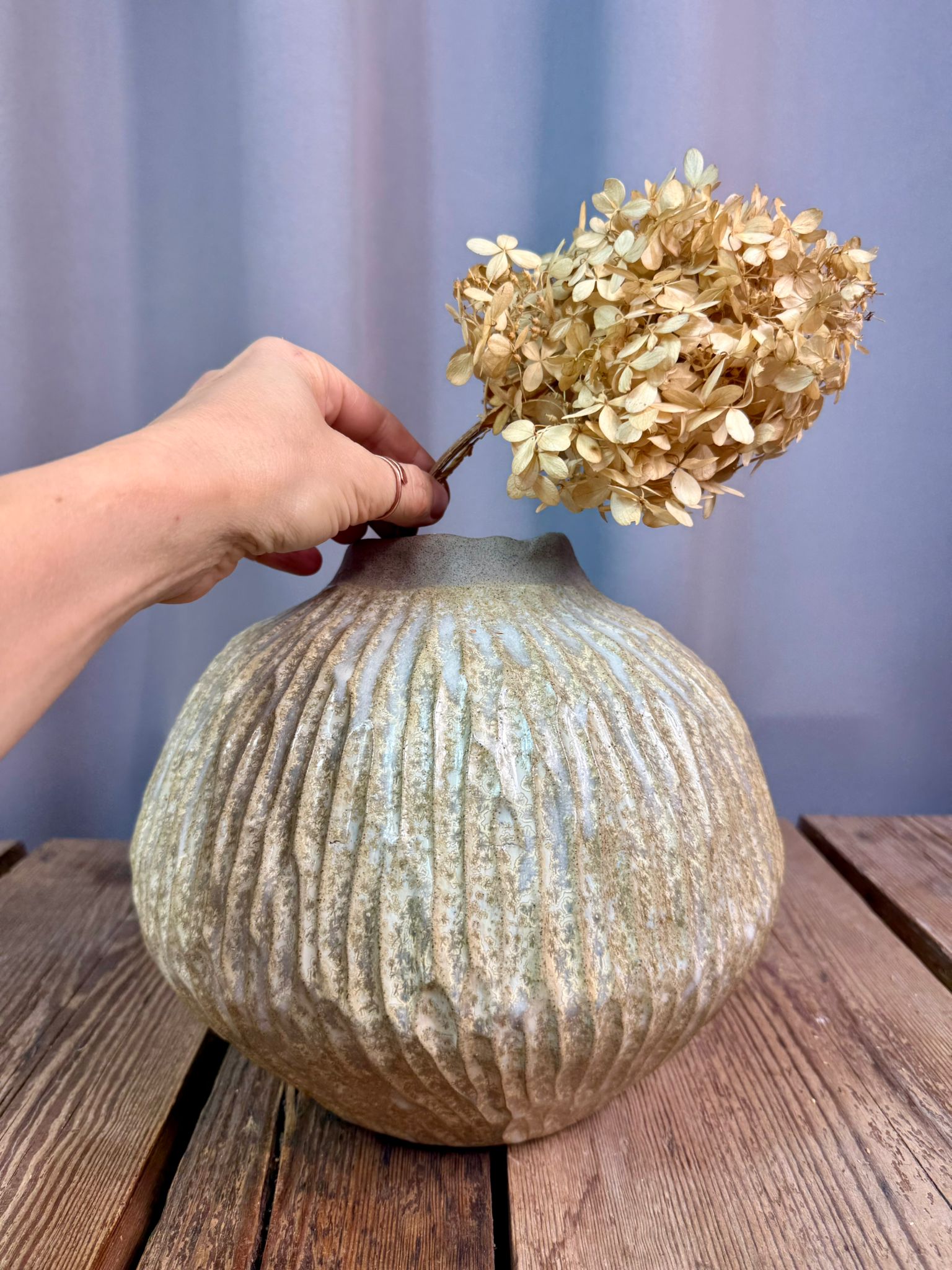 Ręcznie wykonany wazon ceramiczny z kolekcji Deep Lines wyróżnia się pękatym, miękkim kształtem oraz w całości ręcznie rzeźbioną powierzchnią, charakterystyczną dla tej serii. Powstał z szarej gliny, która stanowi doskonałą bazę dla wyrazistej struktury i efektowego wykończenia.