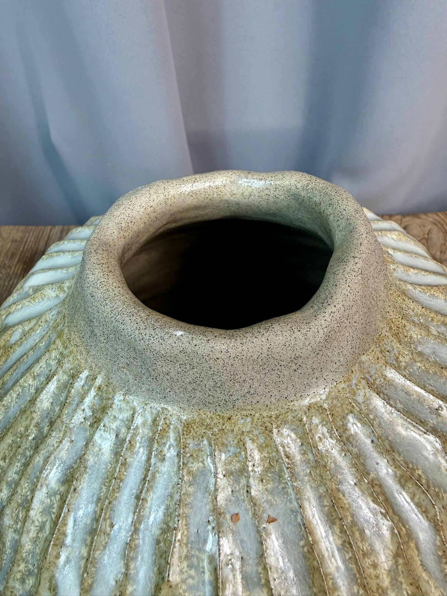 To unikatowy wazon ceramiczny — dostępny jest tylko jeden egzemplarz. Każdy etap jego powstawania został wykonany ręcznie, co czyni go niepowtarzalnym przykładem ceramiki artystycznej handmade.