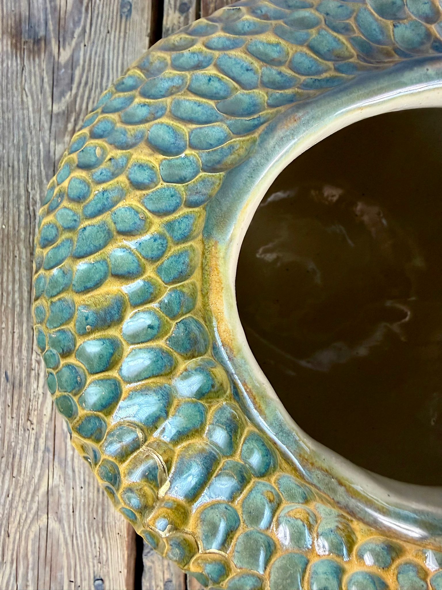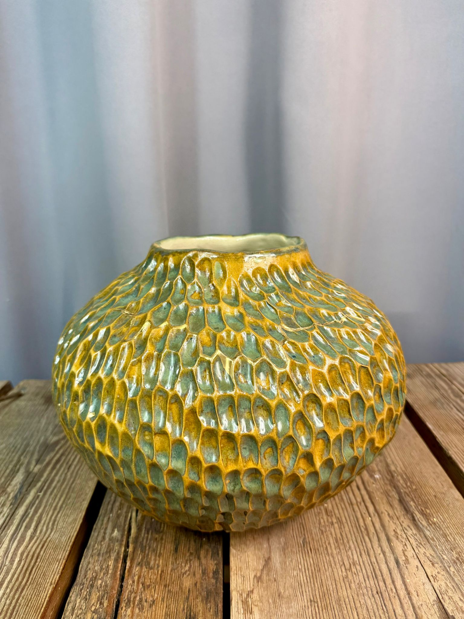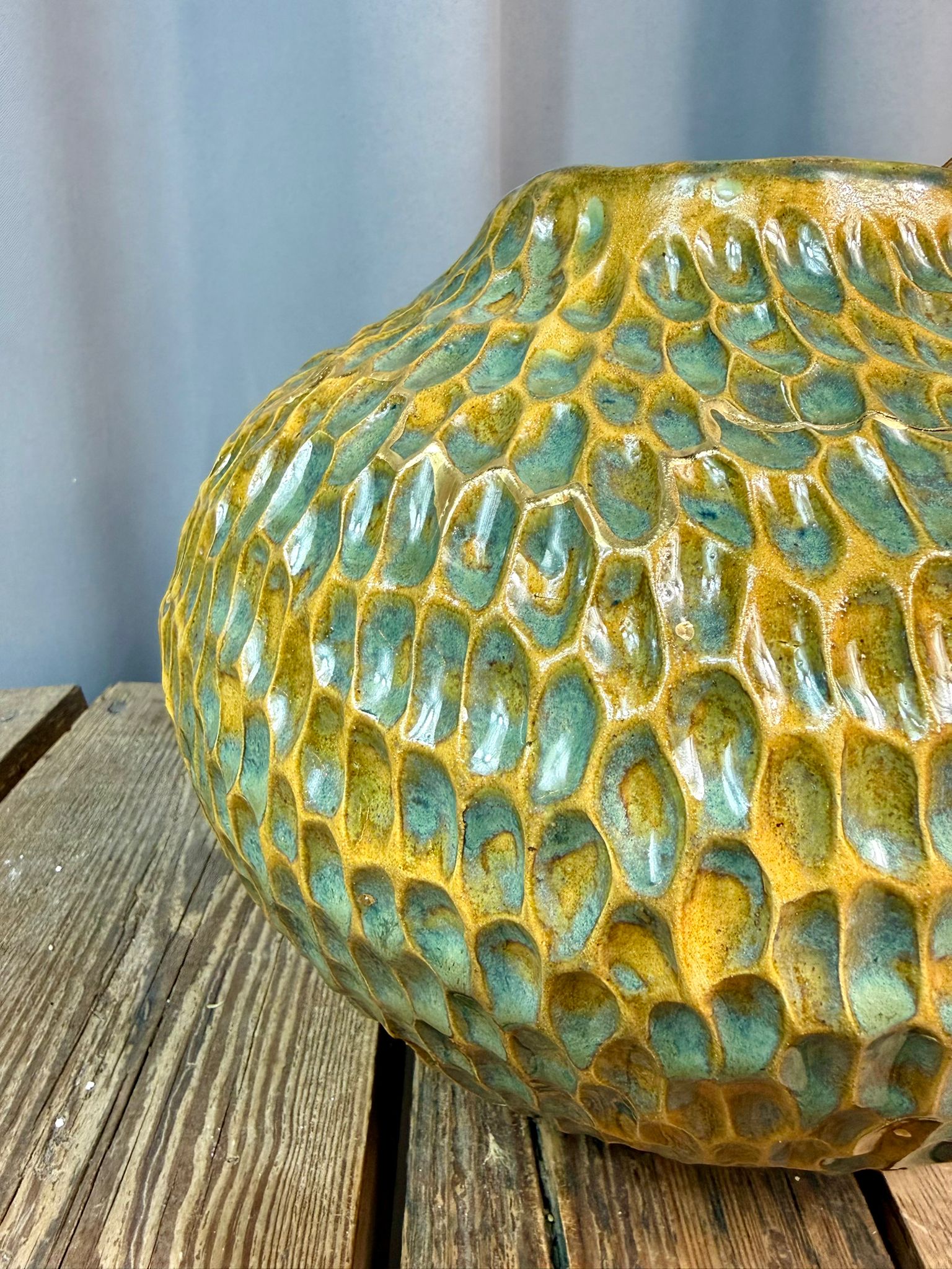 Zewnętrzna powierzchnia wazonu została pokryta błyszczącym szkliwem w odcieniach brązu i zieleni, tworząc efektowne przejścia kolorystyczne inspirowane naturą. Dodatkowym, szlachetnym akcentem jest zdobienie prawdziwym złotem, które subtelnie podkreśla wybrane fragmenty rzeźbień i nadaje całości elegancji oraz kolekcjonerskiego charakteru.