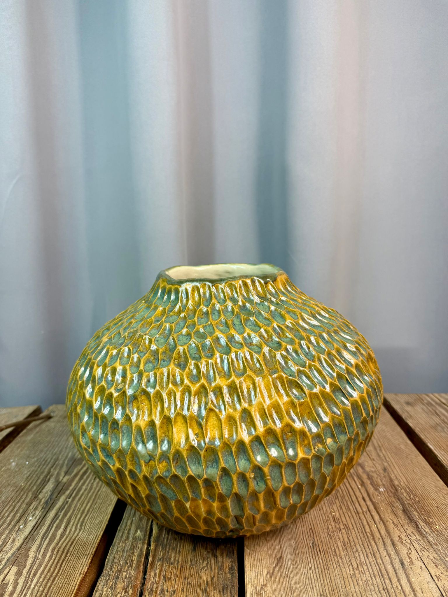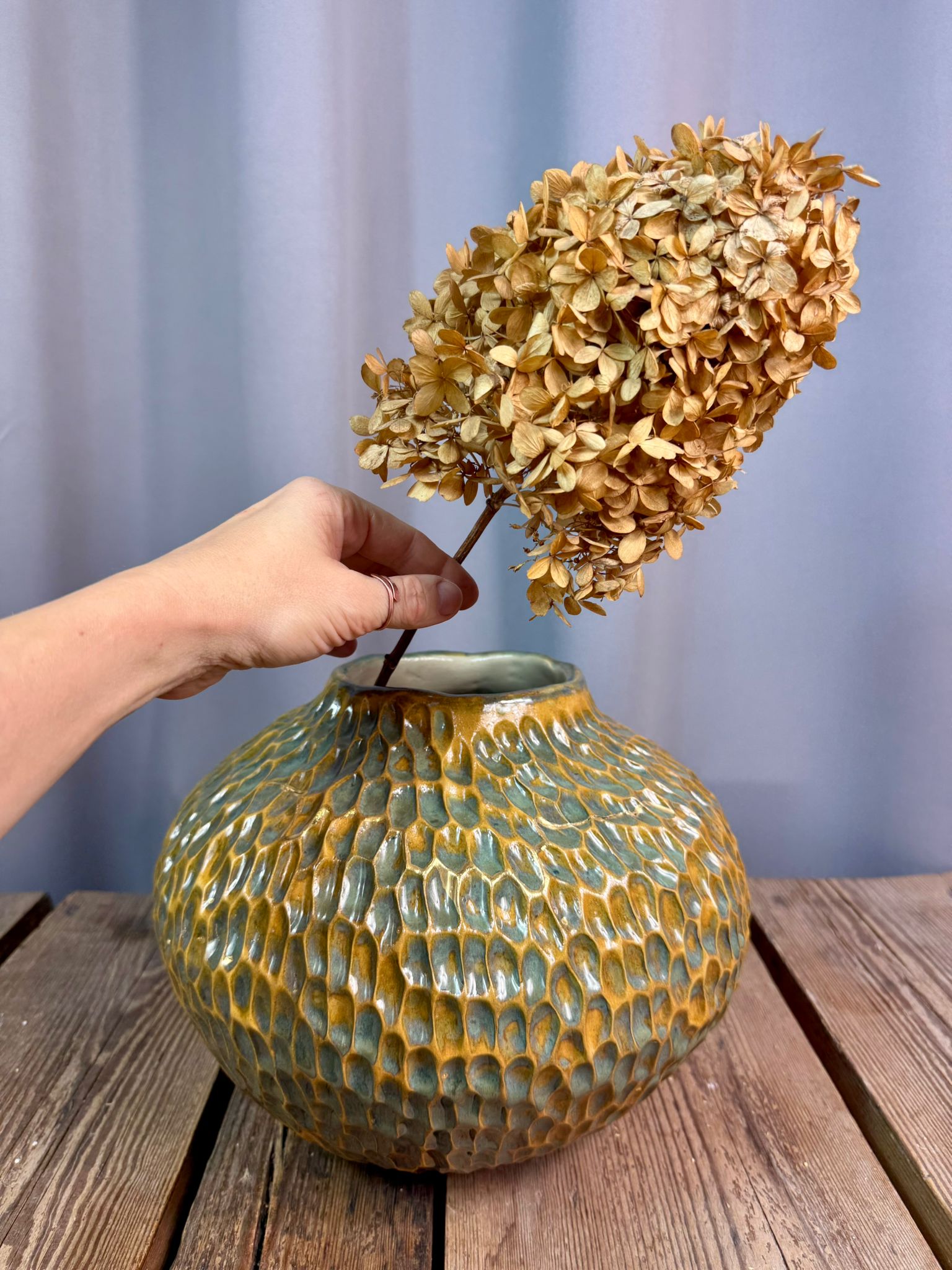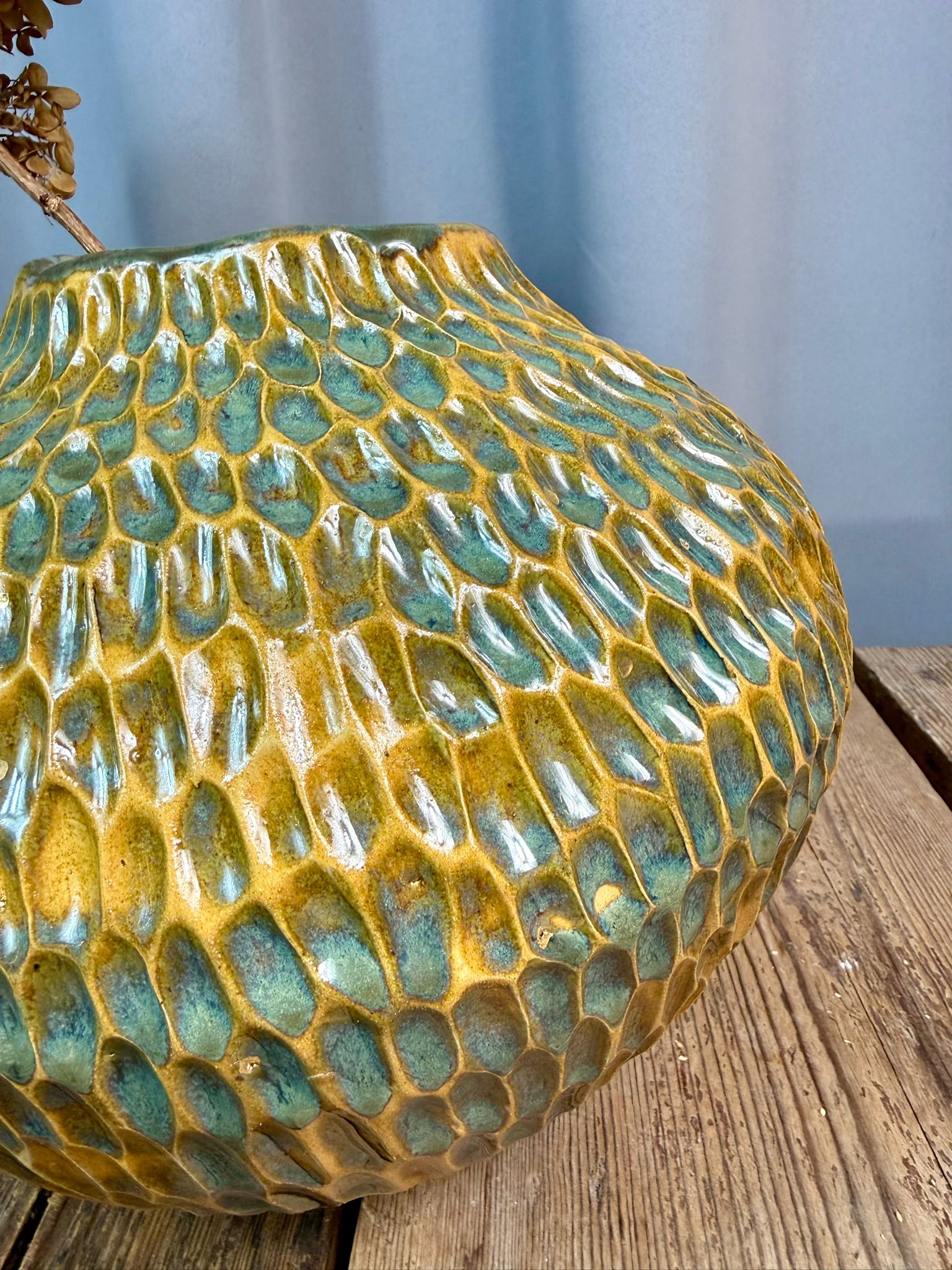 Ręcznie wykonany wazon ceramiczny z kolekcji Deep Lines wyróżnia się pękatą, rzeźbiarską formą oraz w całości ręcznie rzeźbioną powierzchnią, która nadaje mu wyrazisty, organiczny charakter. Obiekt powstał z jasnej gliny, stanowiącej doskonałe tło dla głębokich linii i bogatego wykończenia.