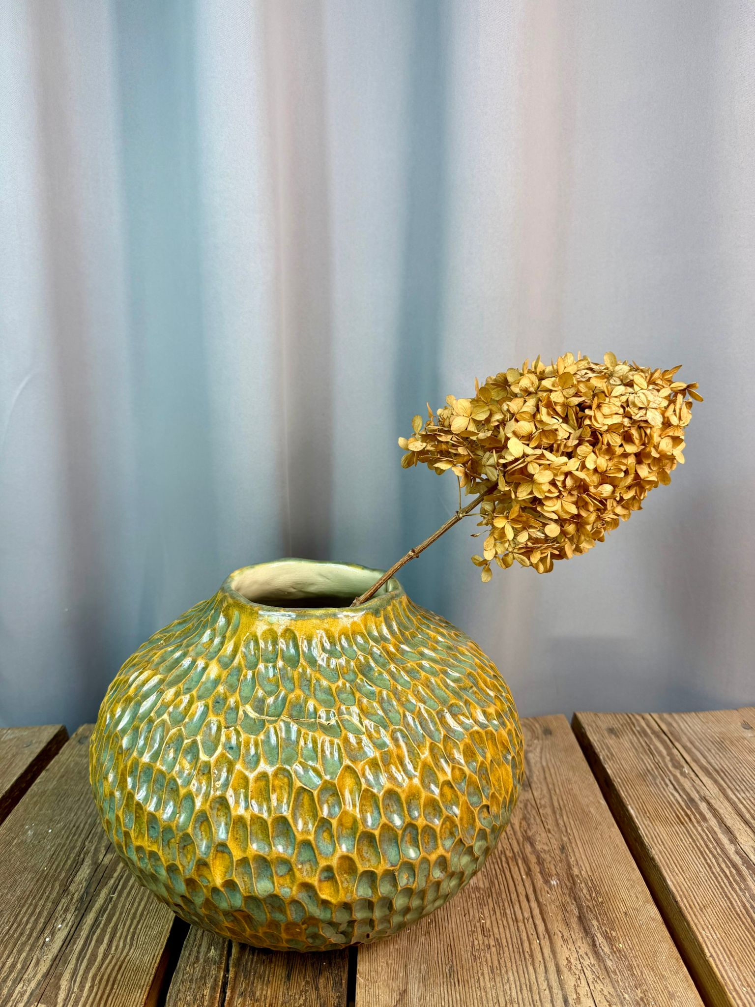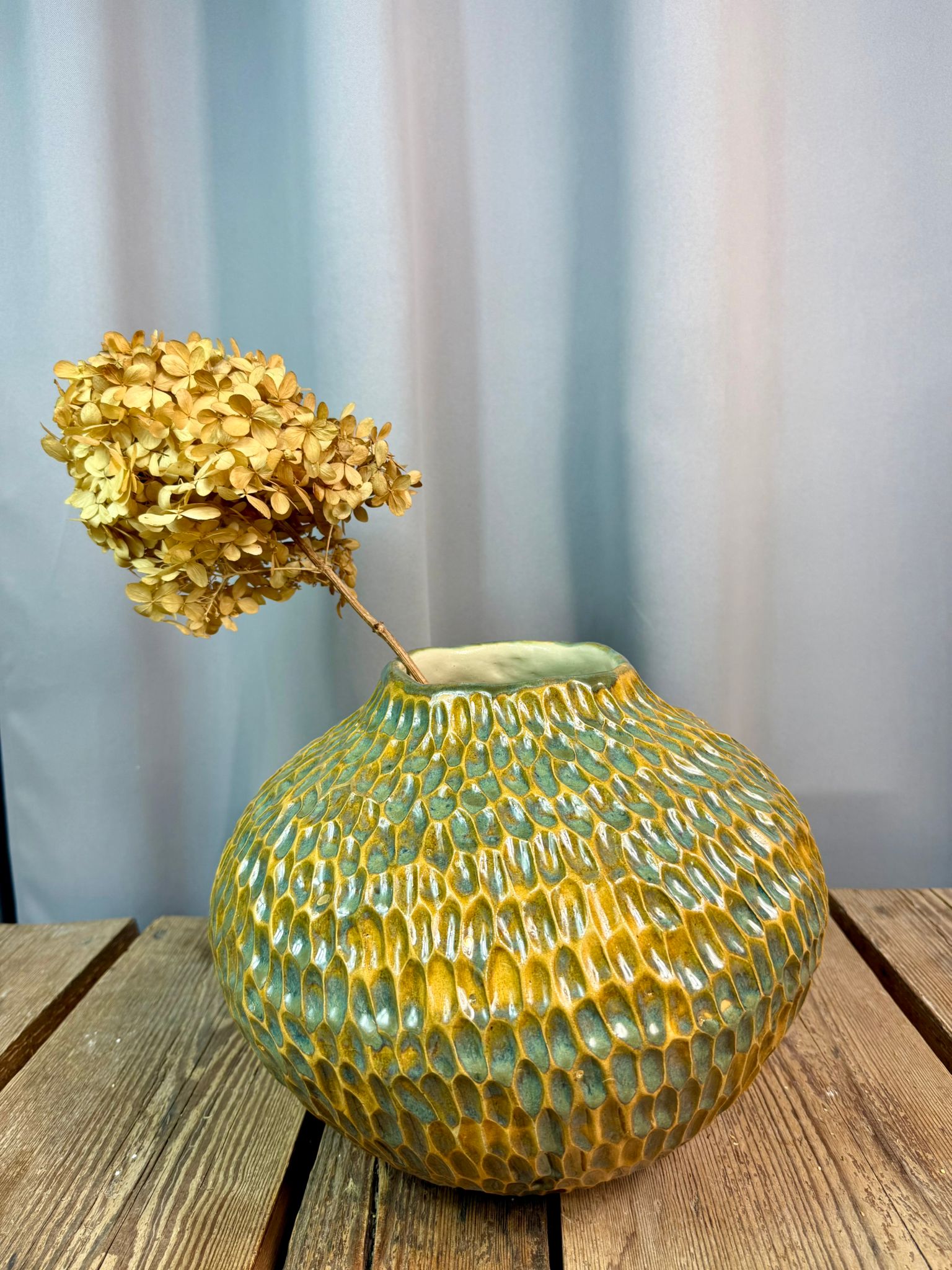 Dzięki swojej masywnej, pękatej formie wazon doskonale sprawdzi się jako dominujący element aranżacji wnętrza. Idealnie wpisze się w wnętrza nowoczesne, boho, organic modern, loftowe, a także przestrzenie inspirowane naturą i sztuką użytkową. Może funkcjonować jako samodzielna rzeźba ceramiczna lub jako wazon na większe kompozycje kwiatowe.