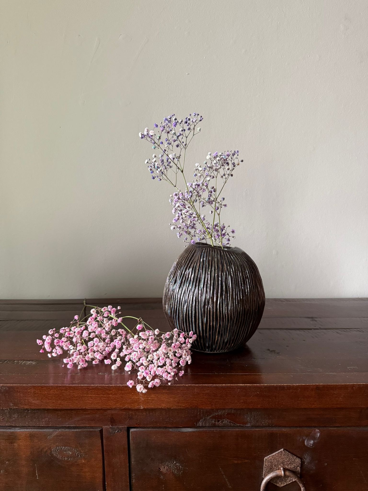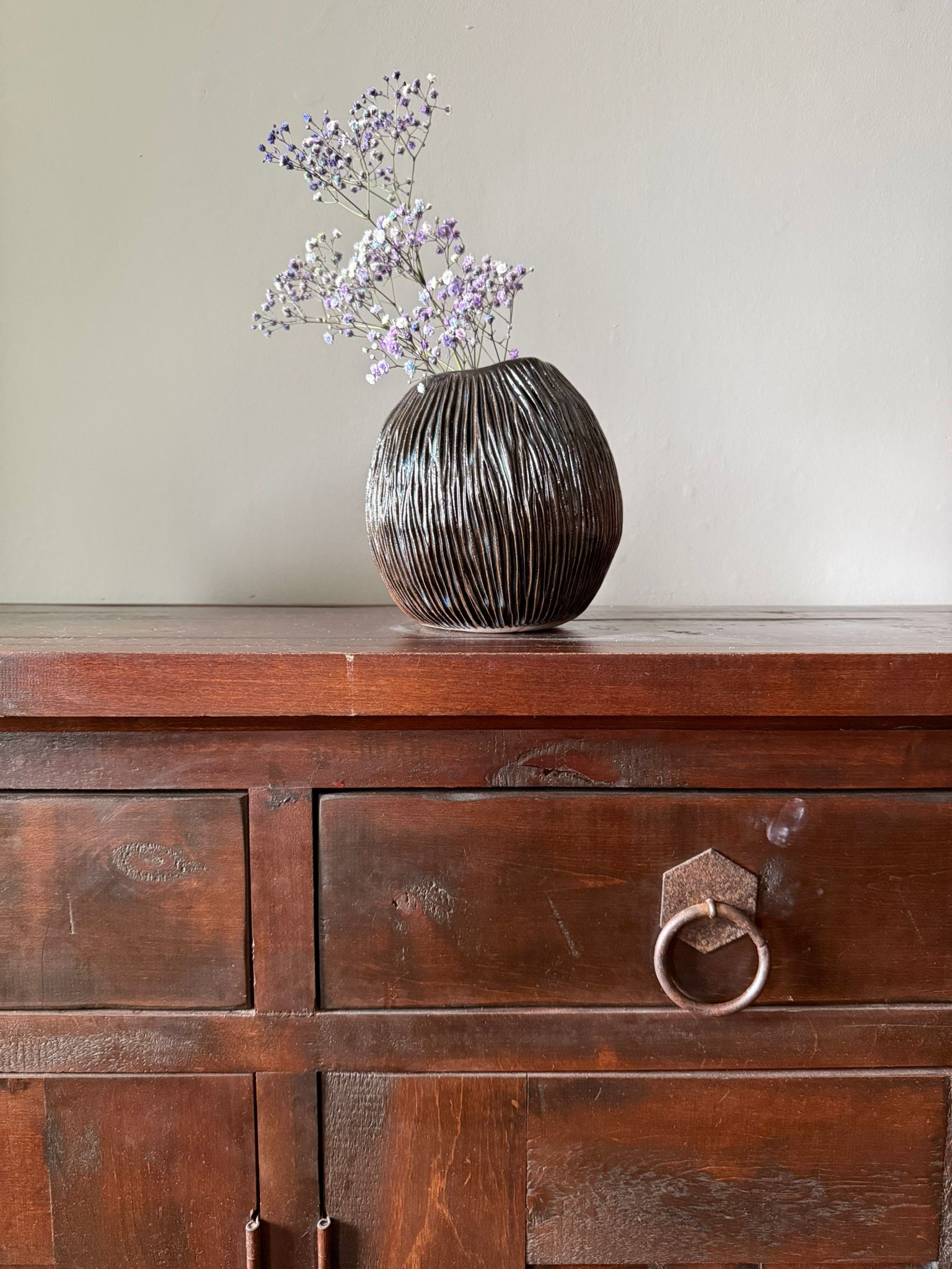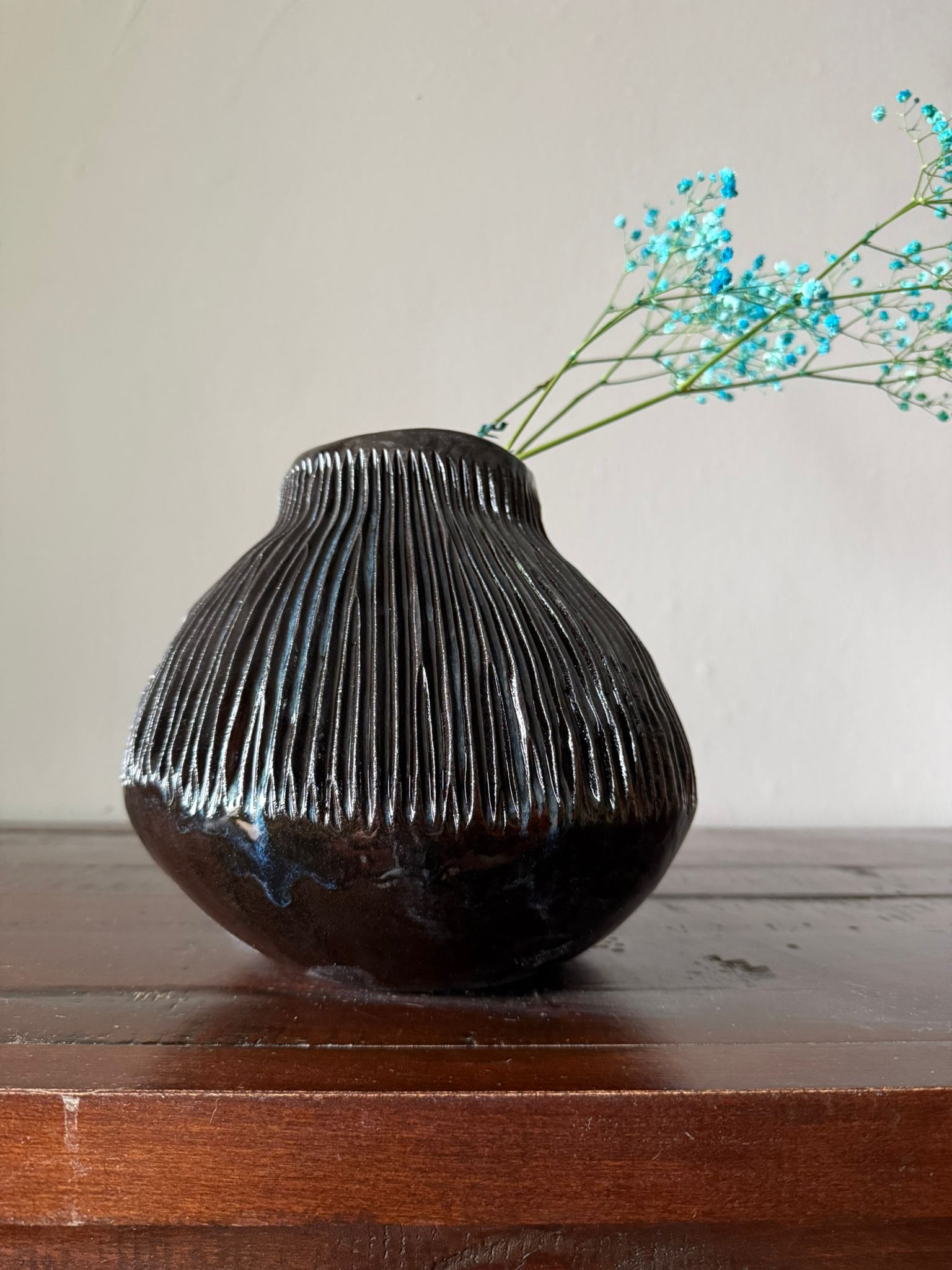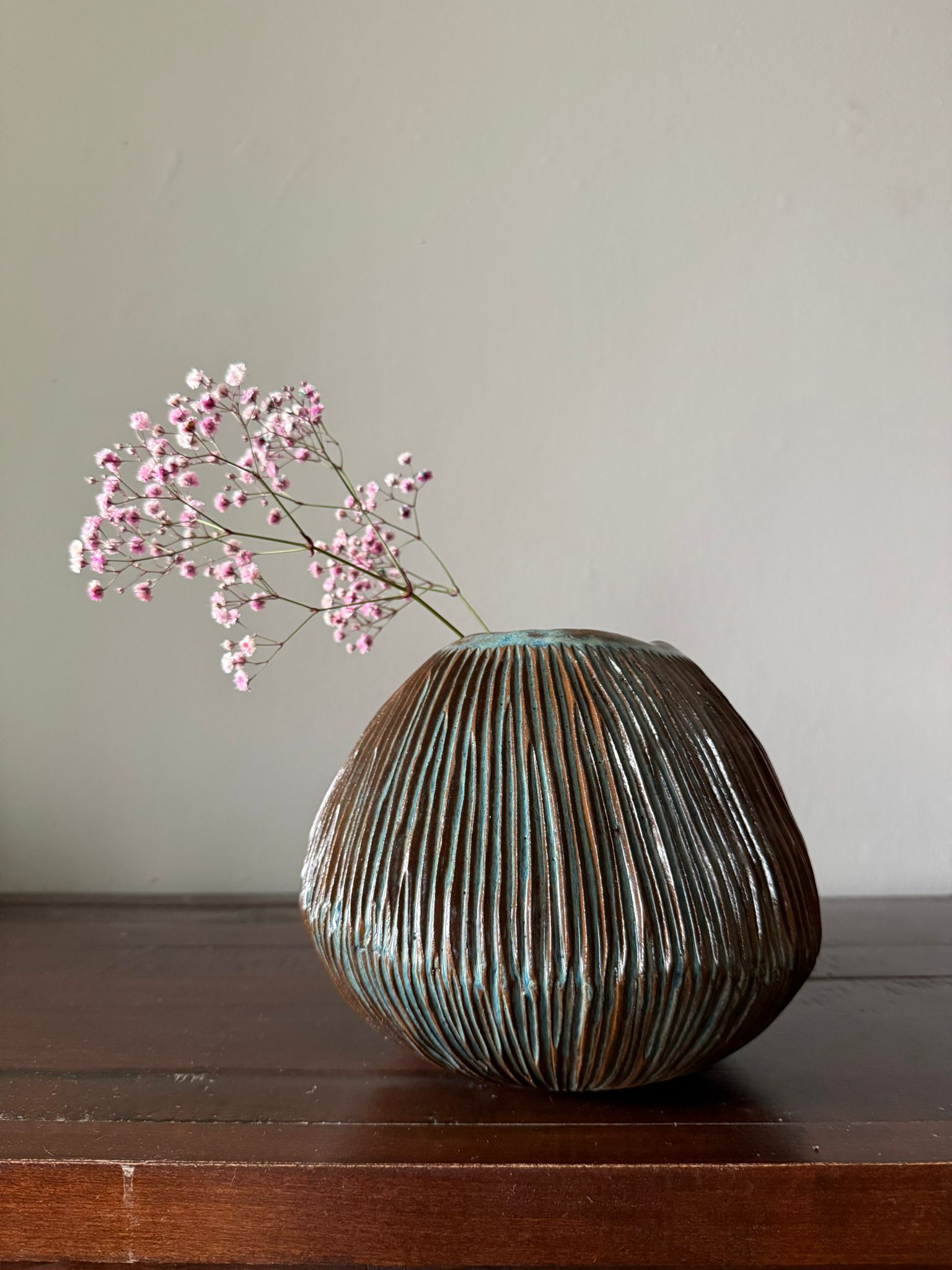 Dekoracyjna powierzchnia wazonu została ozdobiona ręcznie wyskrobanymi liniami, które nadają mu charakteru i podkreślają autorski styl wykonania. Każdy egzemplarz jest niepowtarzalny – to wynik pracochłonnej, w pełni ręcznej pracy.