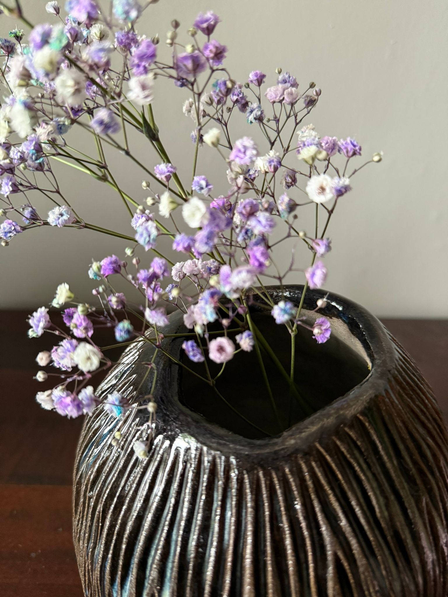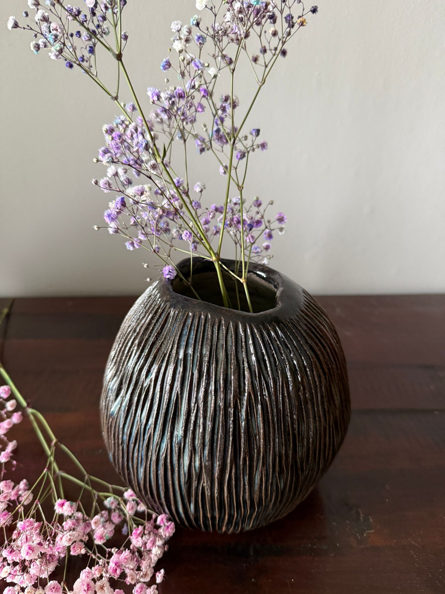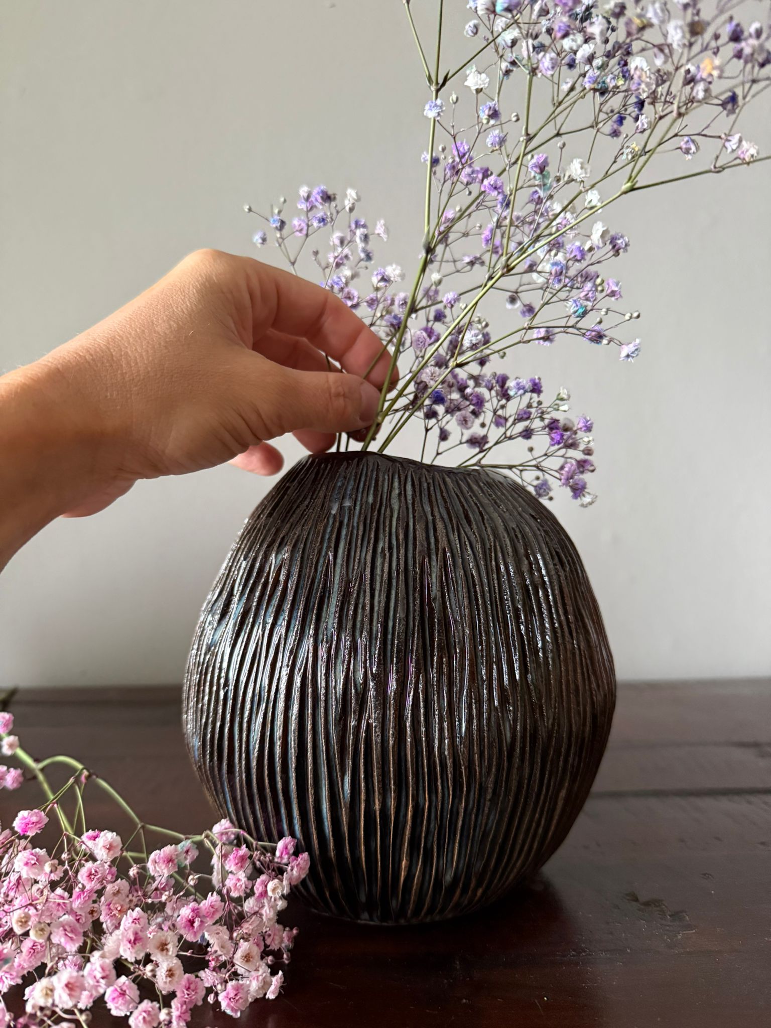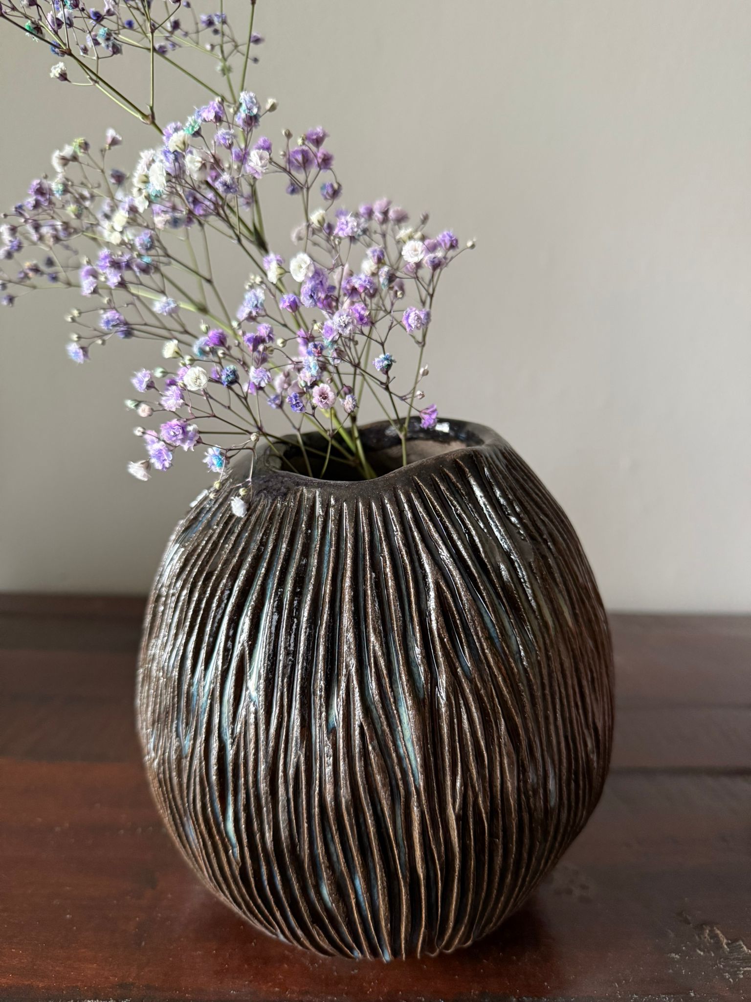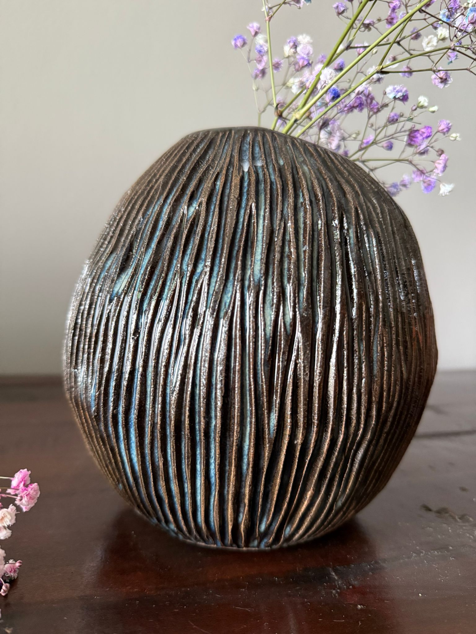 Wazon z kolekcji Deep Lines to wyjątkowy przykład współczesnej ceramiki artystycznej, łączący minimalistyczną formę z głębią koloru i faktury. Ręcznie wykonany z gliny w odcieniu szarości, pokryty błyszczącym szkliwem z delikatnymi granatowymi refleksami, zachwyca elegancją i surowym pięknem.