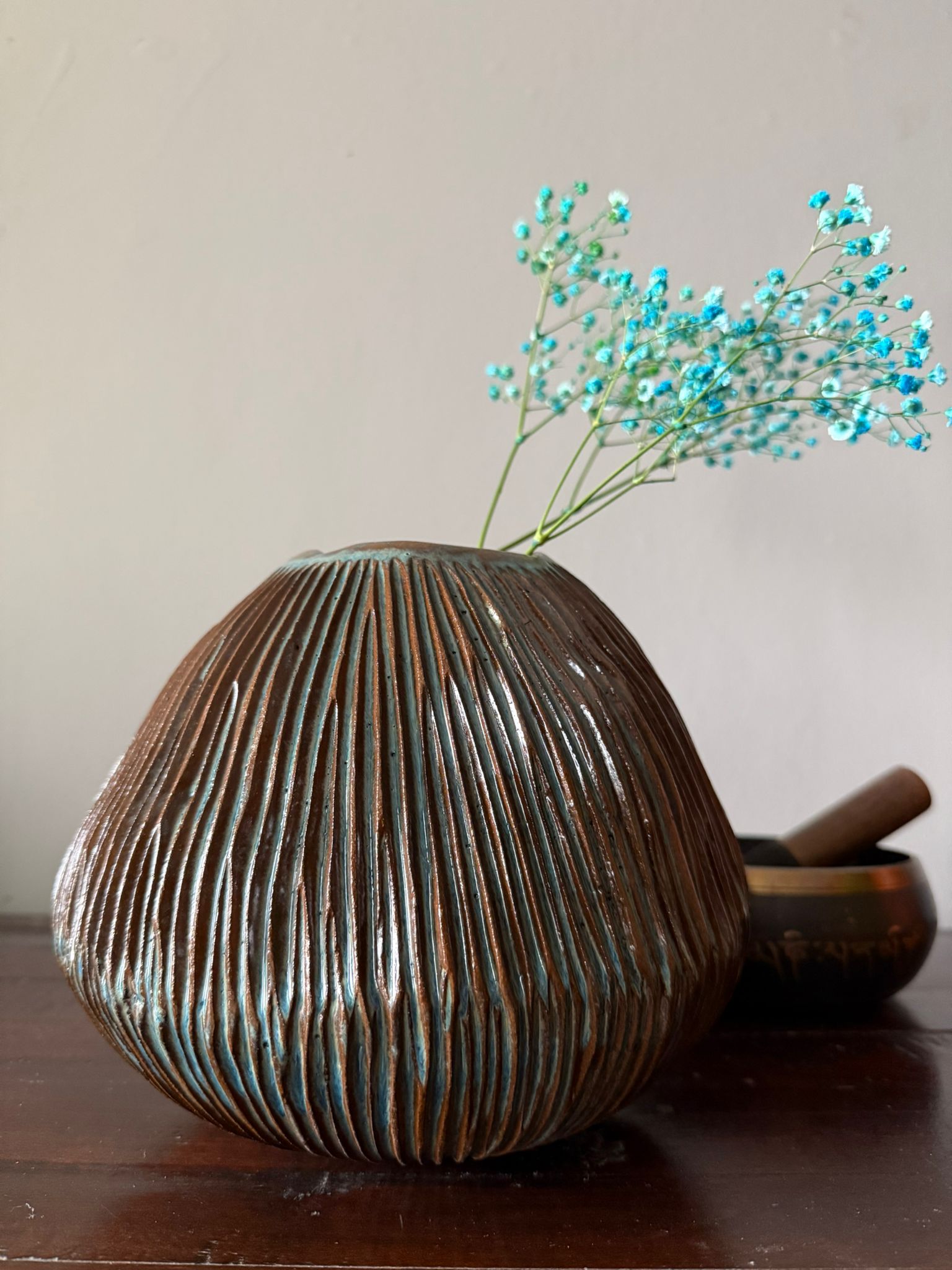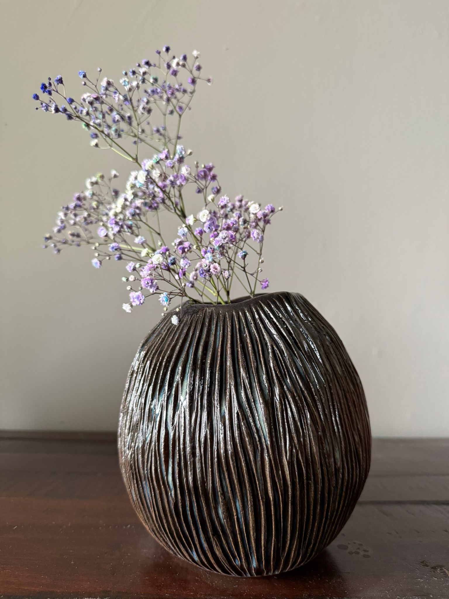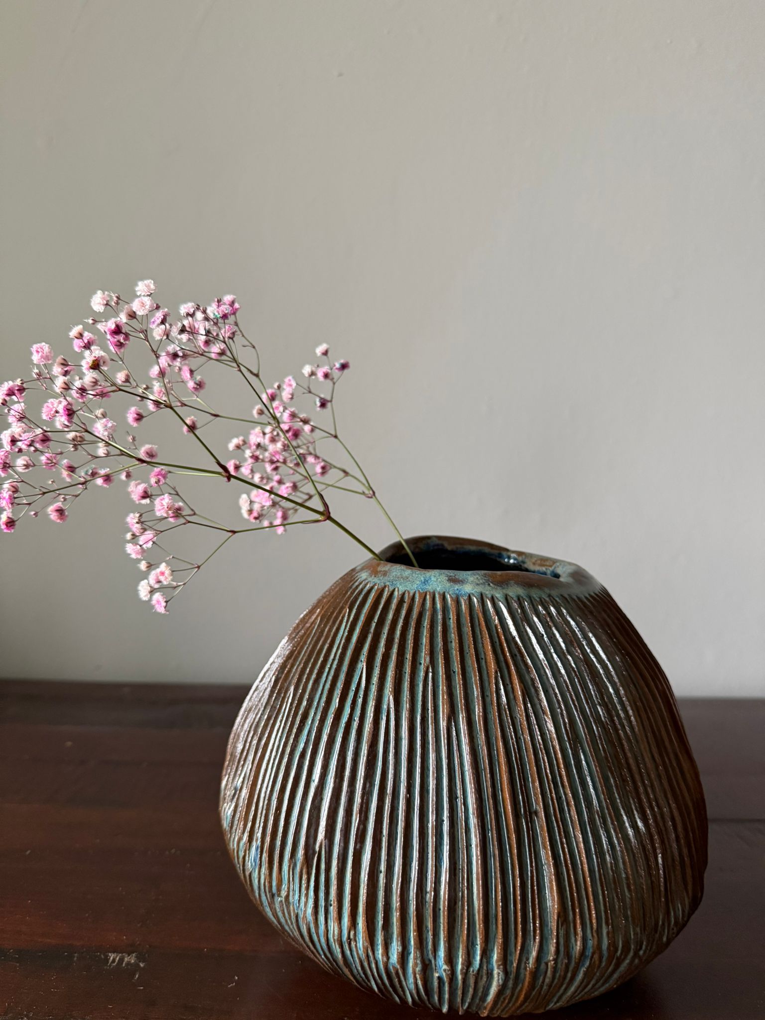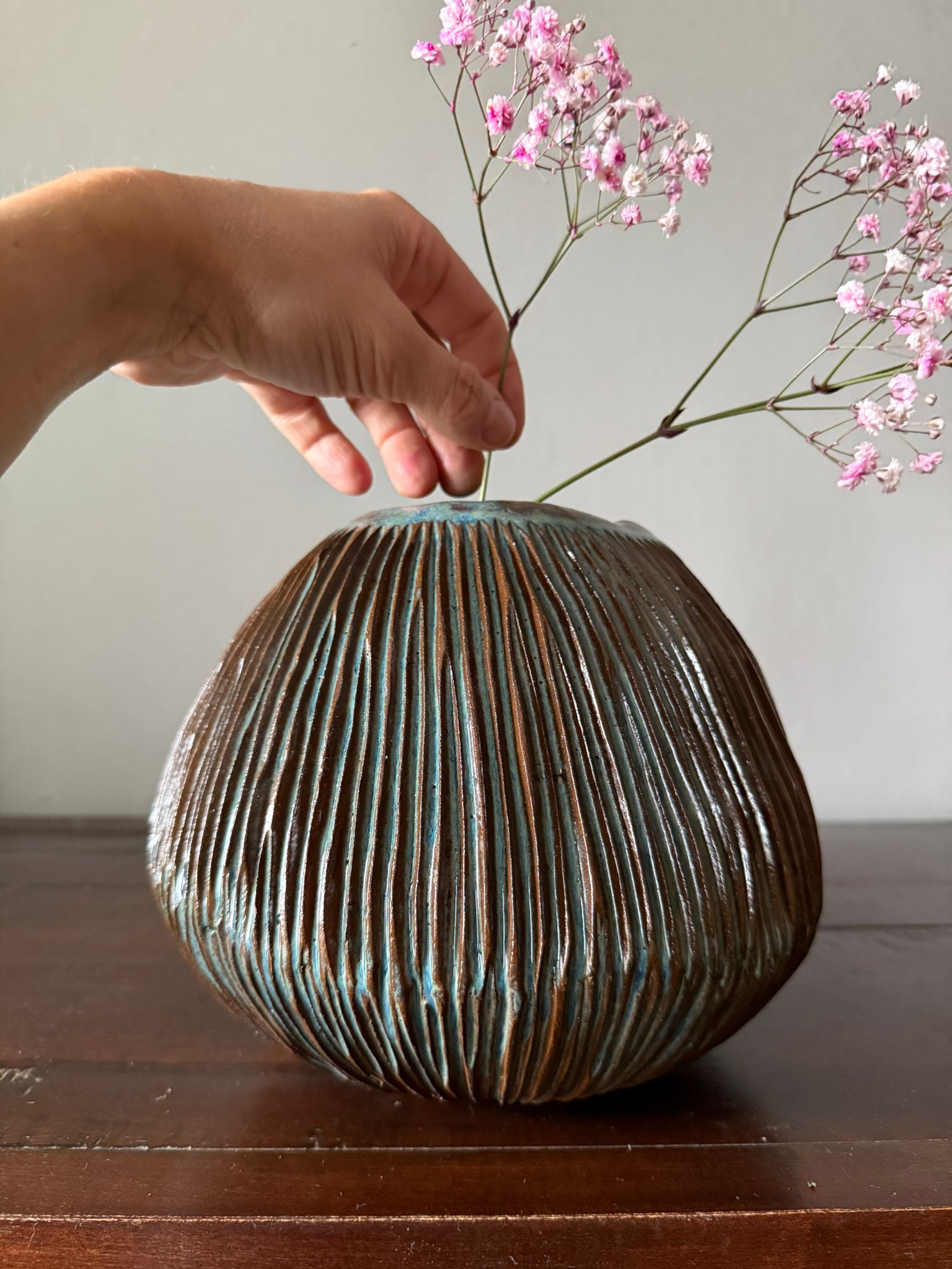 Na powierzchni wazonu widoczne są ręcznie wyskrobane linie, tworzące rytmiczny, organiczny wzór. Każdy detal powstaje z dbałością o formę i fakturę, dzięki czemu każdy egzemplarz jest unikatem o niepowtarzalnym charakterze.