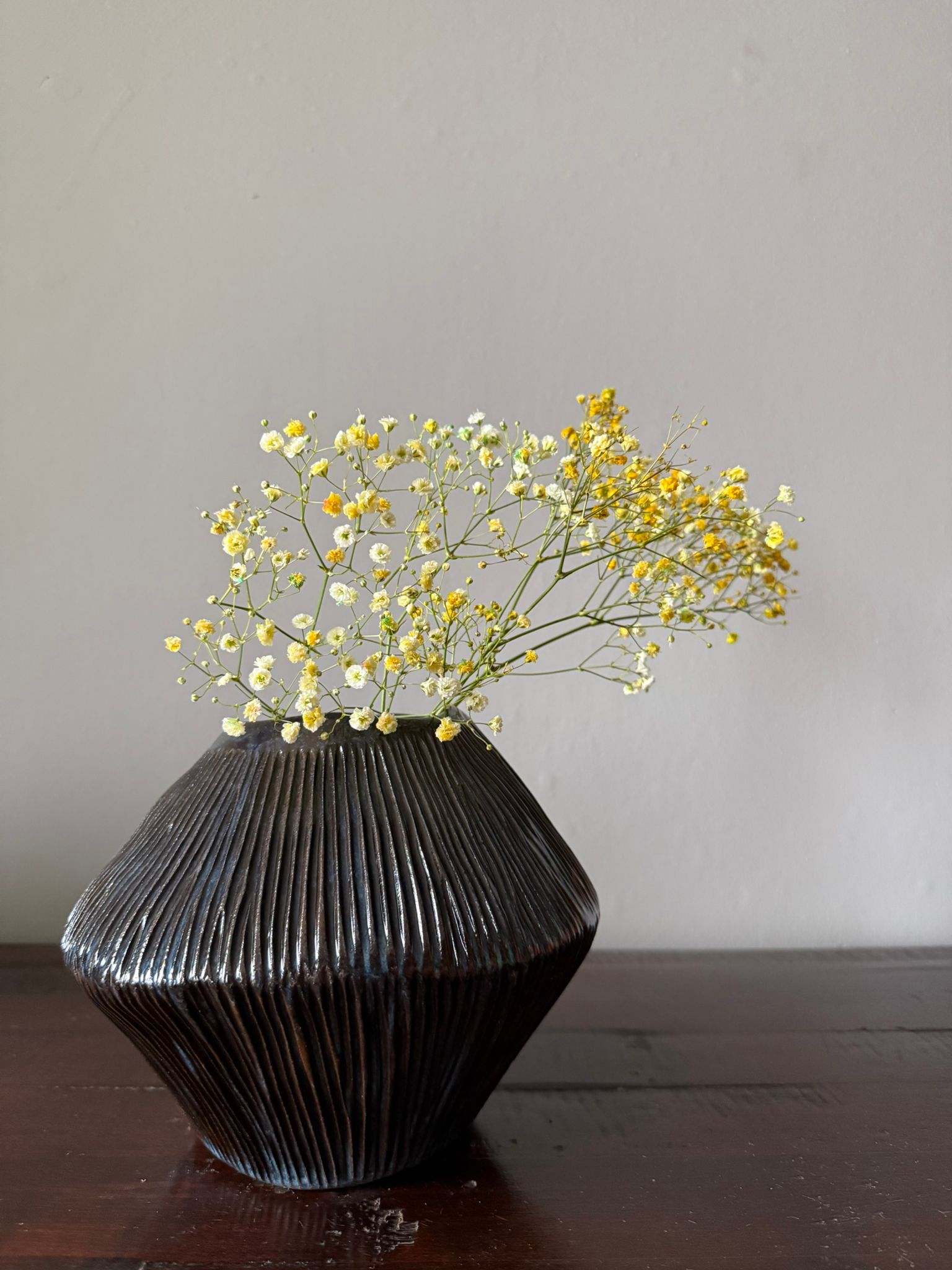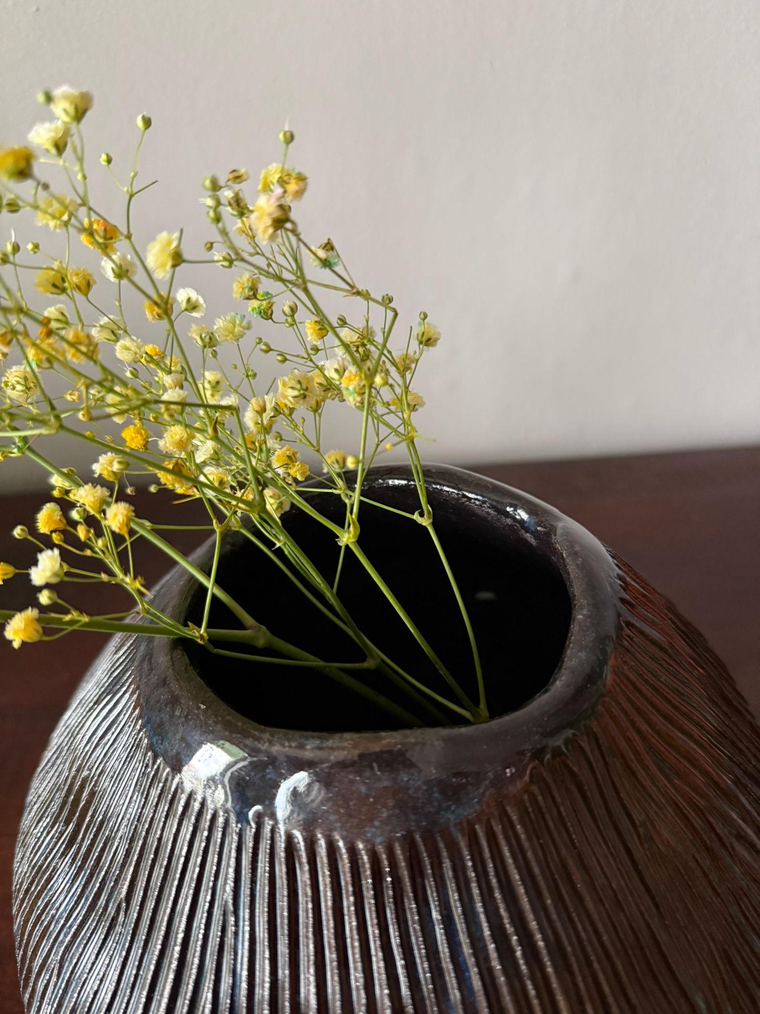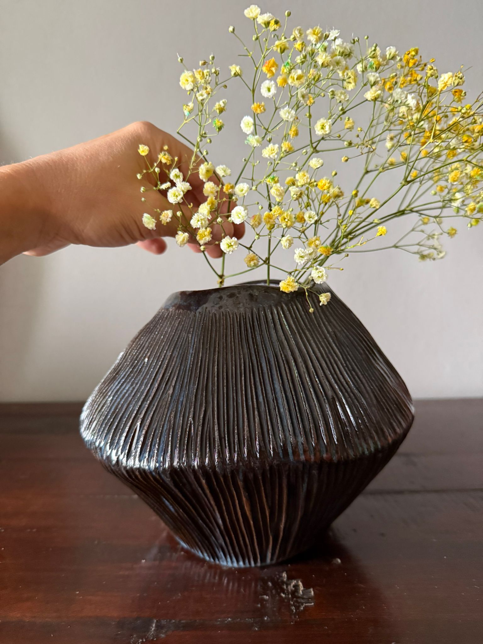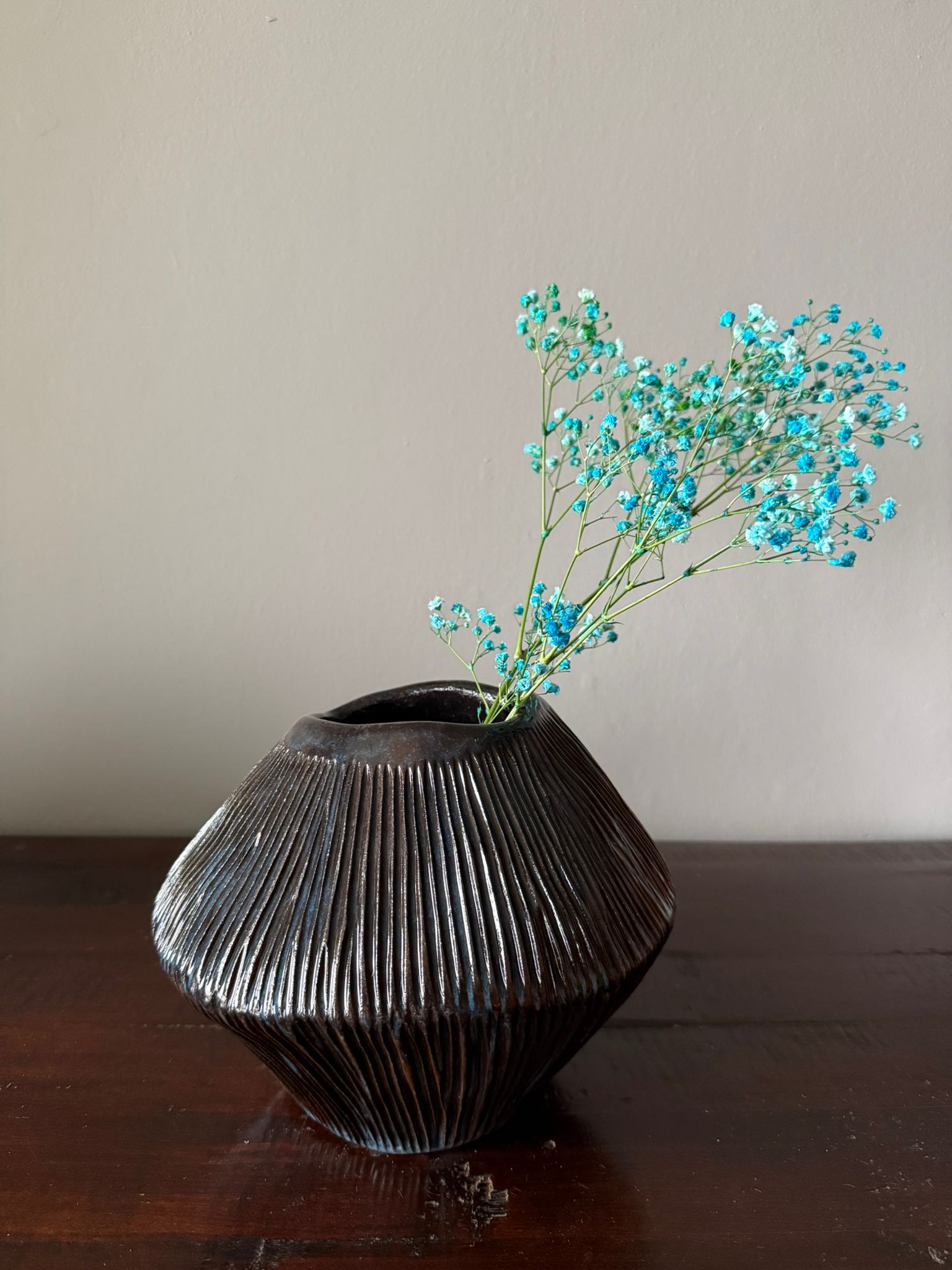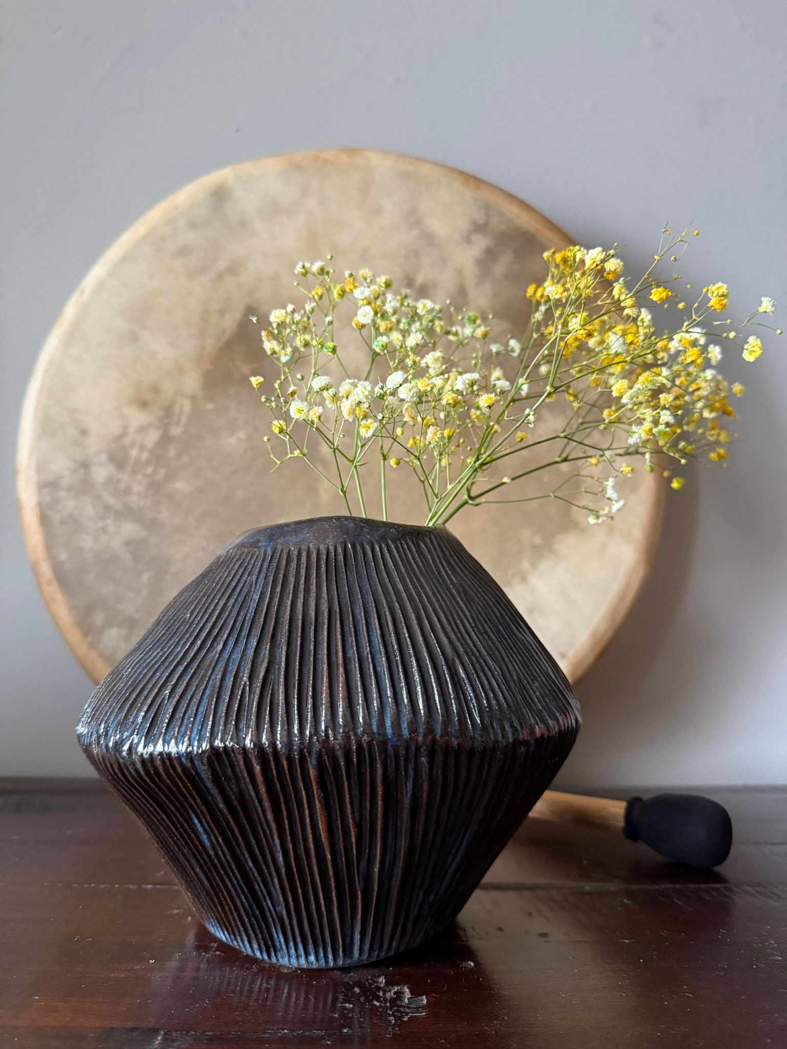 Wazon z kolekcji Deep Lines to połączenie siły formy i subtelności detalu. Wykonany w całości ręcznie z gliny w odcieniu głębokiej czerni, pokryty jest błyszczącym szkliwem z delikatnymi granatowymi tonami, które nadają mu elegancki i nieco tajemniczy charakter.