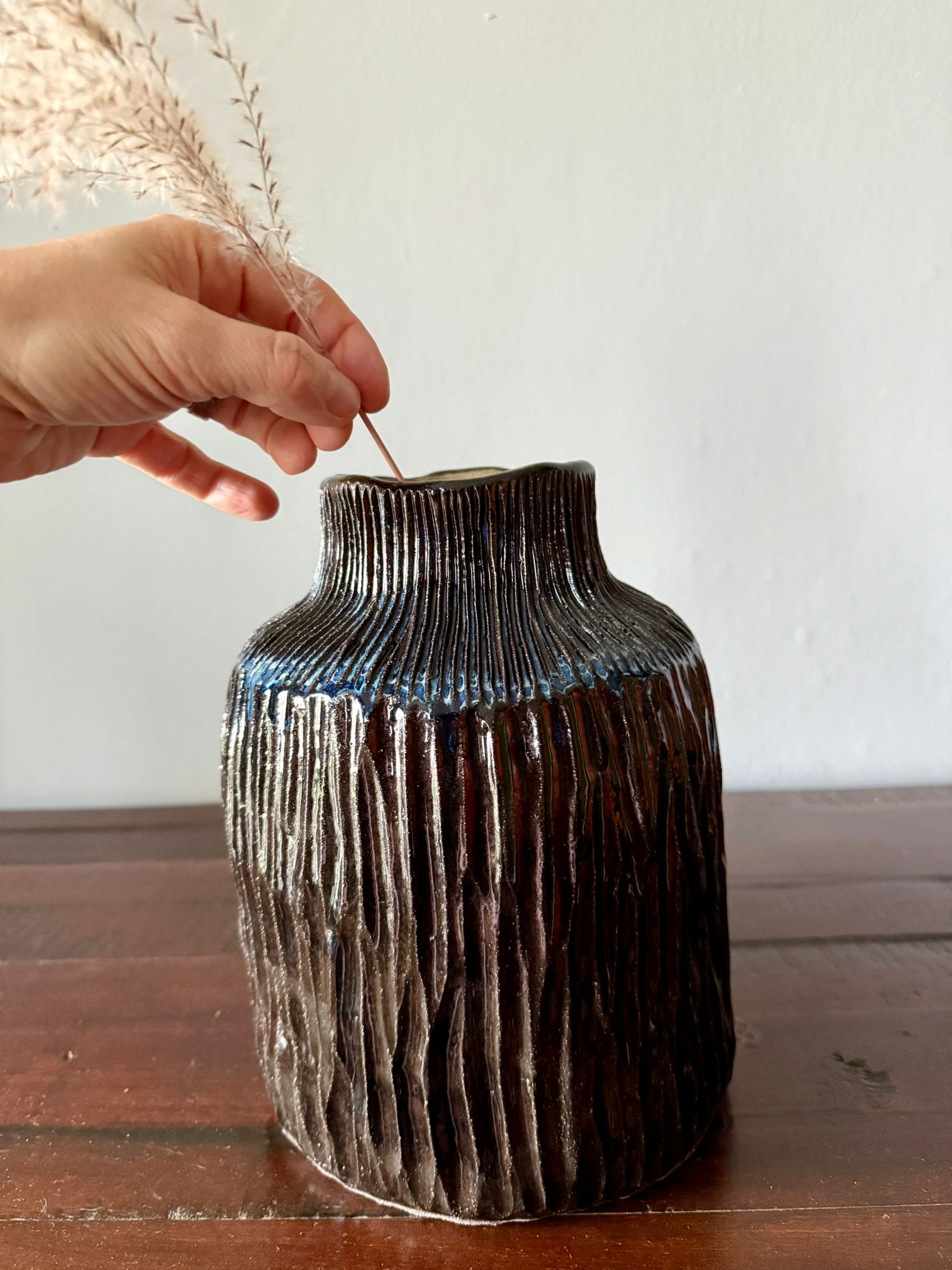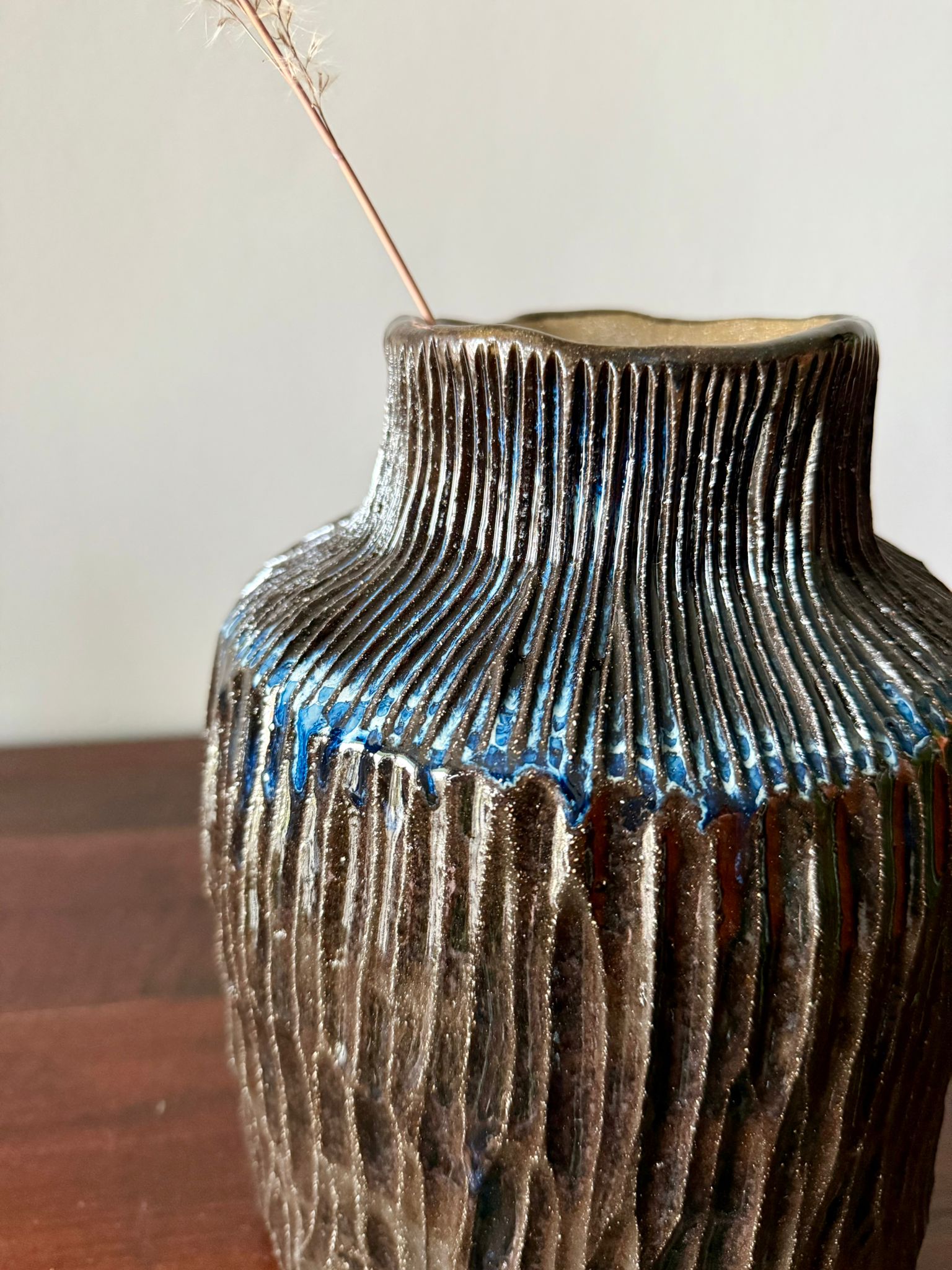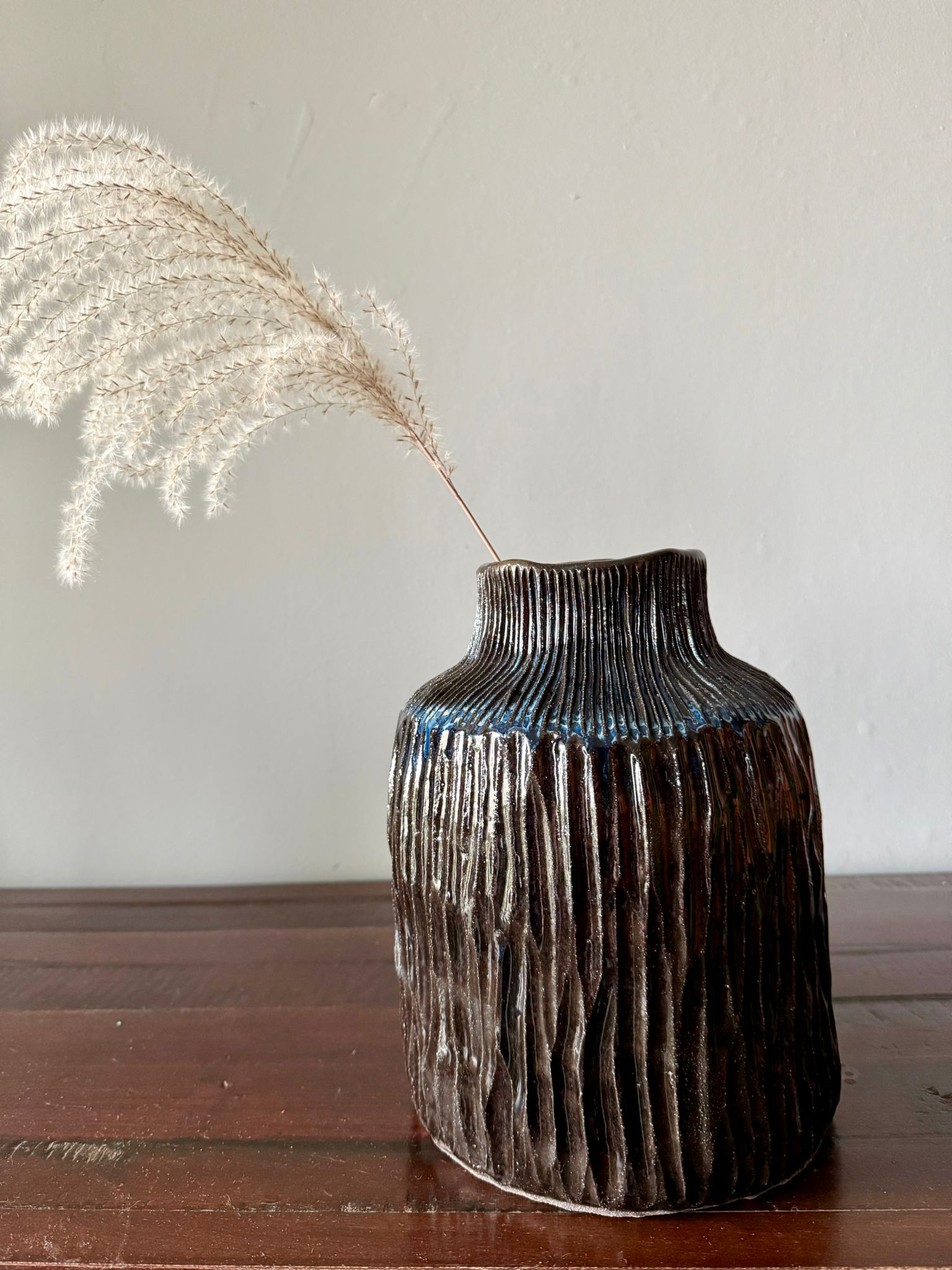 Duży, ręcznie wykonany wazon ceramiczny z kolekcji Deep Lines to połączenie surowej natury i artystycznej precyzji. Został wykonany z szarej gliny i pokryty czarnym, błyszczącym szkliwem z subtelnymi niebieskimi przebarwieniami, które nadają mu głębi i wyjątkowego charakteru. Każdy egzemplarz jest ręcznie rzeźbiony, dzięki czemu stanowi niepowtarzalne dzieło sztuki.